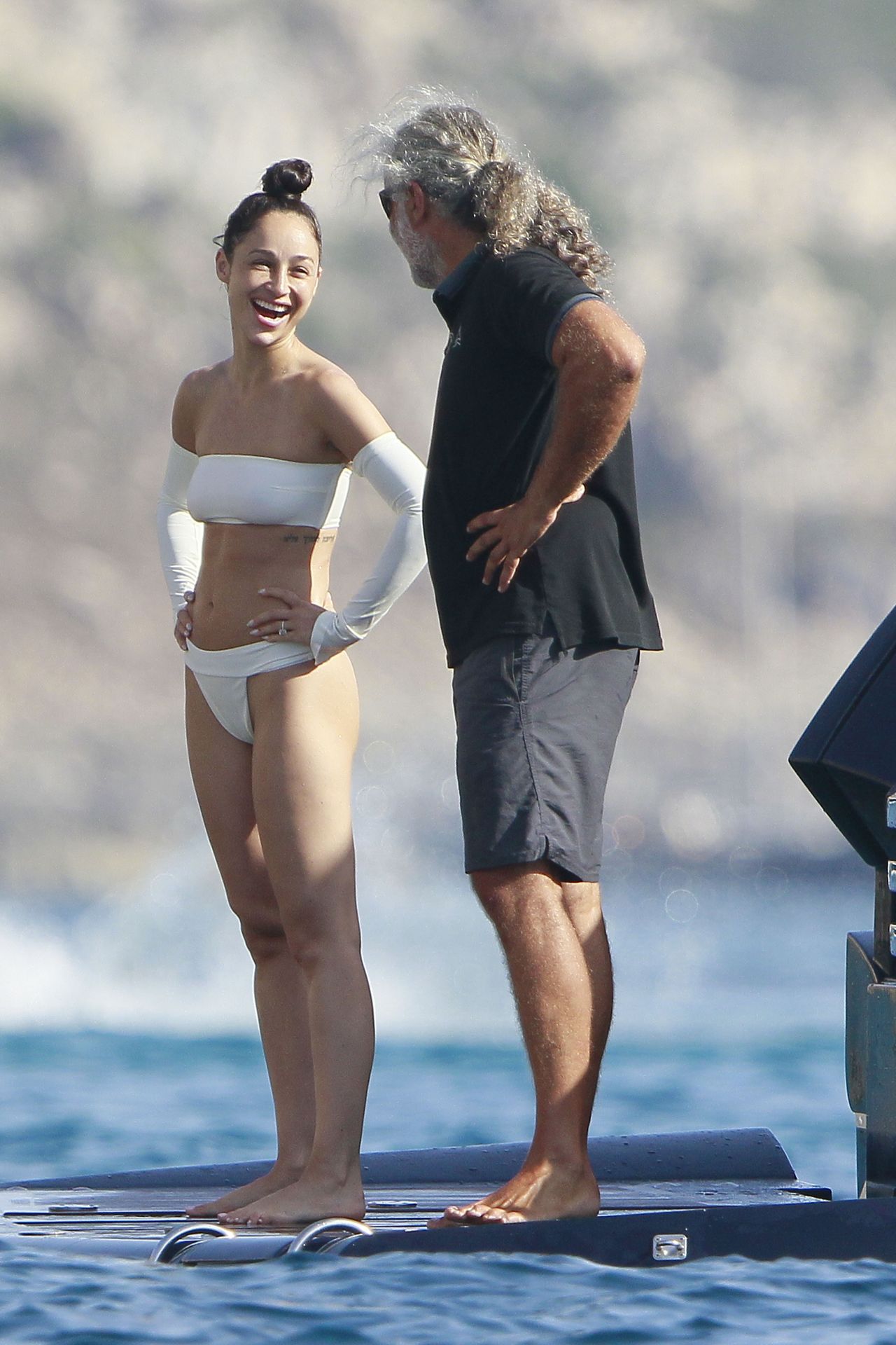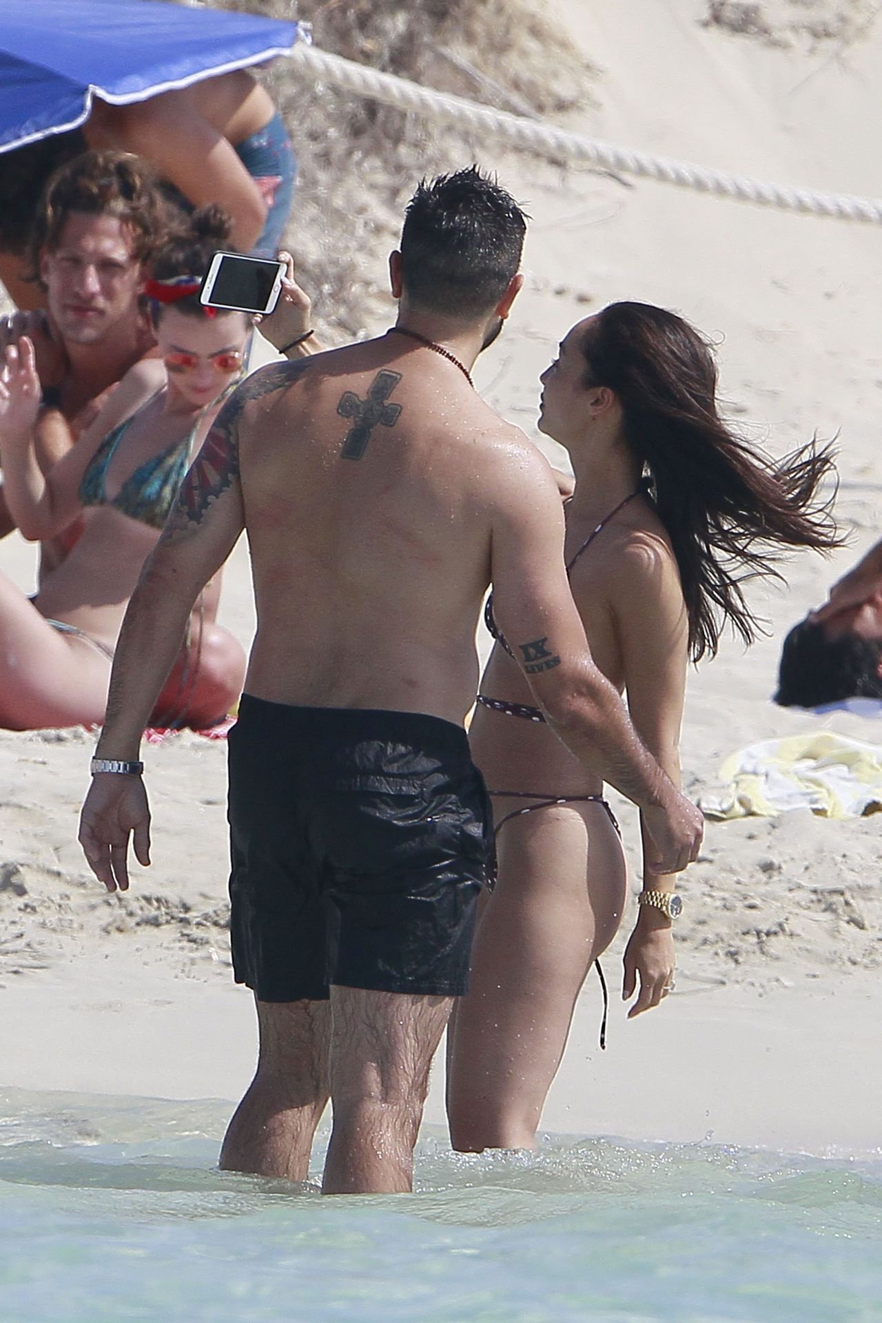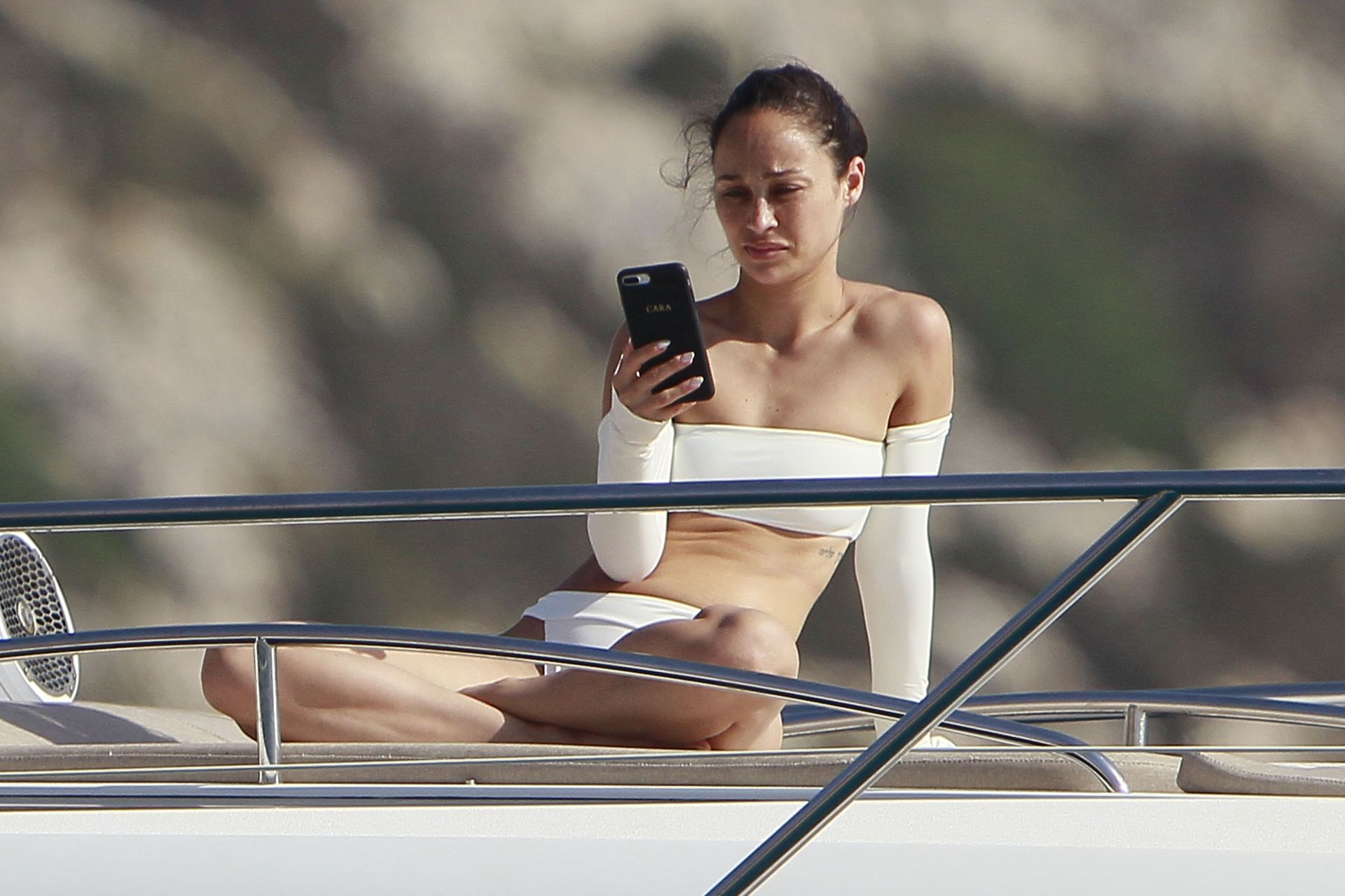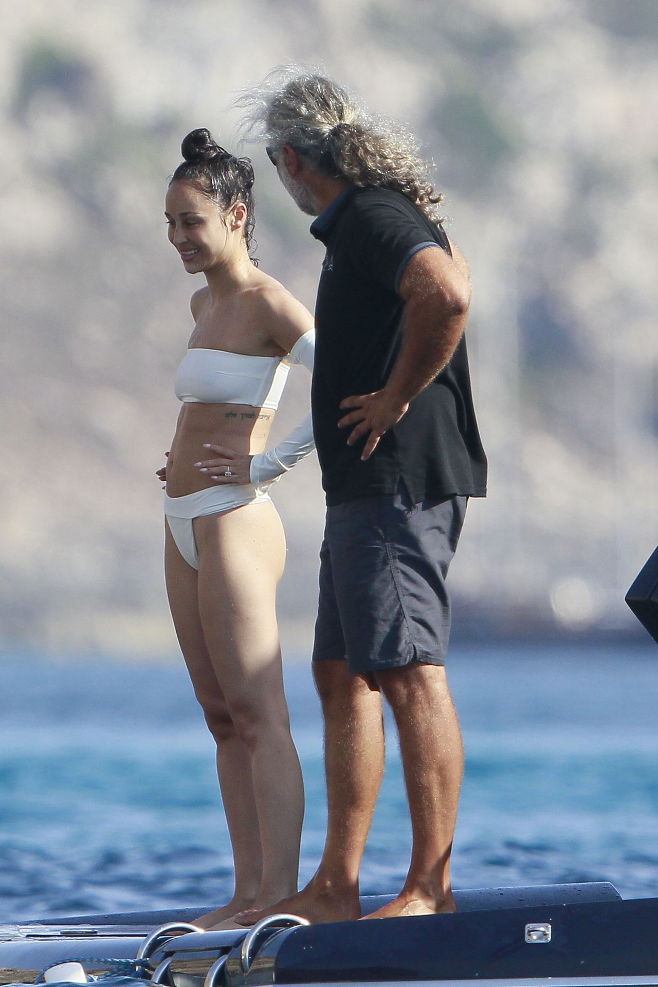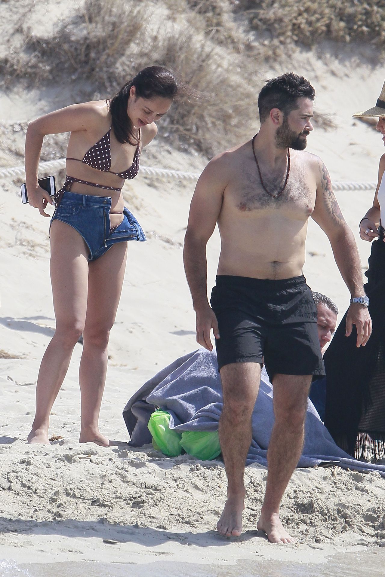 Movie actress Cara Santana and Jesse Metcalfe go paddle-boarding together at the end of a long and relaxed beach day in Formentera, Spain, 07/21/2019.