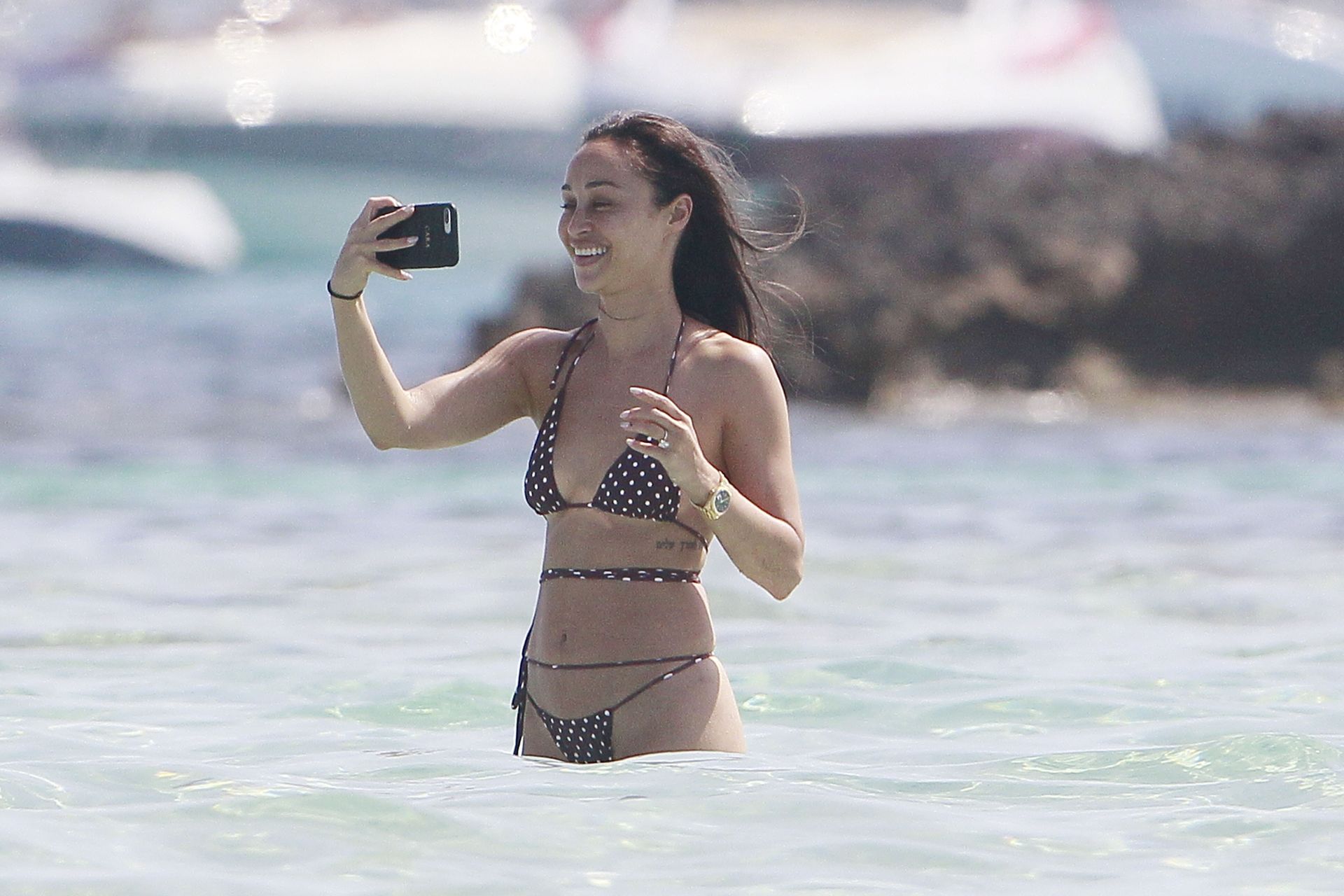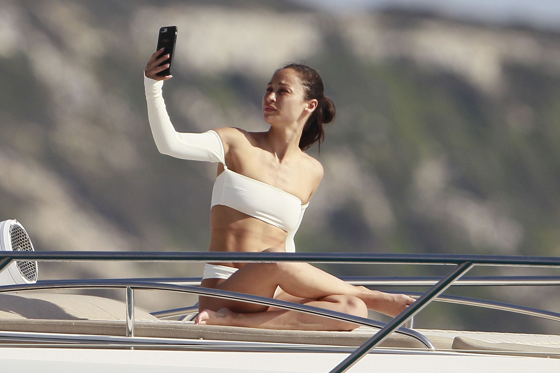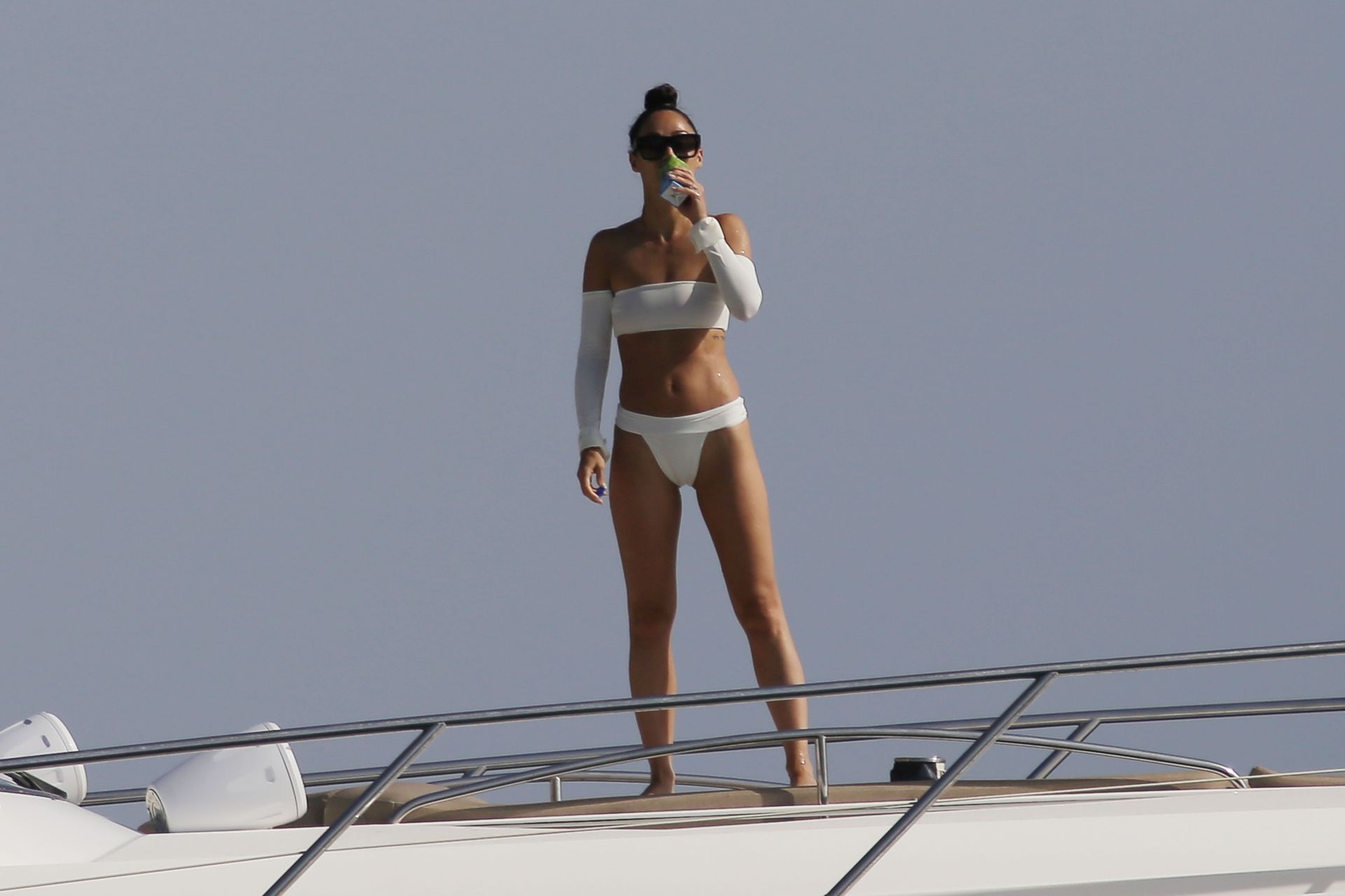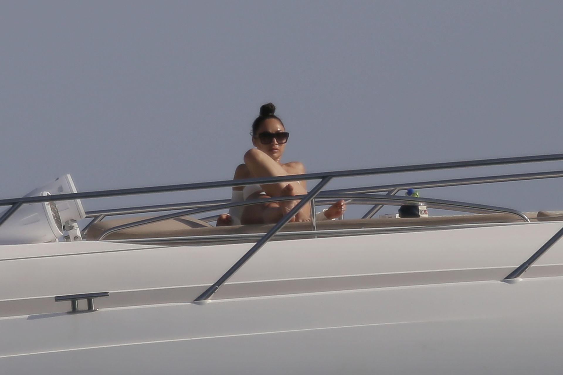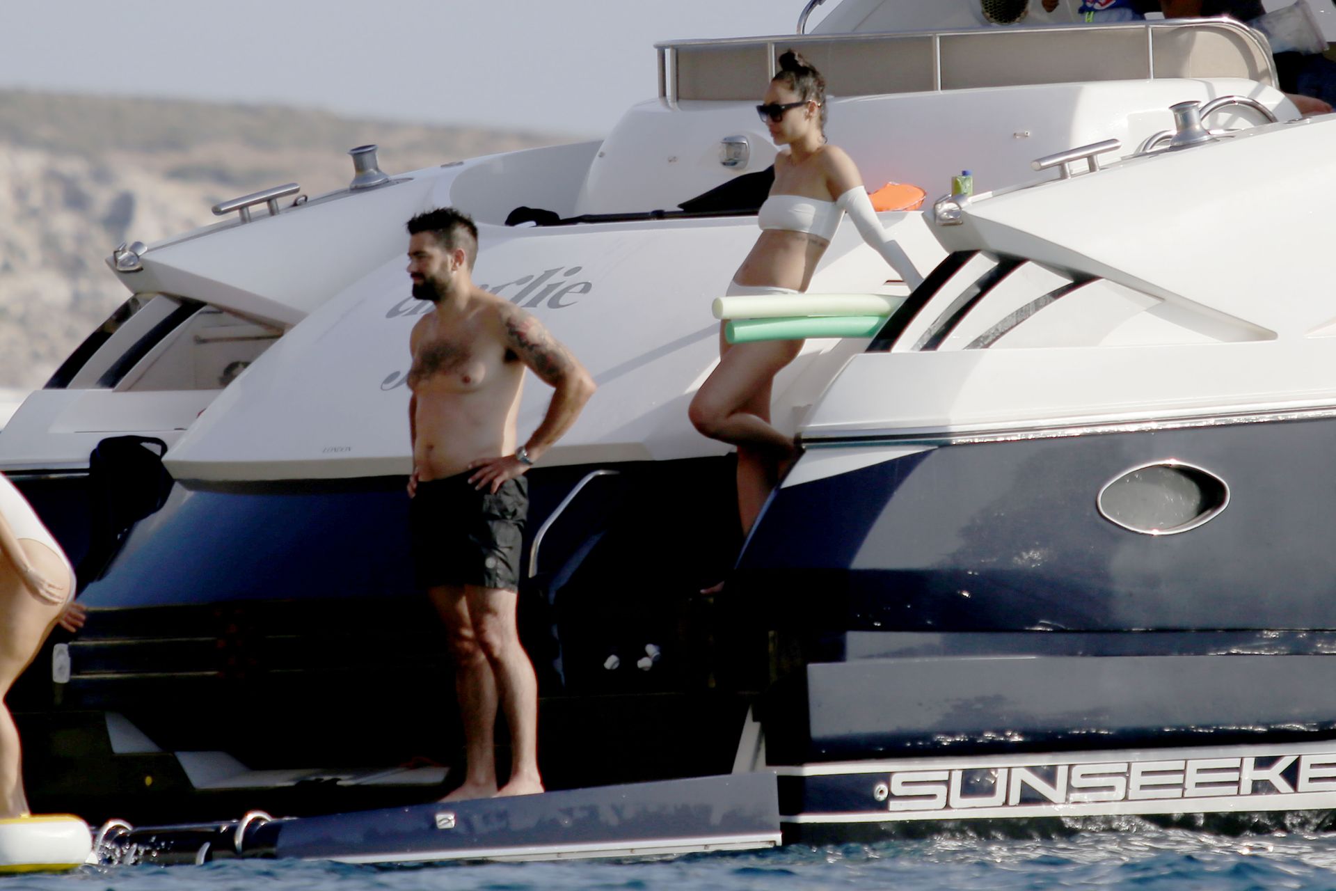 Movie actress Cara Santana and Jesse Metcalfe go paddle-boarding together at the end of a long and relaxed beach day in Formentera, Spain, 07/21/2019.