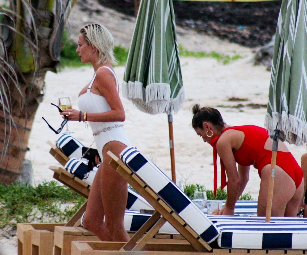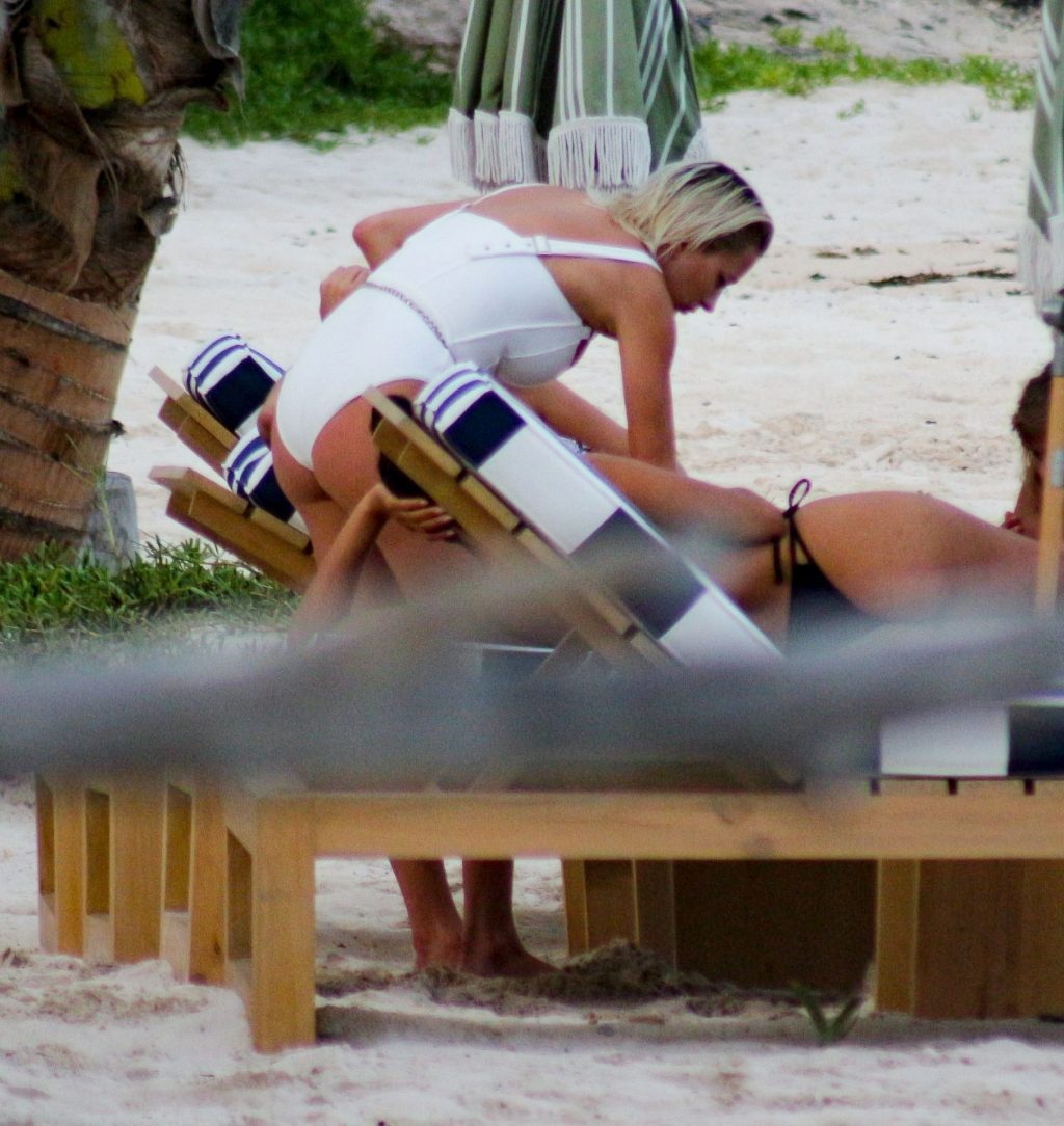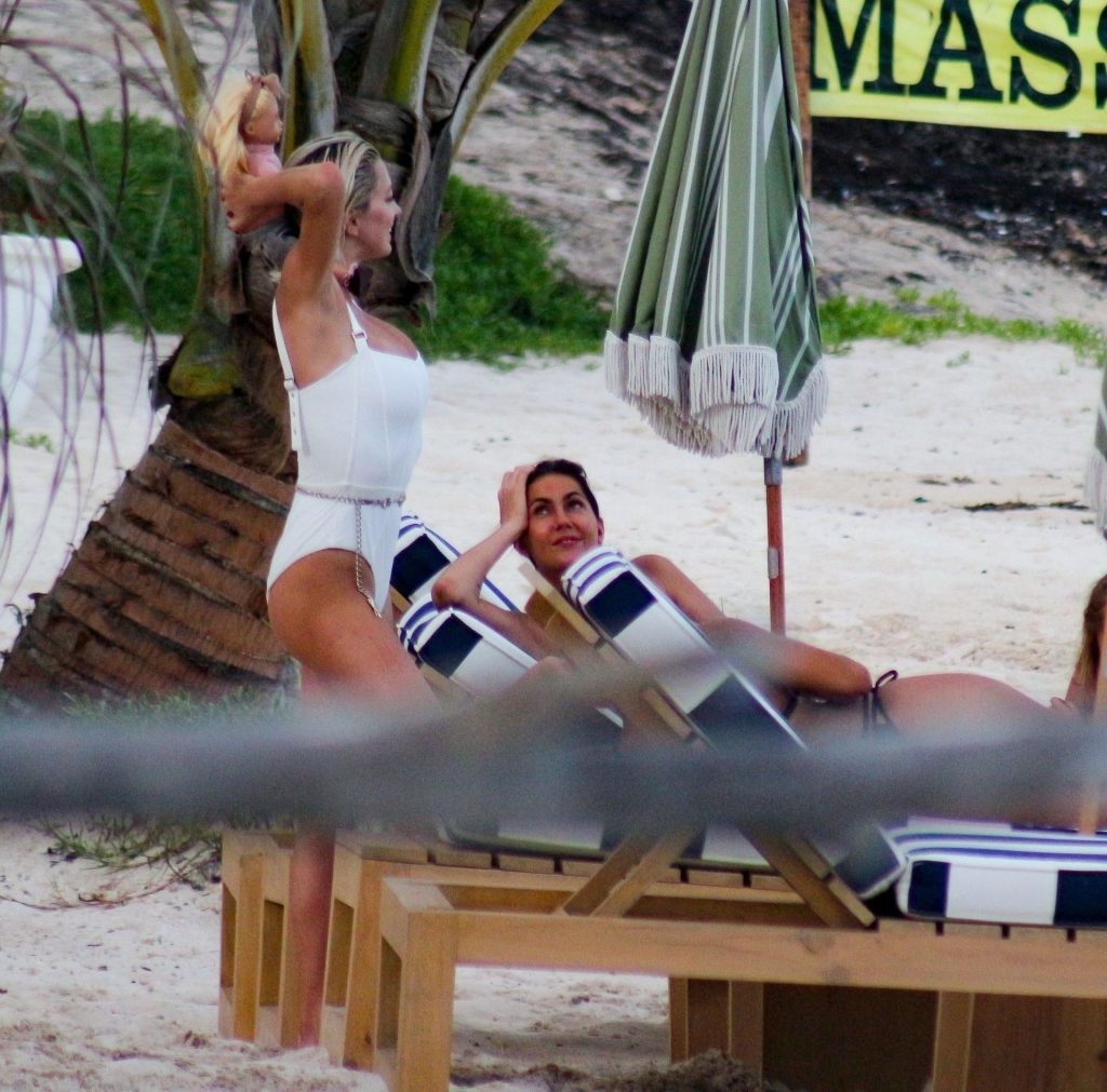 Model Caroline Vreeland suffers an unfortunate bikini malfunction while on holiday in Tulum, Mexico, 10/28/2019.