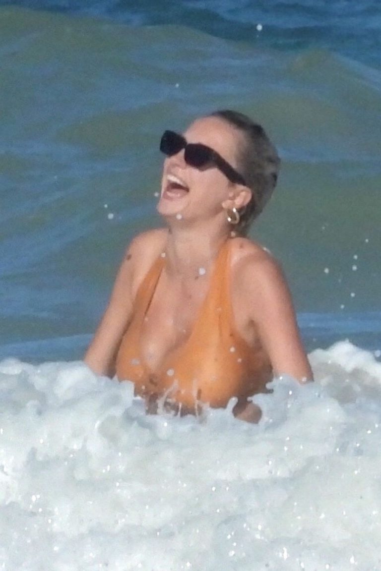 Caroline Vreeland shows off a very thin bikini while on vacation in Tulum, 10/26/2019. Caroline doesn’t seem to mind the sheer swimsuit as she frolics in the waves with her friends.