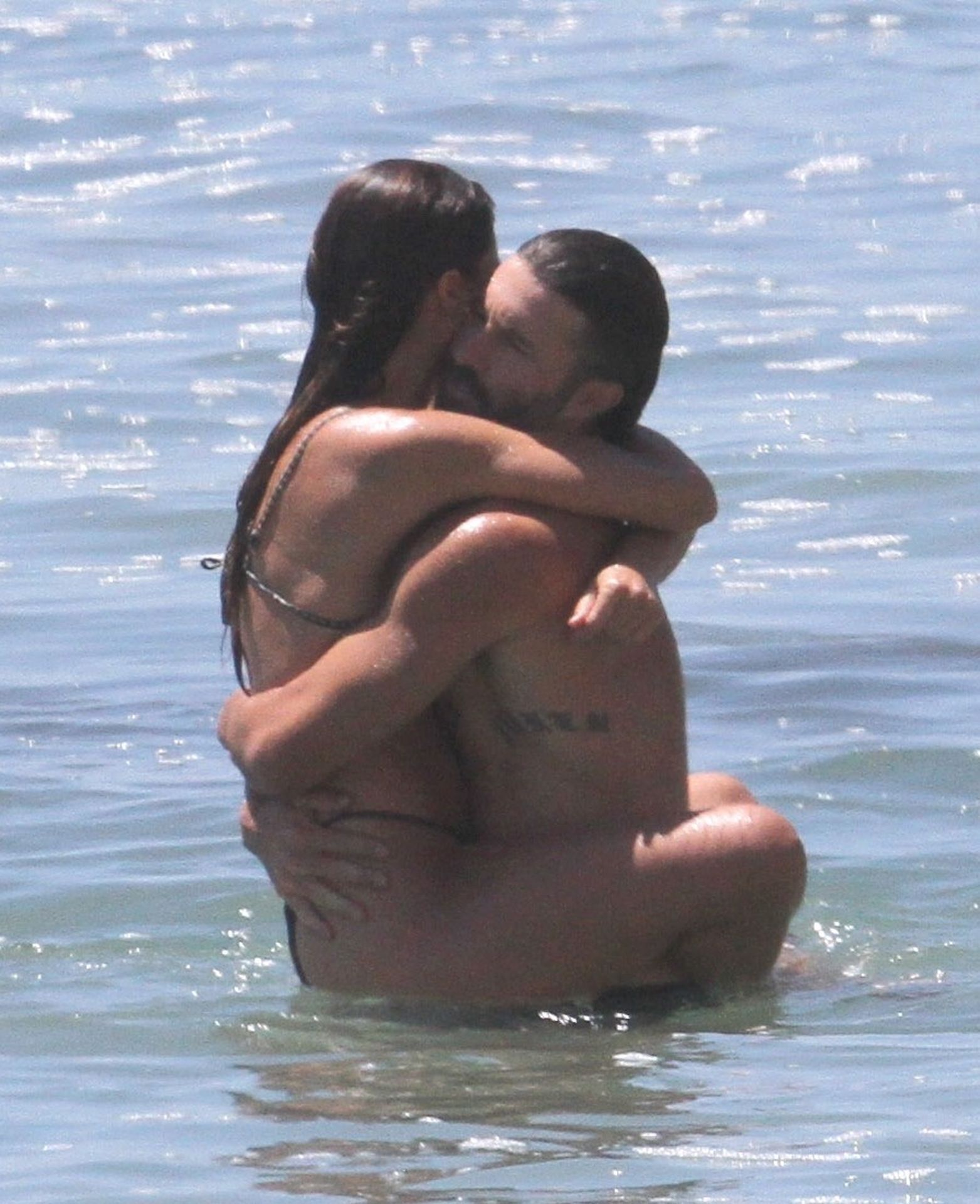 The couple seemed to be celebrating the baby news hugging and kissing in the water. Cayley was a wearing a black striped bikini showing off her new baby bump.