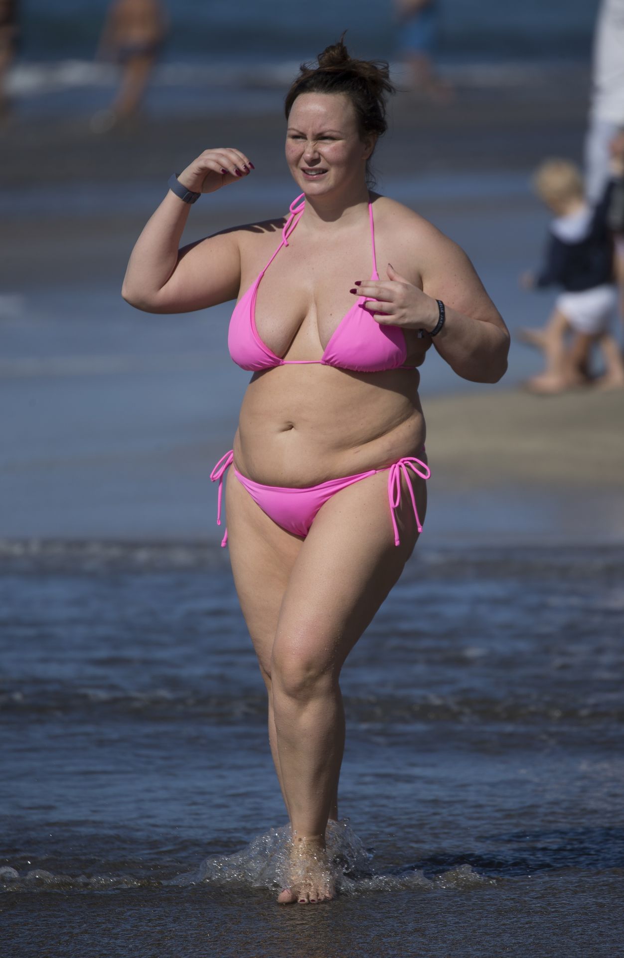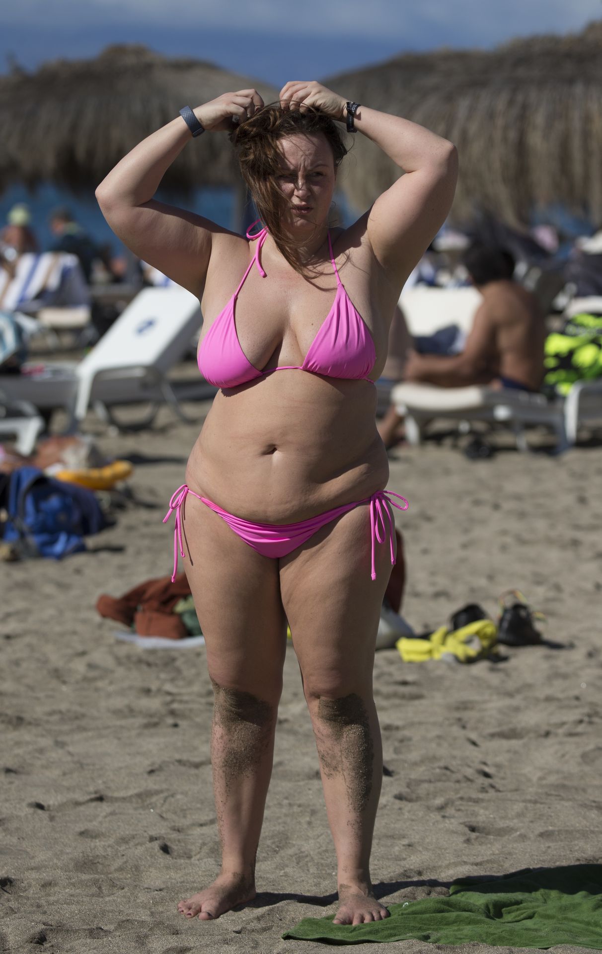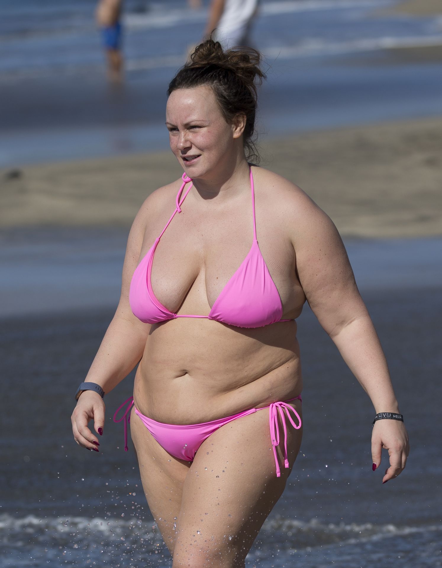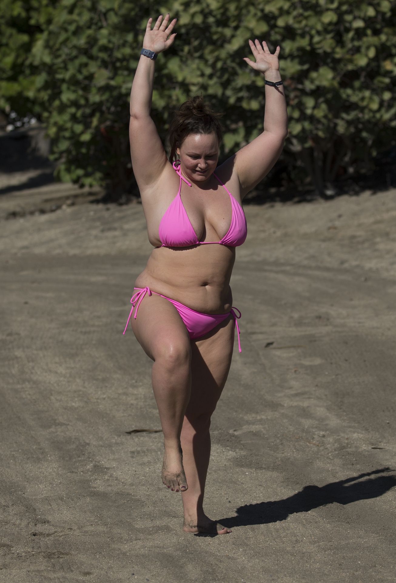 Chanelle Hayes (31) displays a fuller figure in a pink bikini as she jogs and cartwheels along the beach in Spain, 11/23/2018.