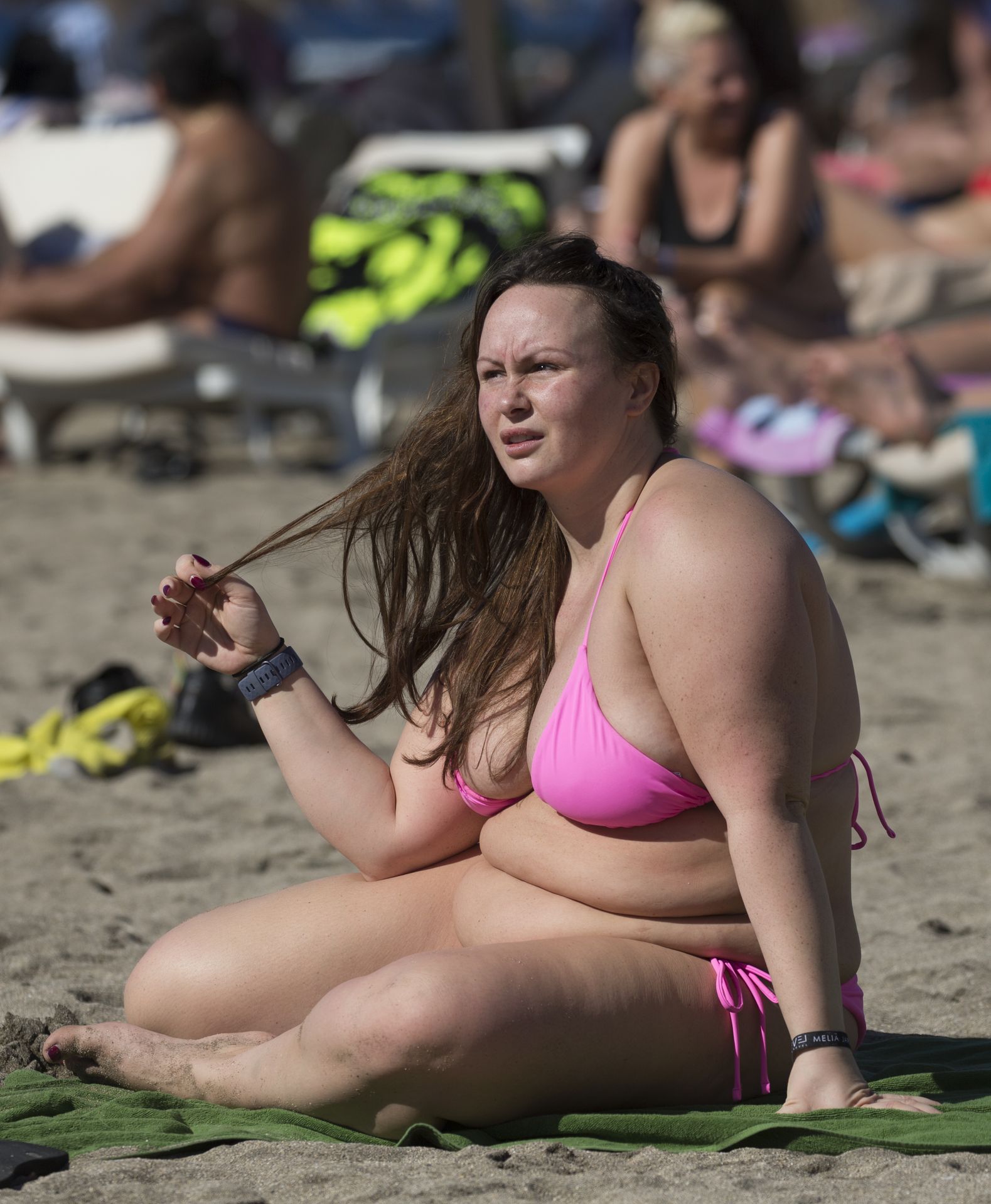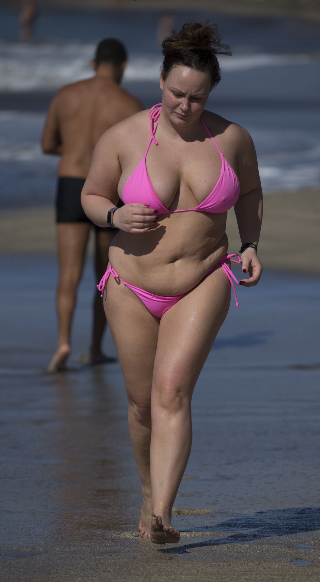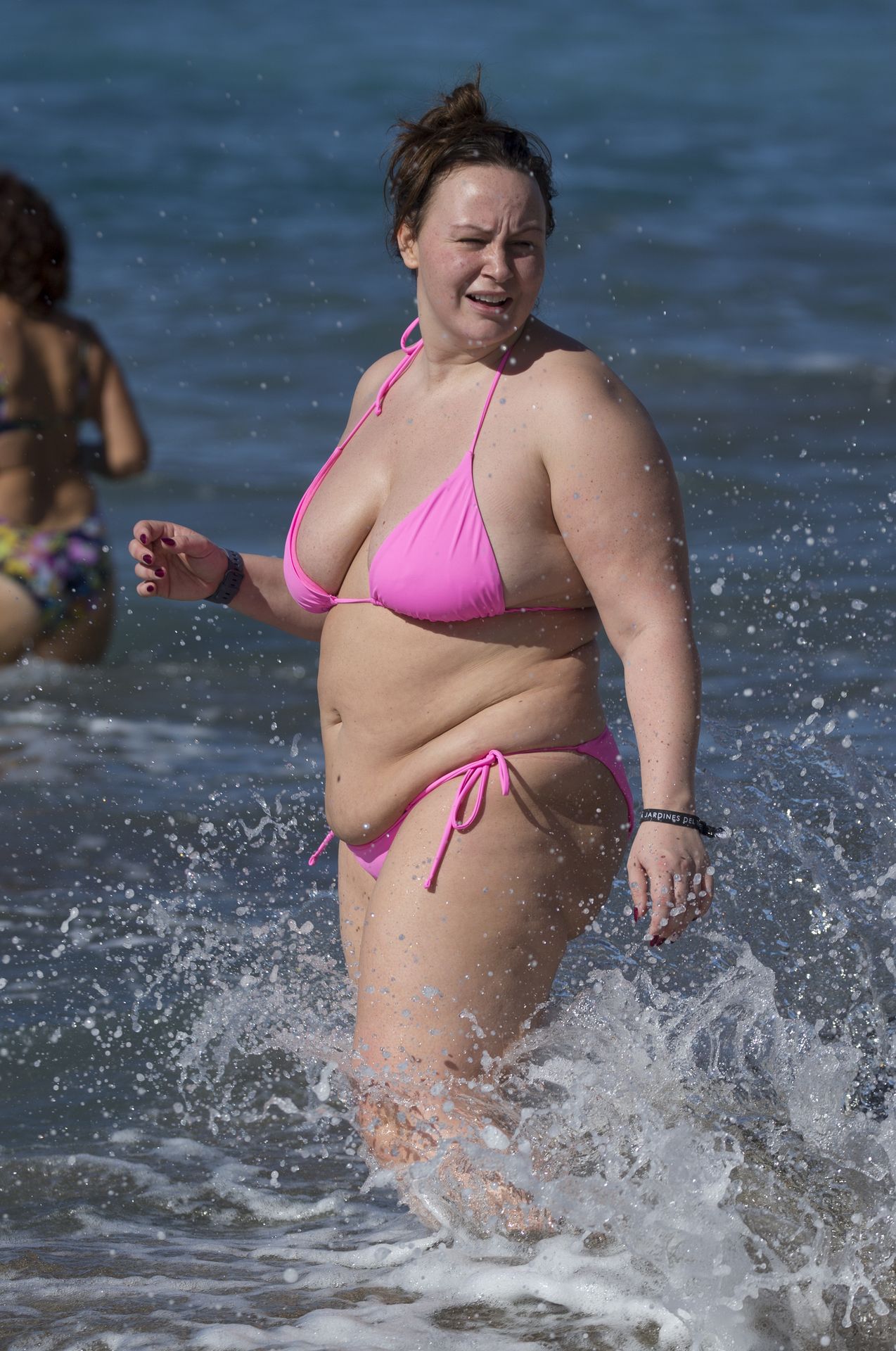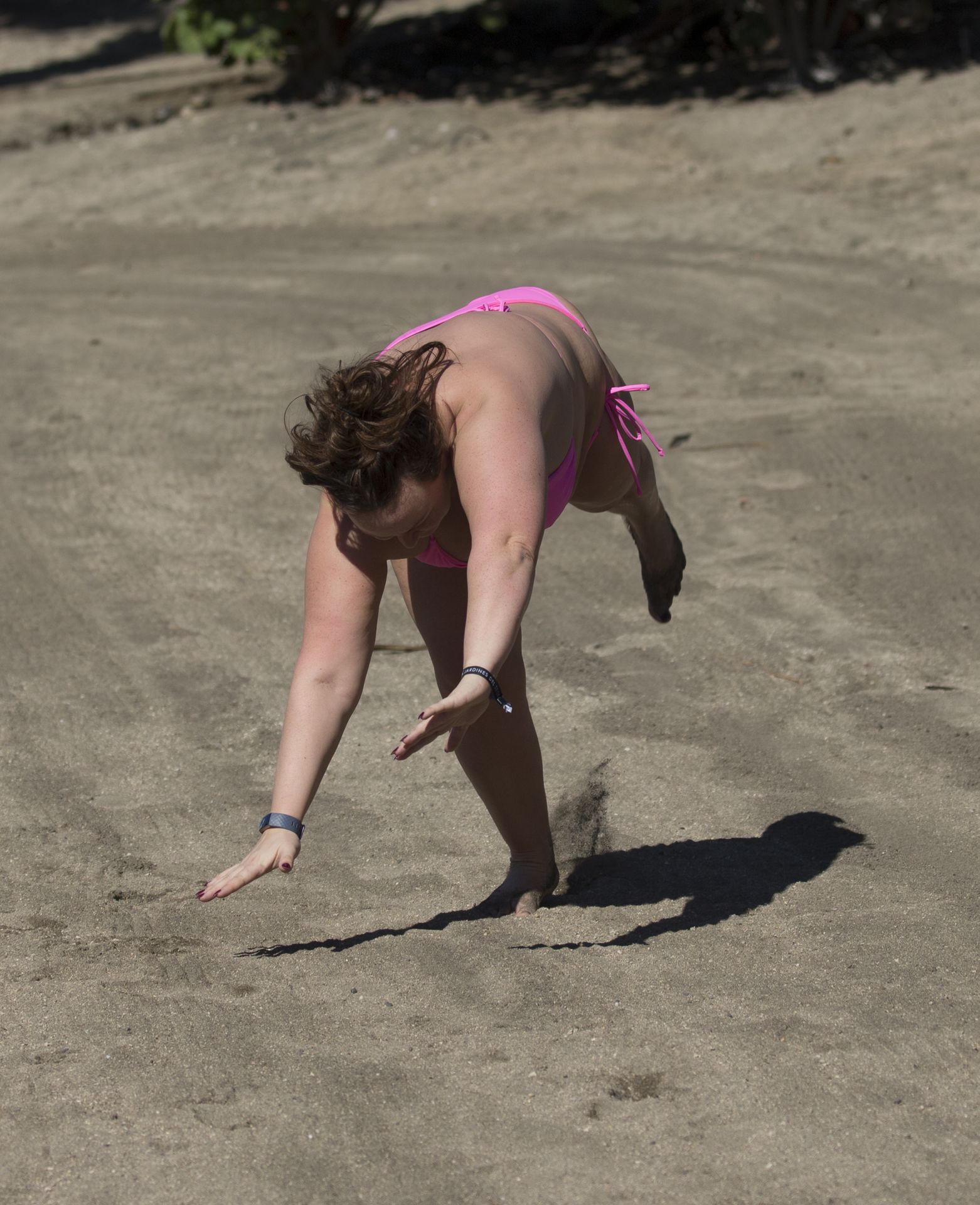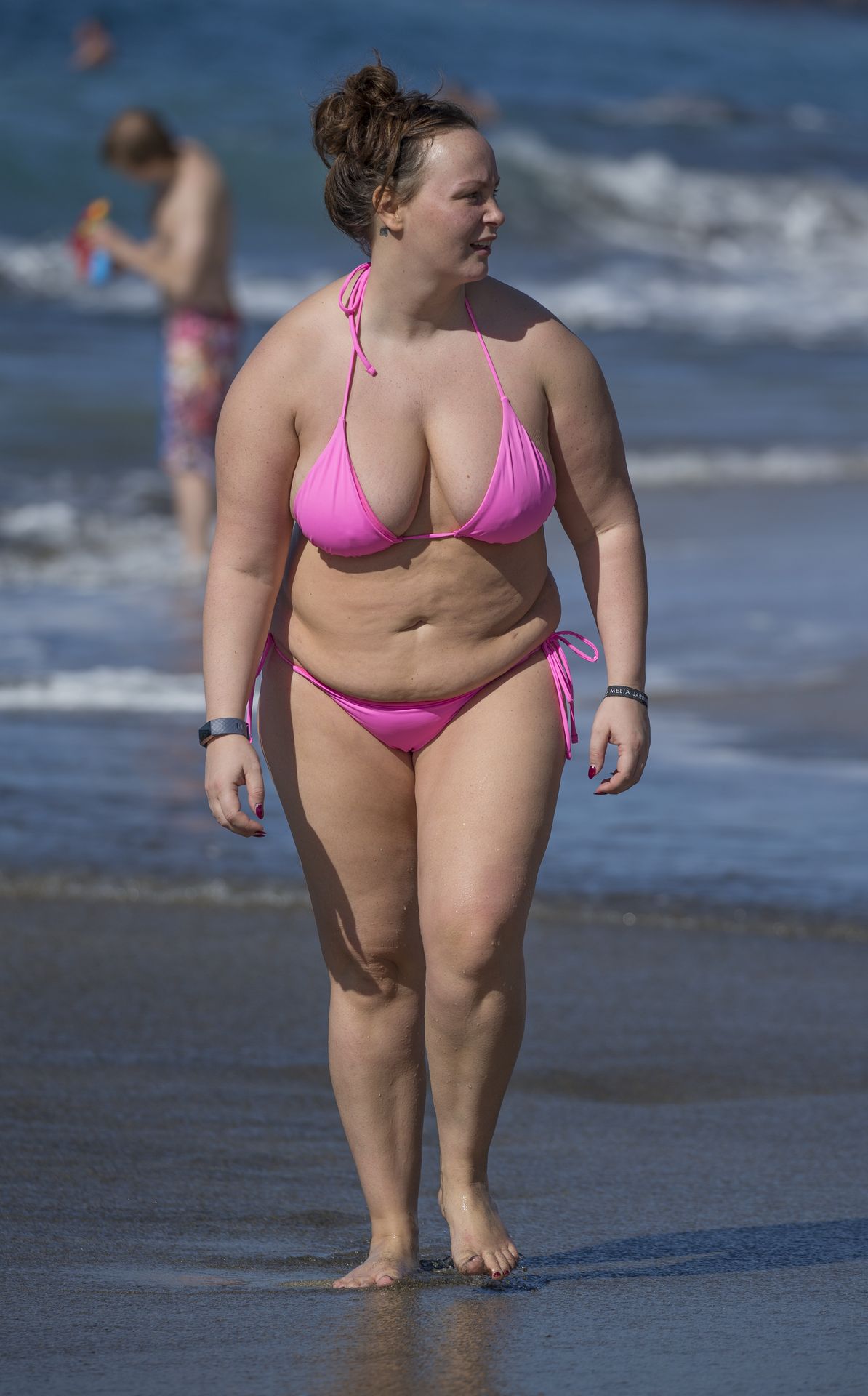 Chanelle Hayes (31) displays a fuller figure in a pink bikini as she jogs and cartwheels along the beach in Spain, 11/23/2018.