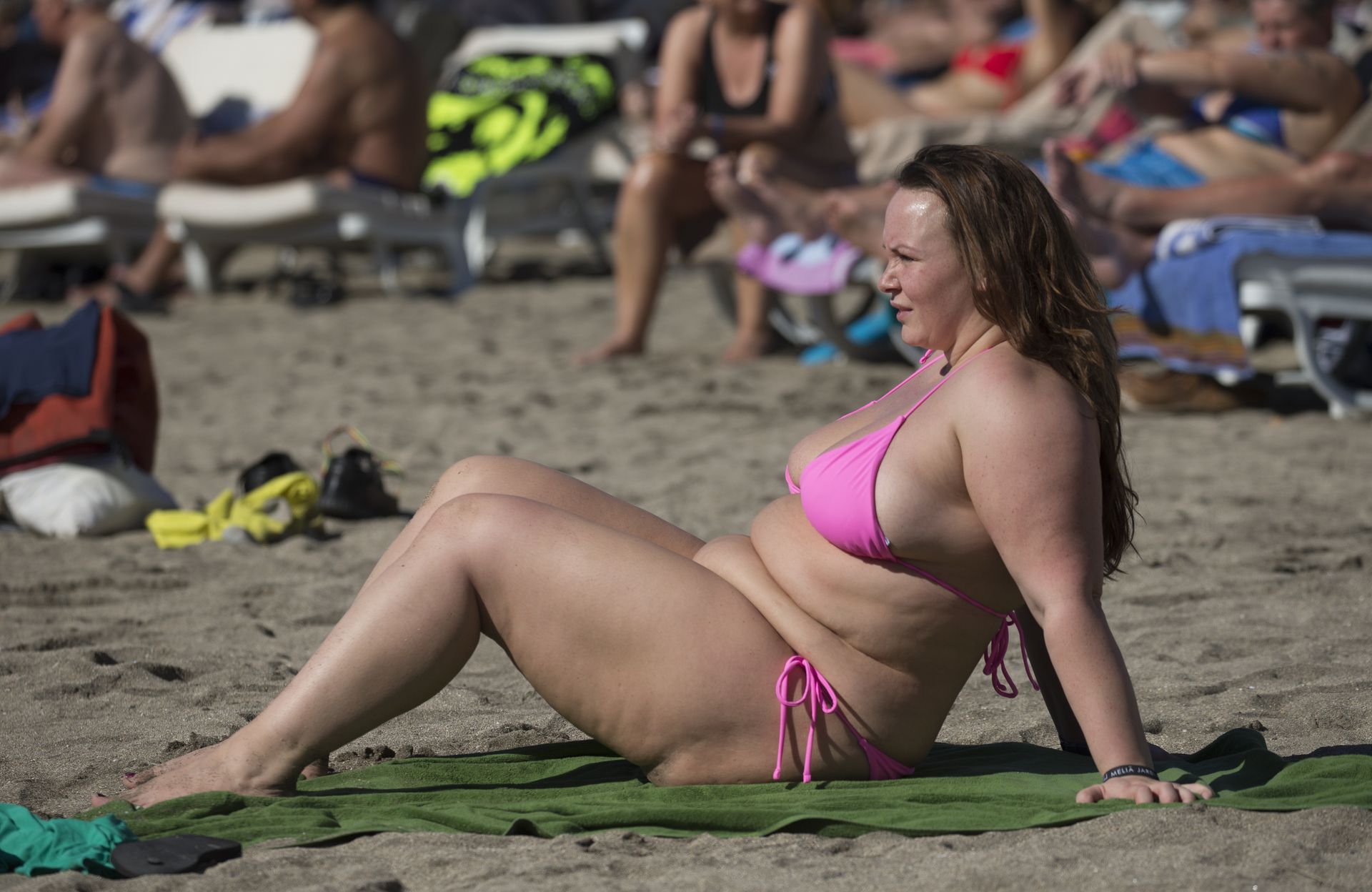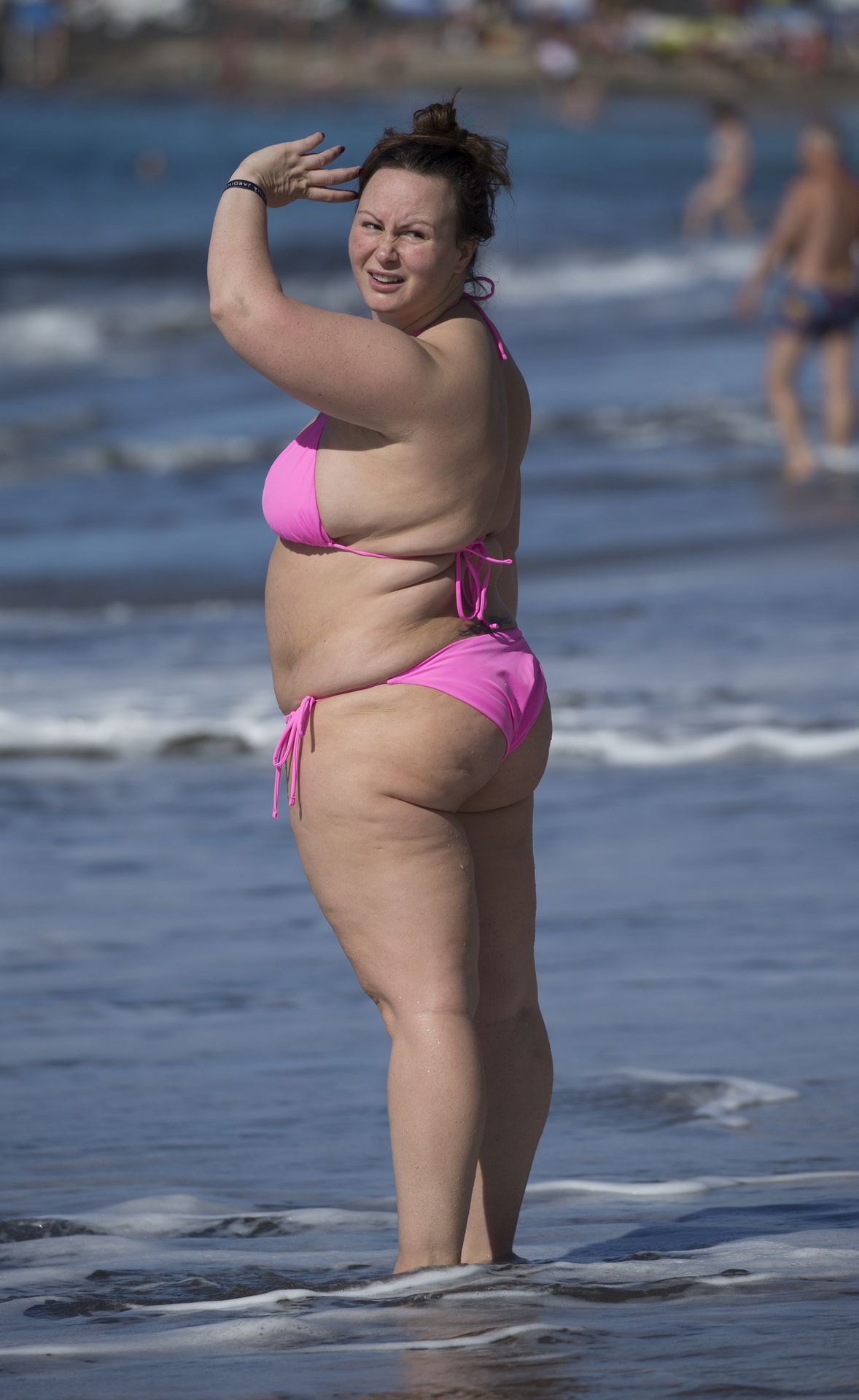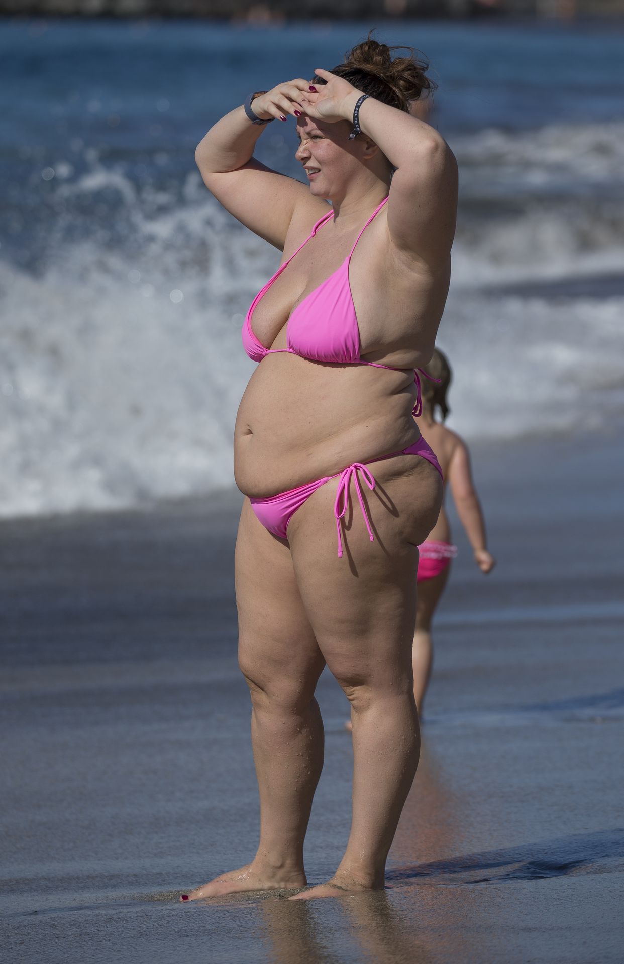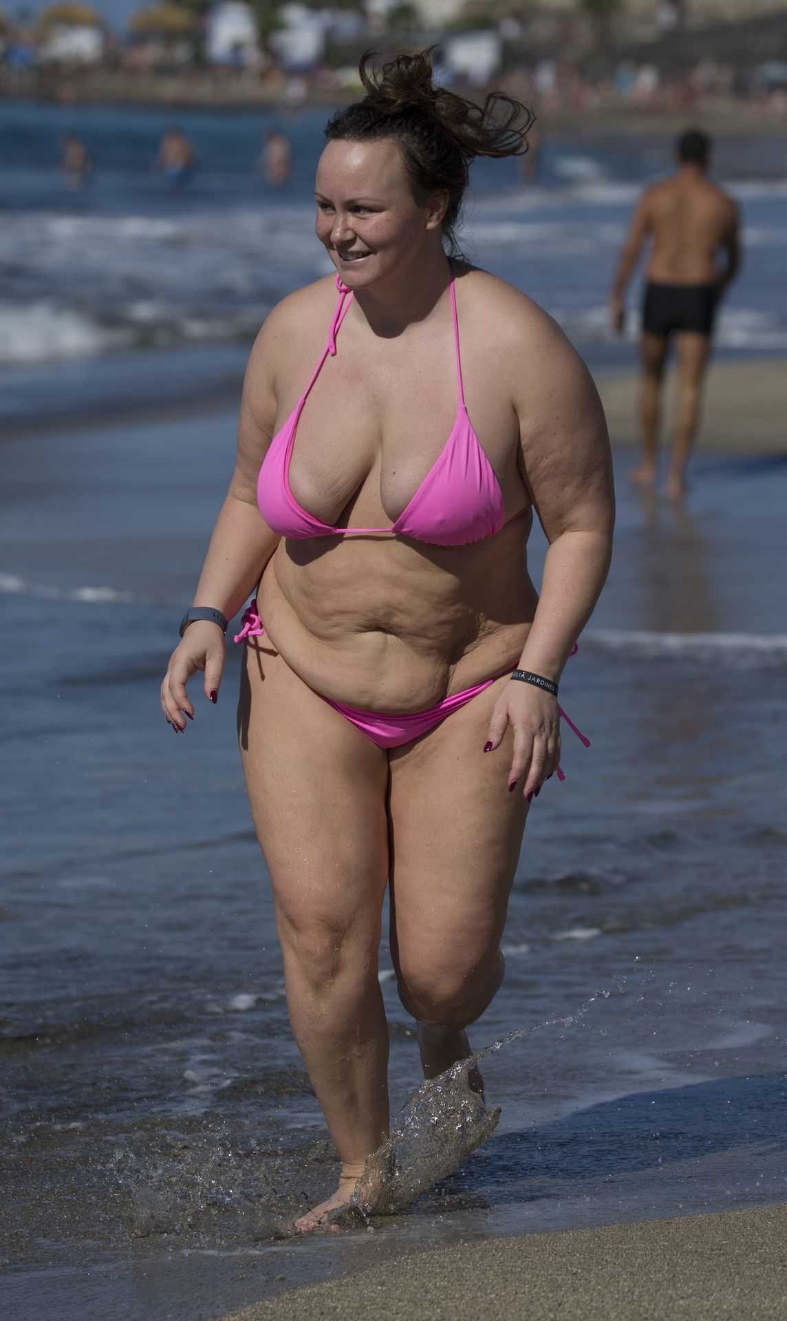 Chanelle Hayes (31) displays a fuller figure in a pink bikini as she jogs and cartwheels along the beach in Spain, 11/23/2018.