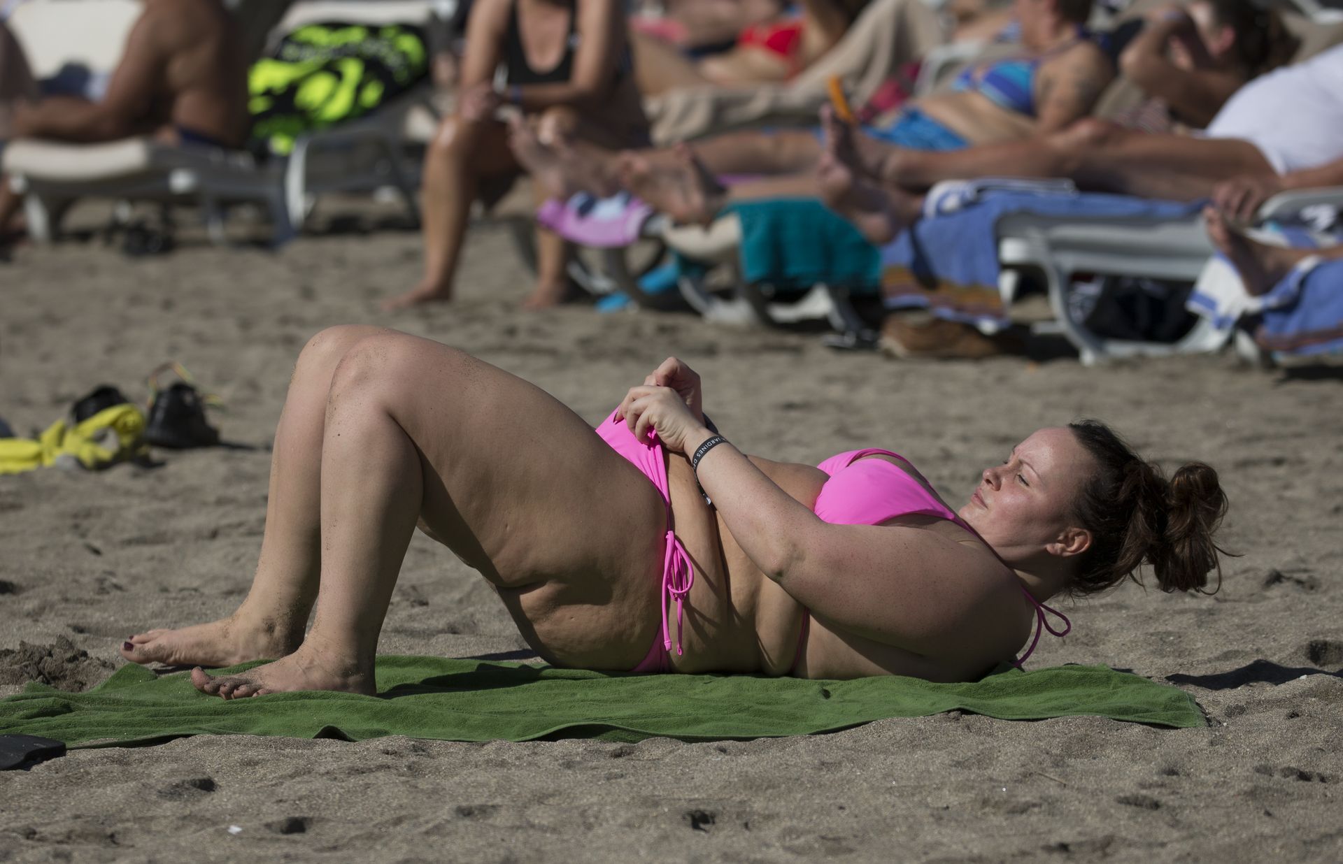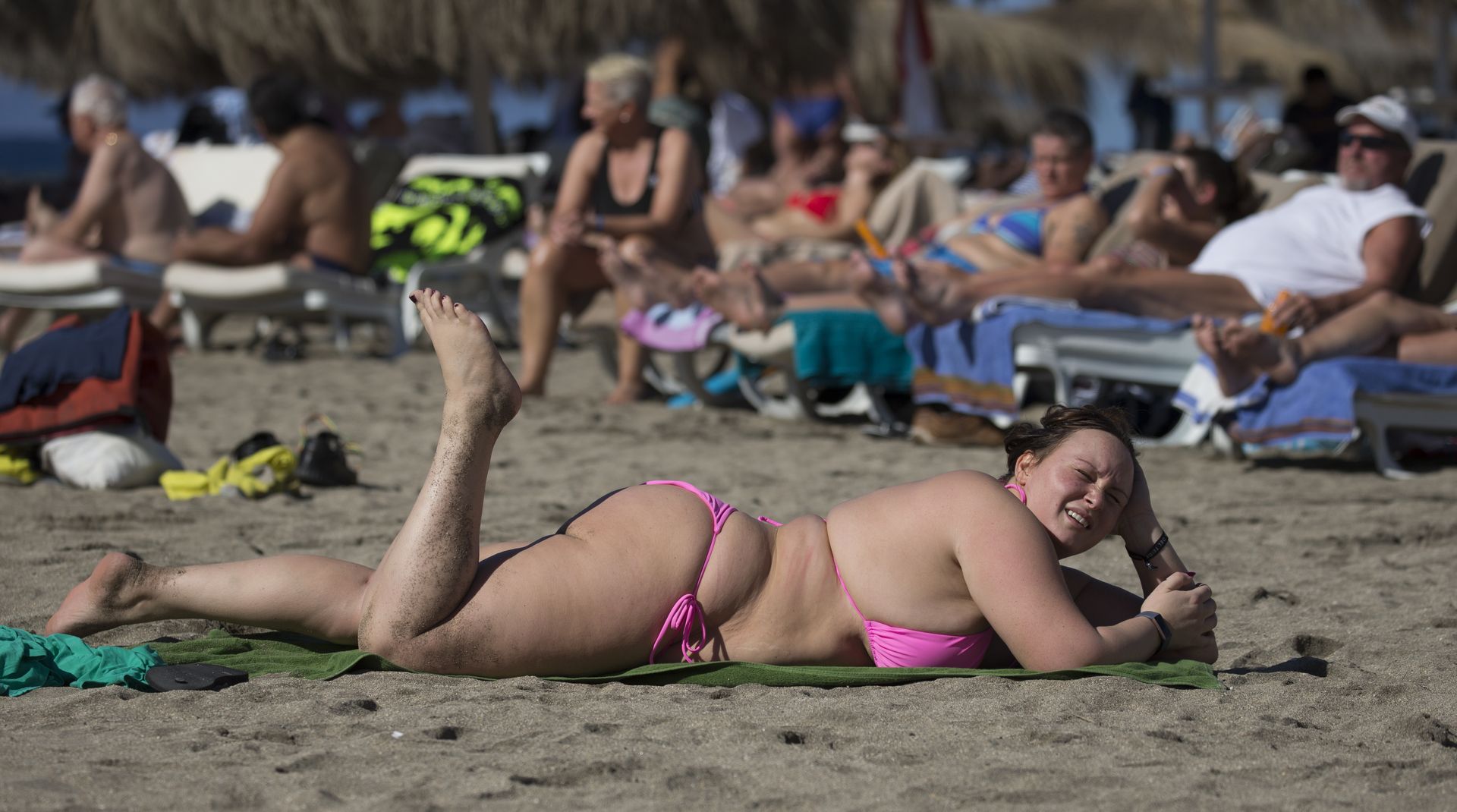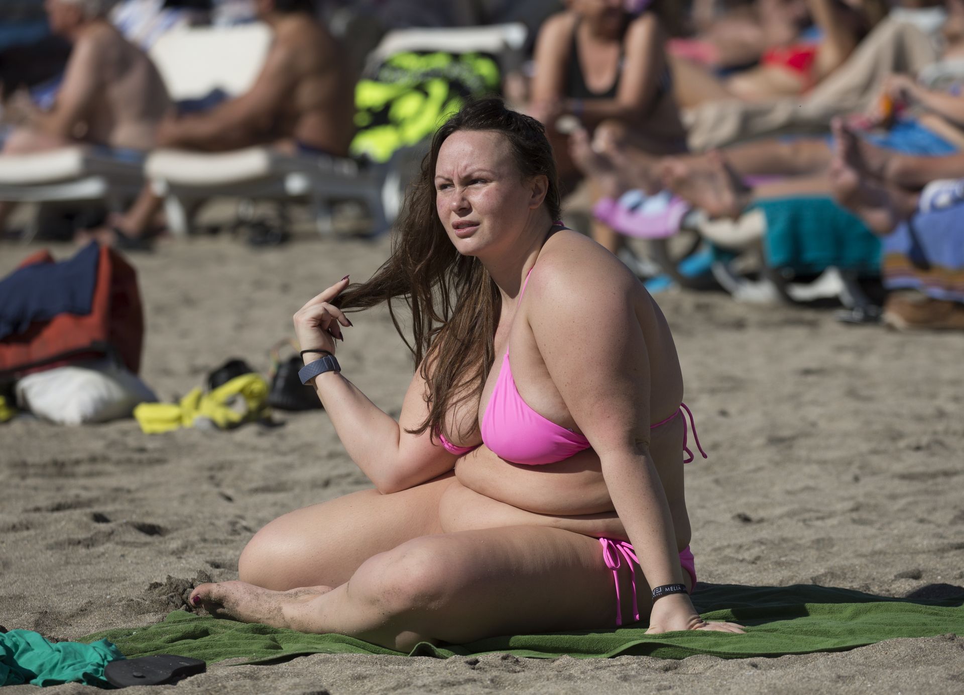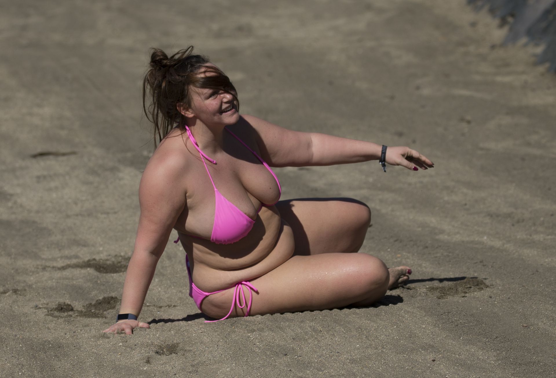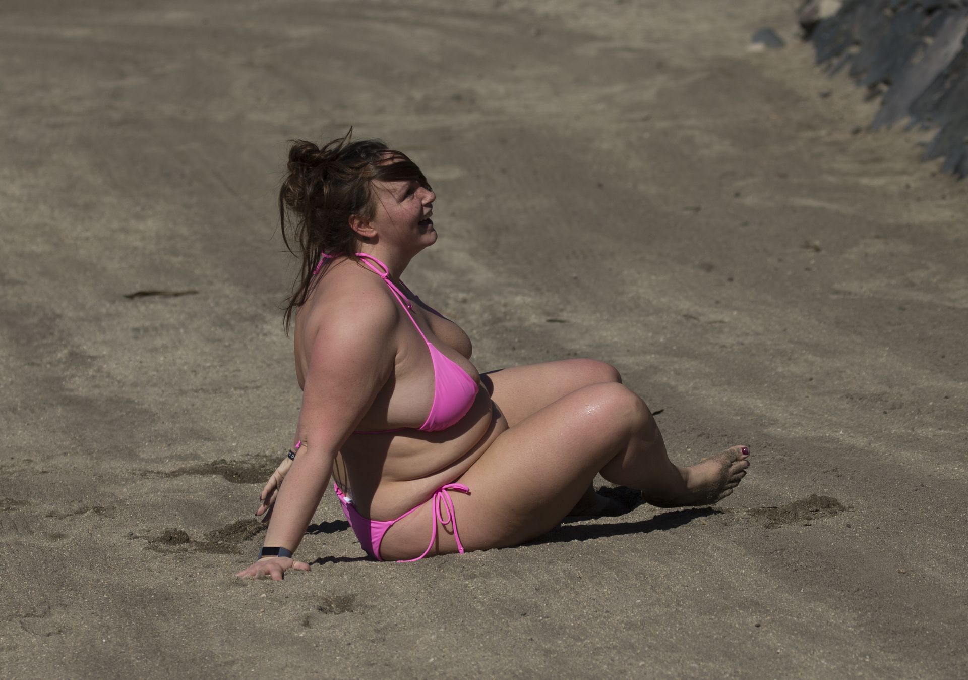Chanelle Hayes (31) displays a fuller figure in a pink bikini as she jogs and cartwheels along the beach in Spain, 11/23/2018.
