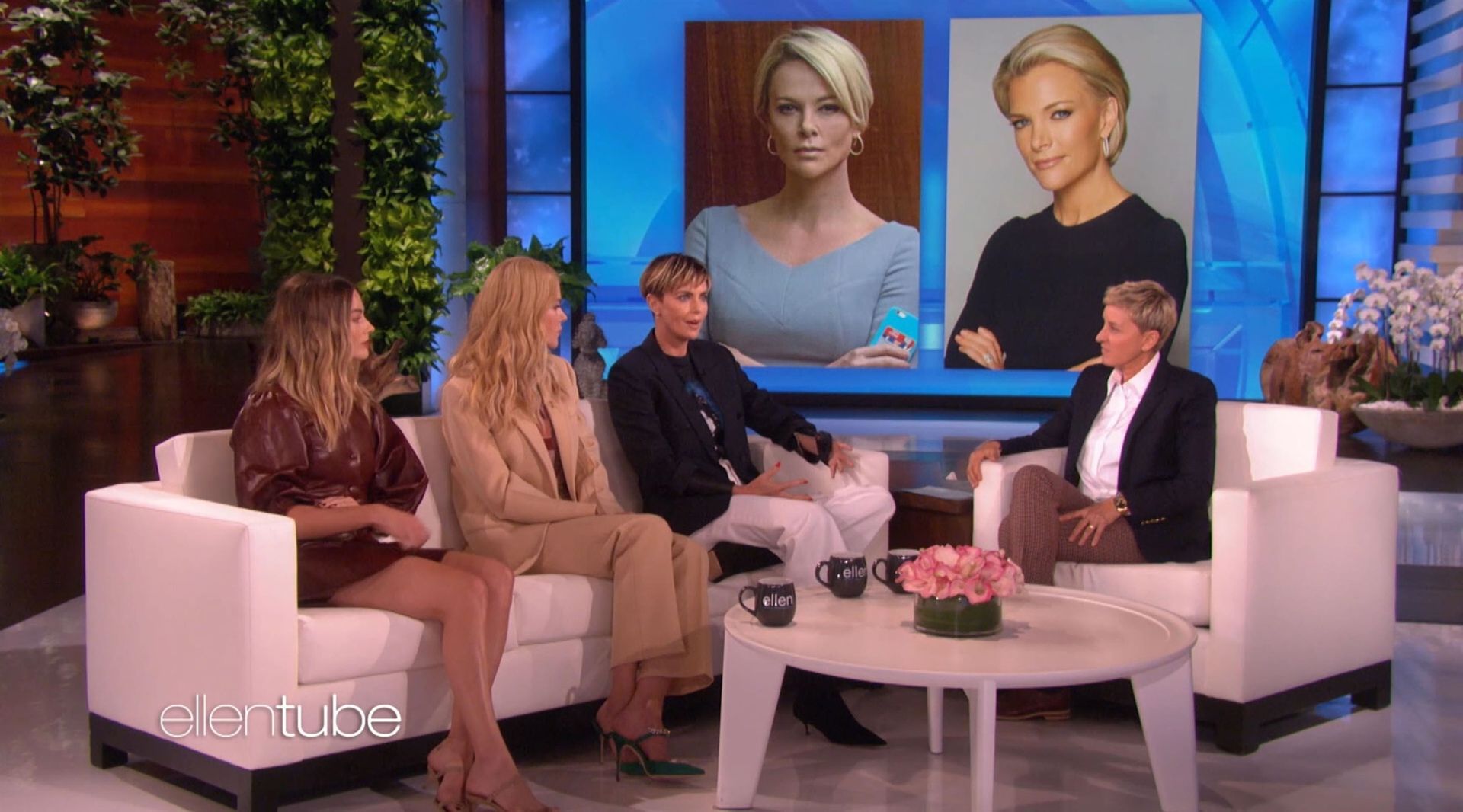 Charlize Theron gushes over dream Bombshell co-stars while dishing on Megyn Kelly as she appears on The Ellen Show with co-stars Nicole Kidman and Margot Robbie. Theron revealed she is grateful for the chance to work with her Bombshell co-stars Robbie and Kidman on the film, which hits movie theaters in December.