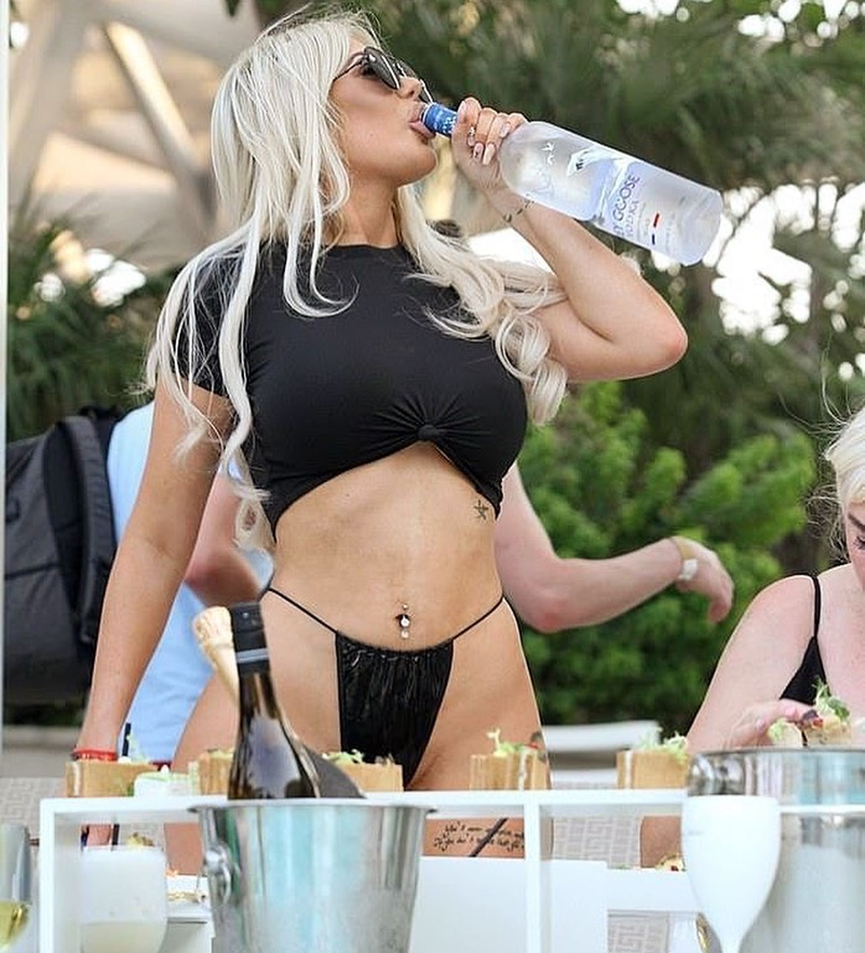 Surrounded by a group of friends, Chloe doesn’t look like she’s holding back wearing a black thong and in full part mode determined to have some fun out in the Emirates sunshine.
