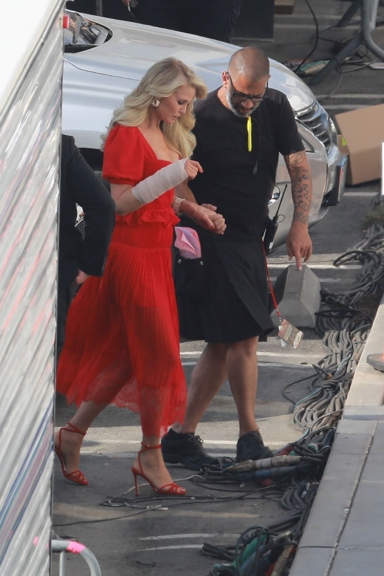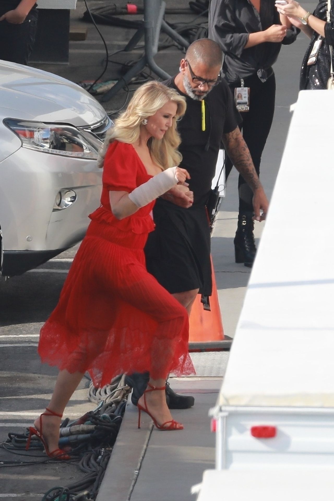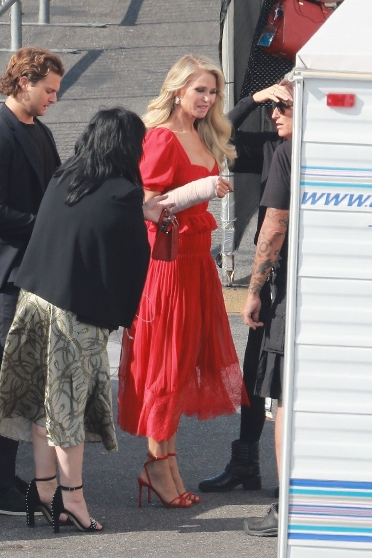 Sailor Lee‘s mother, 65-year-old American actress, model Christie Brinkley was photographed with a damaged arm and wearing a red dress while preparing for the “Dancing with the Stars” live show in Los Angeles, 09/16/2019.