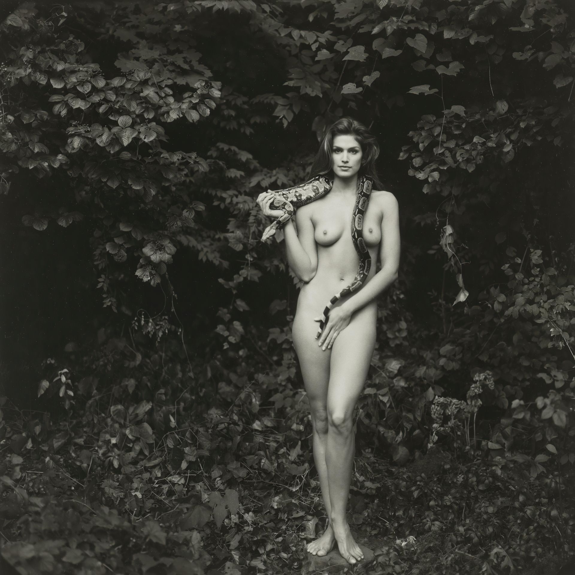 Cindy Crawford’s colorized nude photo by Annie Leibovitz is here (1993). Young Cindy posed completely naked with a snake covering her pussy with her hand. You’d let her touch your python.