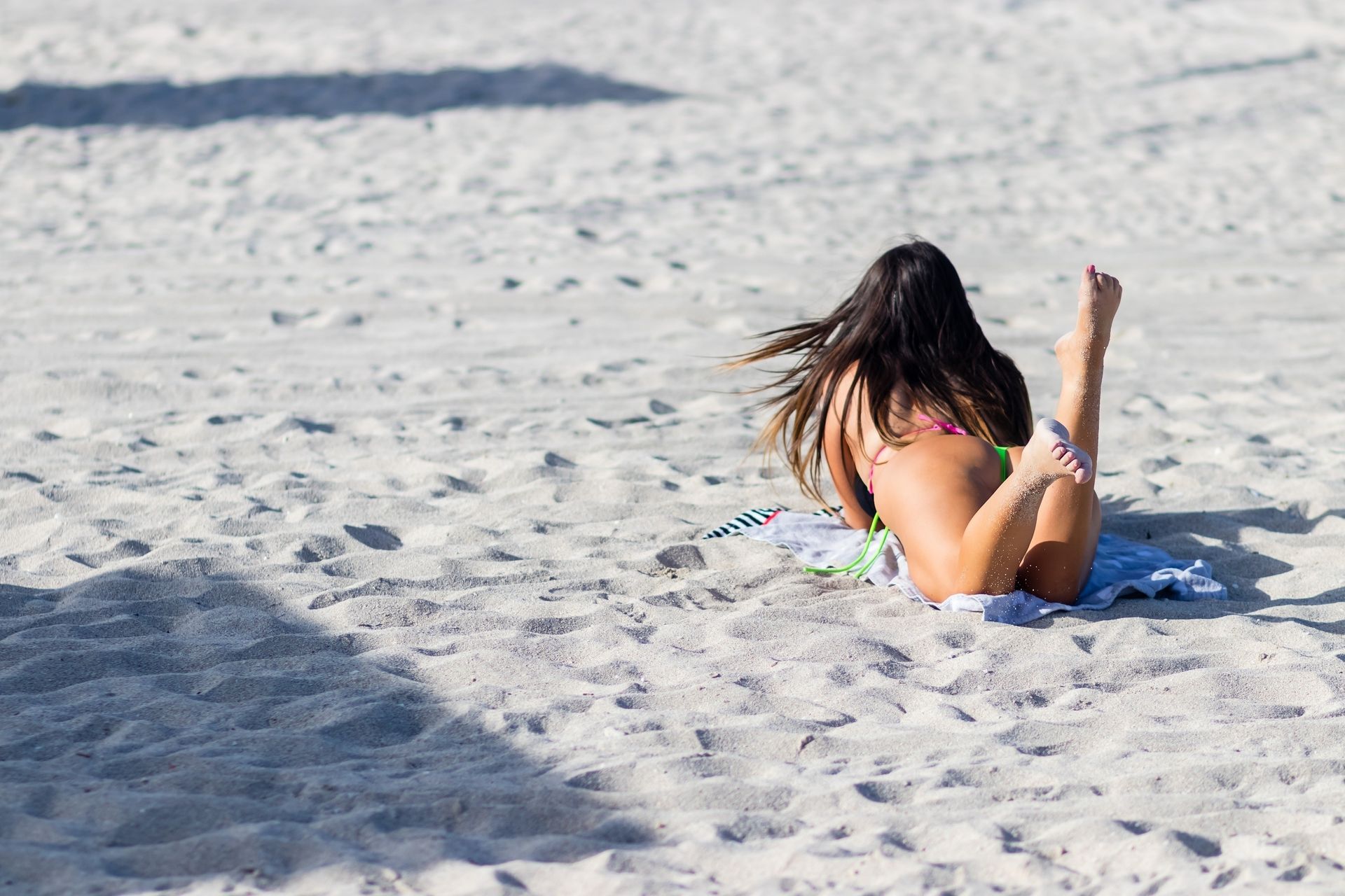 Claudia Romani flaunts her curvy body in a neon lime black and pink thong bikini while lounging on South Beach, 07/28/2019. The model and reality star was making onlookers happy.