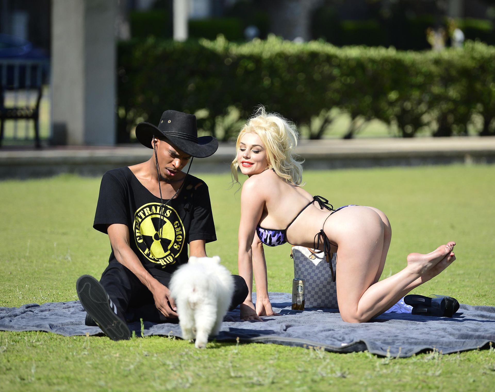 Courtney Stodden lets loose in a purple leopard print bikini as she soaks up the sun with a male friend and her new mini Pomeranian puppy in Beverly Hills, 07/31/2019.