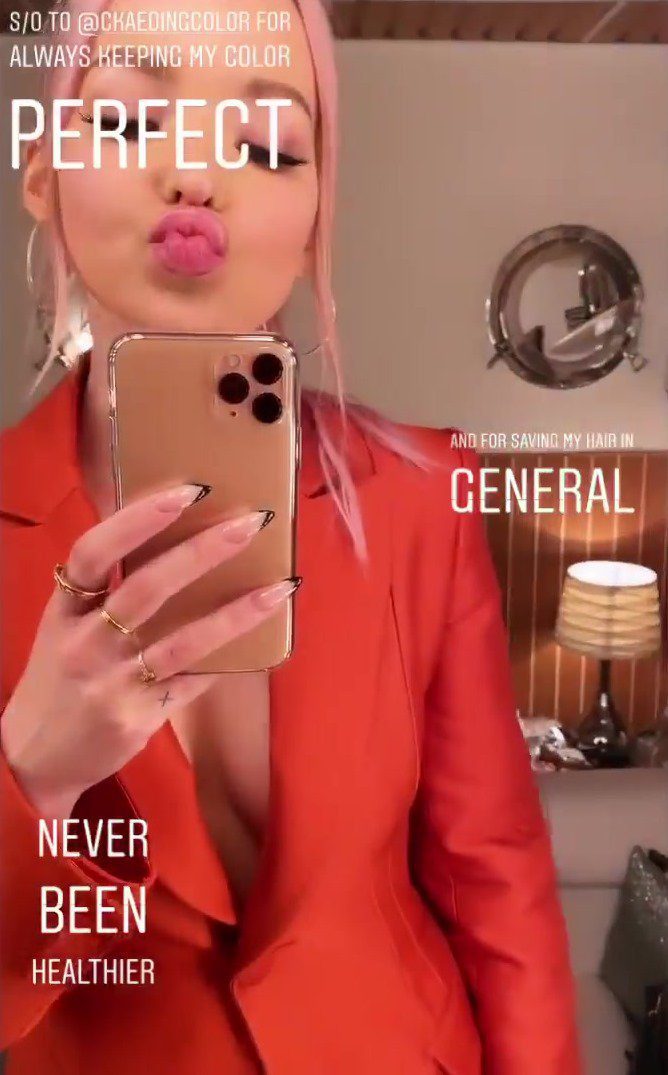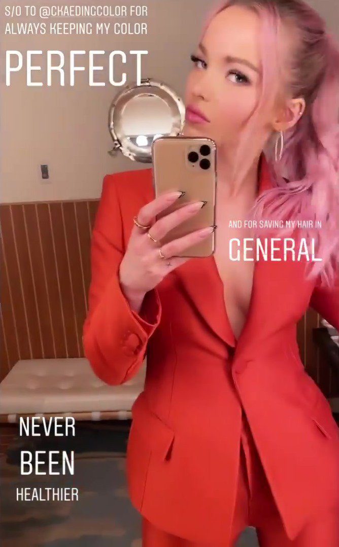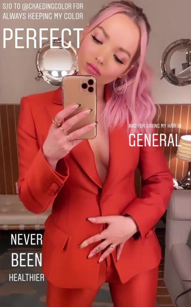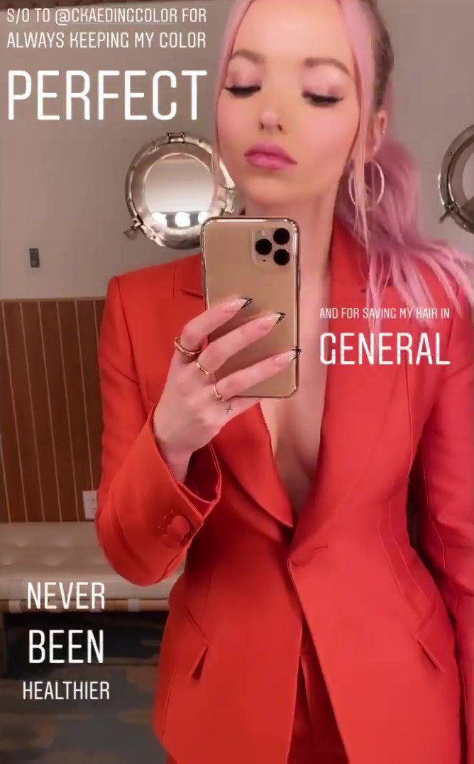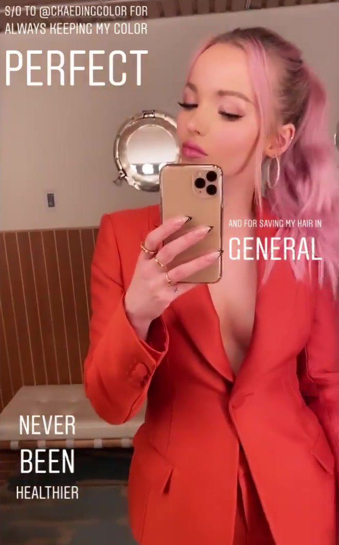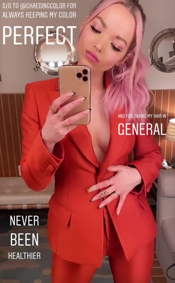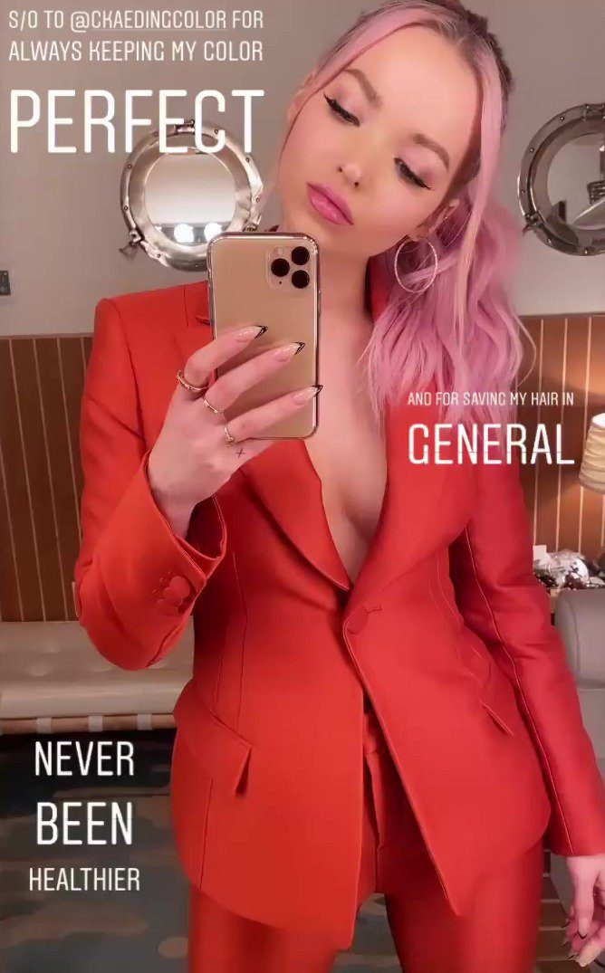 American actress/singer Dove Cameron flaunts her cleavage posing braless in the red jacket – Instagram, 10/05/2019.