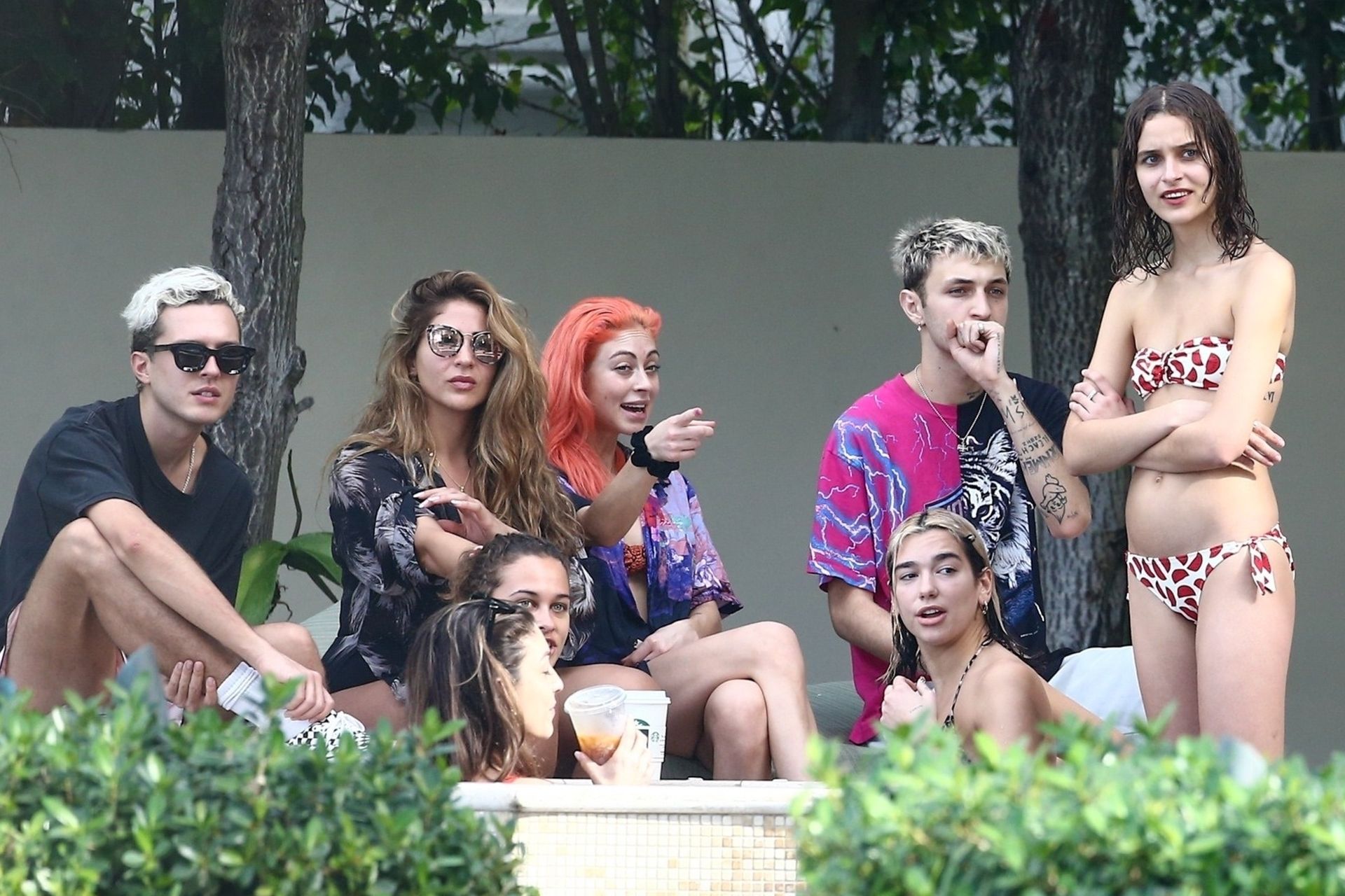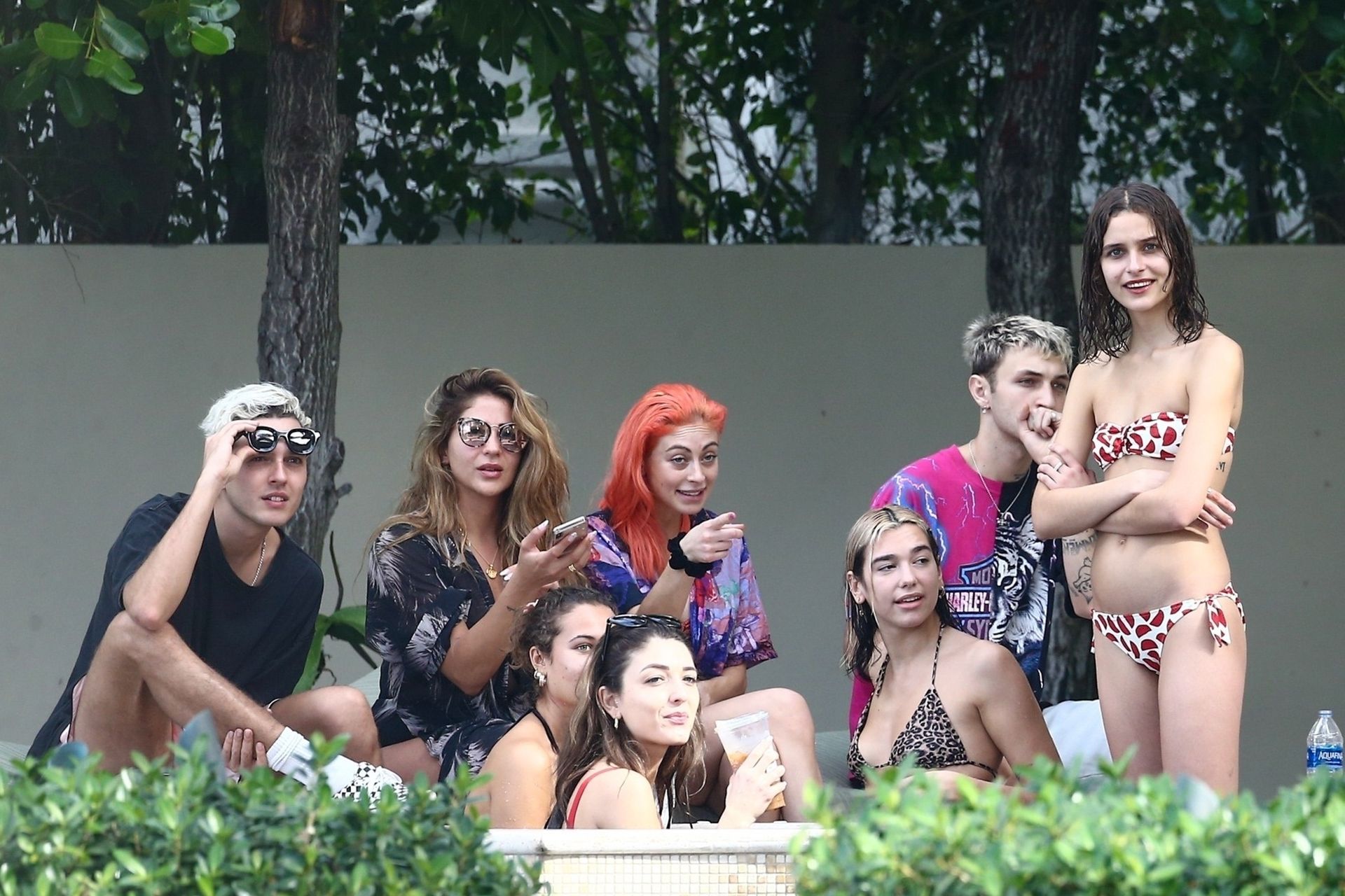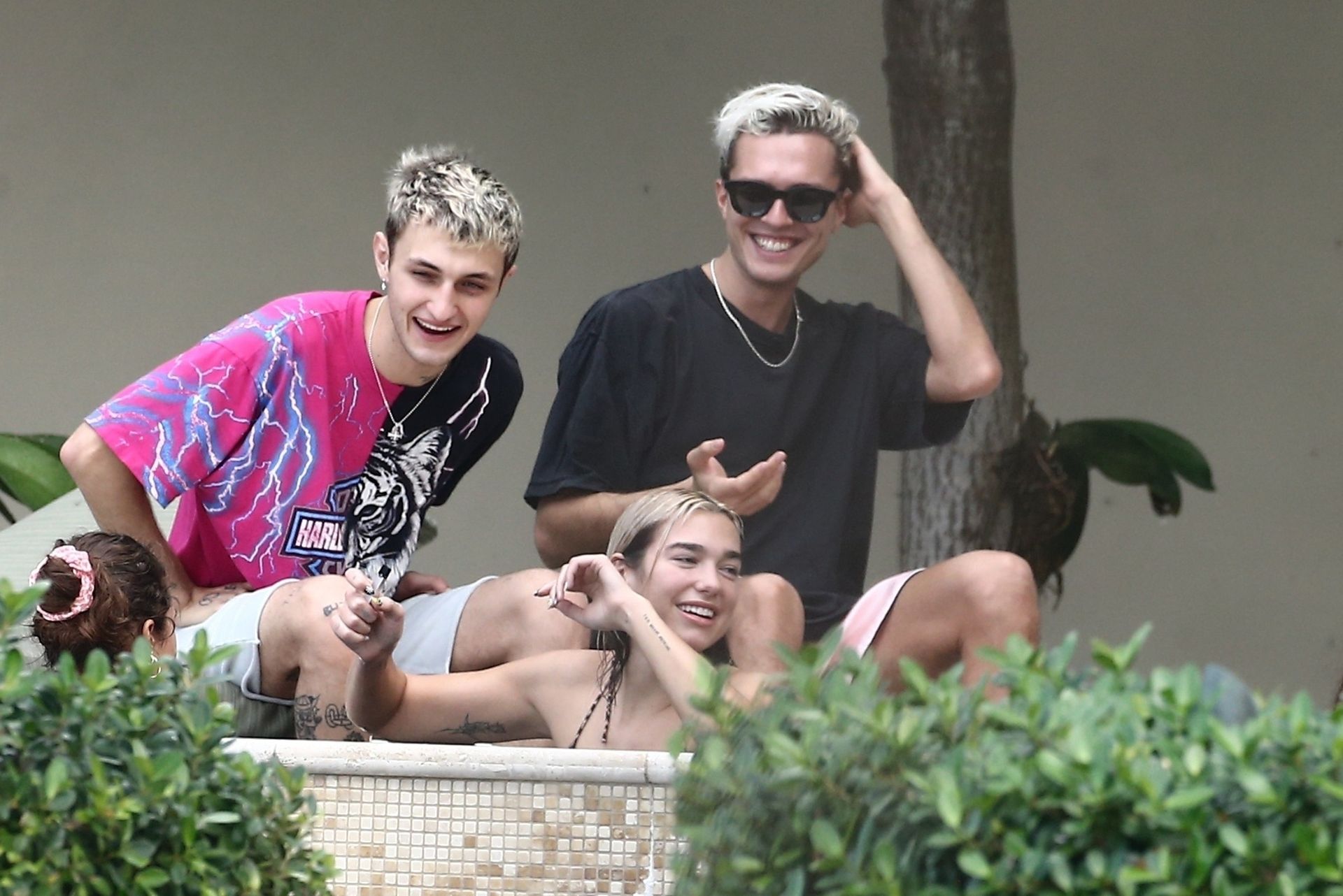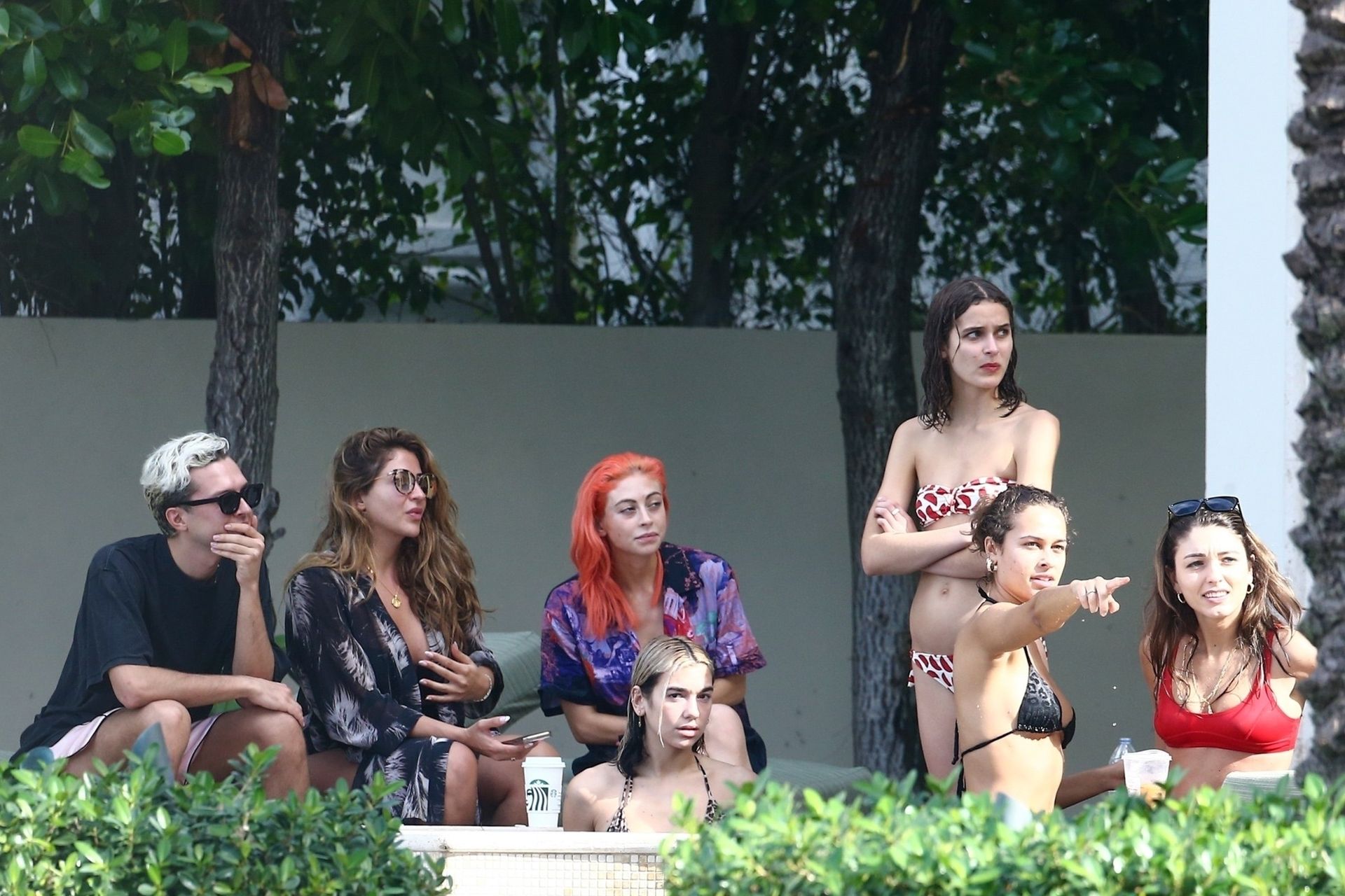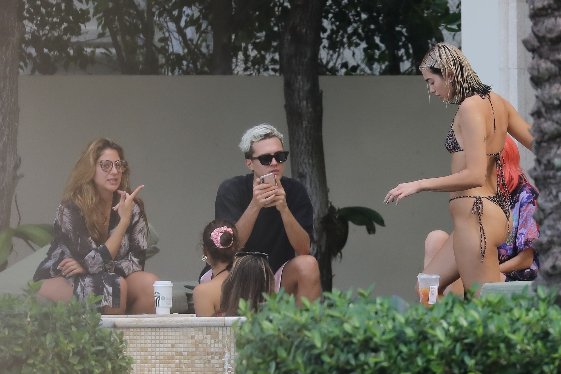 Songstress Dua Lipa is ending the year with those closest to her. The singer is joined by boyfriend Anwar Hadid and friends for rest and relaxation in Miami, 12/31/2019. The group relaxes and enjoys snacks and a smoke on a deck.