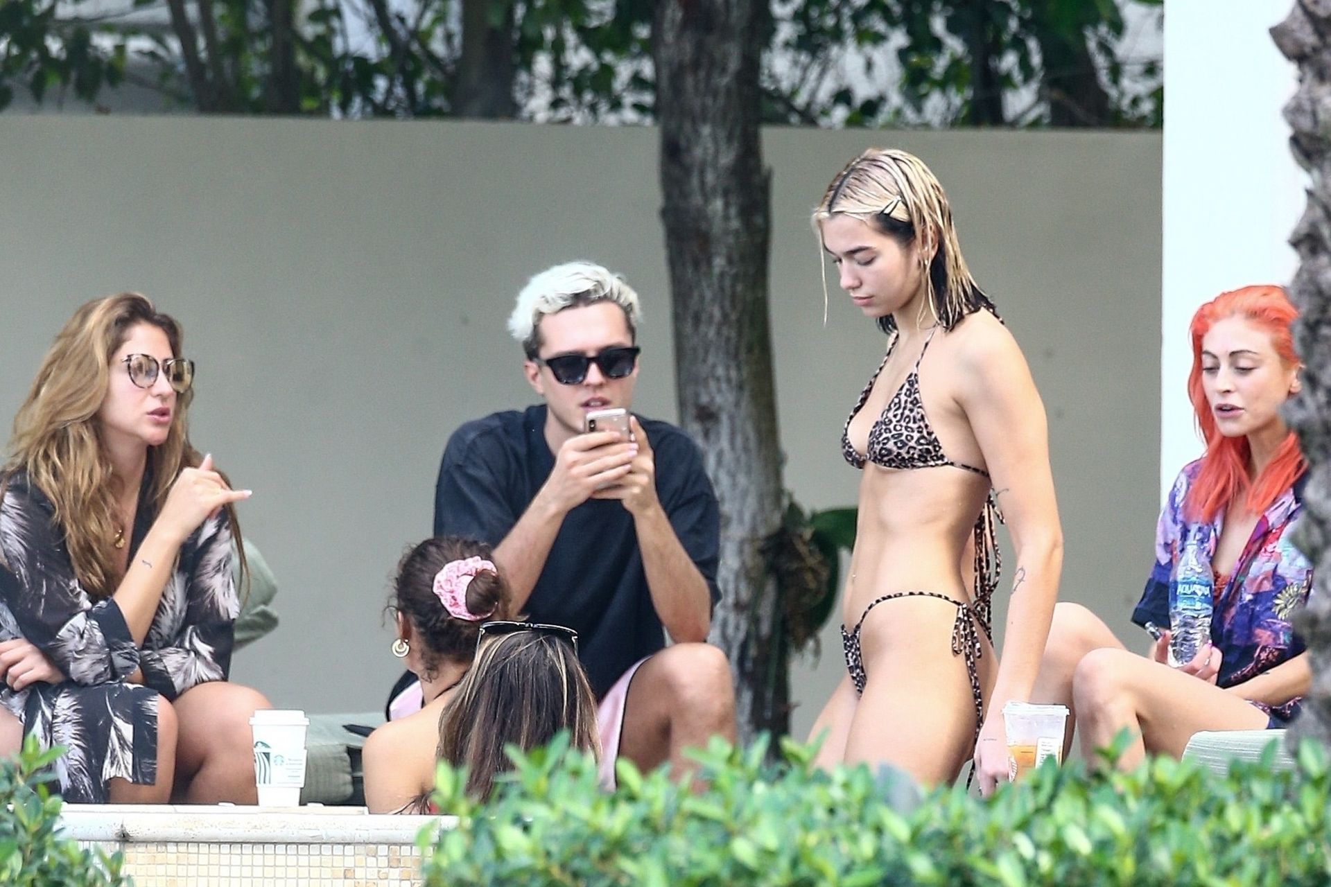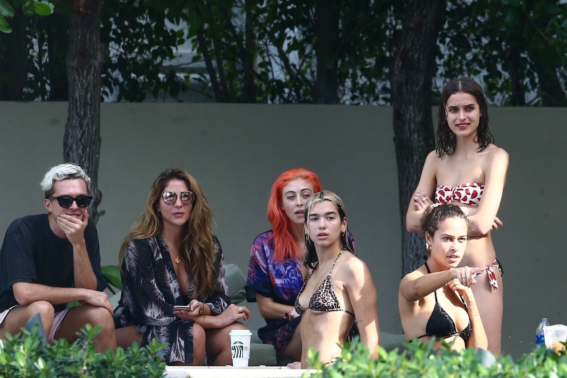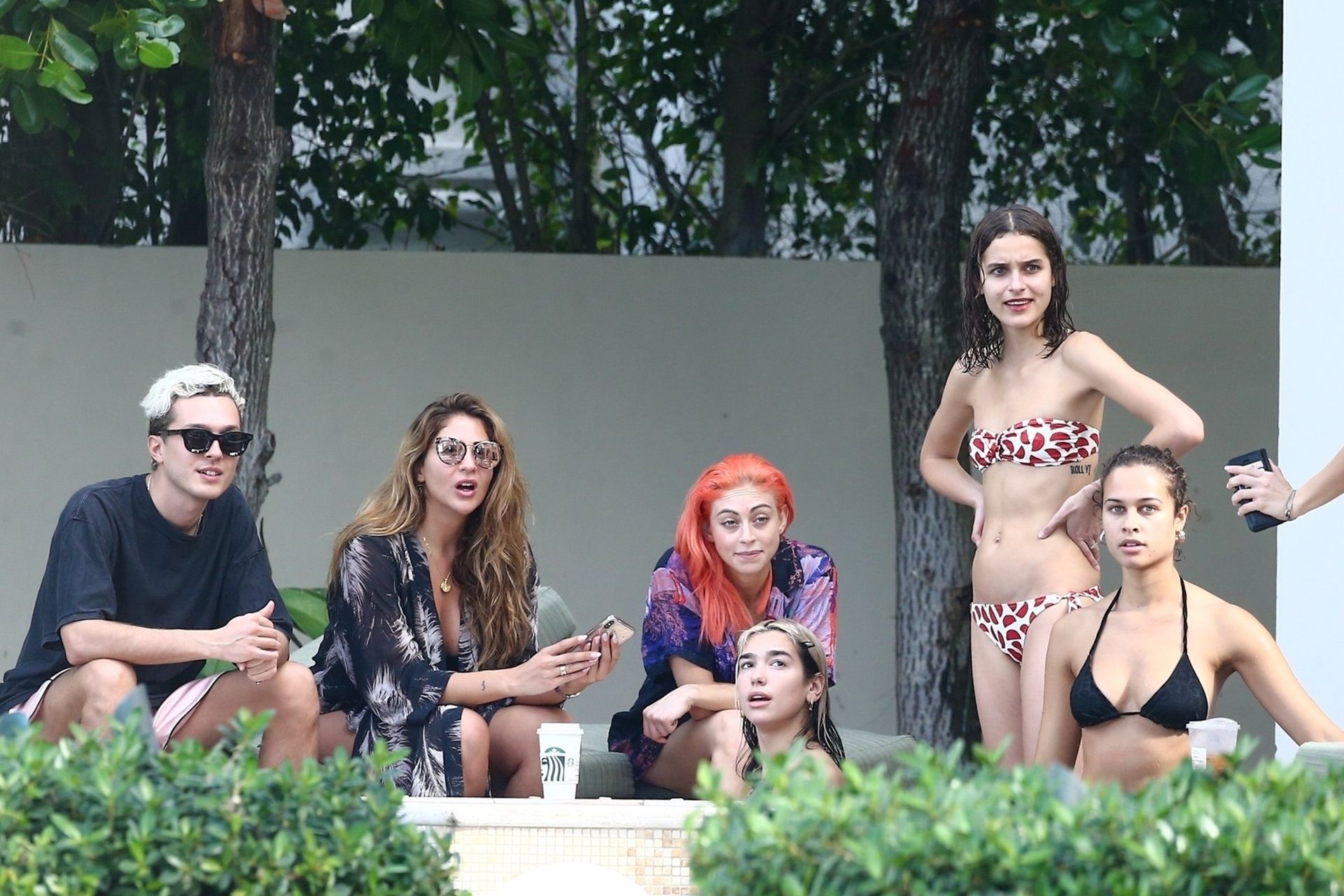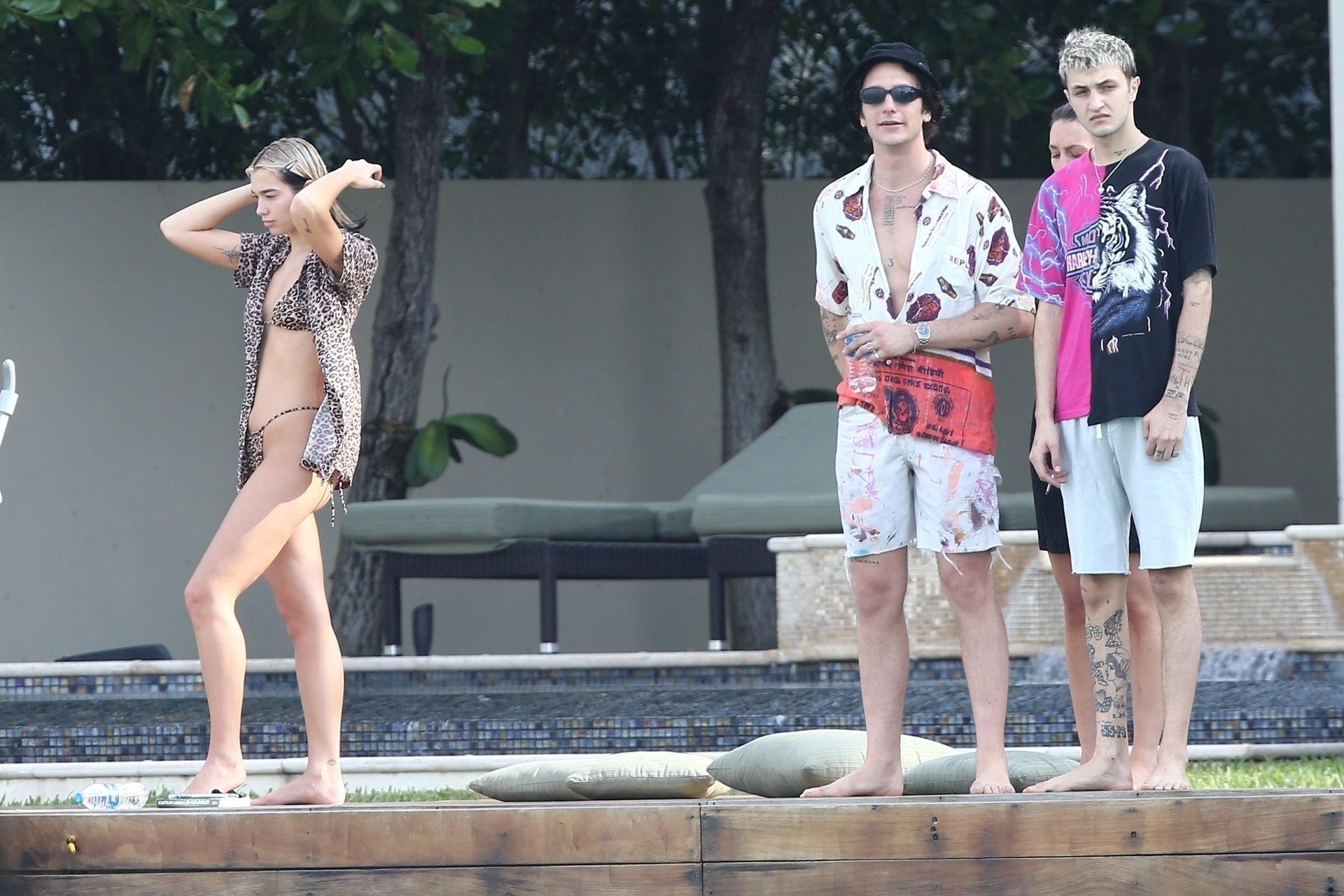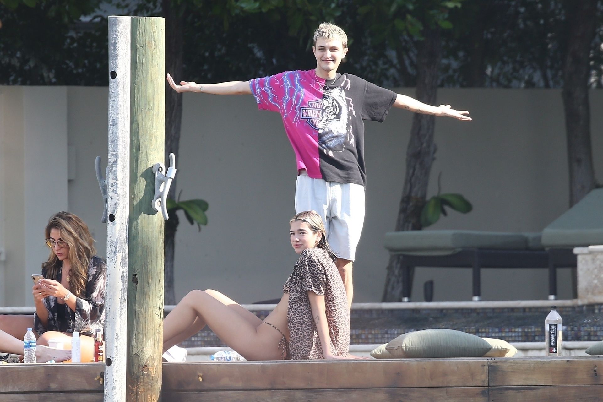 Songstress Dua Lipa is ending the year with those closest to her. The singer is joined by boyfriend Anwar Hadid and friends for rest and relaxation in Miami, 12/31/2019. The group relaxes and enjoys snacks and a smoke on a deck.