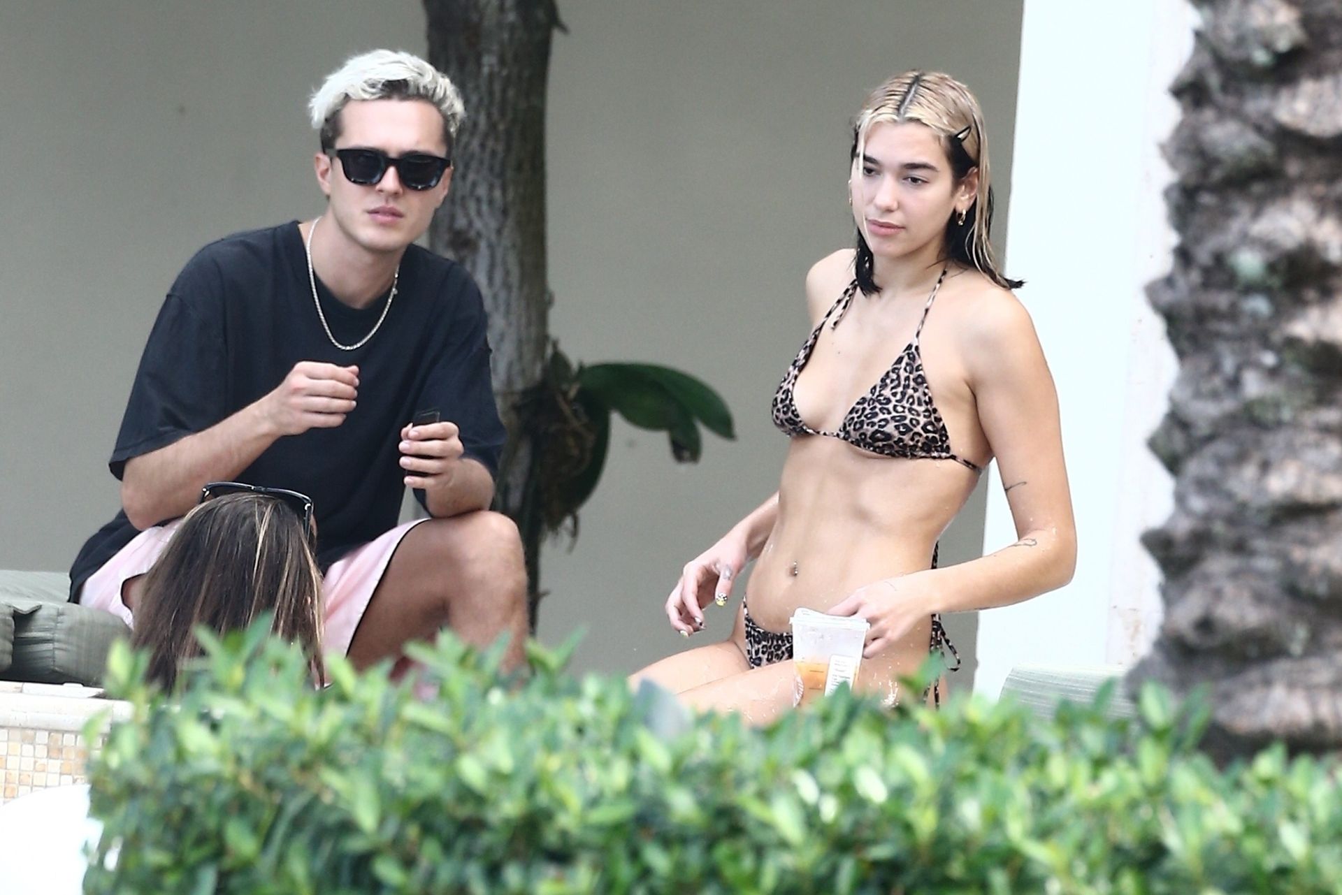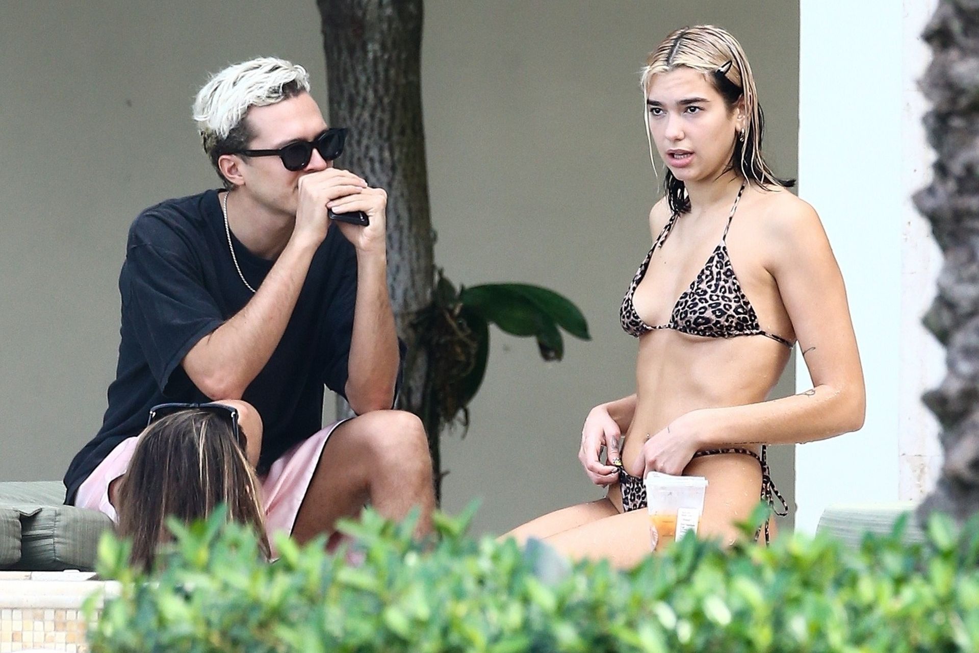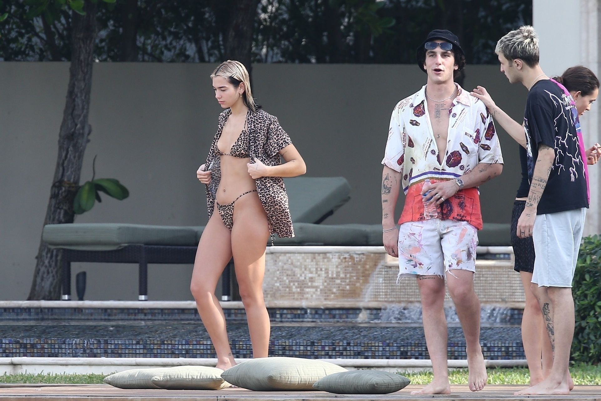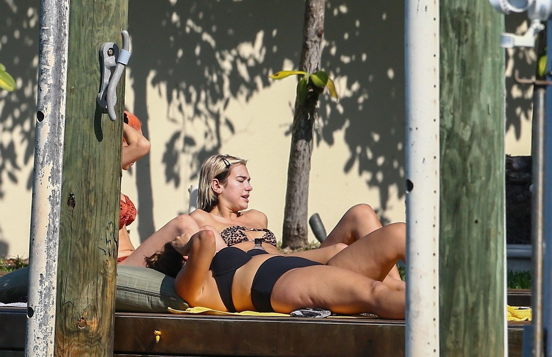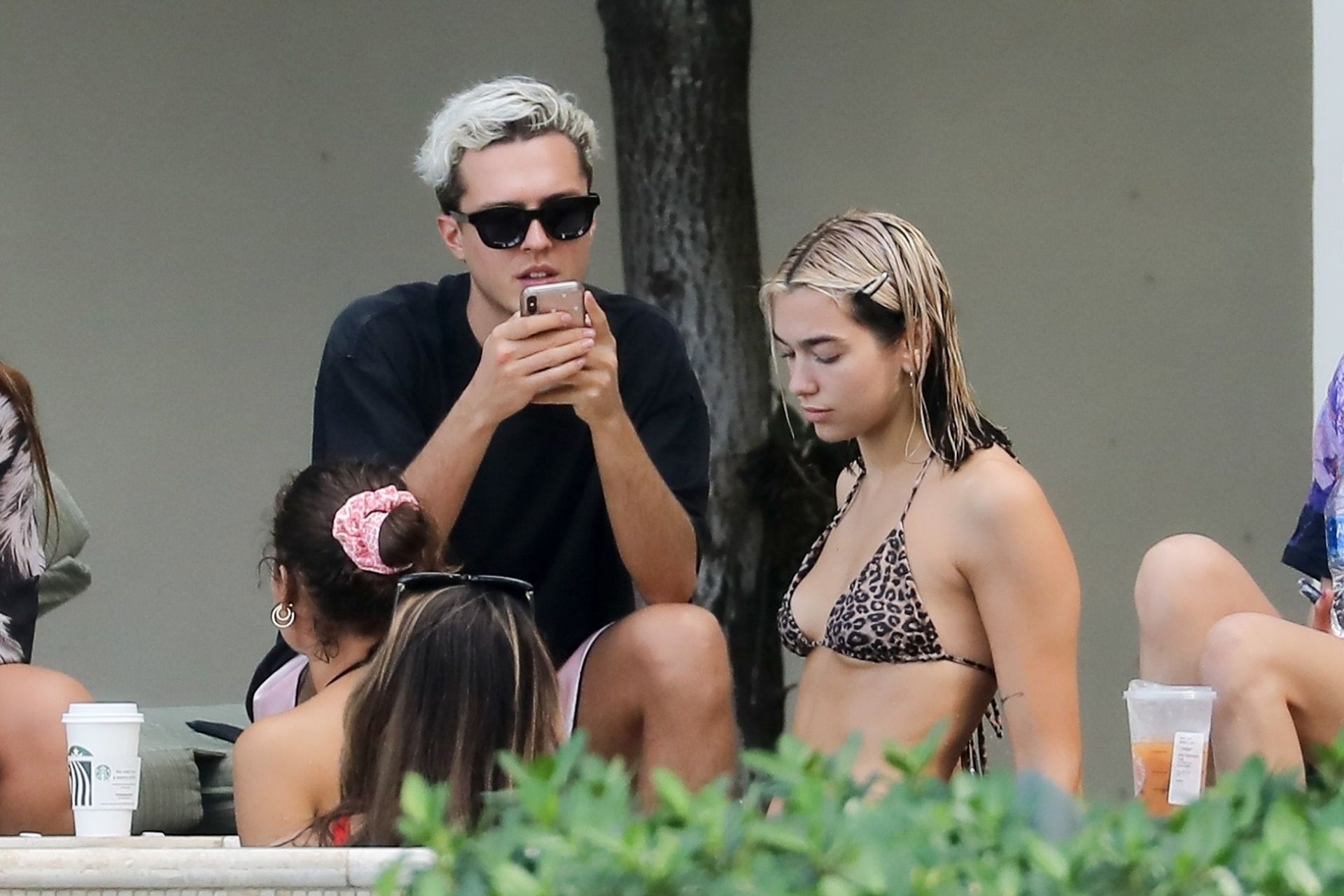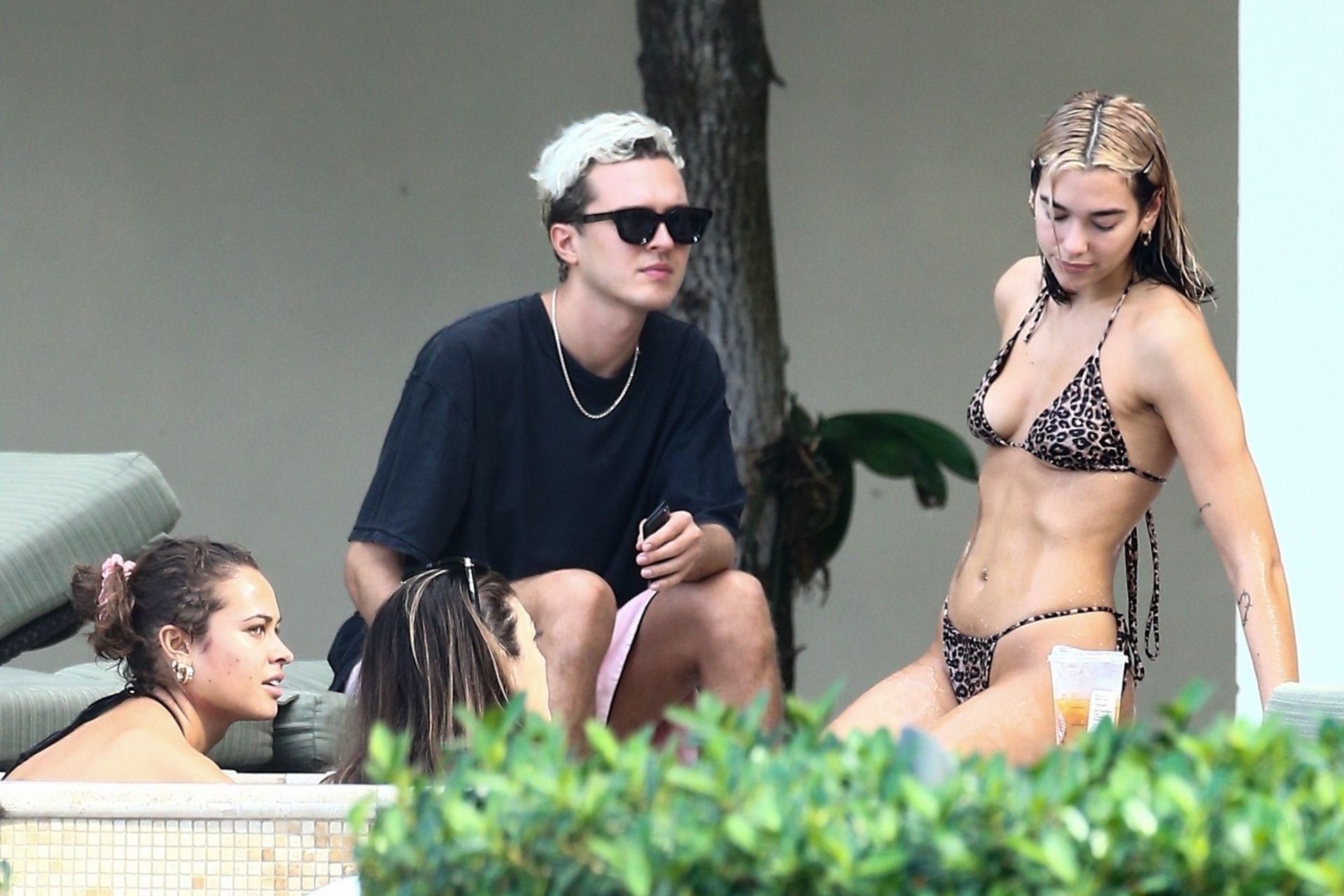 Songstress Dua Lipa is ending the year with those closest to her. The singer is joined by boyfriend Anwar Hadid and friends for rest and relaxation in Miami, 12/31/2019. The group relaxes and enjoys snacks and a smoke on a deck.