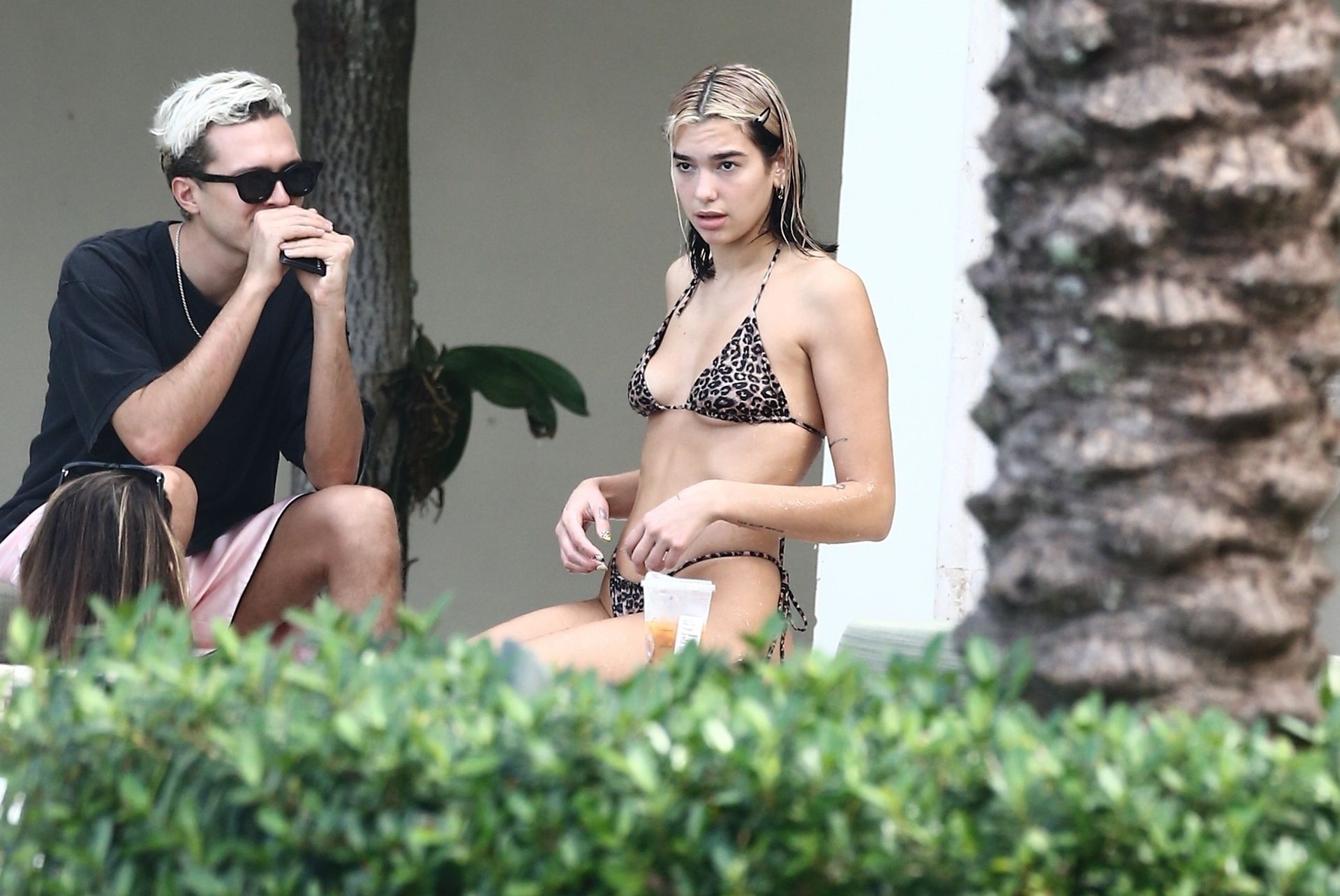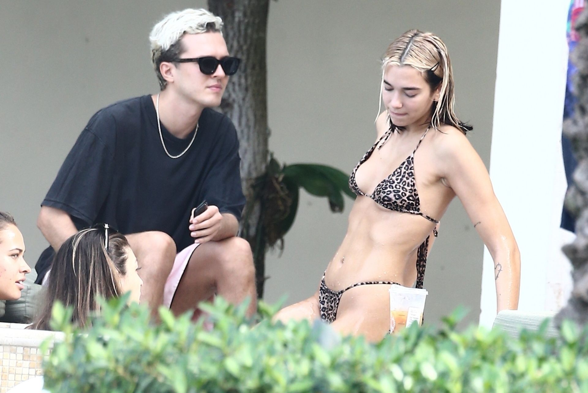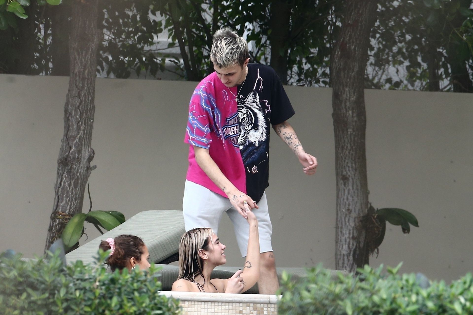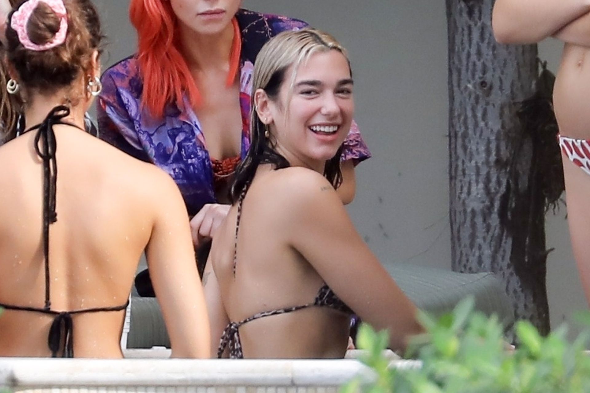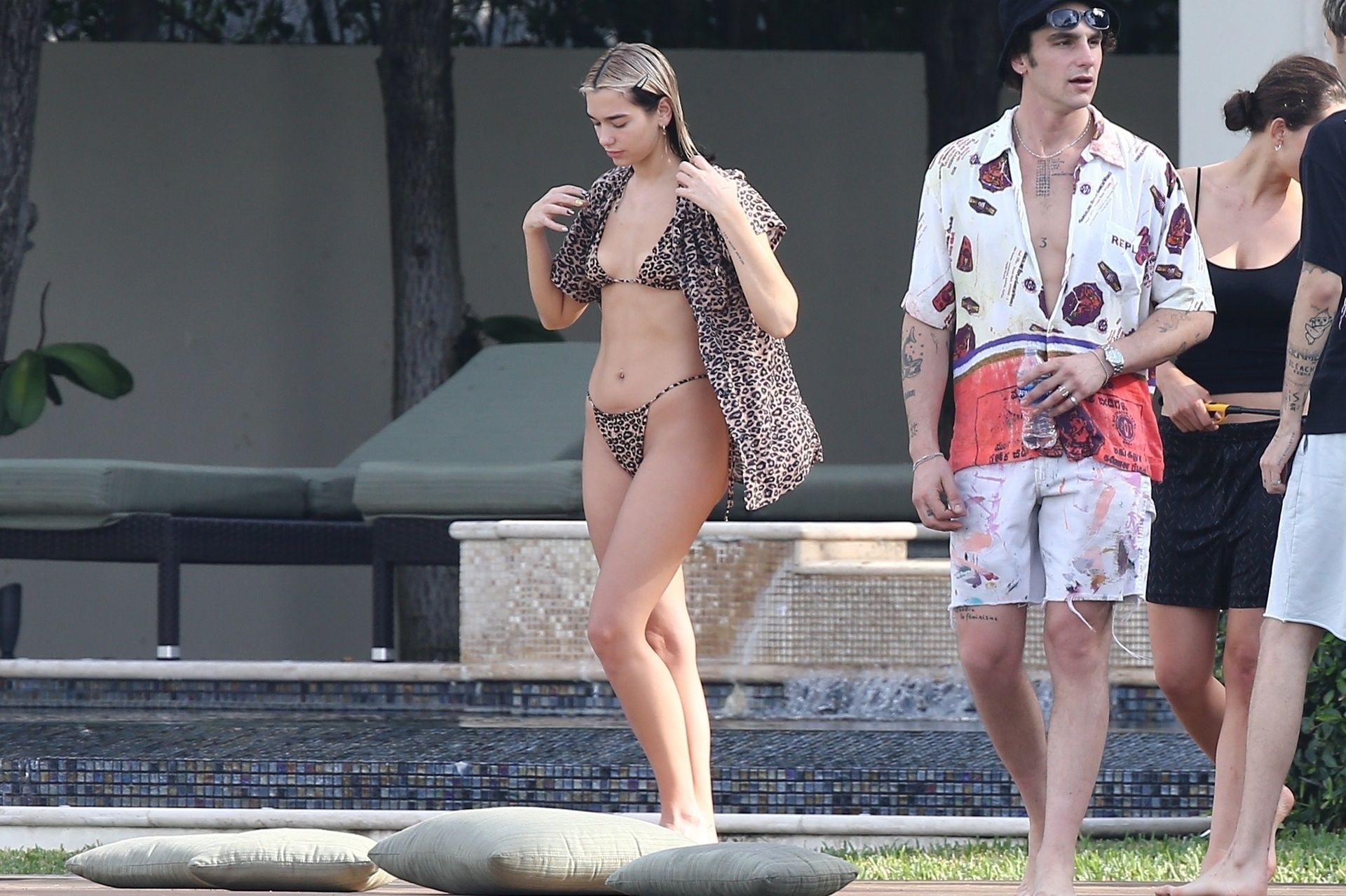 Songstress Dua Lipa is ending the year with those closest to her. The singer is joined by boyfriend Anwar Hadid and friends for rest and relaxation in Miami, 12/31/2019. The group relaxes and enjoys snacks and a smoke on a deck.