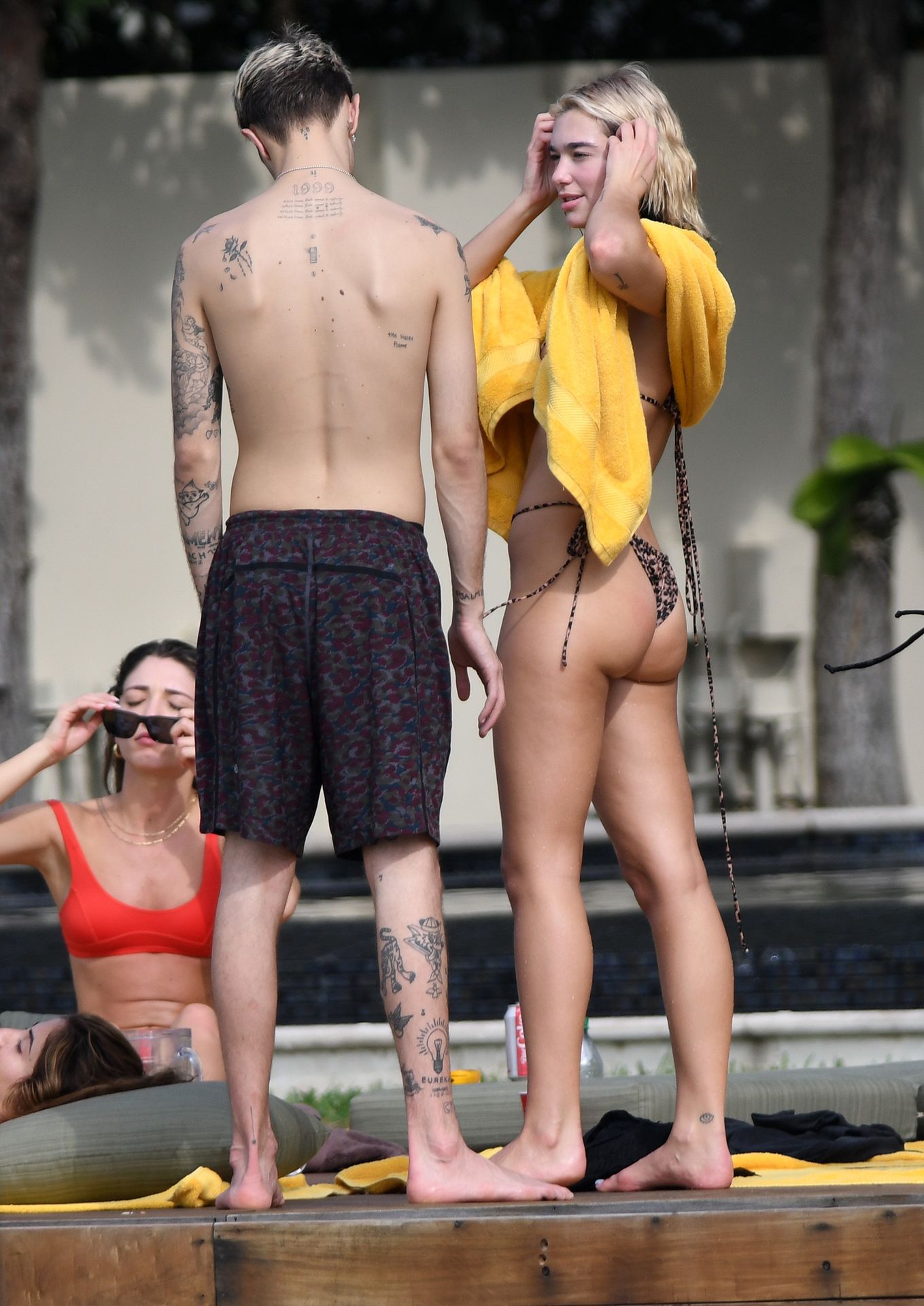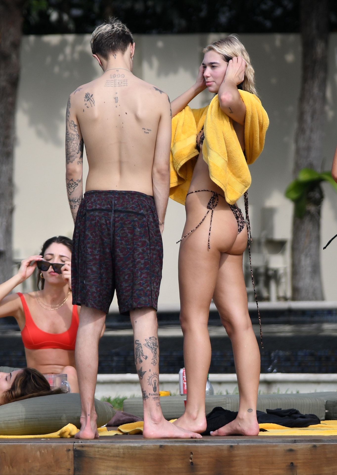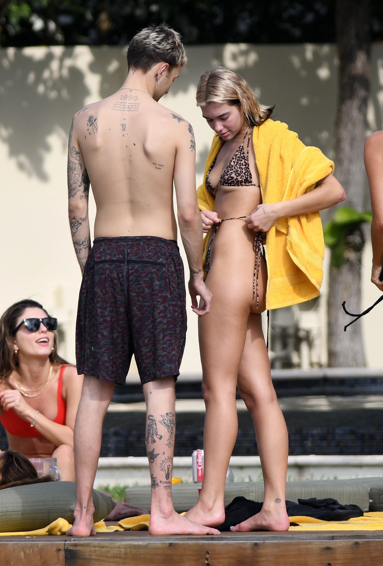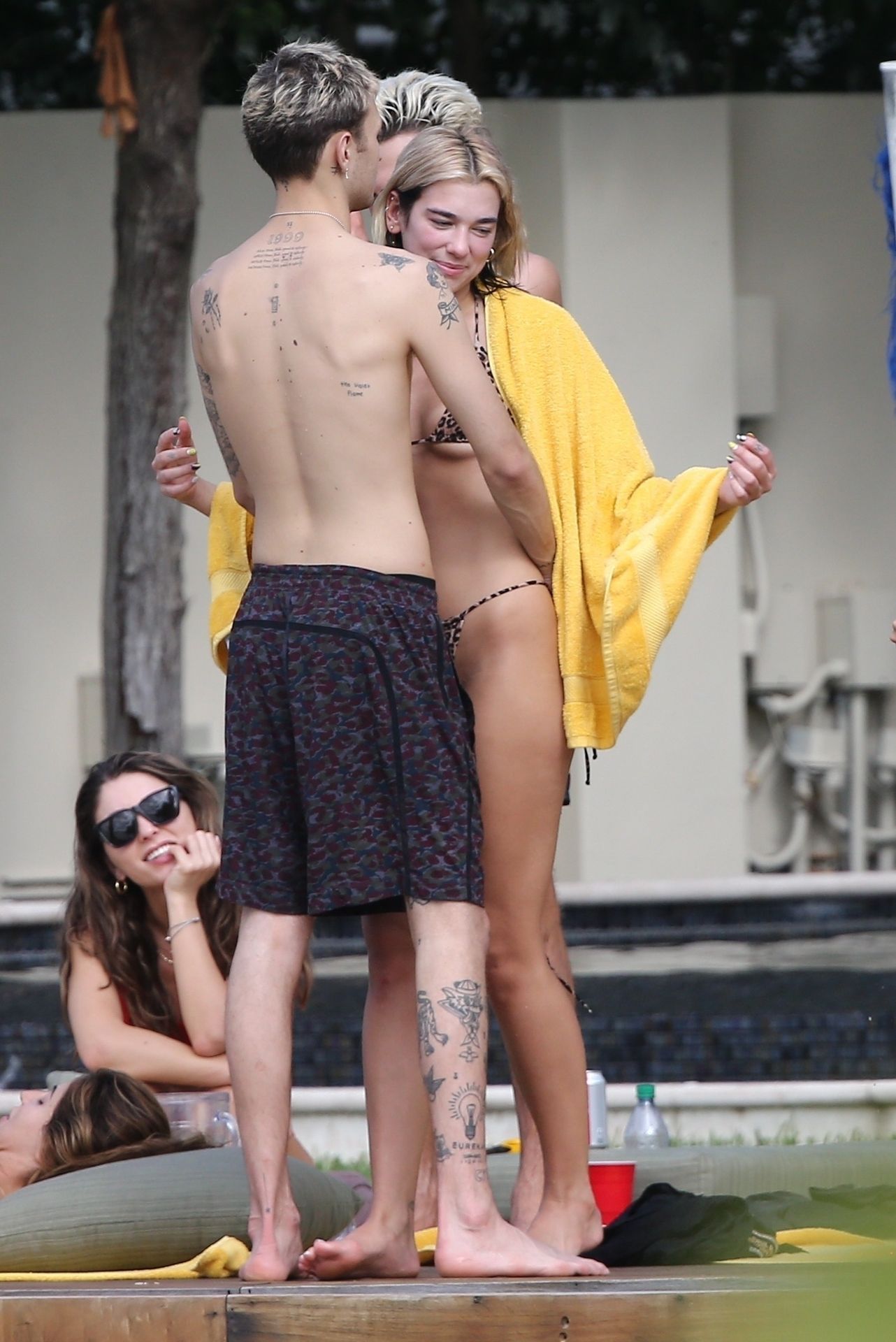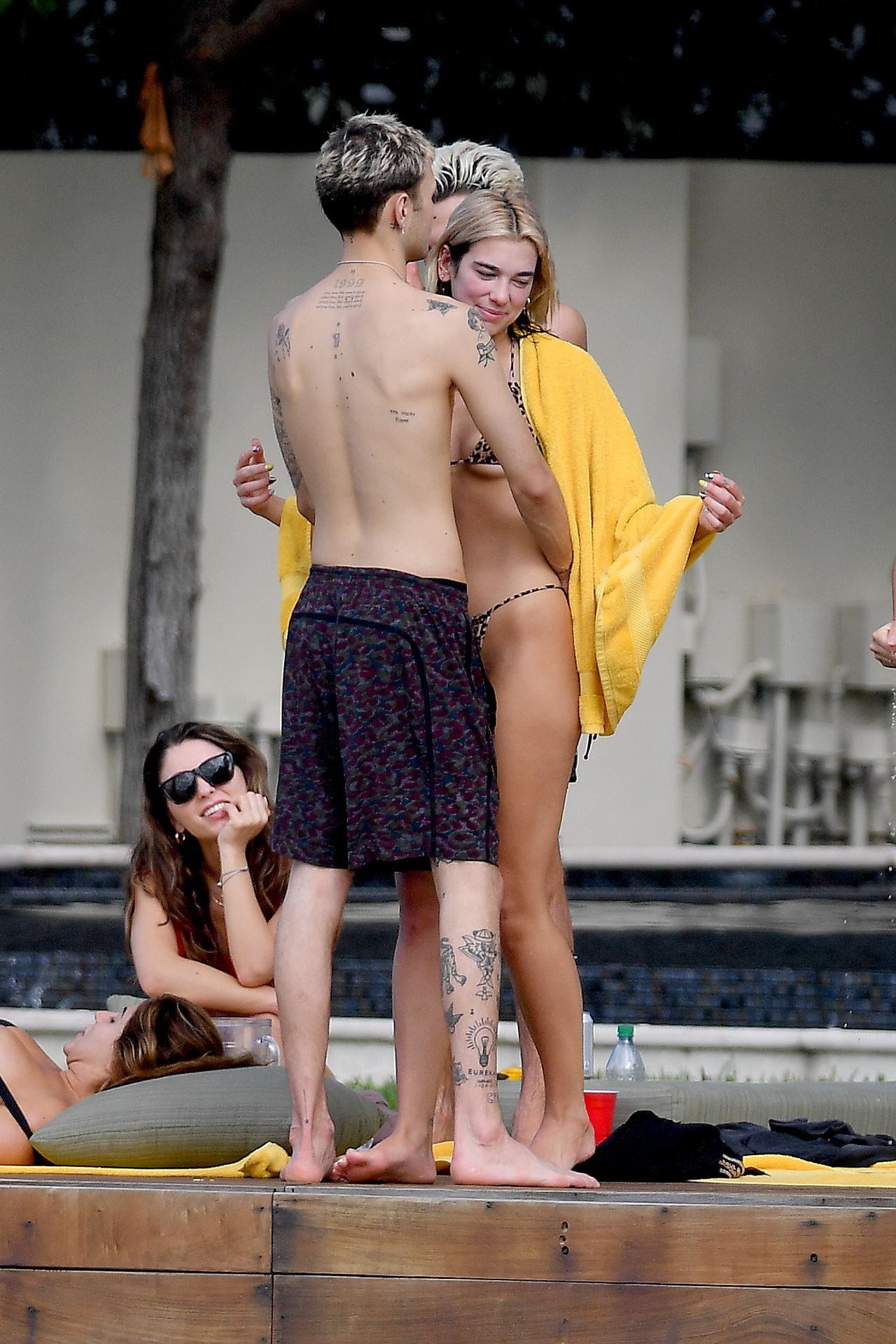 Songstress Dua Lipa is ending the year with those closest to her. The singer is joined by boyfriend Anwar Hadid and friends for rest and relaxation in Miami, 12/31/2019. The group relaxes and enjoys snacks and a smoke on a deck.