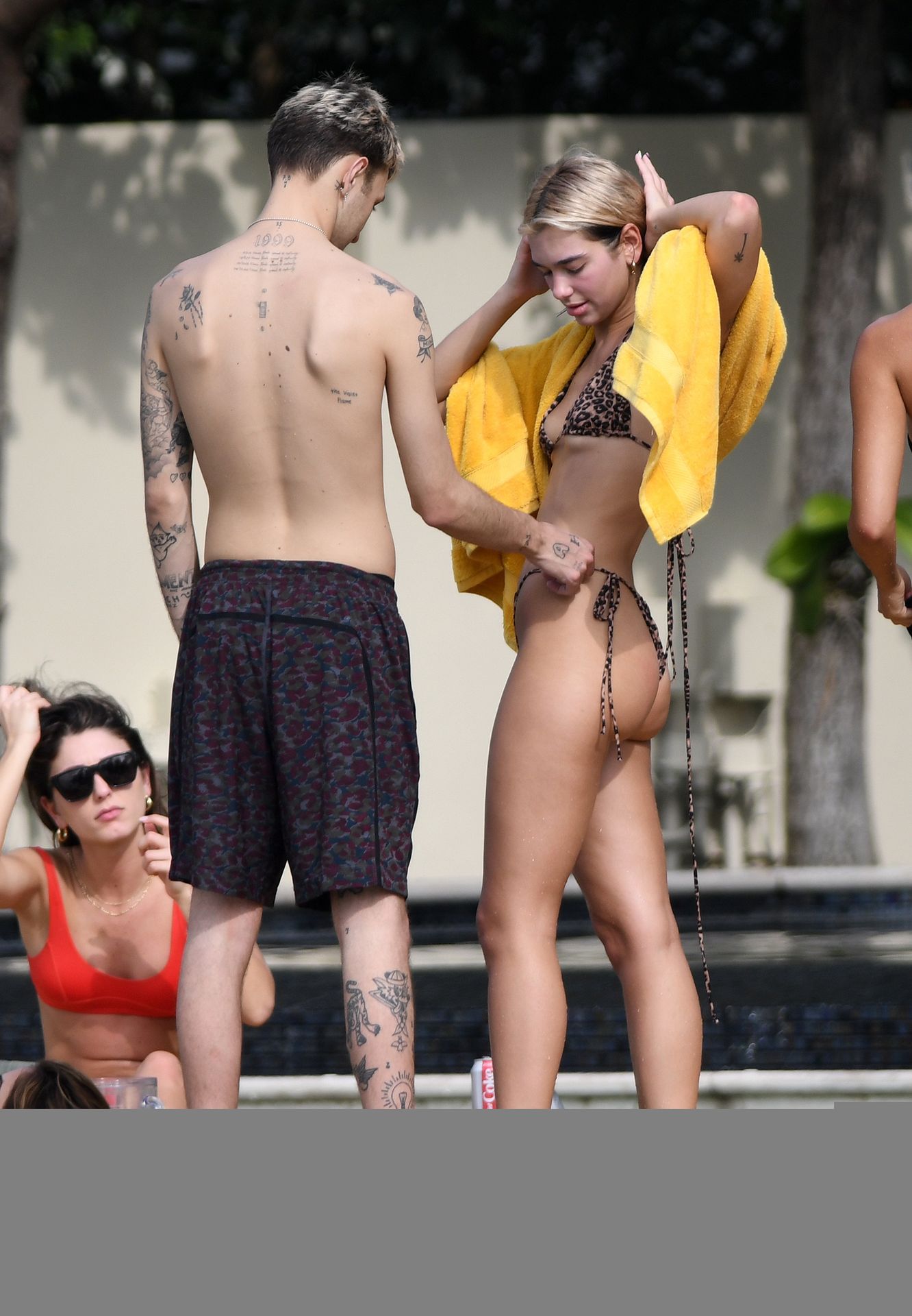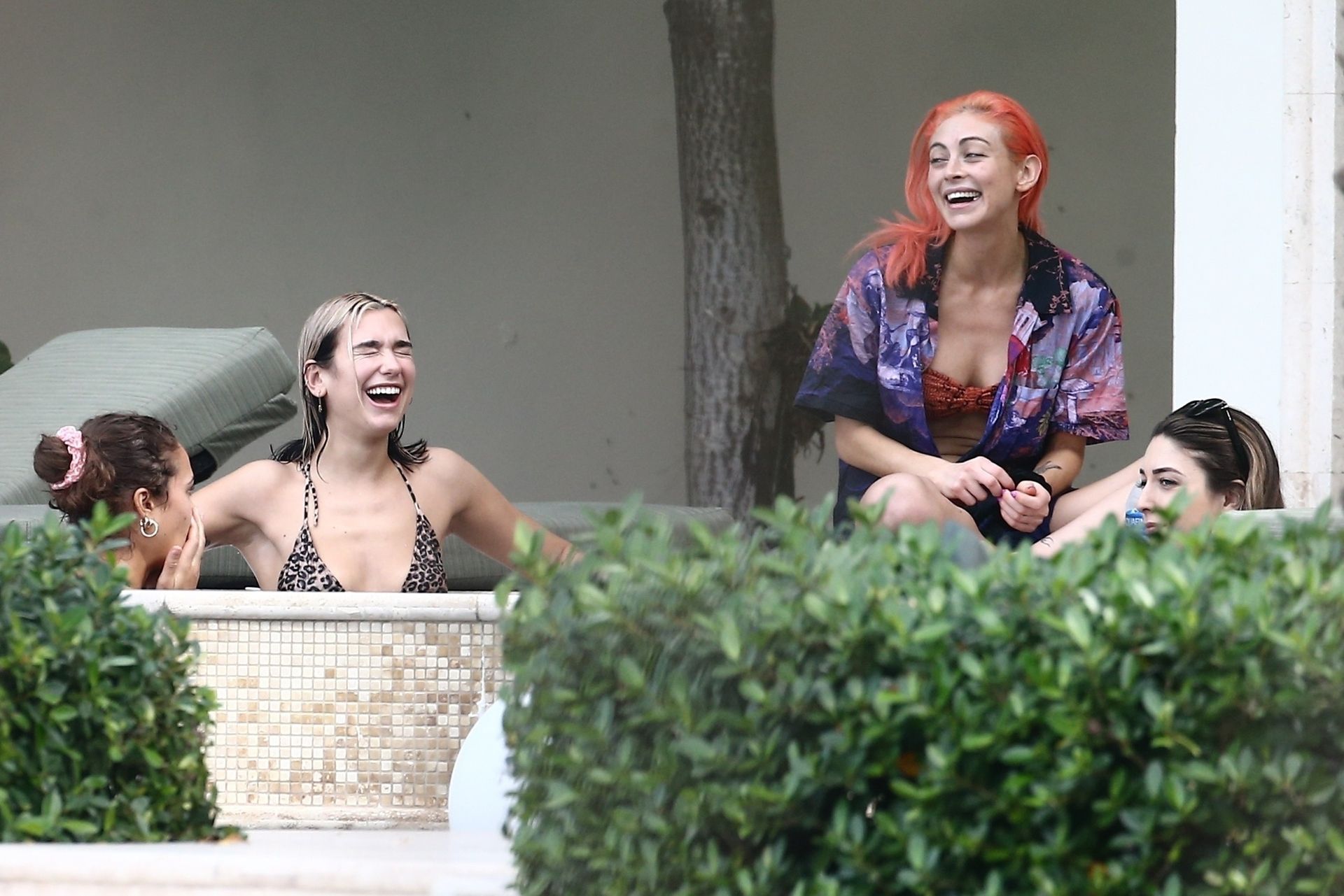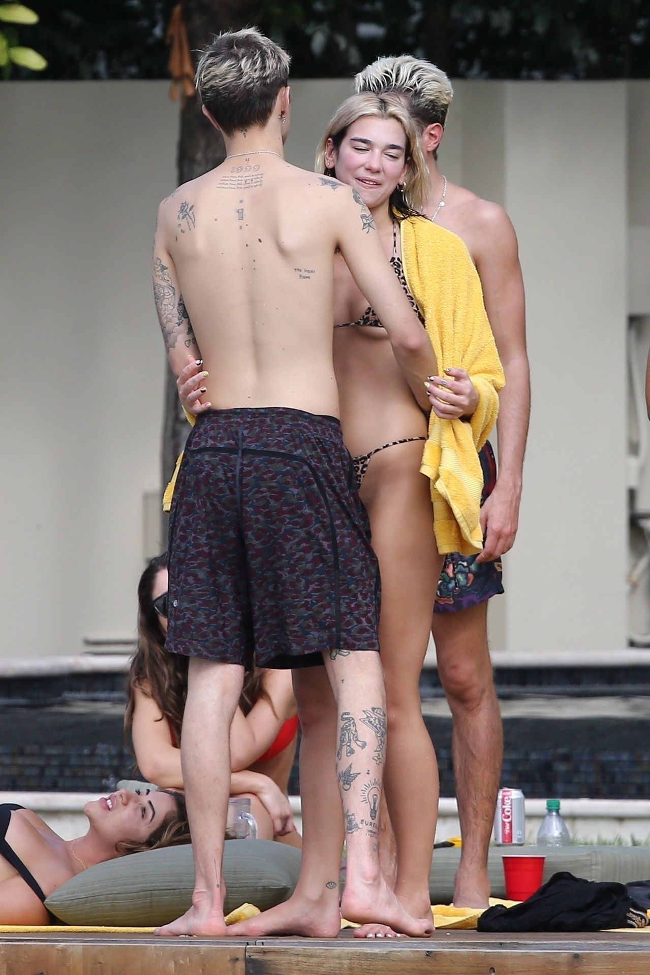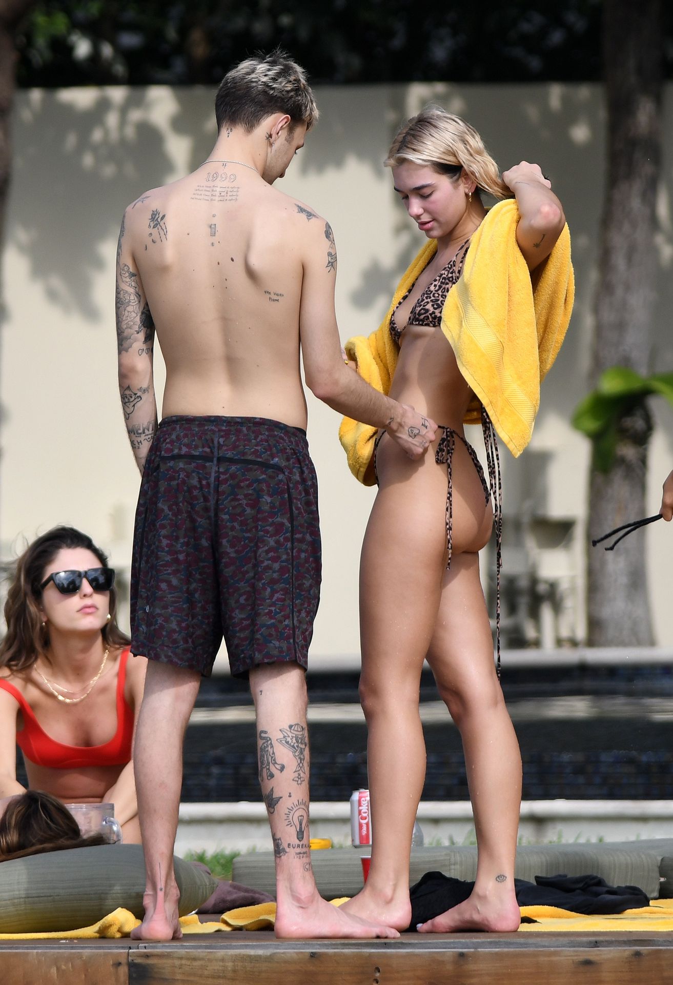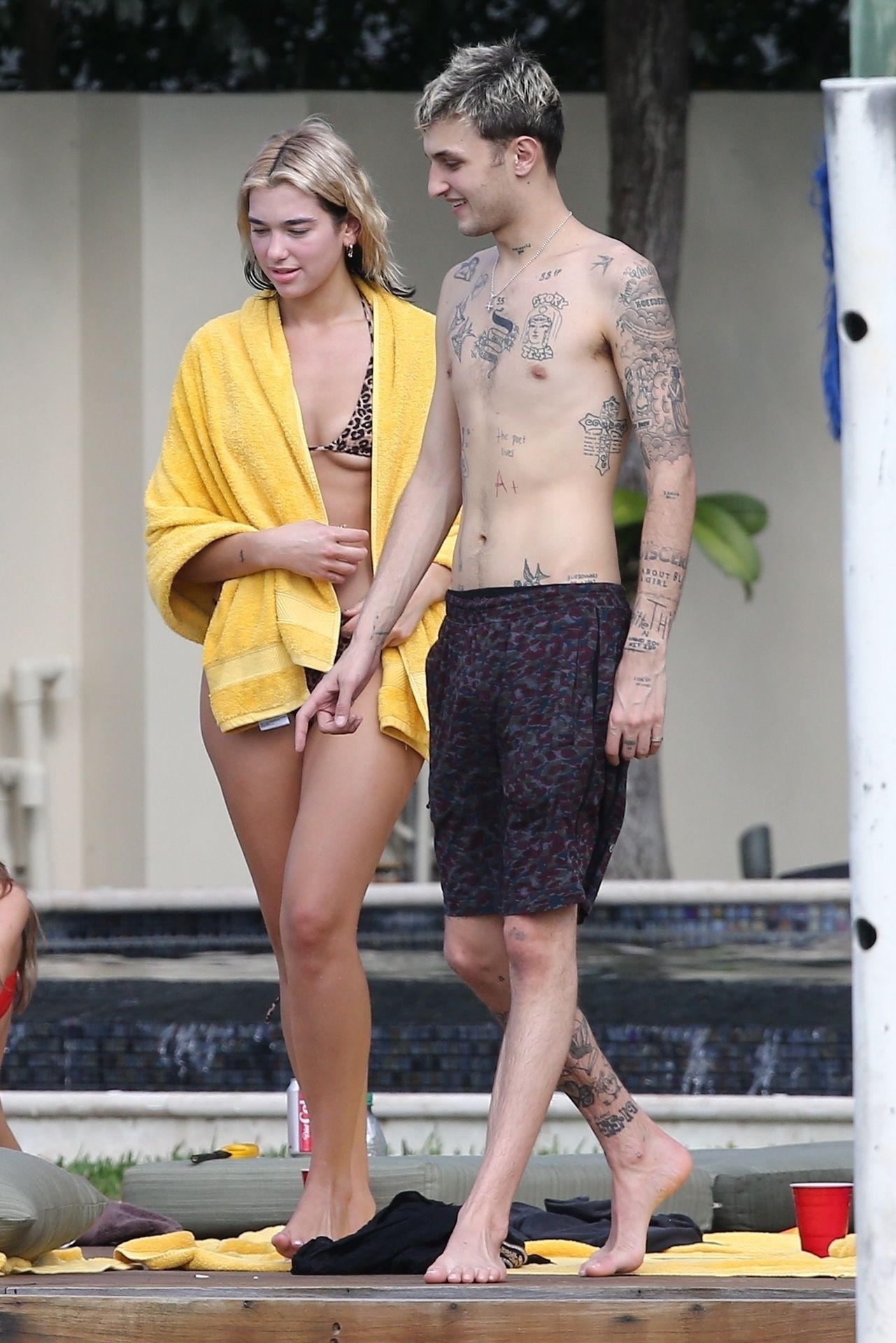 Songstress Dua Lipa is ending the year with those closest to her. The singer is joined by boyfriend Anwar Hadid and friends for rest and relaxation in Miami, 12/31/2019. The group relaxes and enjoys snacks and a smoke on a deck.