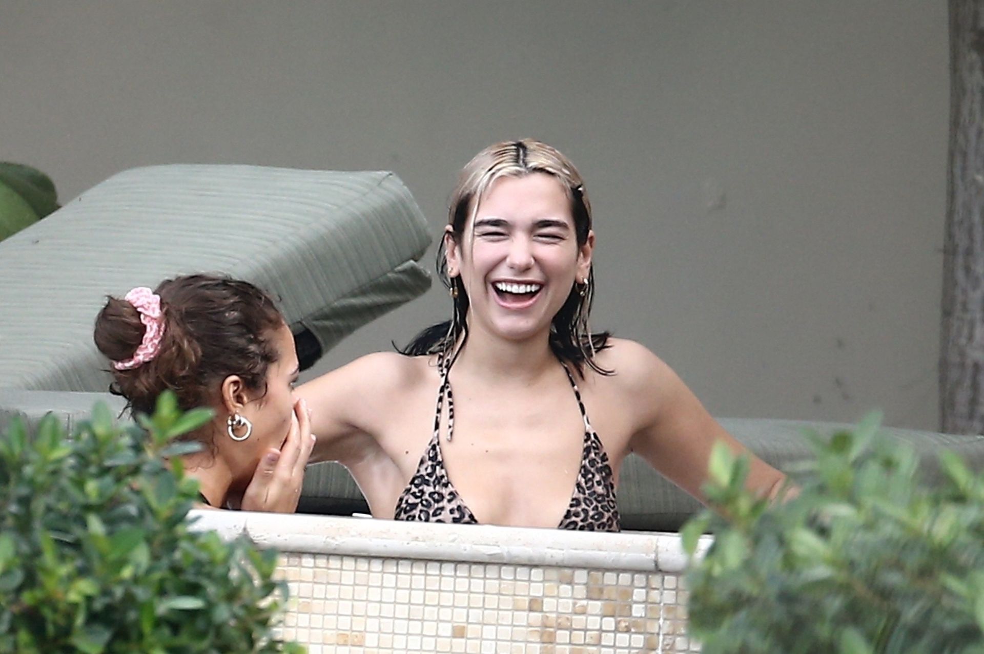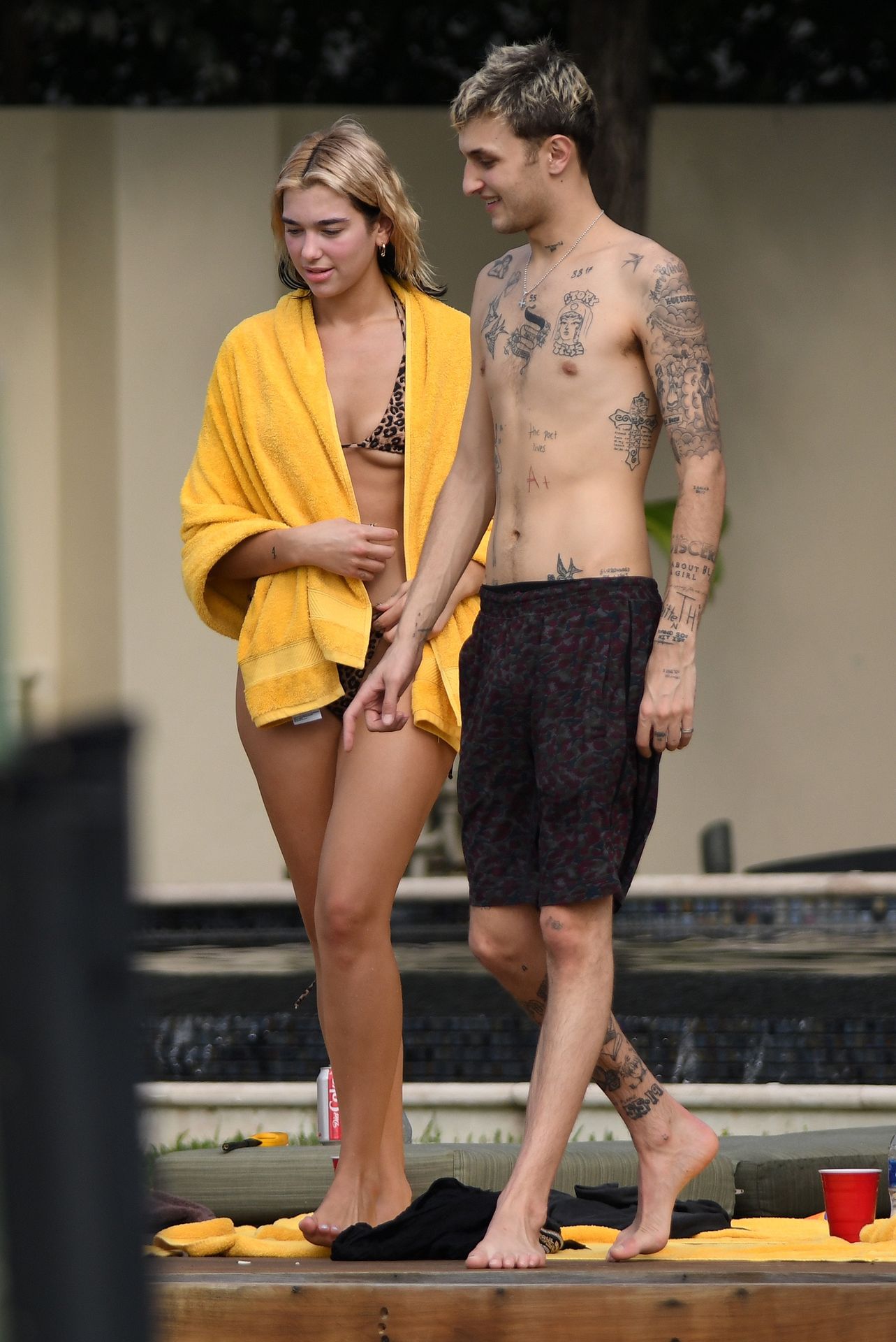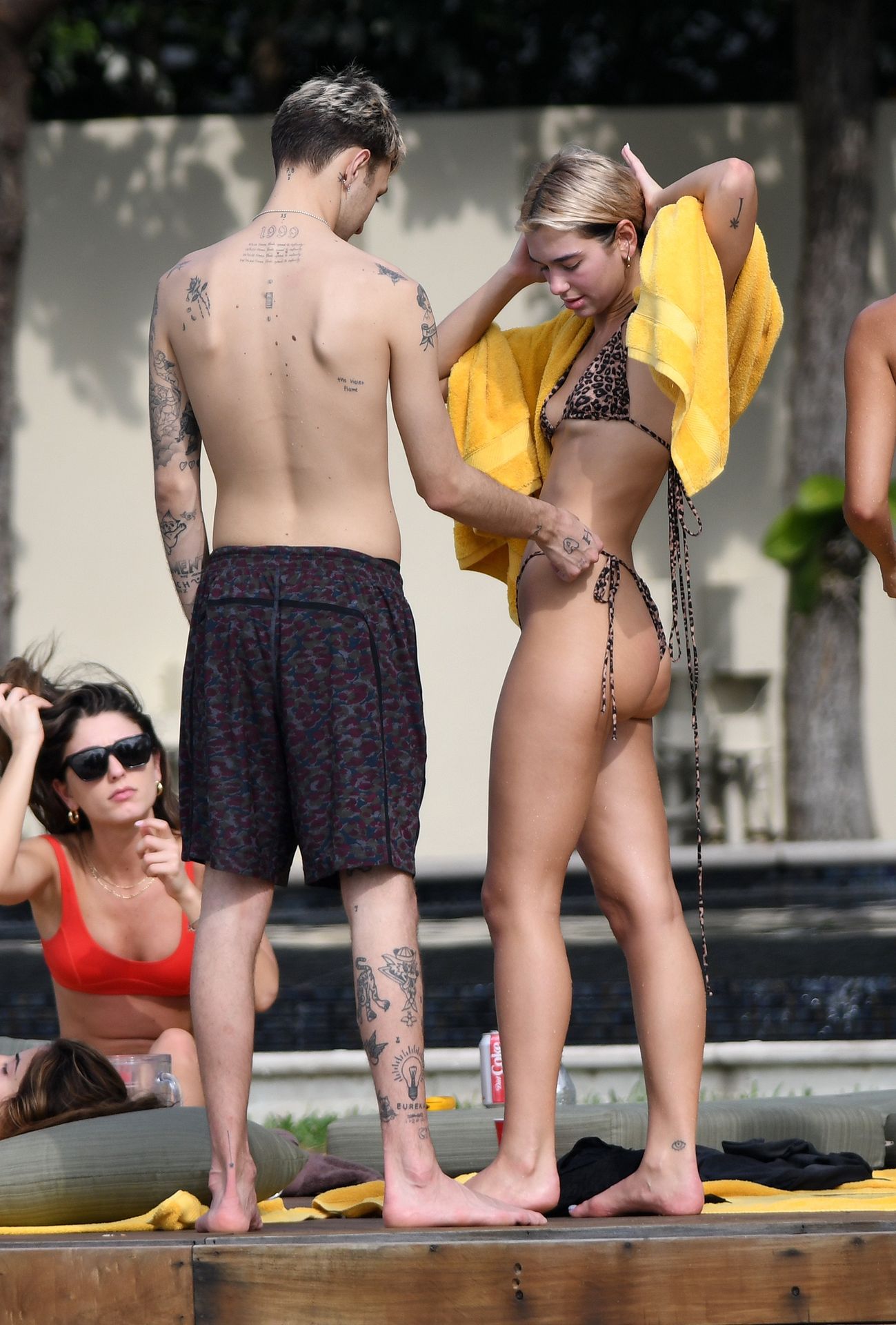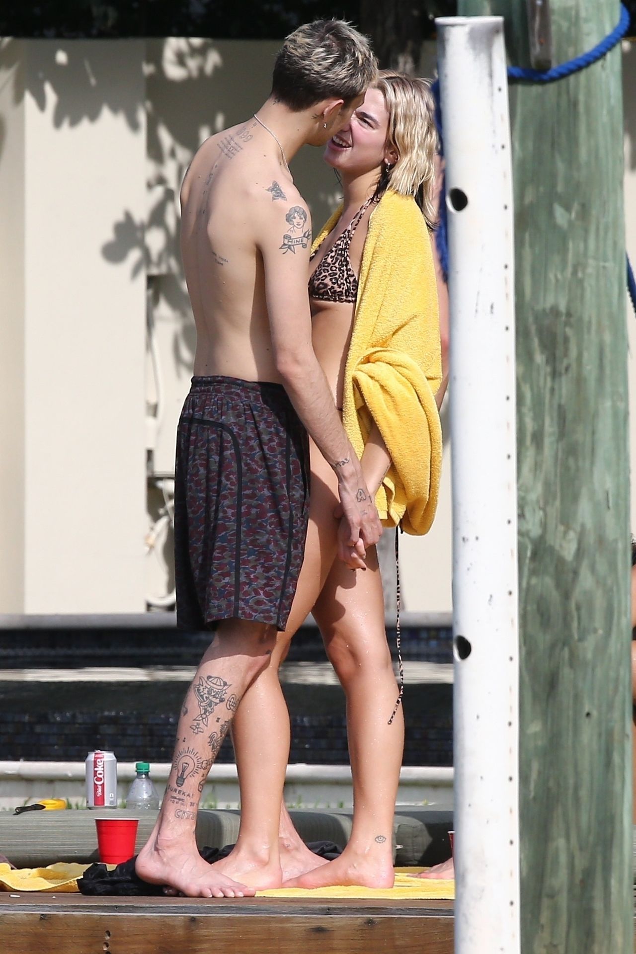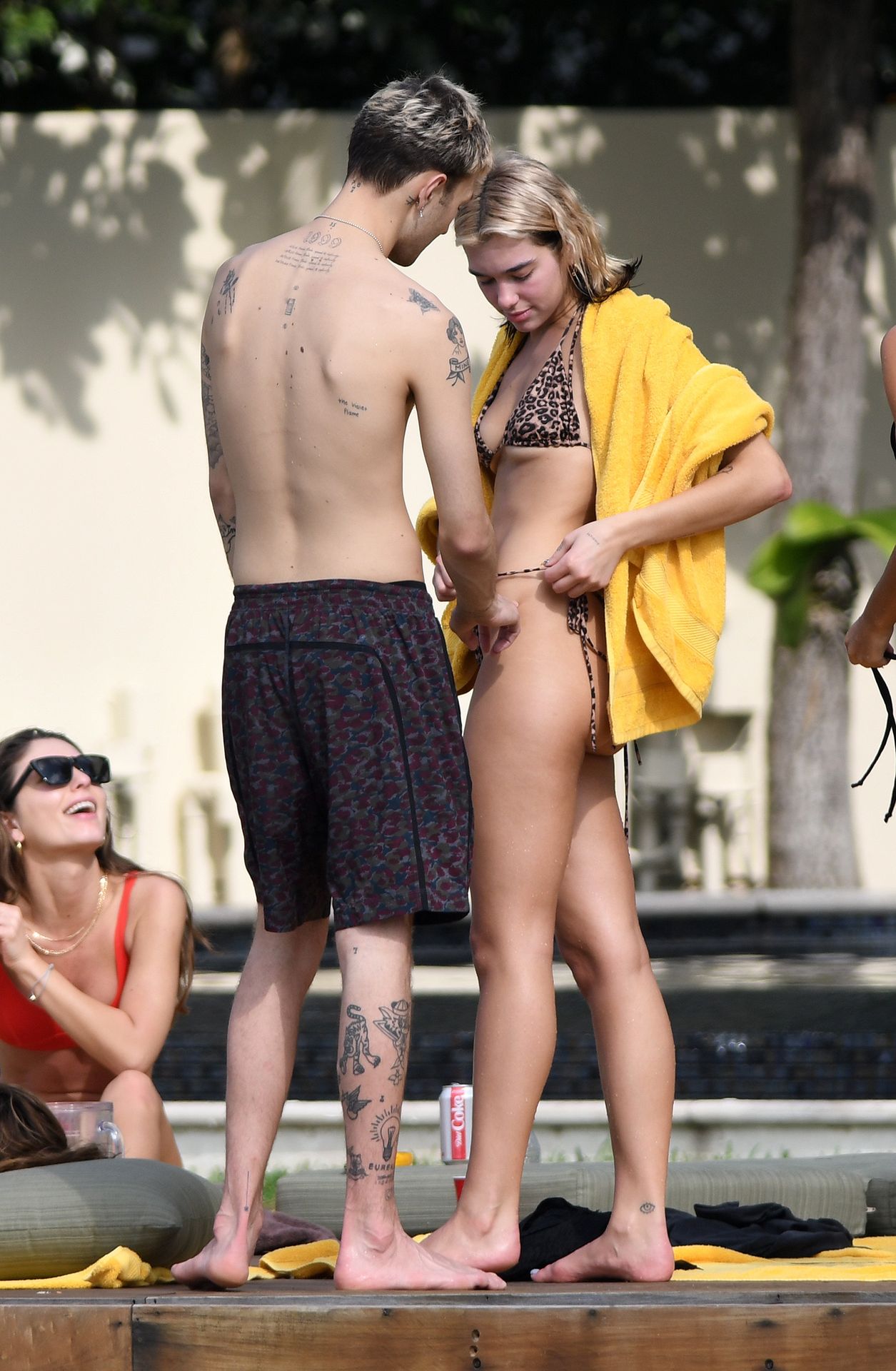 Songstress Dua Lipa is ending the year with those closest to her. The singer is joined by boyfriend Anwar Hadid and friends for rest and relaxation in Miami, 12/31/2019. The group relaxes and enjoys snacks and a smoke on a deck.