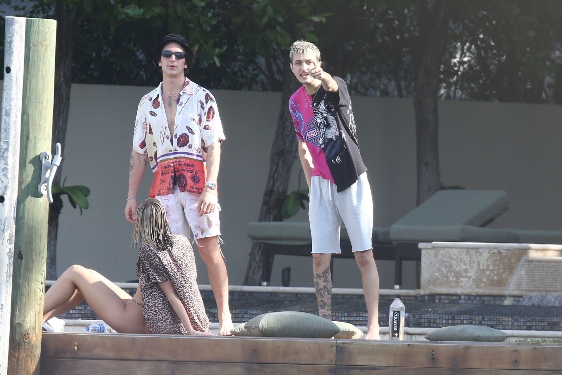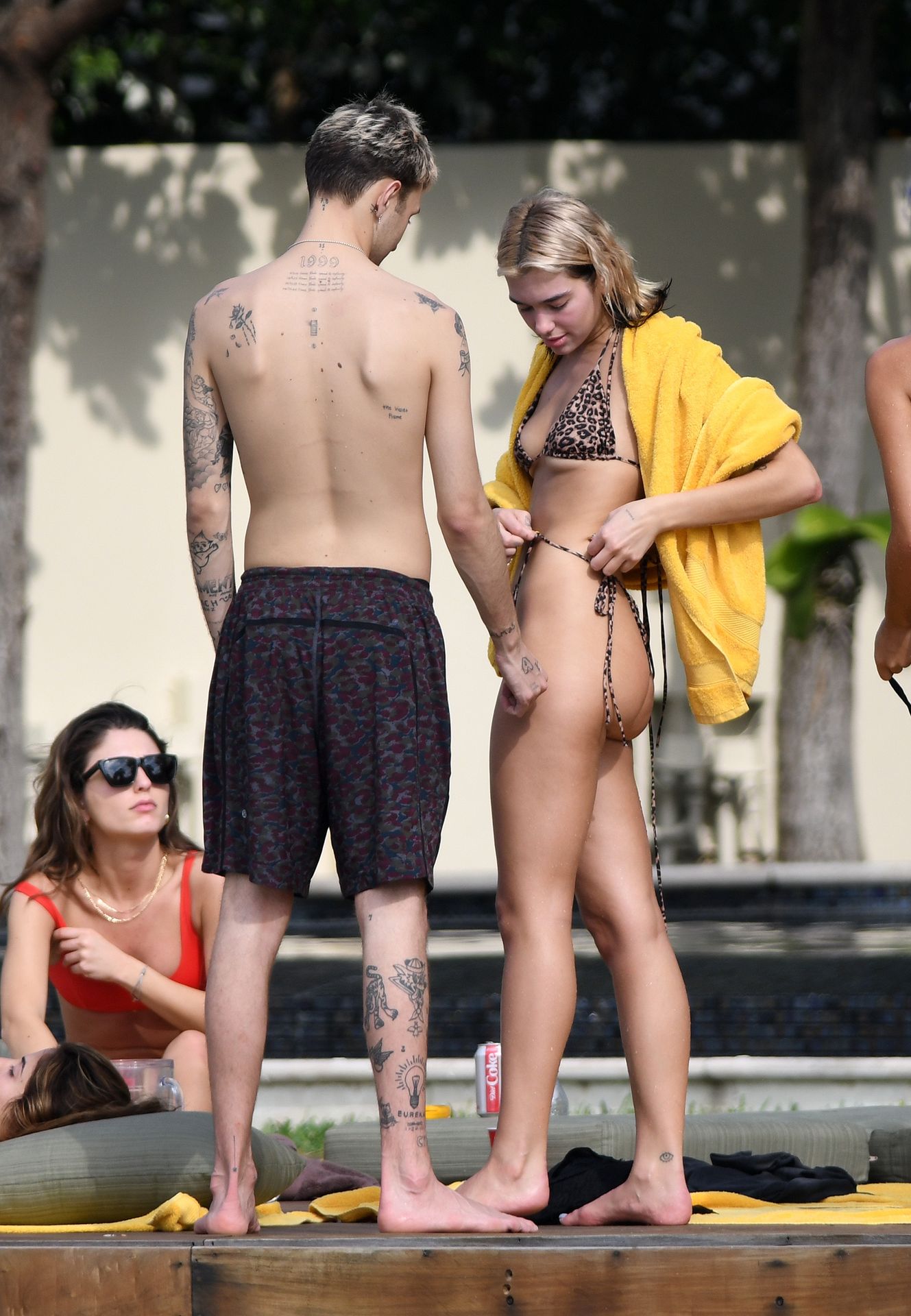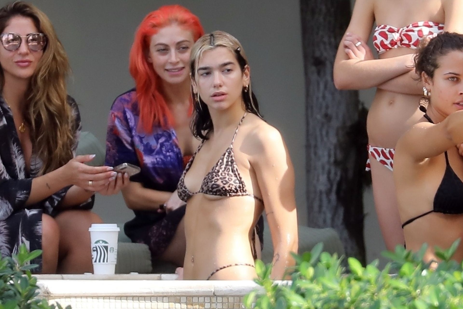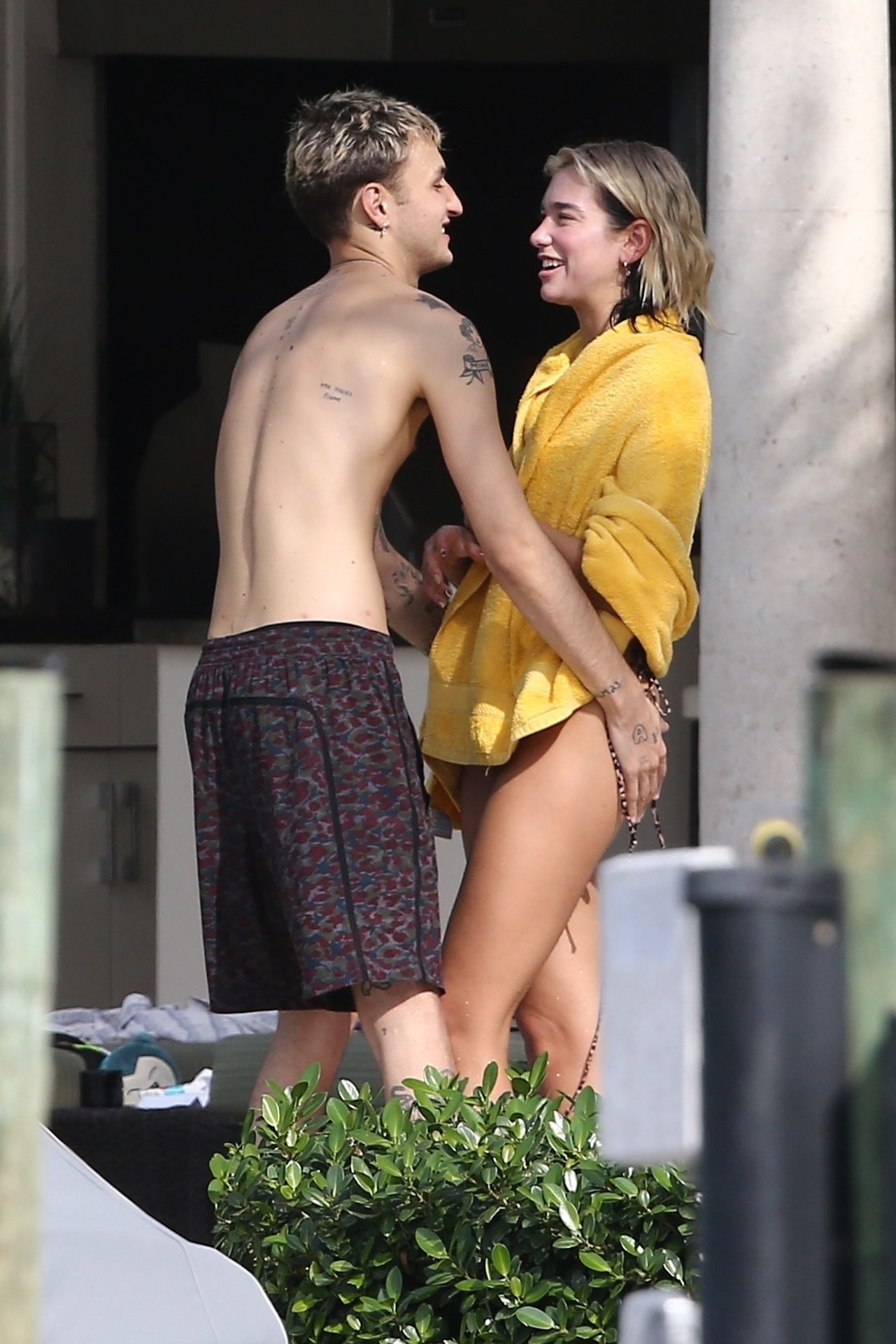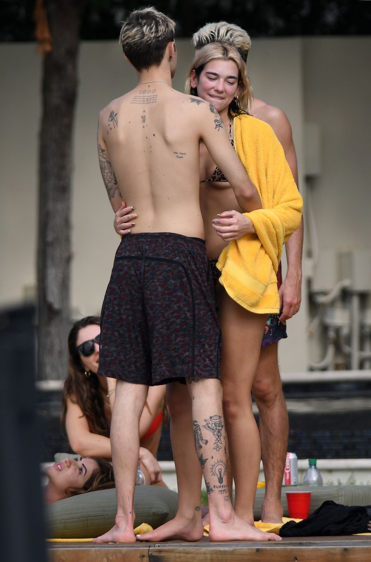 Songstress Dua Lipa is ending the year with those closest to her. The singer is joined by boyfriend Anwar Hadid and friends for rest and relaxation in Miami, 12/31/2019. The group relaxes and enjoys snacks and a smoke on a deck.