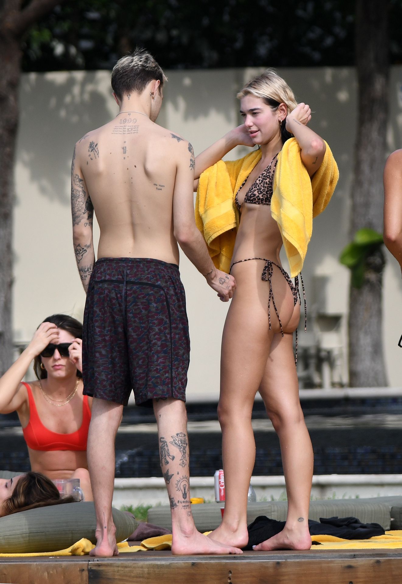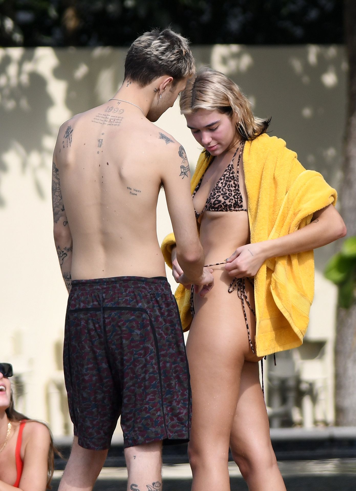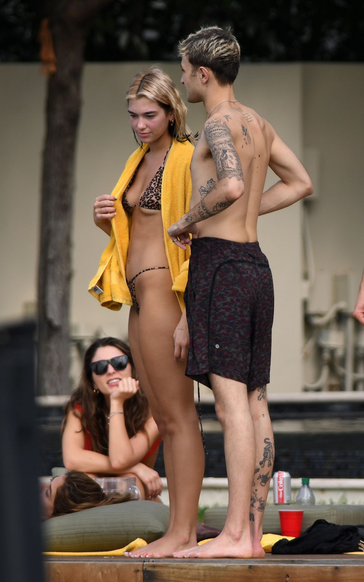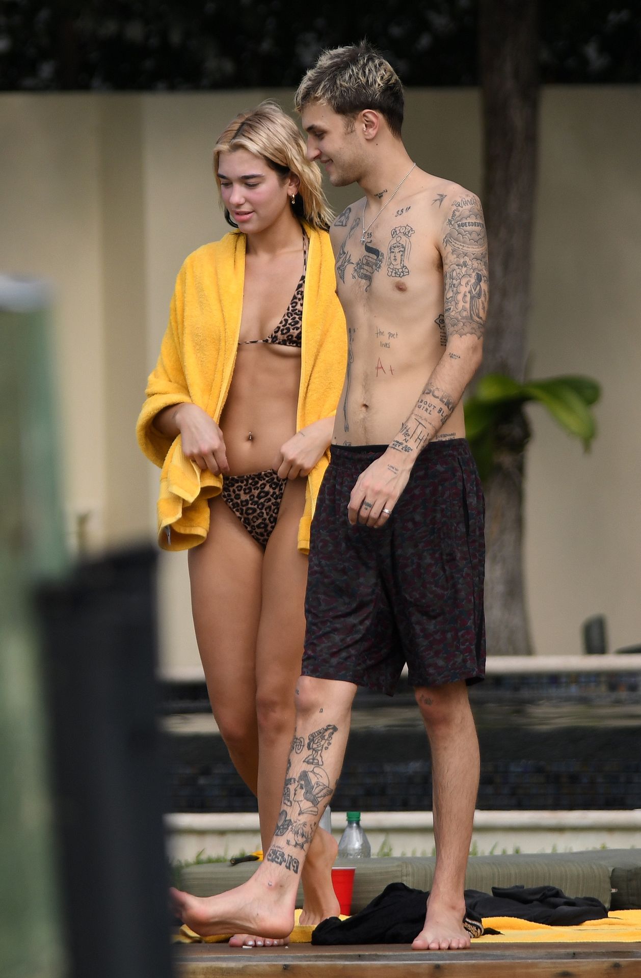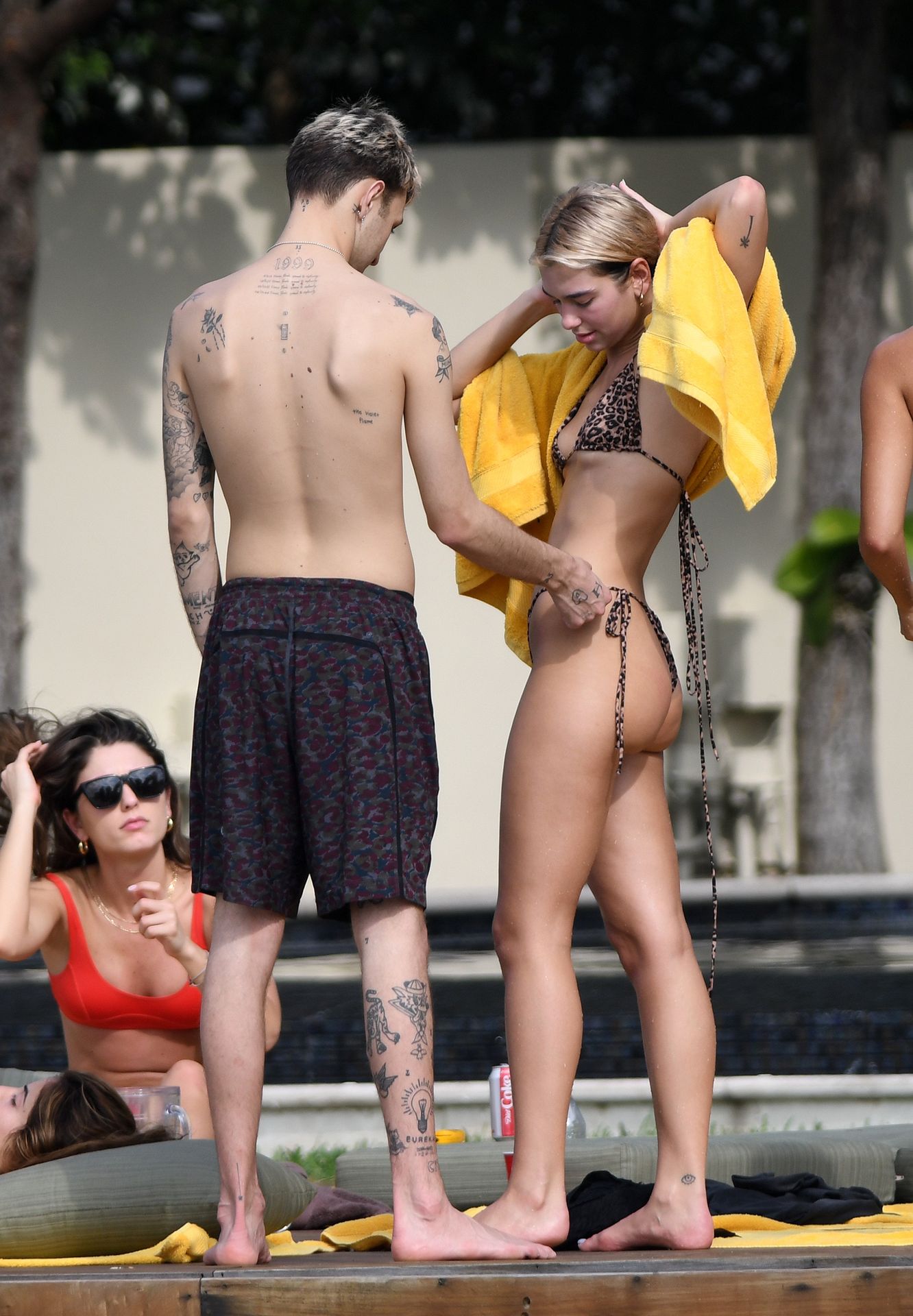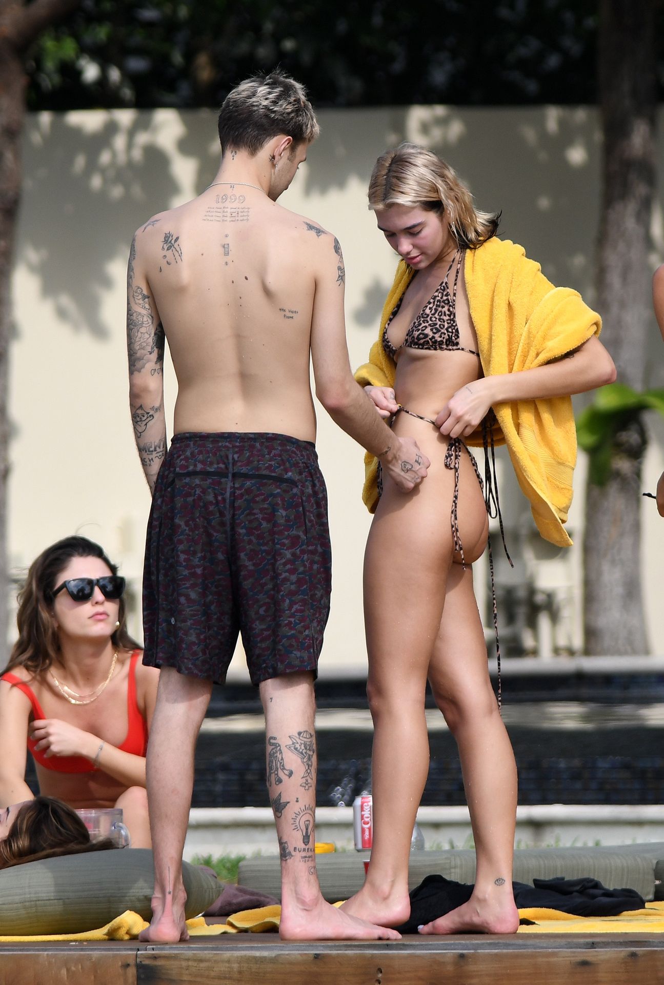 Songstress Dua Lipa is ending the year with those closest to her. The singer is joined by boyfriend Anwar Hadid and friends for rest and relaxation in Miami, 12/31/2019. The group relaxes and enjoys snacks and a smoke on a deck.