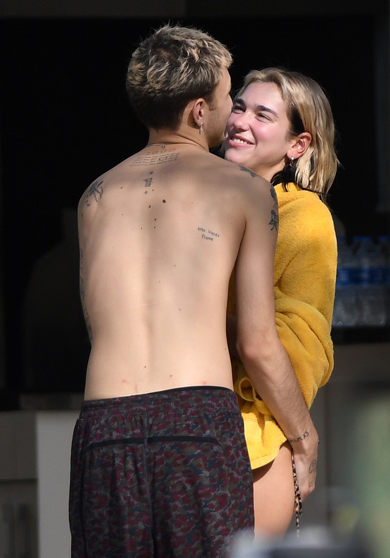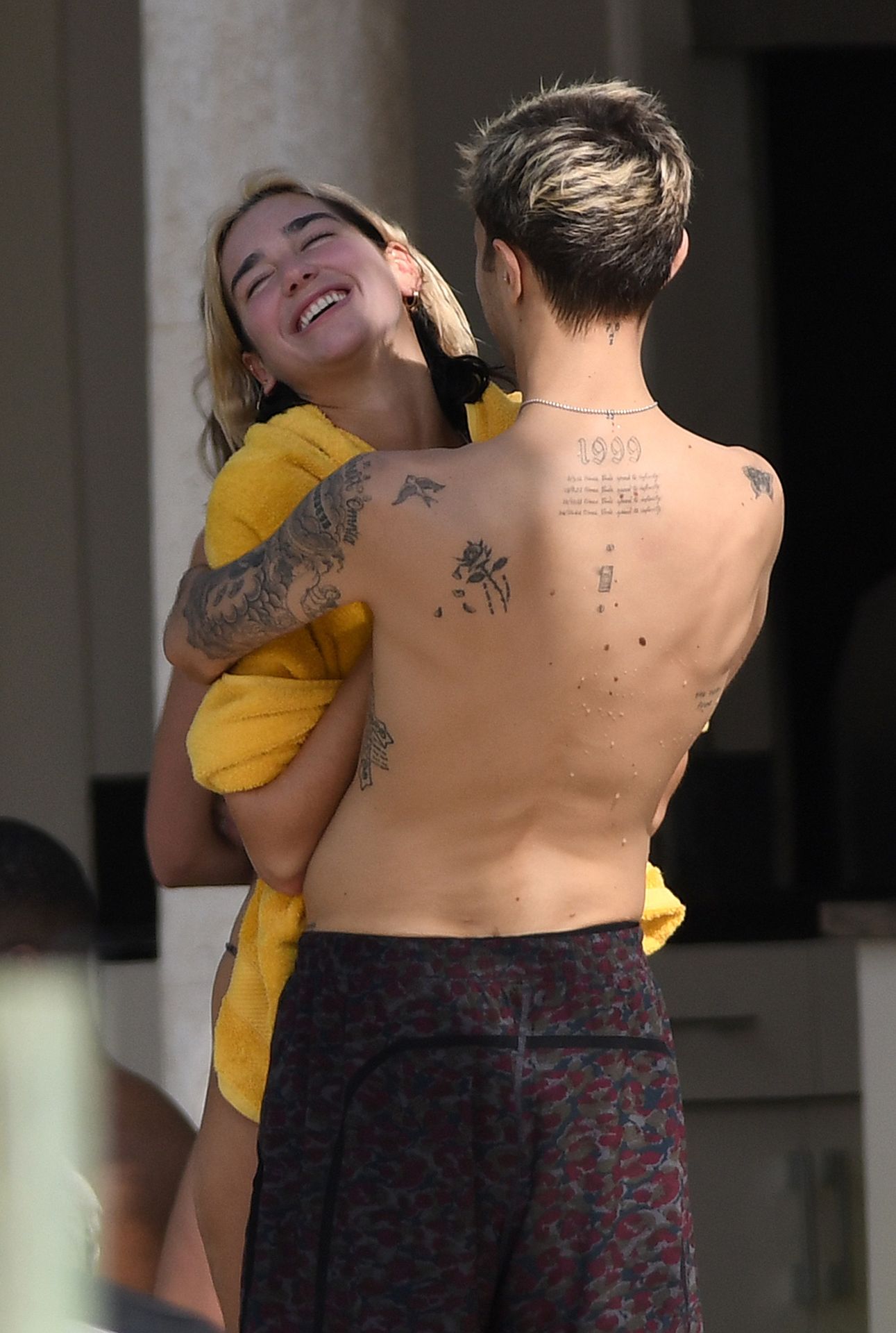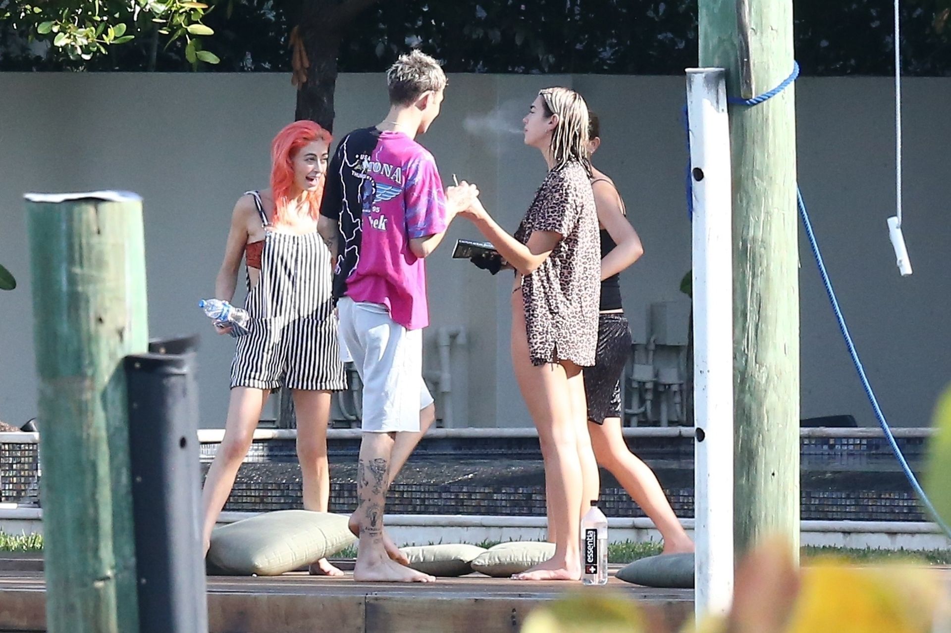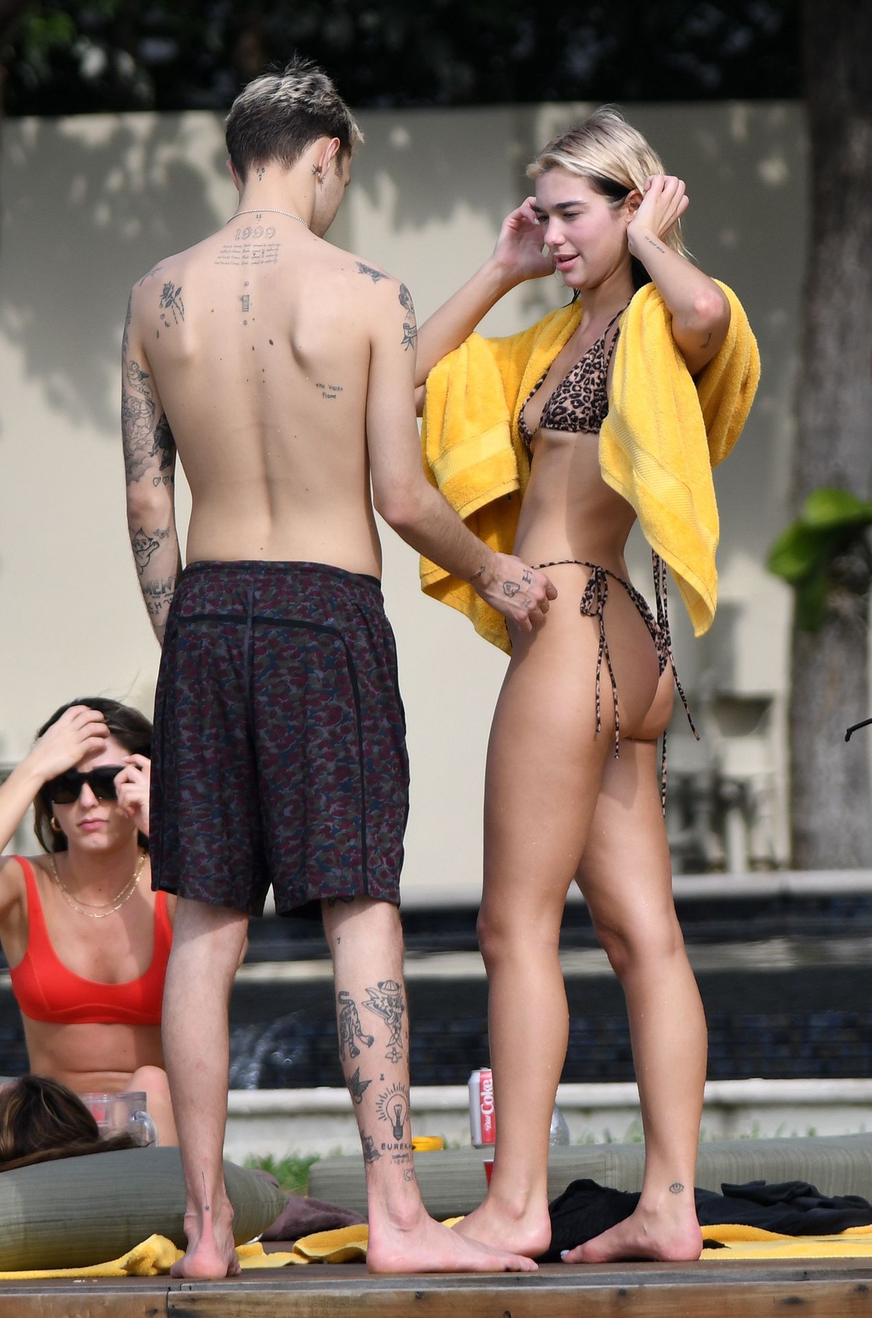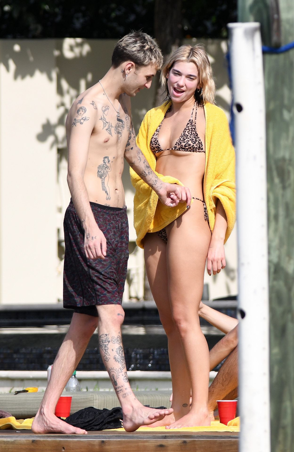 Songstress Dua Lipa is ending the year with those closest to her. The singer is joined by boyfriend Anwar Hadid and friends for rest and relaxation in Miami, 12/31/2019. The group relaxes and enjoys snacks and a smoke on a deck.