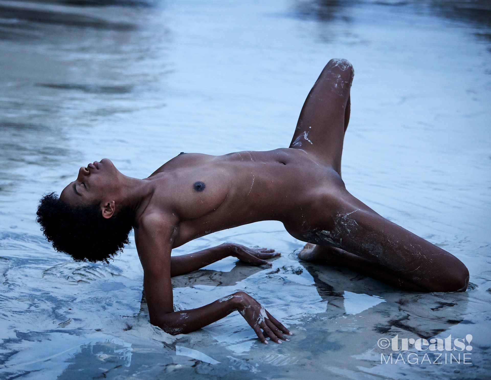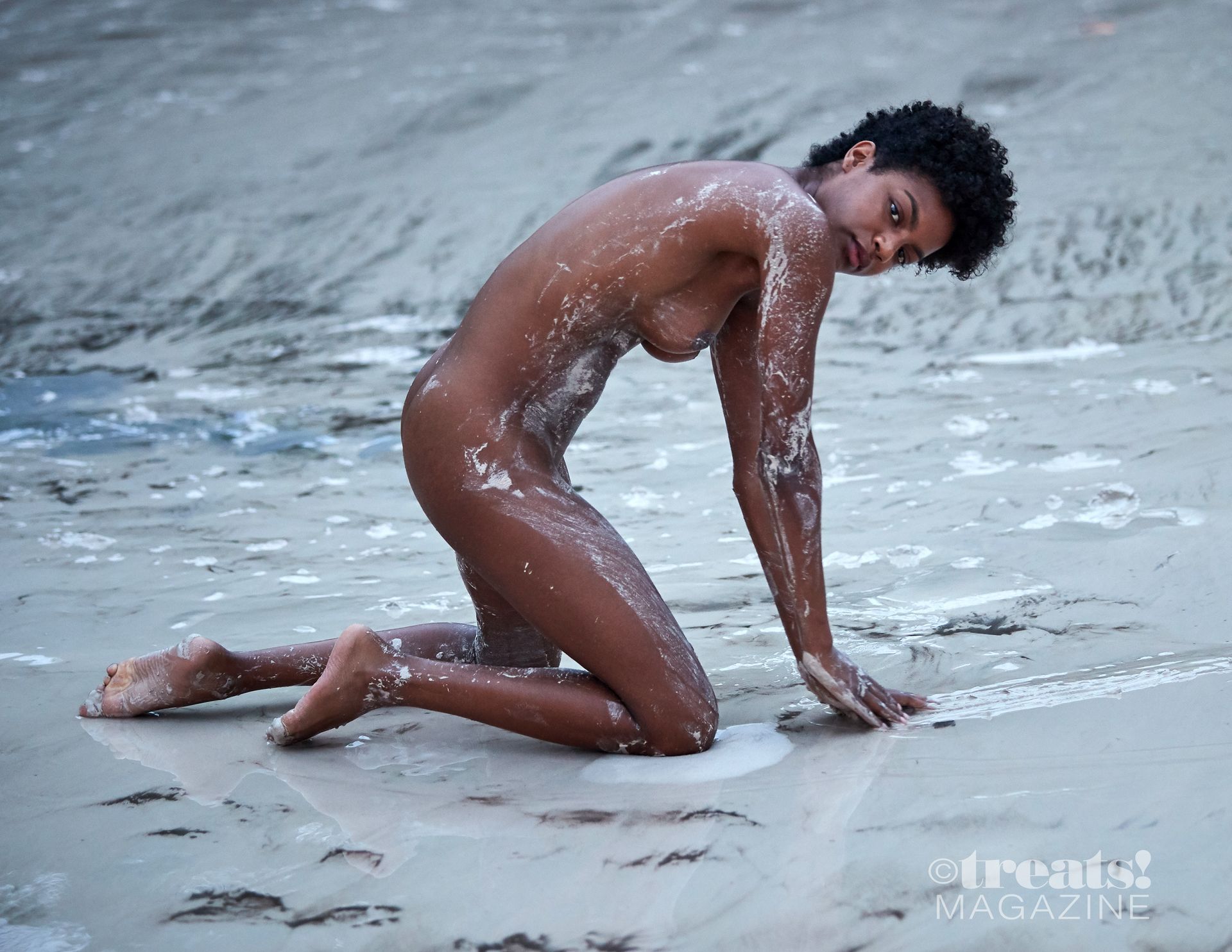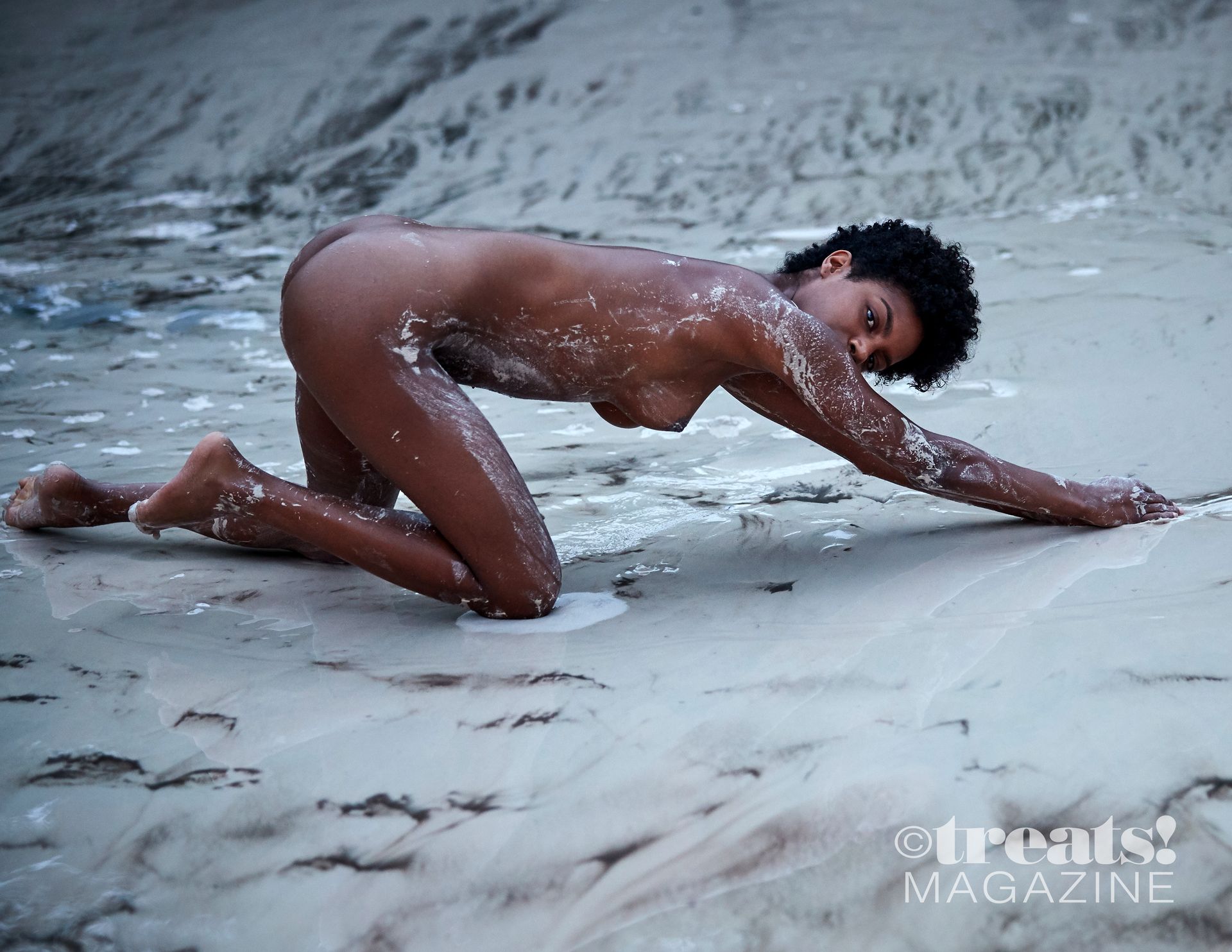 Model Ebonee Davis shows off her naked body in a various poses on the beach in a photoshoot by David Bellemere for treats! magazine (2017).