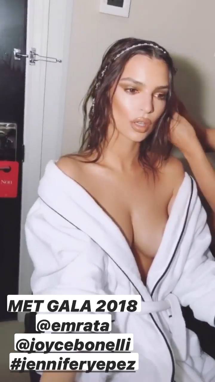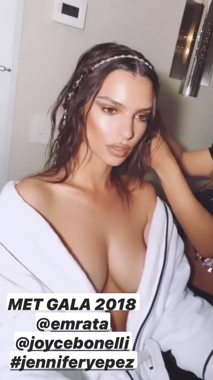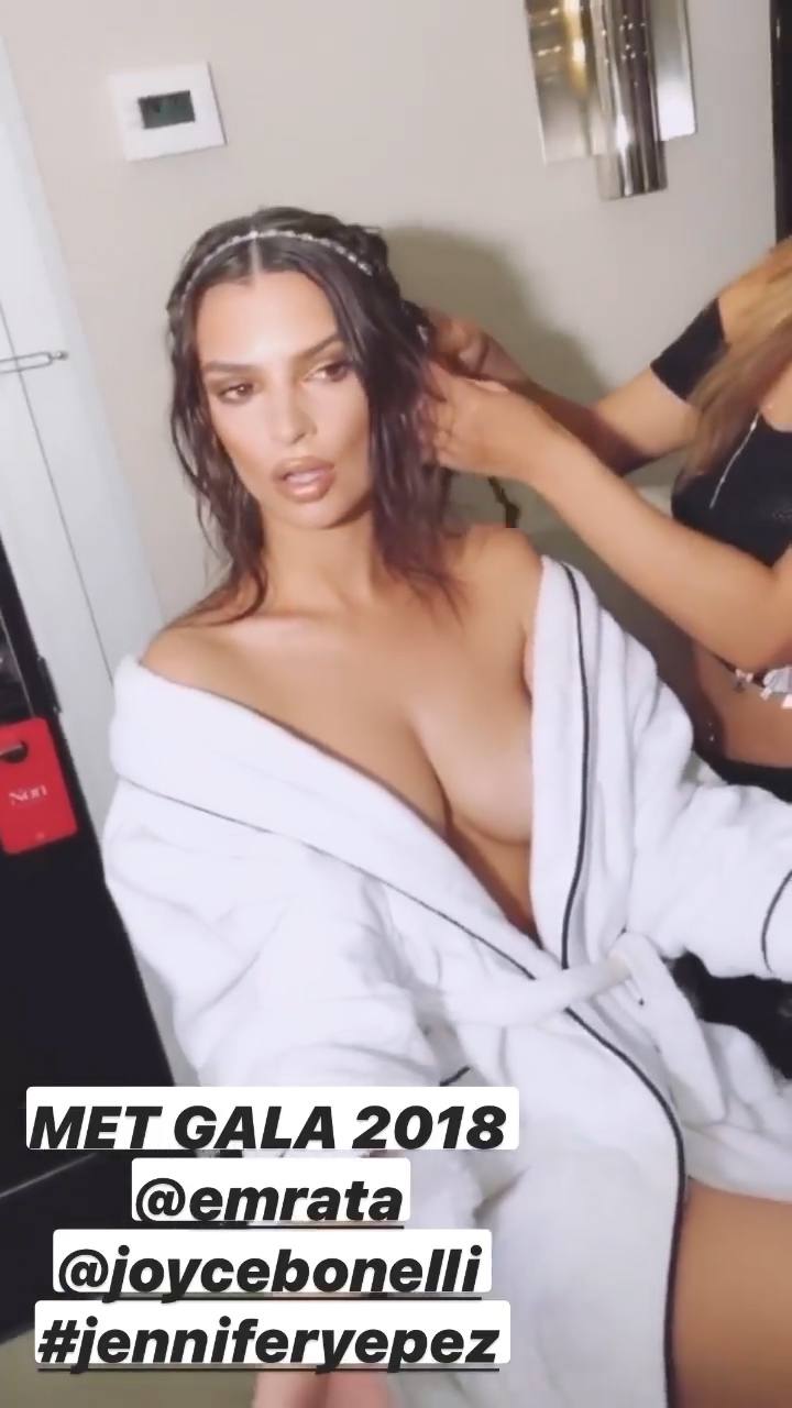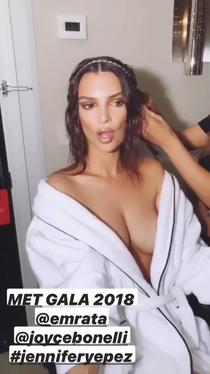 Emily Ratajkowski show off her perfect boobs posing with open robe in backstage of Met Gala 2018.