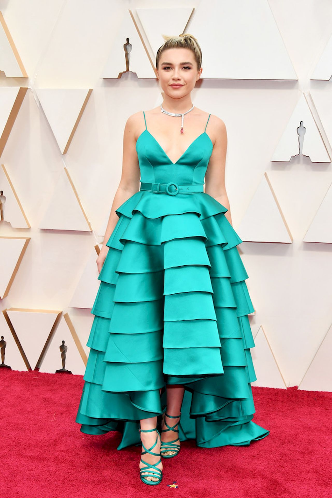 Actress Florence Pugh poses on the red carpet wearing a turquoise dress during the Oscars arrivals at the 92nd Academy Awards in Hollywood, 02/09/2020.