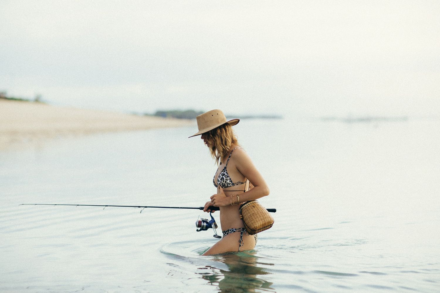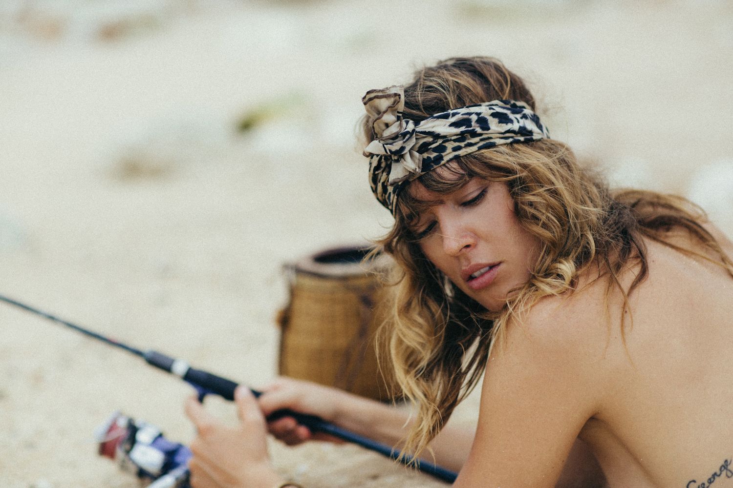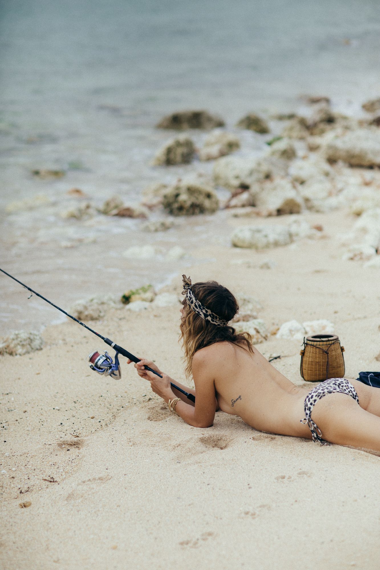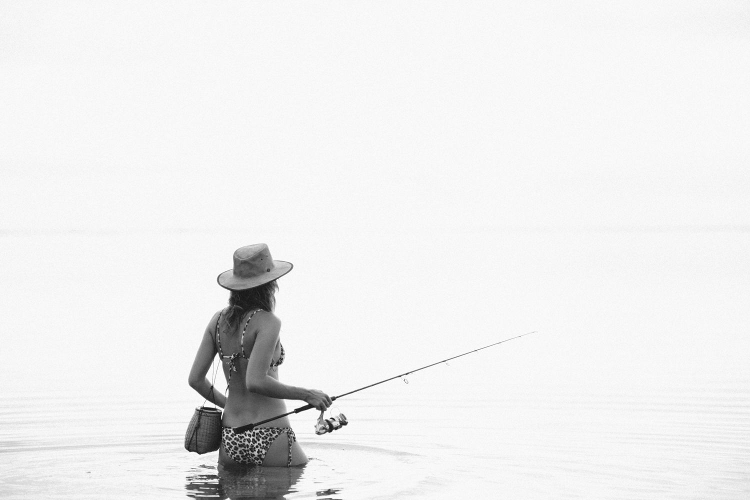 German model Franziska von Tschurtschenthaler (Cisco) poses topless and in a bikini while fishing in a photoshoot by Carly Brown (2019).