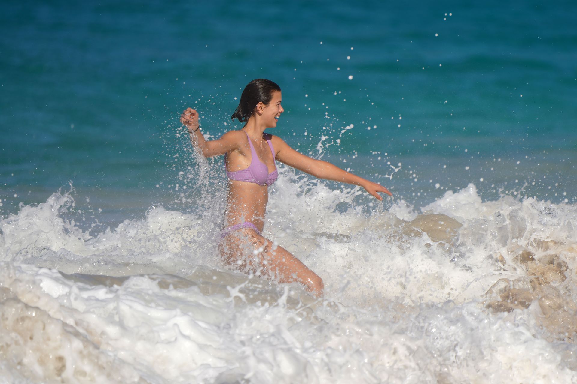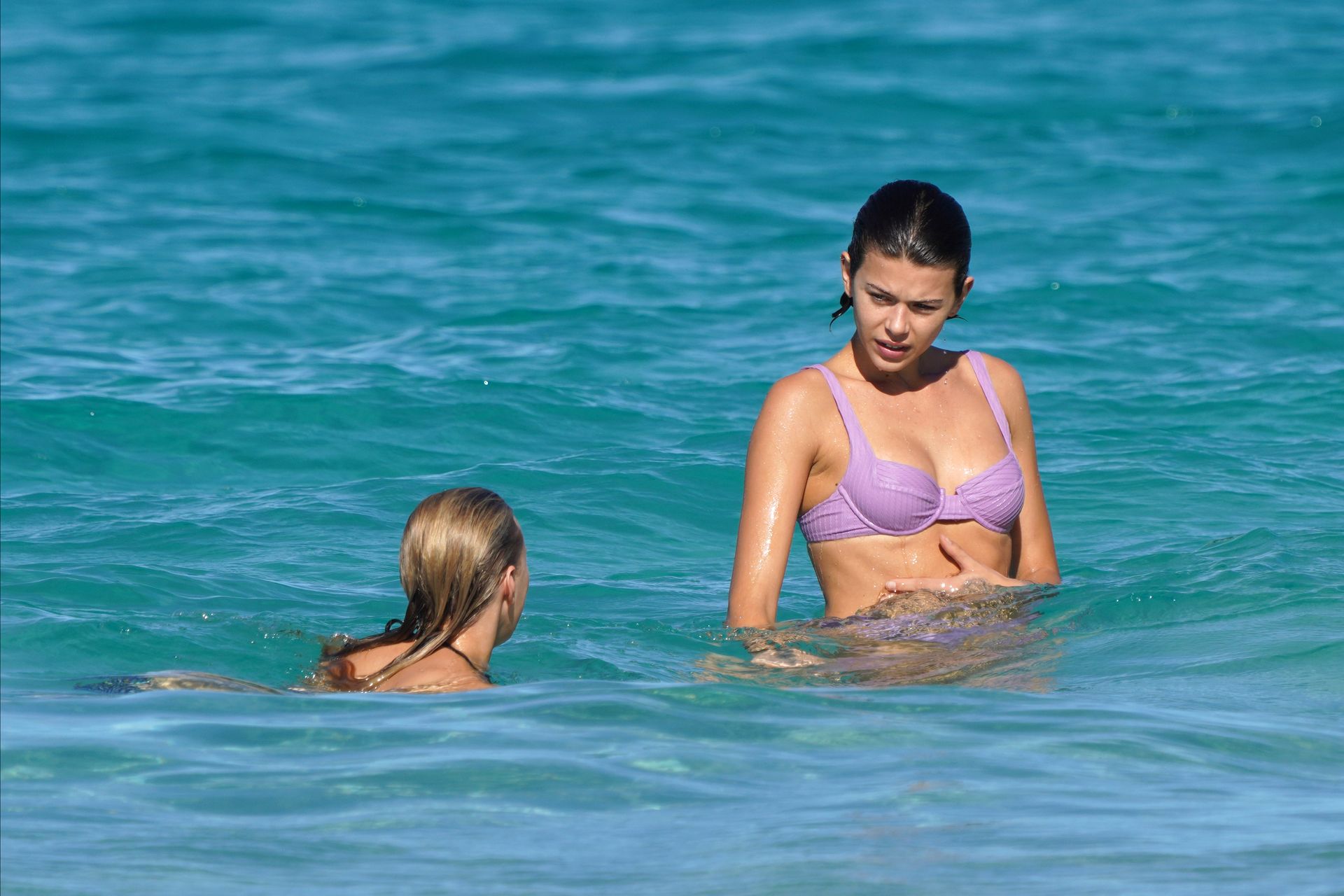 Model Georgia Fowler was seen in a purple bikini, while enjoying the sea during holidays in St Barts, 11/14/2019.