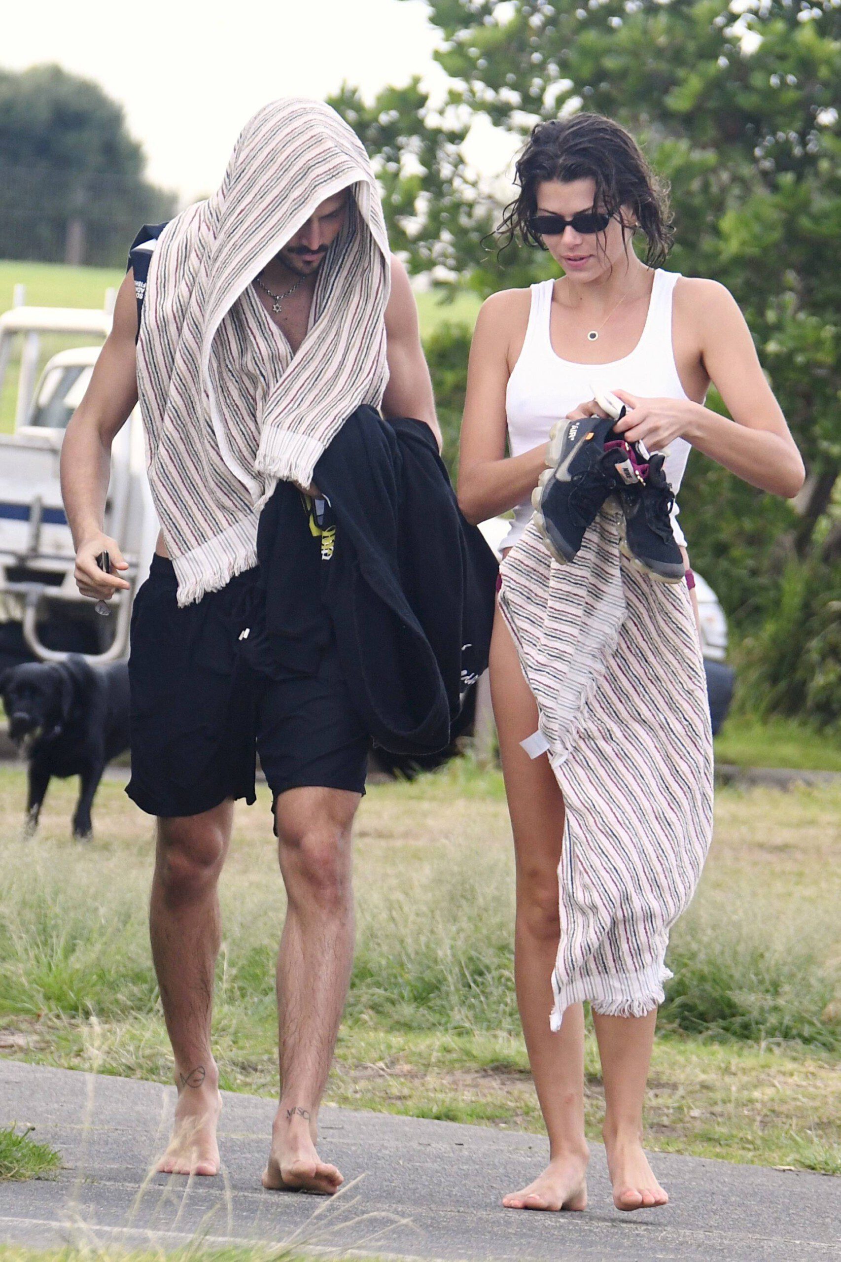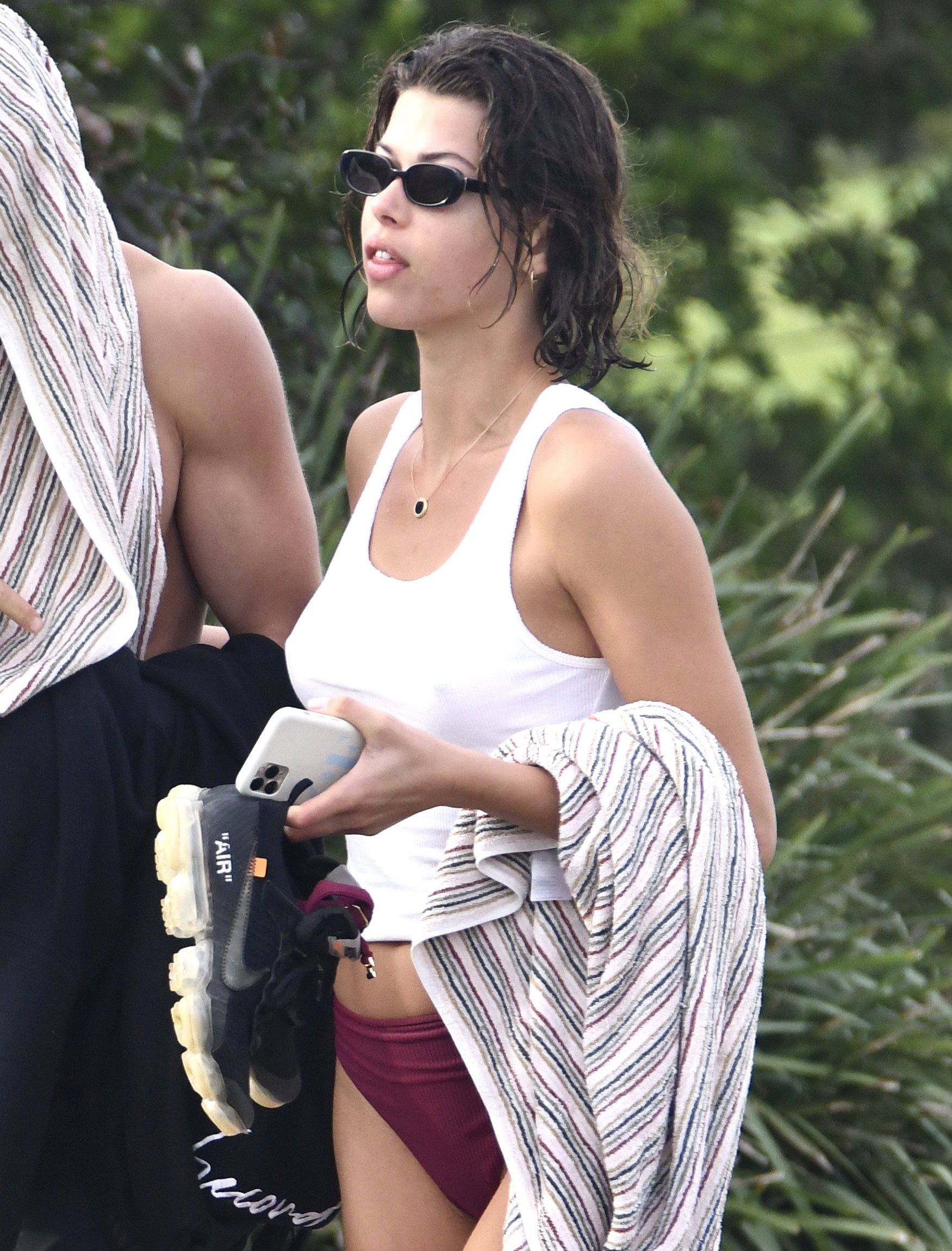 Georgia Fowler show off her sexy body and braless boobs wearing tank top and bikini bottom on Bondi beach.