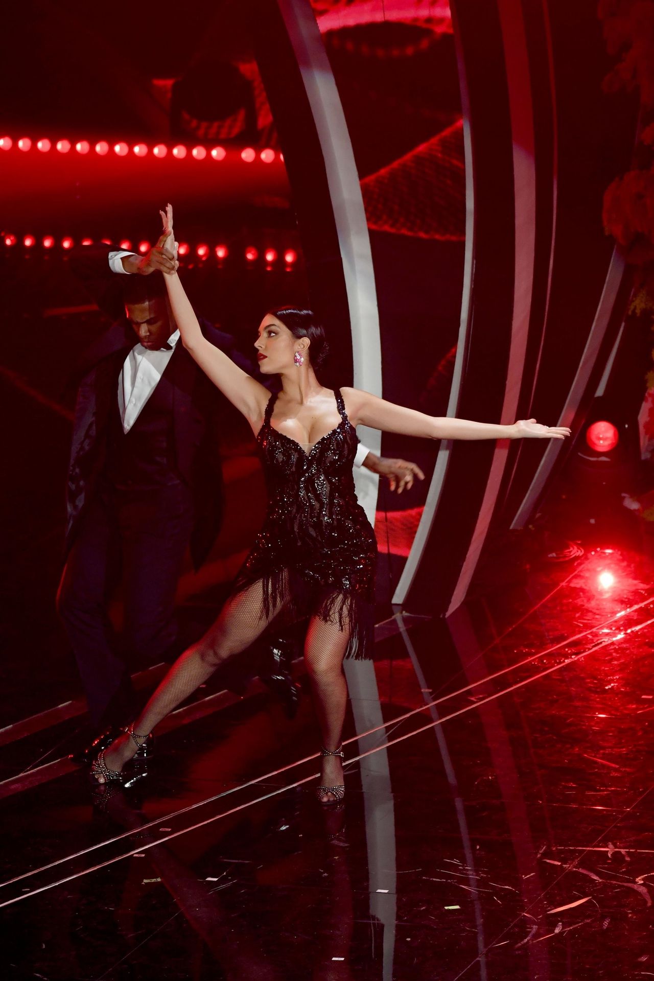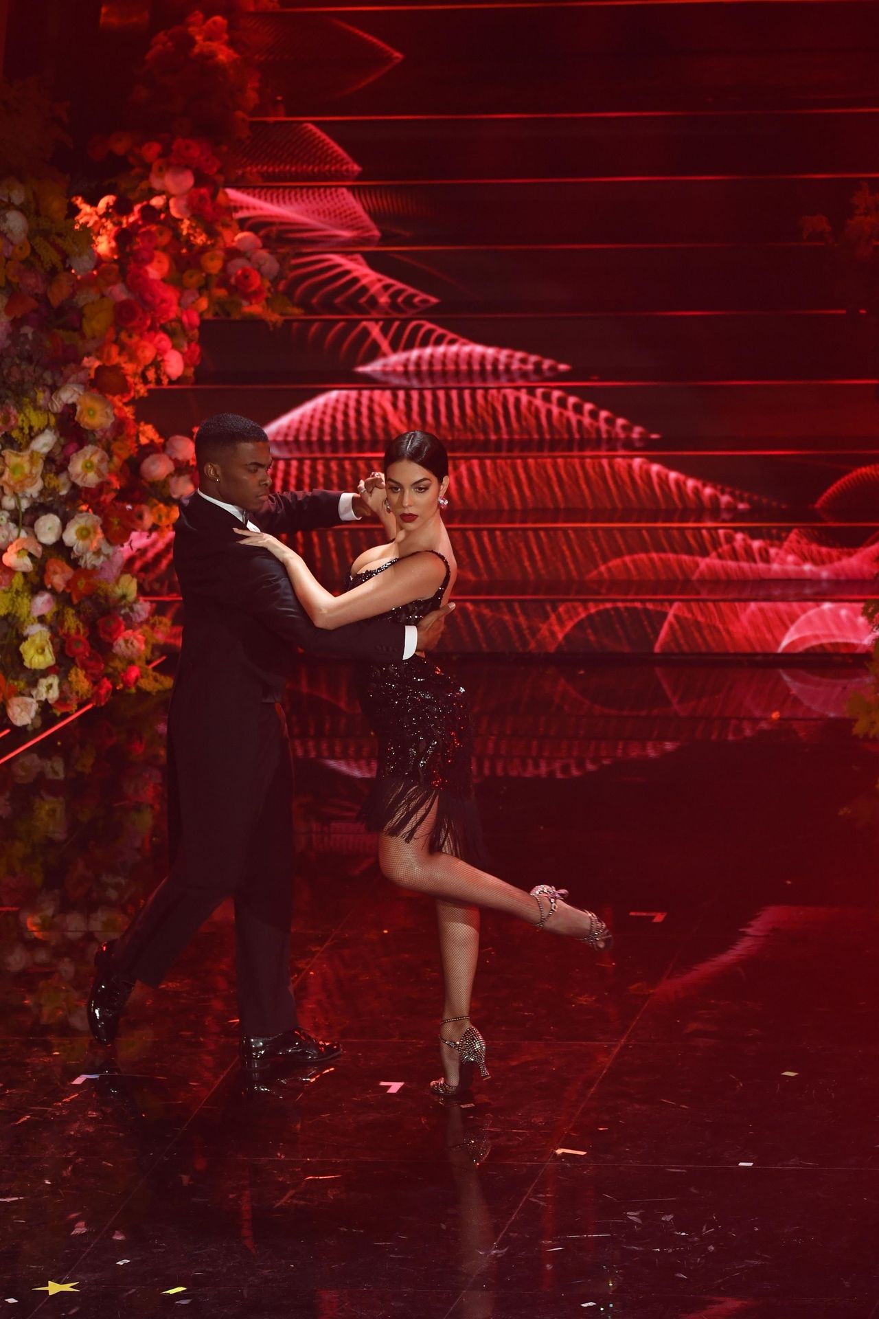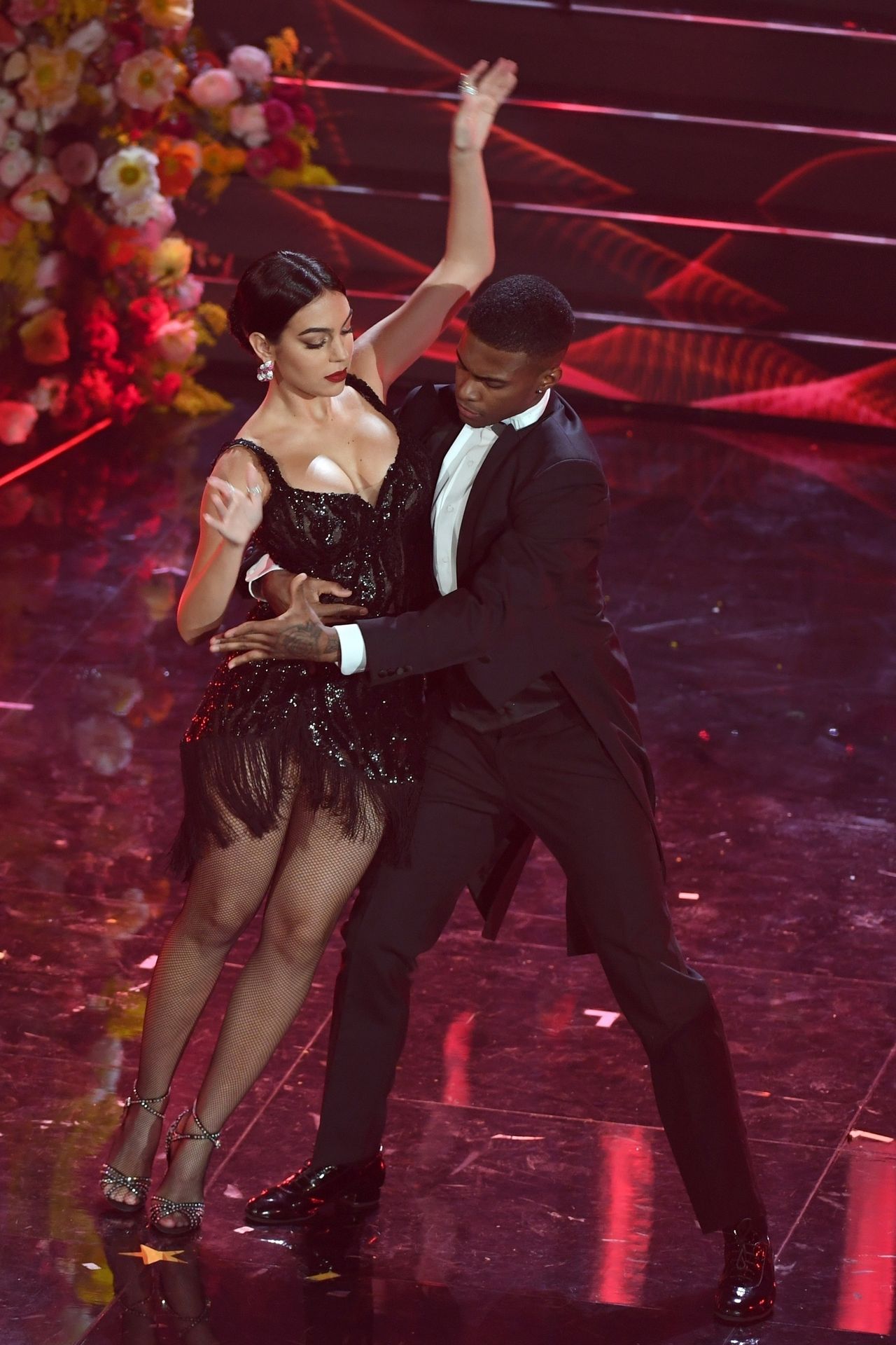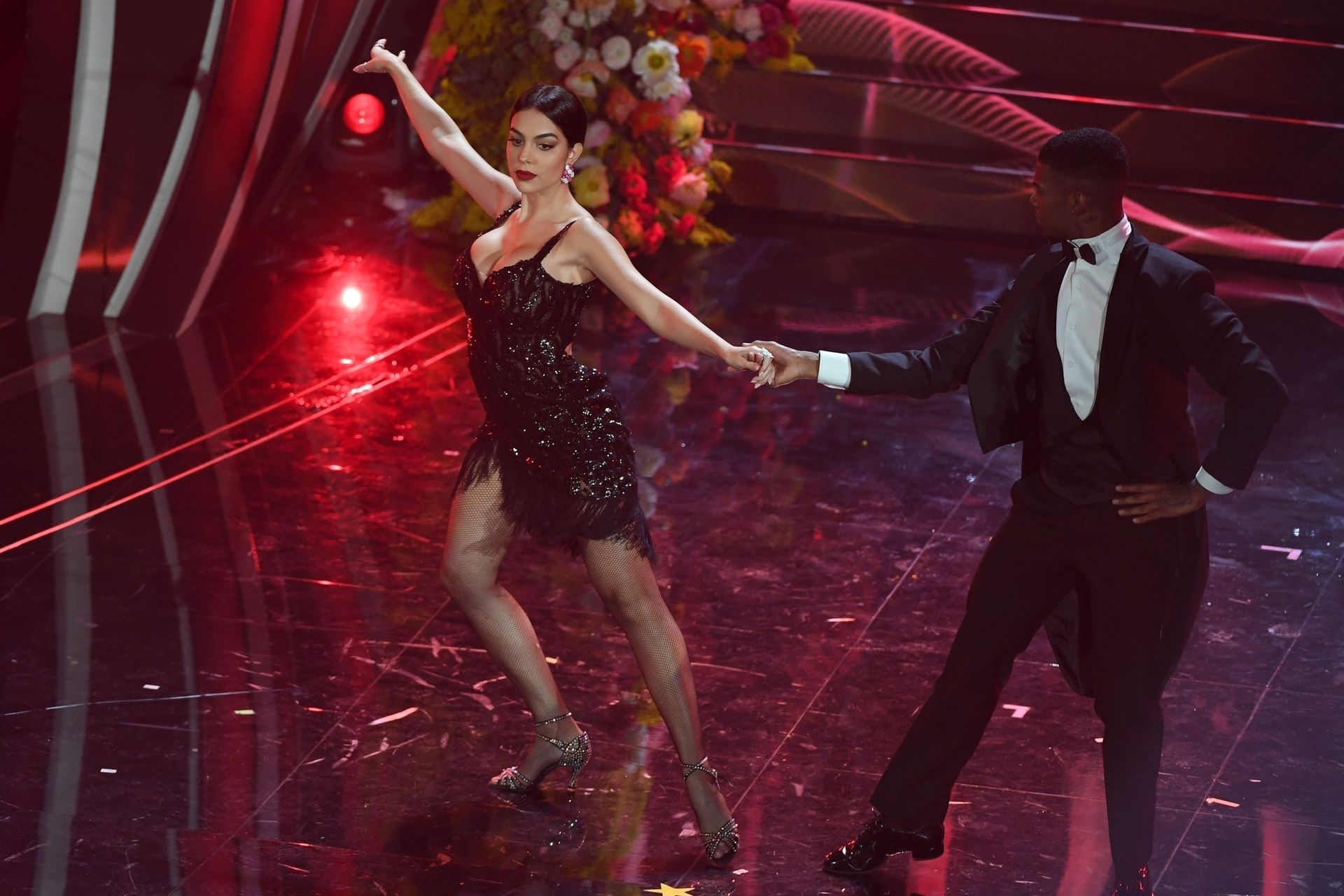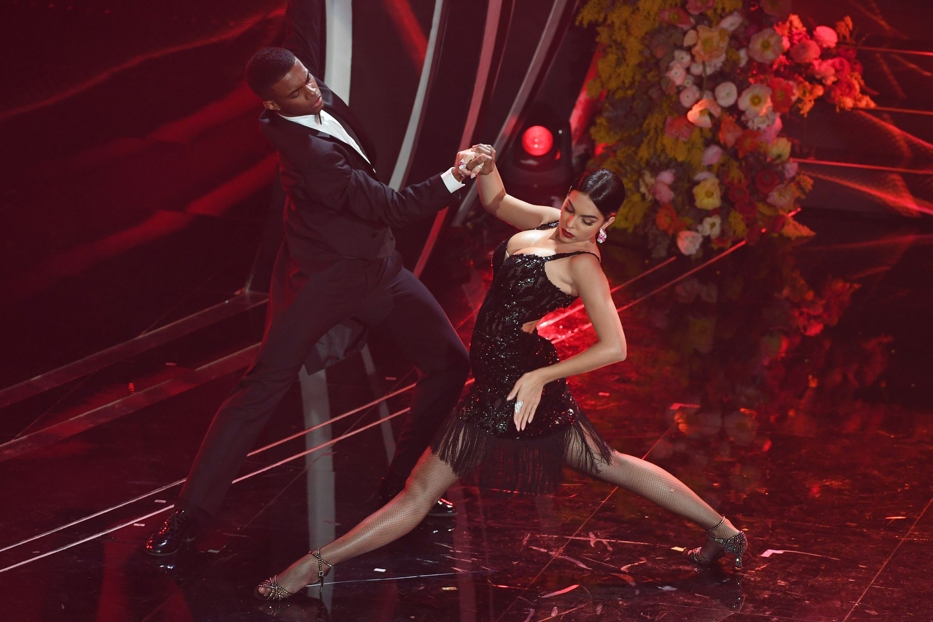 Georgina warms the festival dancing a tango Argentine on the stage of the Ariston during the third evening of the event.