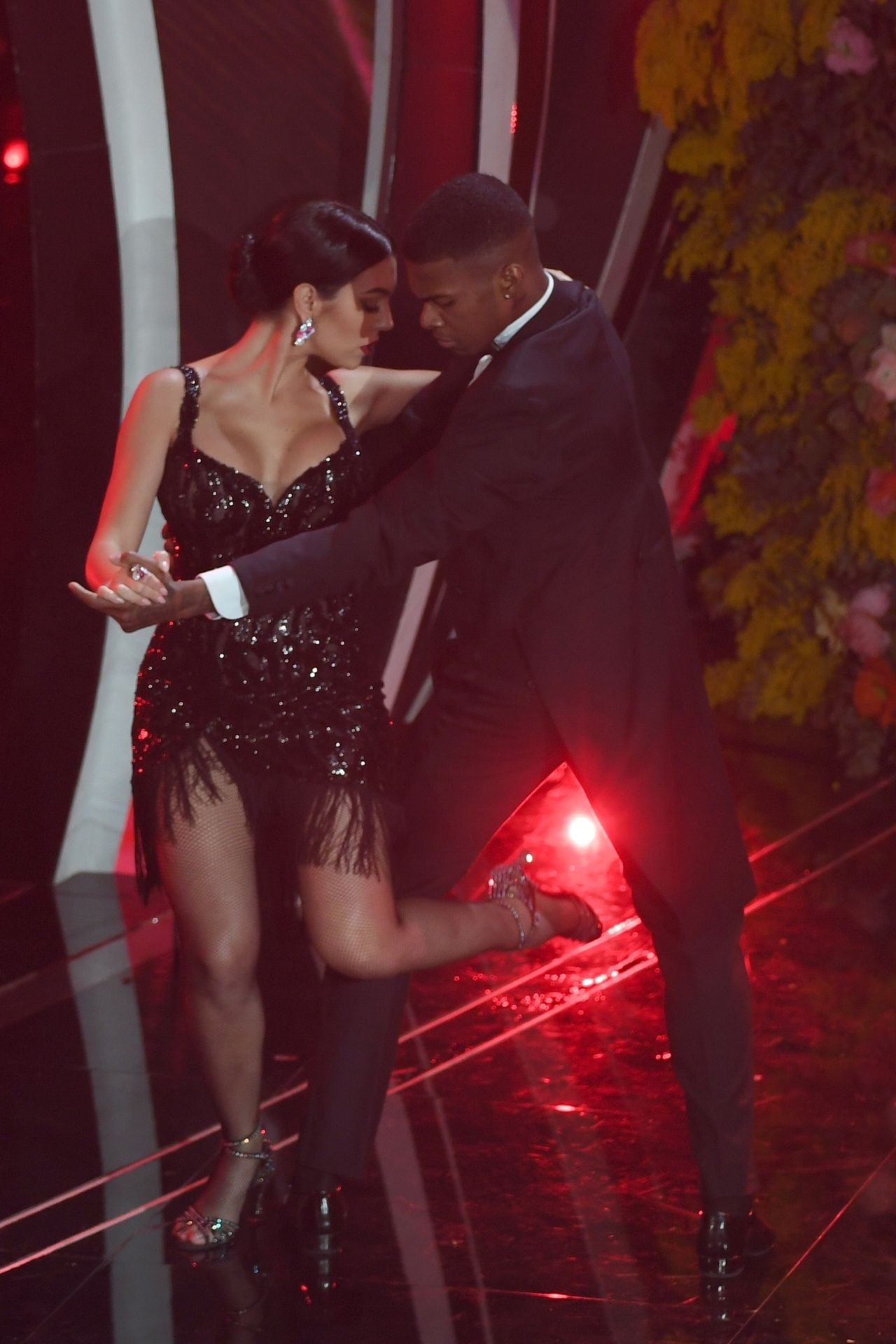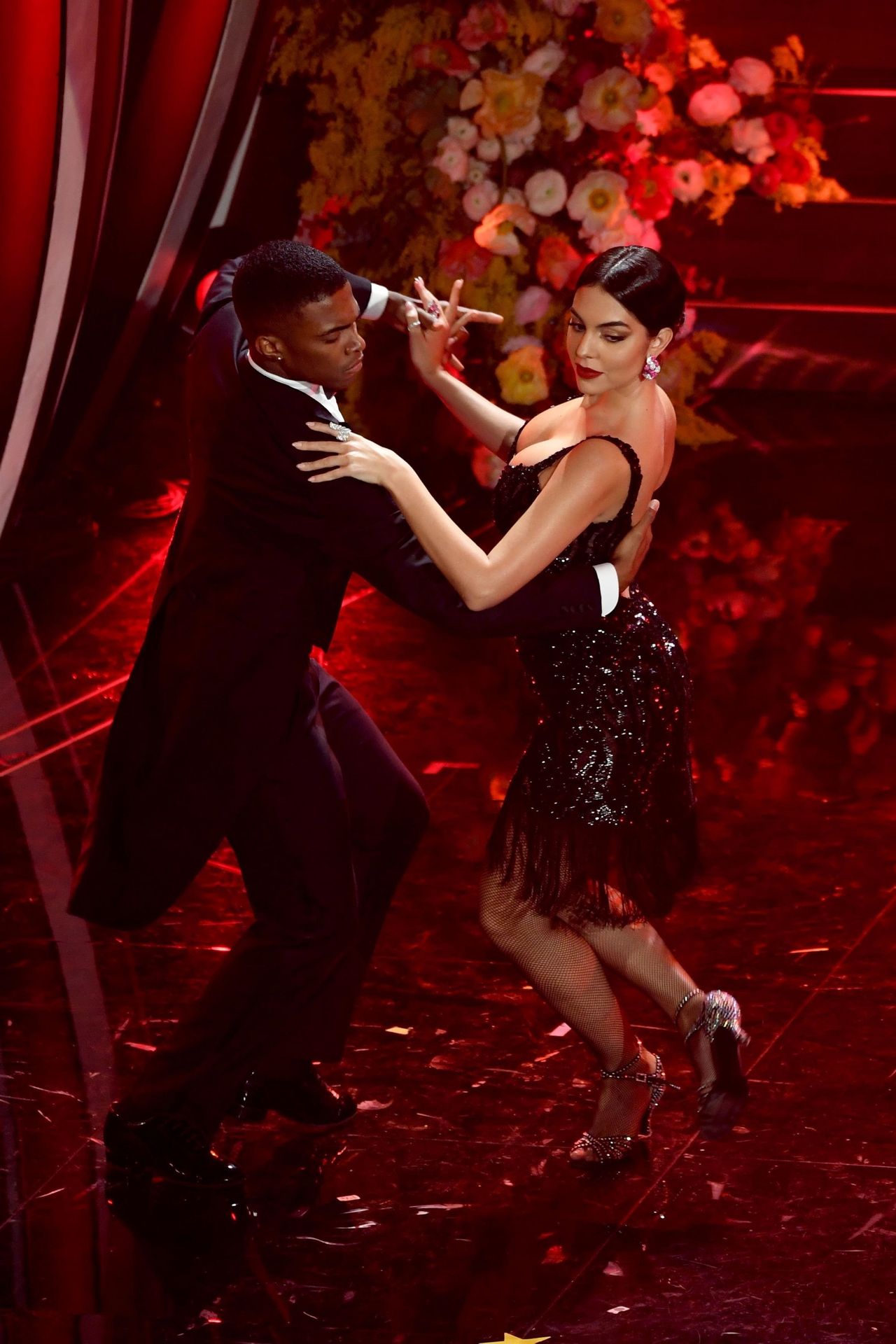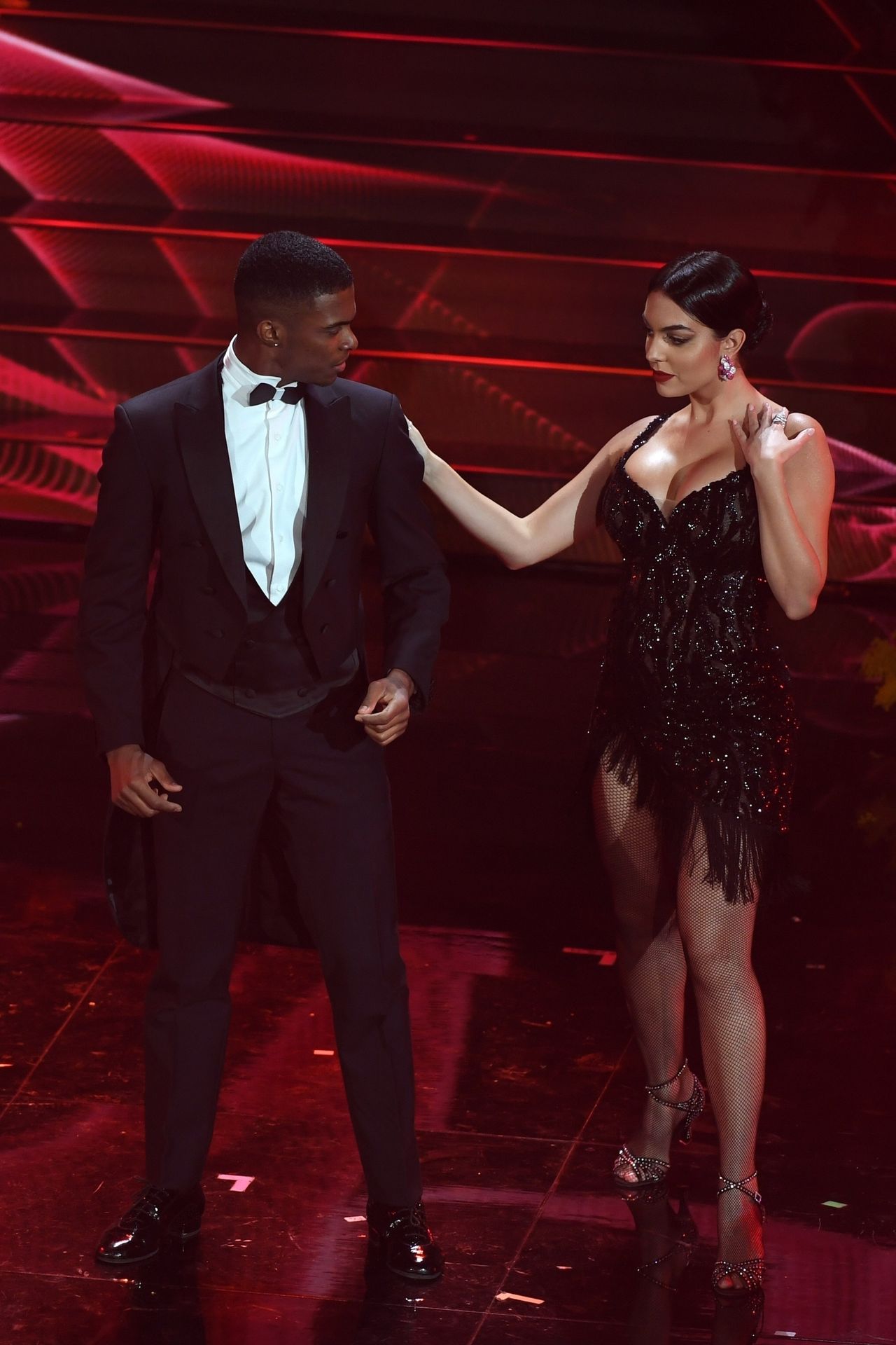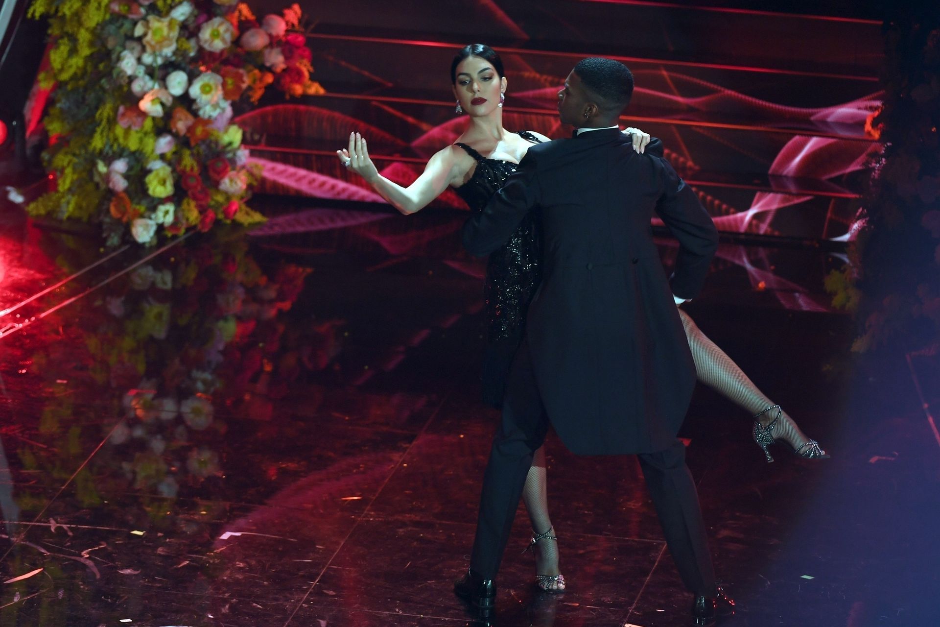 Georgina warms the festival dancing a tango Argentine on the stage of the Ariston during the third evening of the event.