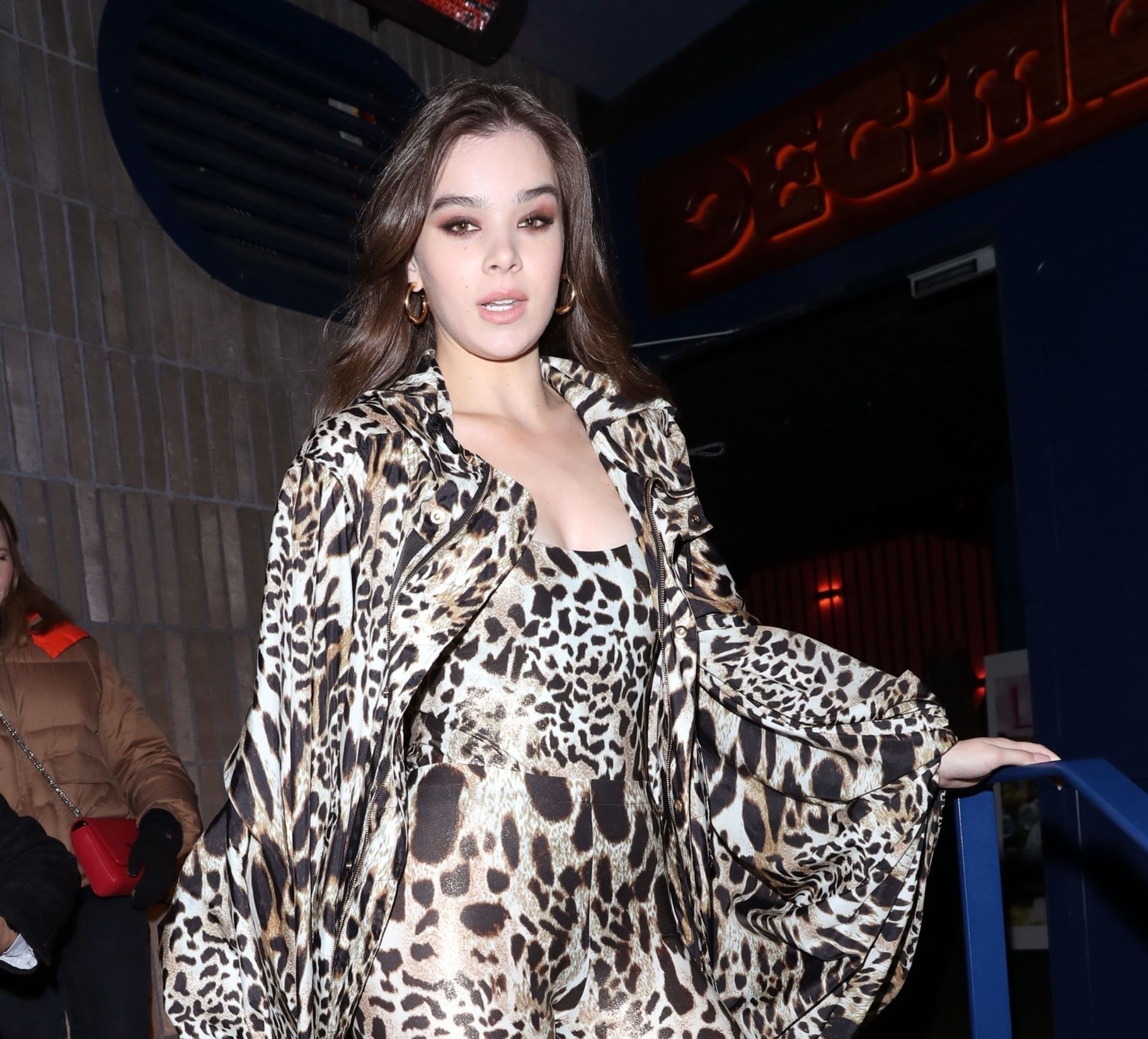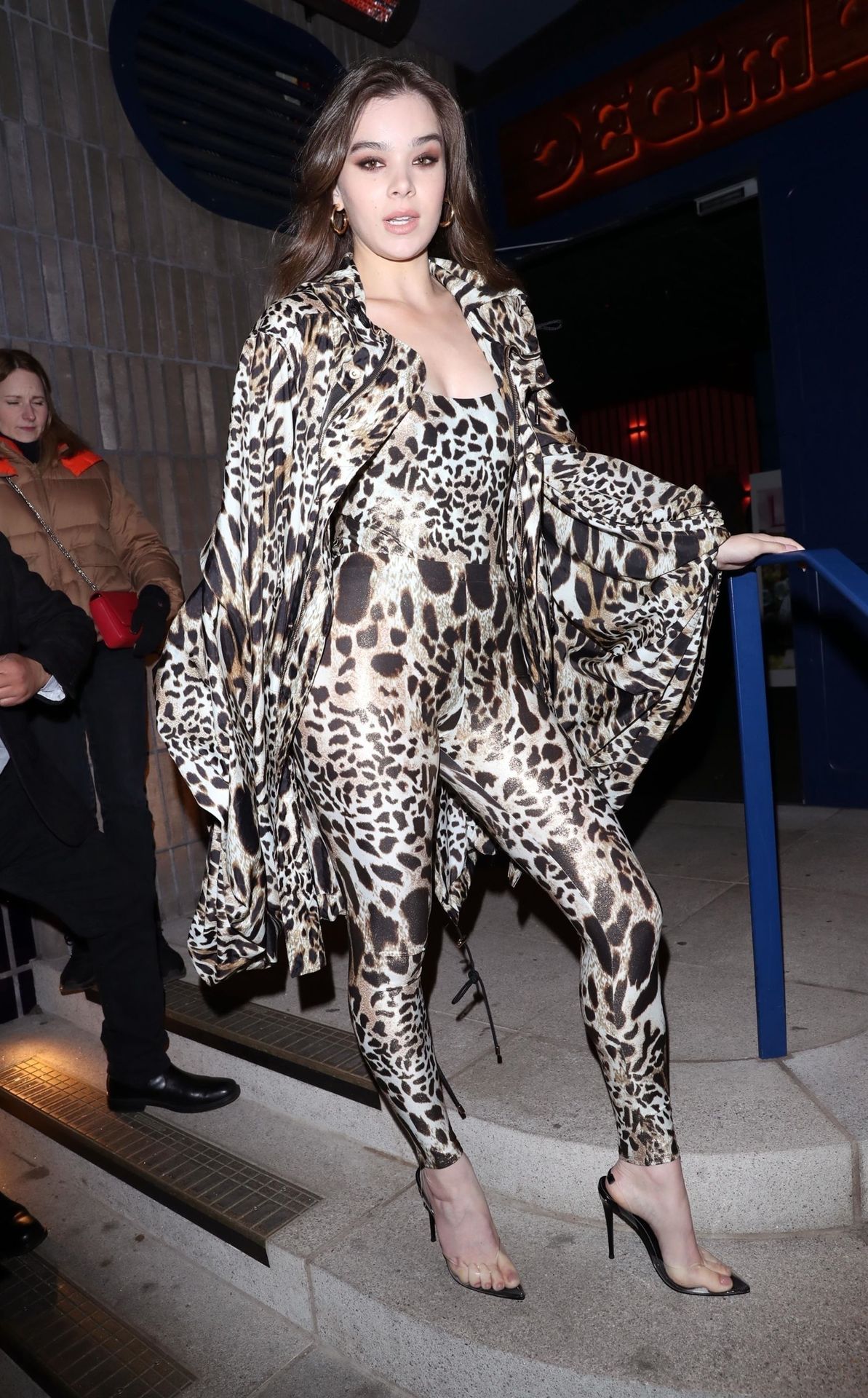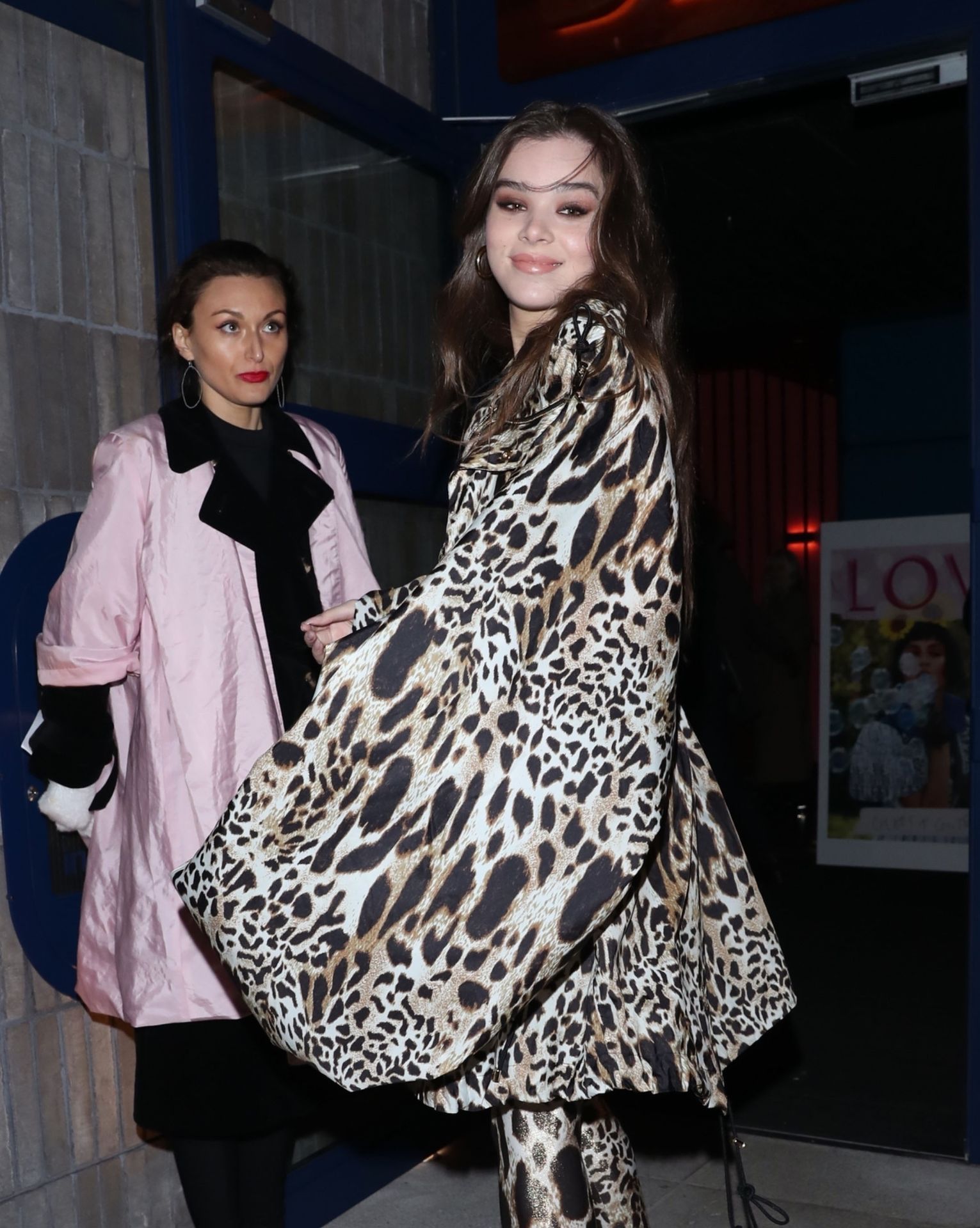 Singer/actress/model Hailee Steinfeld attends the Love Magazine party at the Standard hotel in London, 02/17/2020. She chose for the event a lepard print dress.