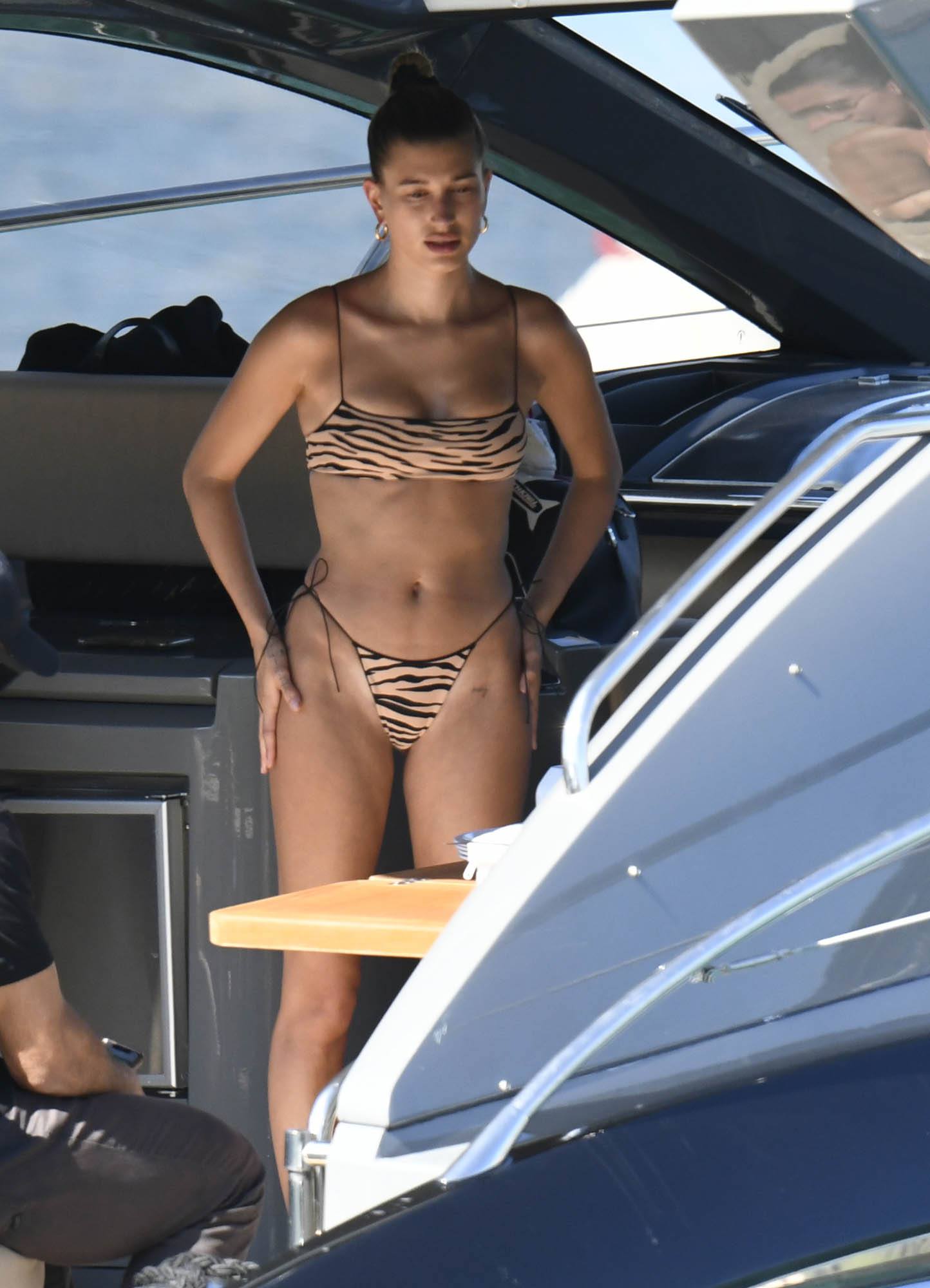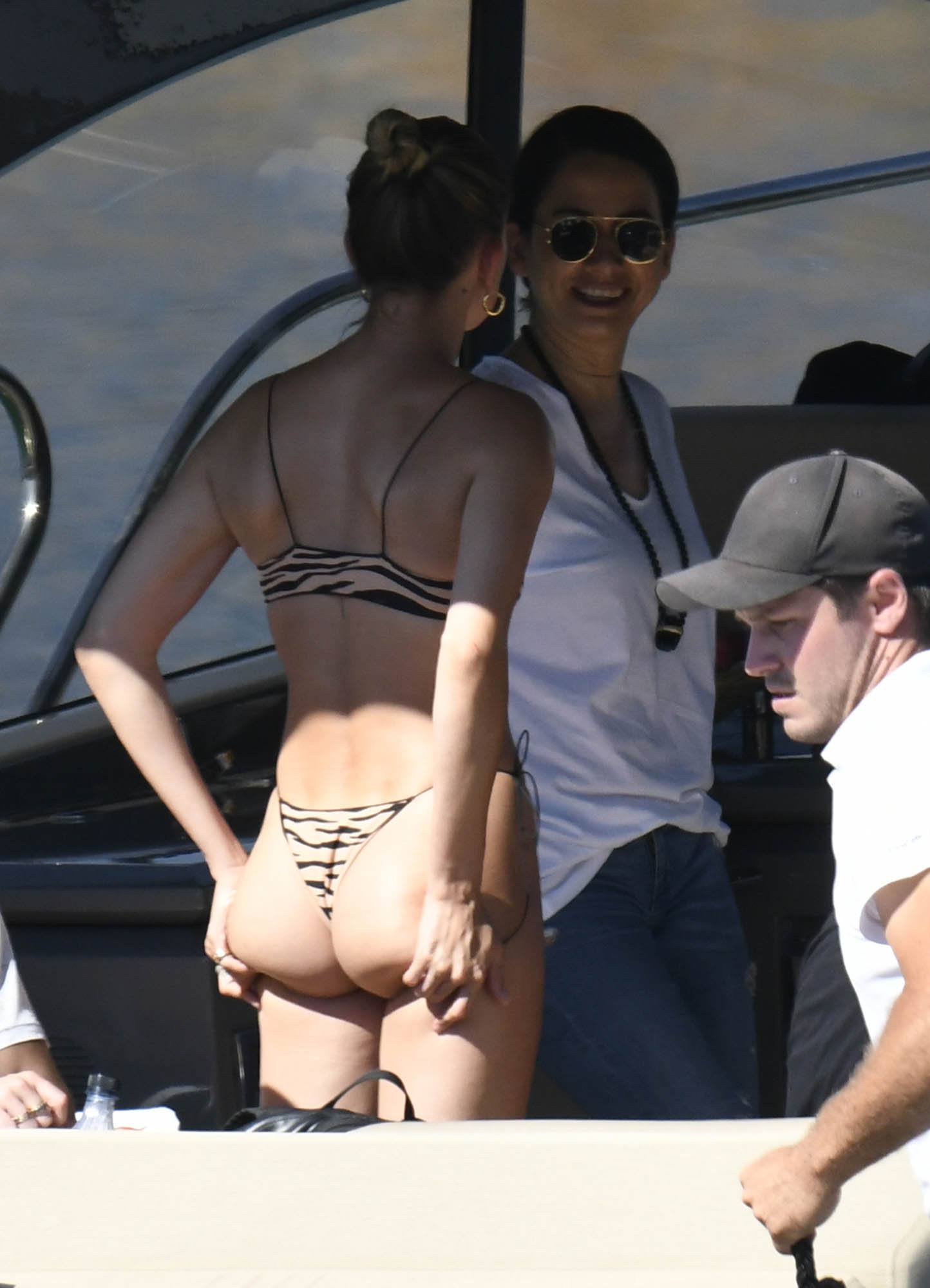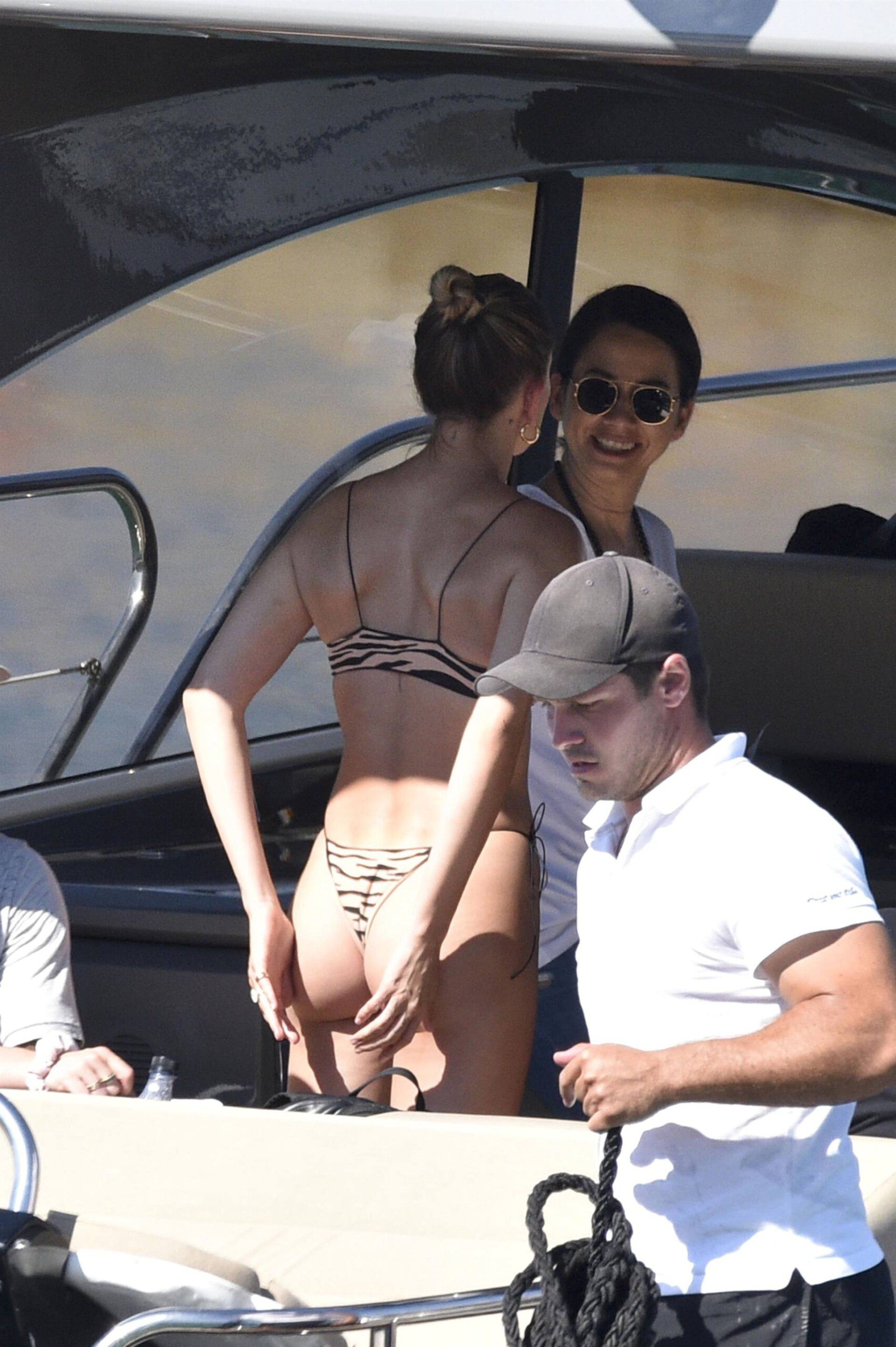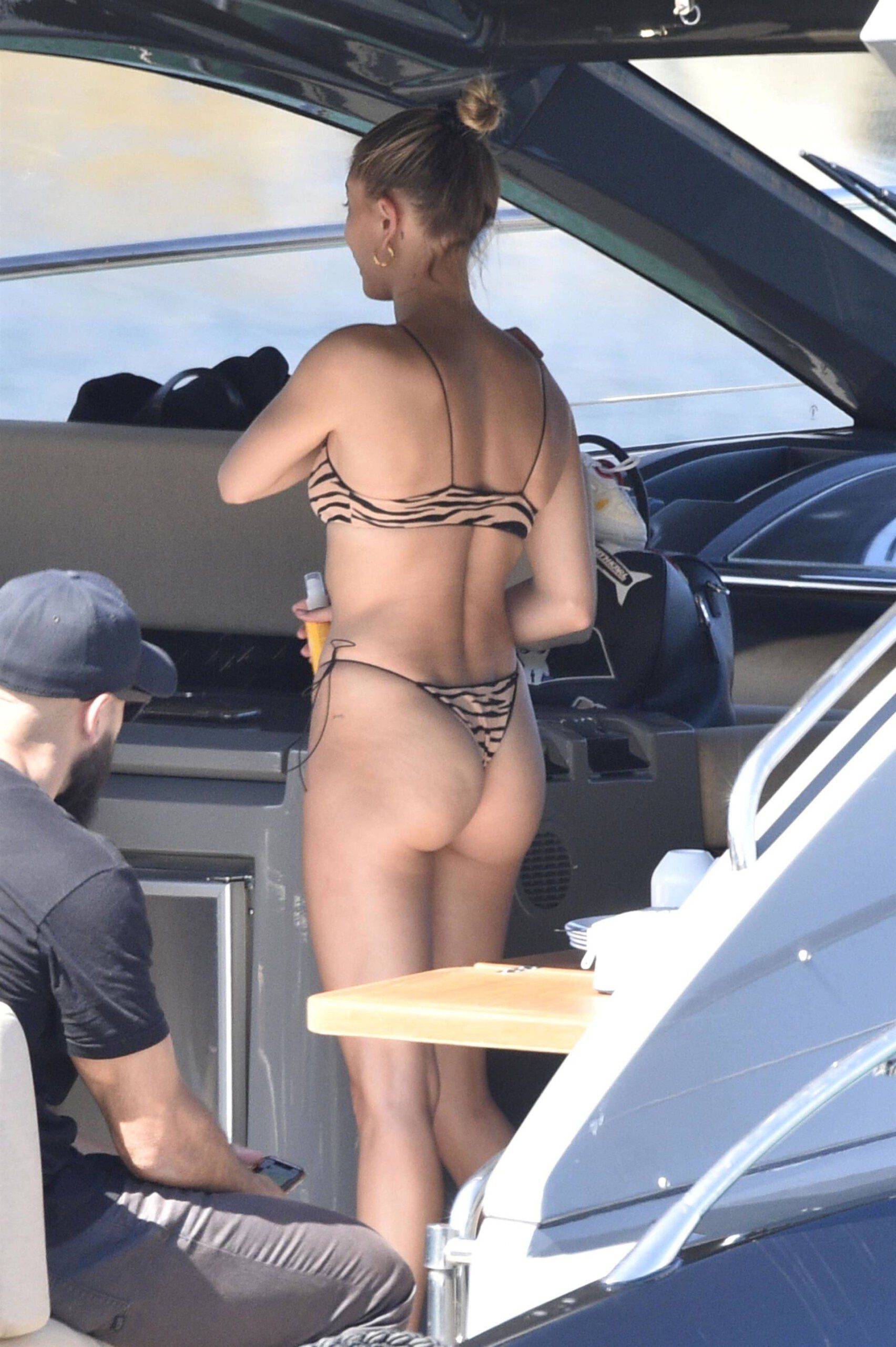 Hailey Baldwin flaunts her beautiful ass wearing tiny bikini on a yacht in Sardinia.