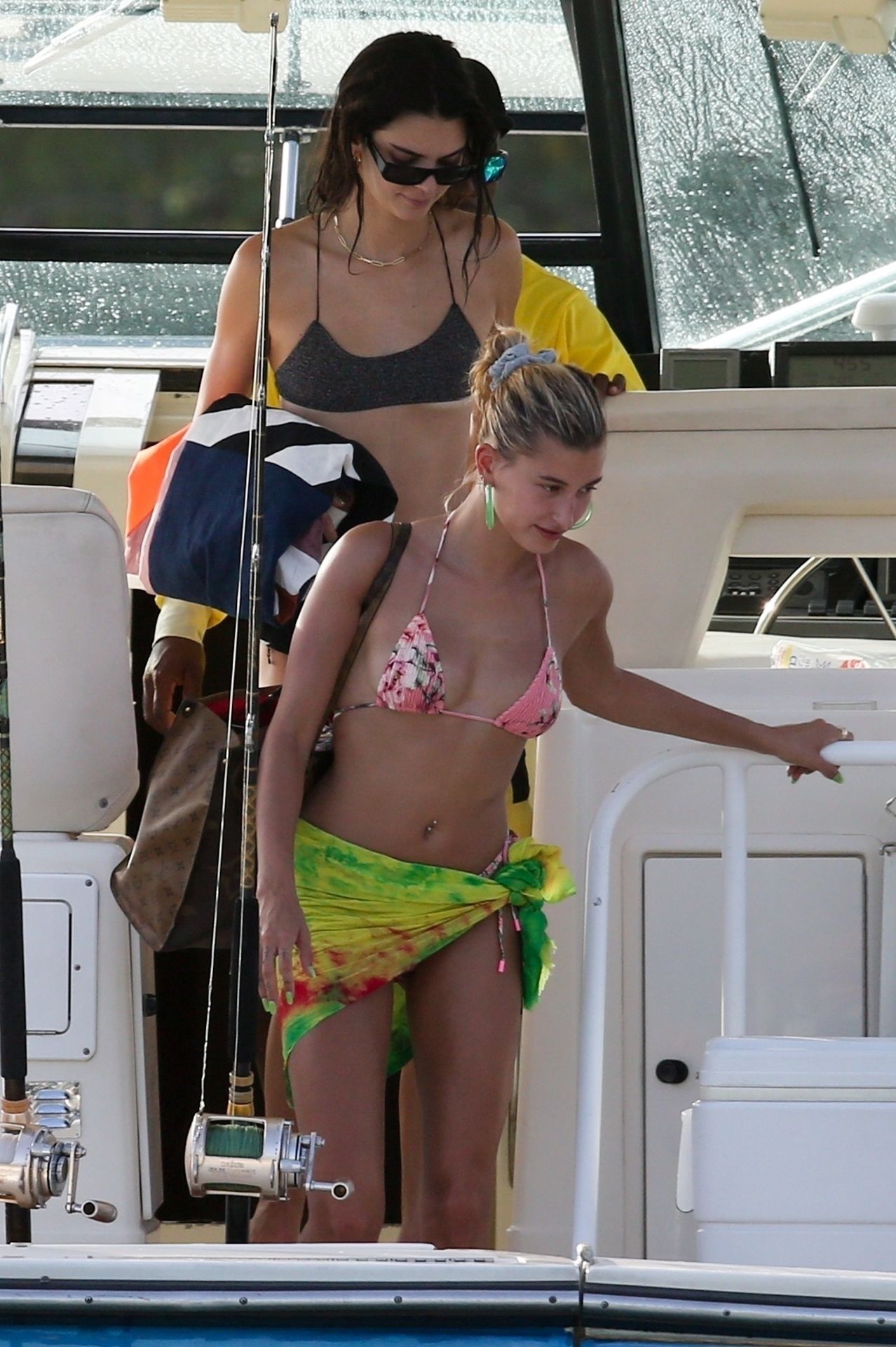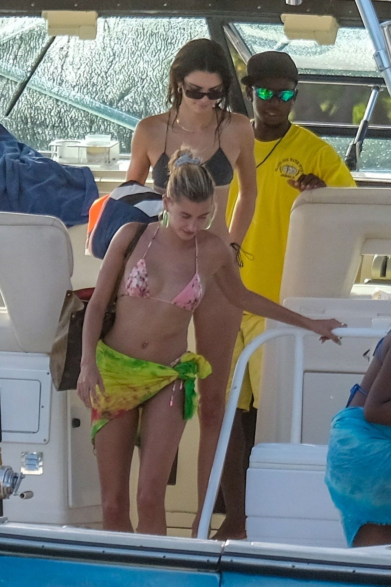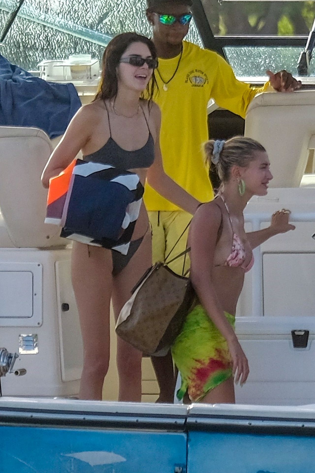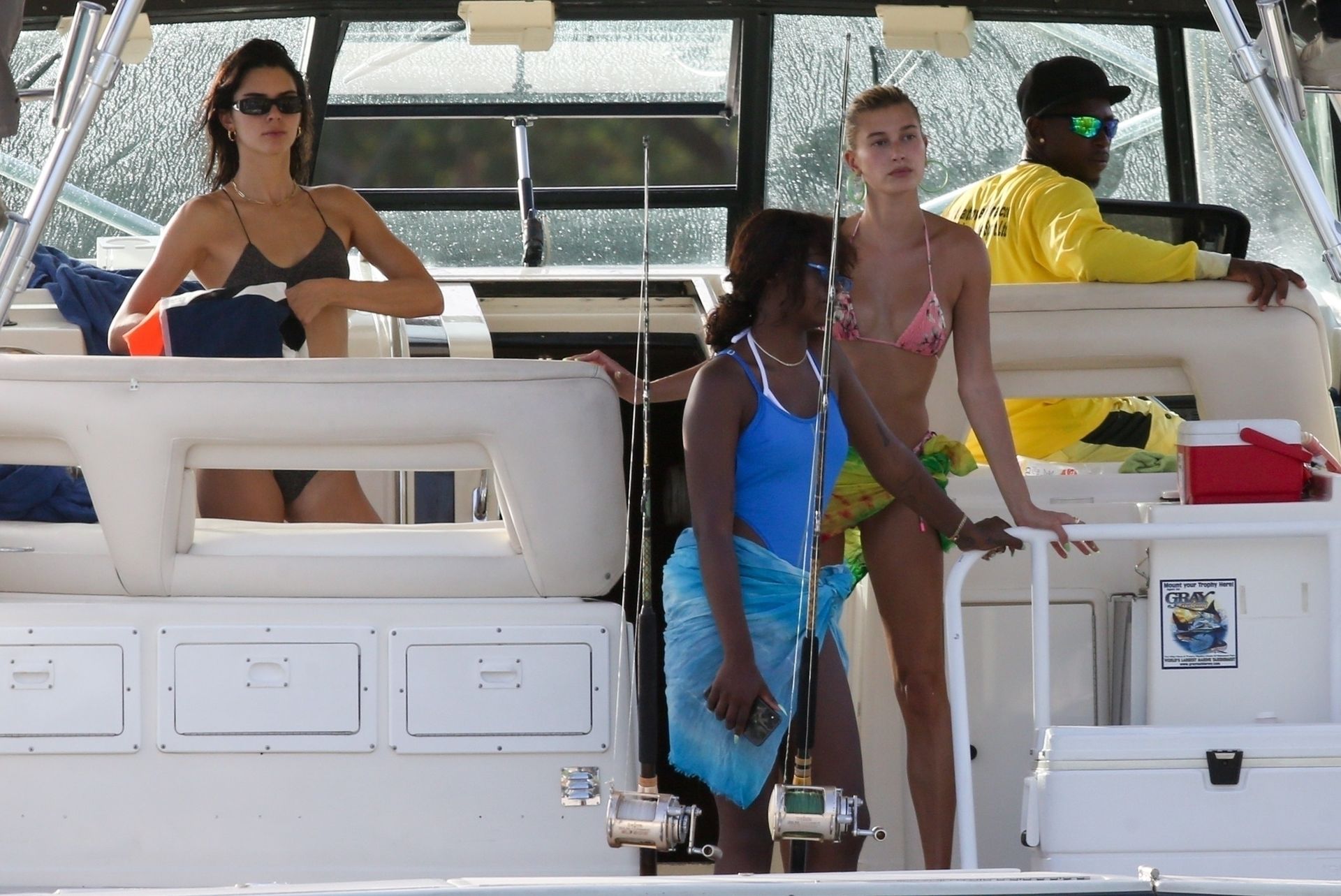 Hailey Bieber, Kendall Jenner, and Justine Skye enjoy cocktails and tan time on a boat on what appears to be Hailey’s bachelorette party in Jamaica, 08/26/2019.