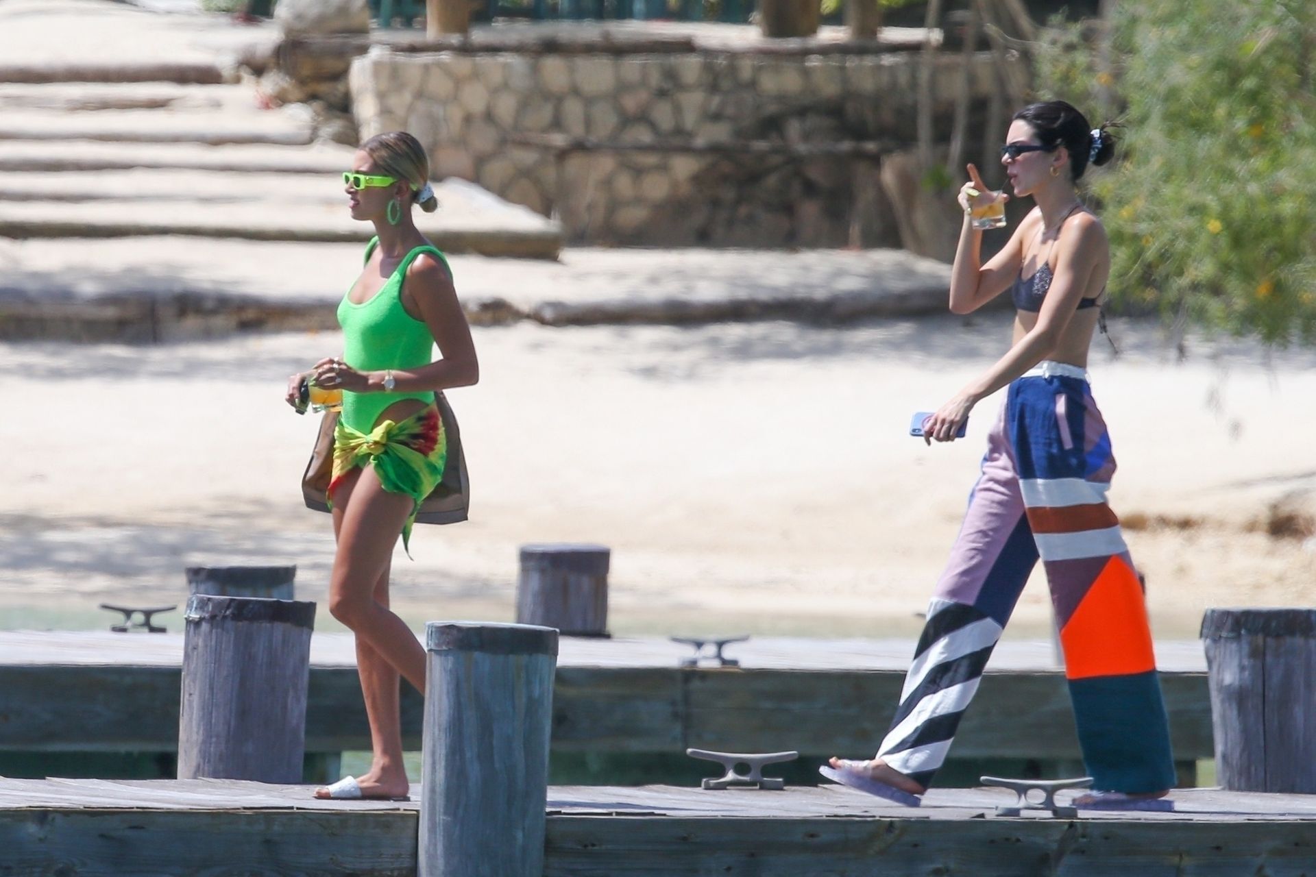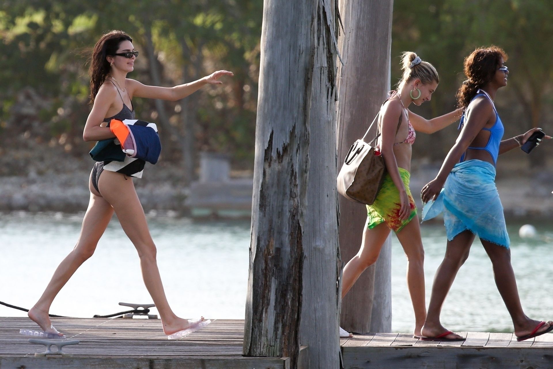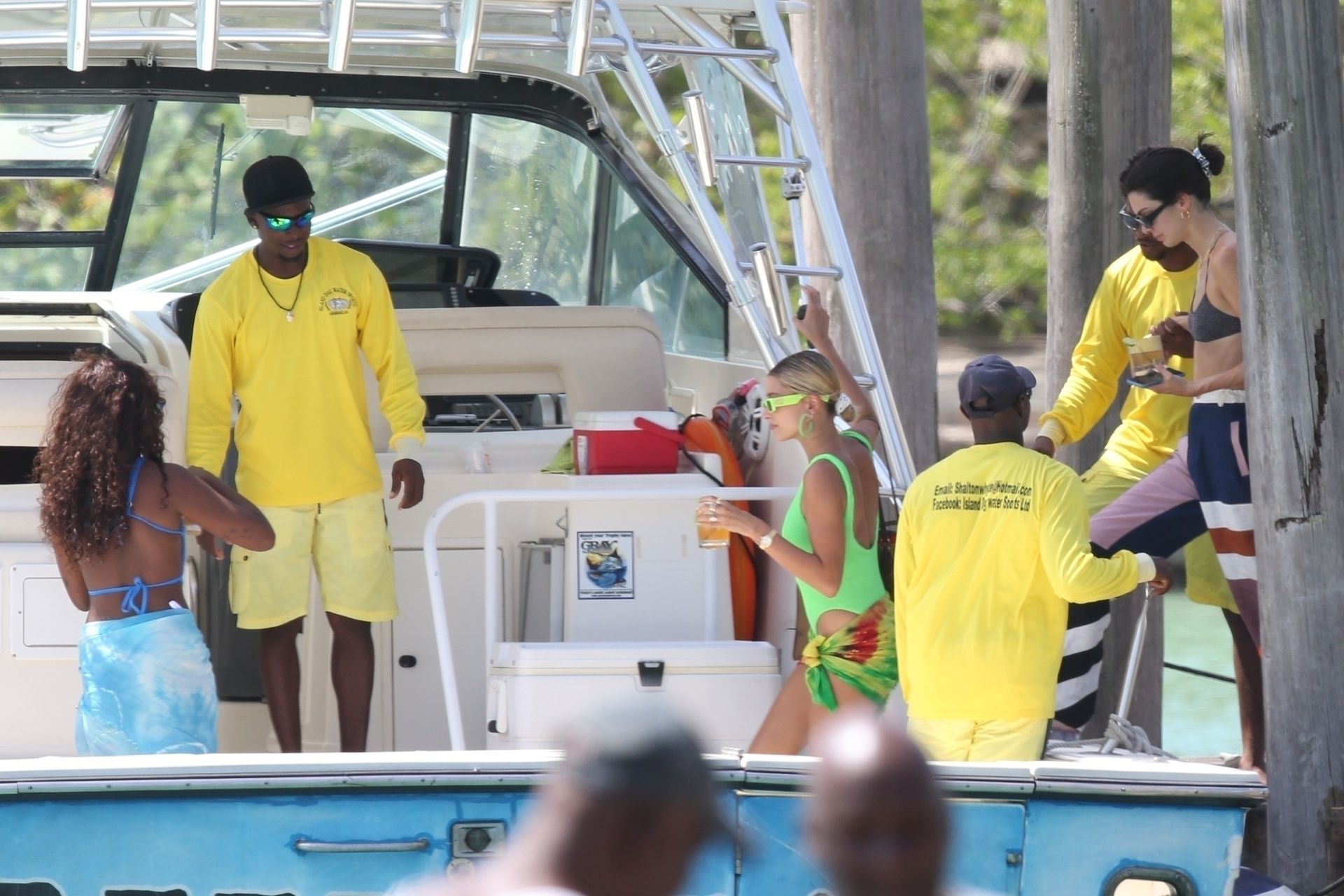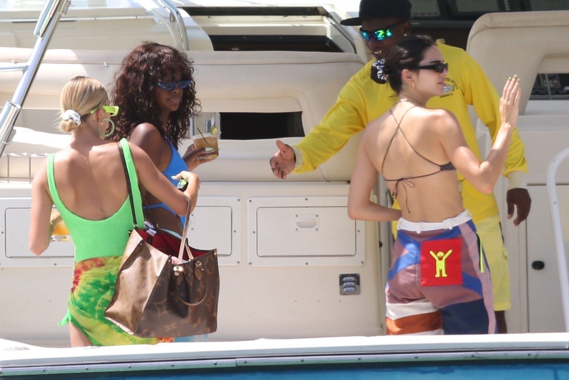 Hailey Bieber, Kendall Jenner, and Justine Skye enjoy cocktails and tan time on a boat on what appears to be Hailey’s bachelorette party in Jamaica, 08/26/2019.