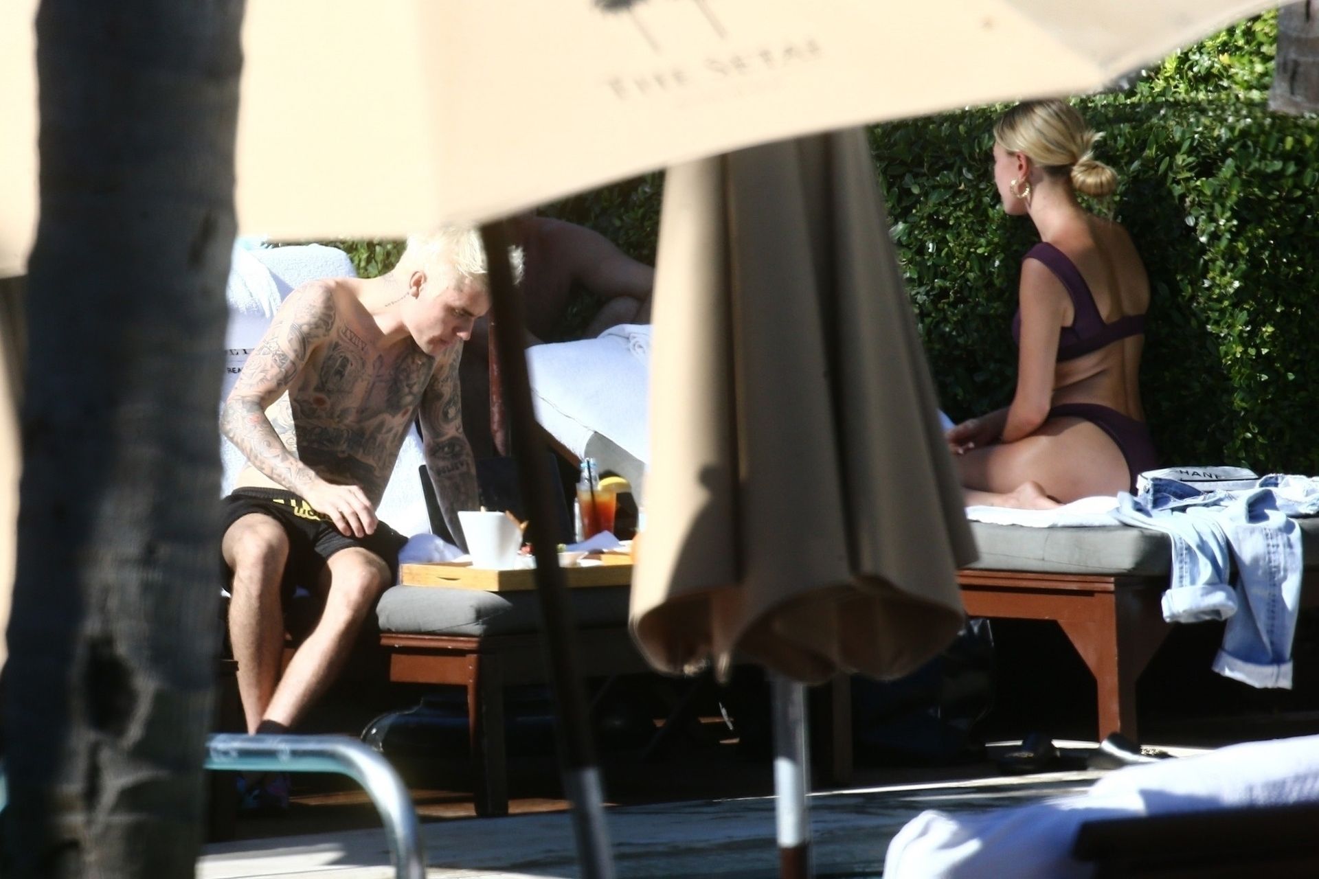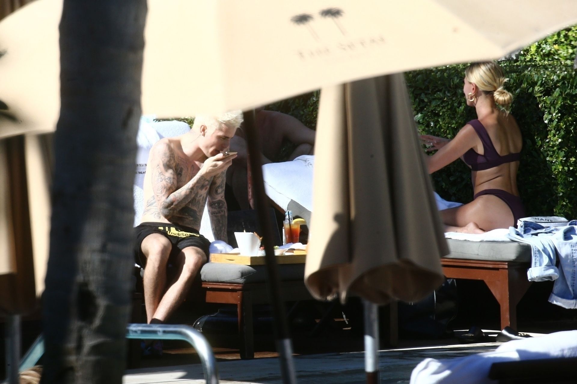 Justin Bieber and Hailey Bieber enjoy their Thanksgiving poolside in Miami Beach, 11/28/2019. Justin and Hailey show off their bikini bods as they soak up the sun by the pool.