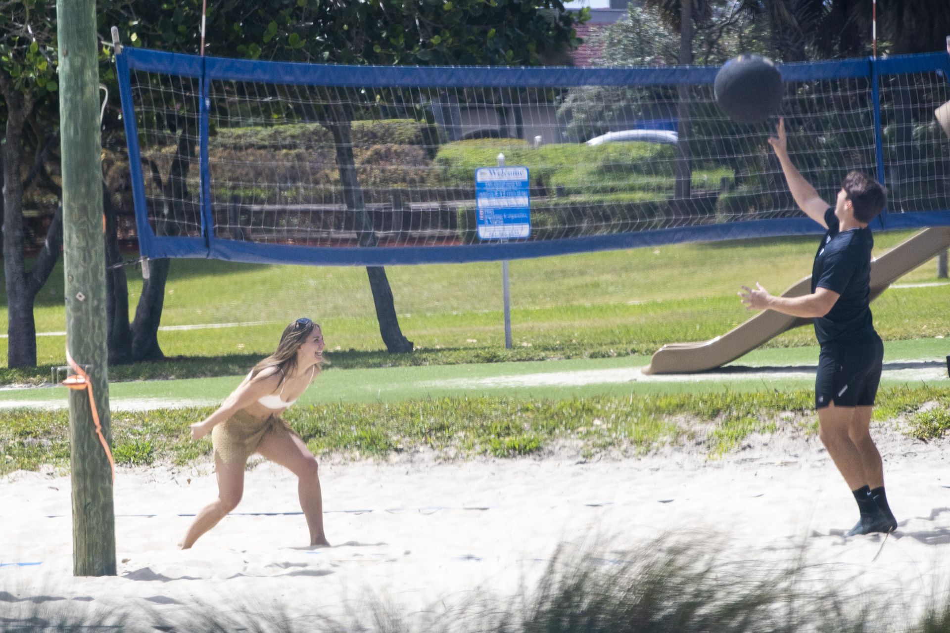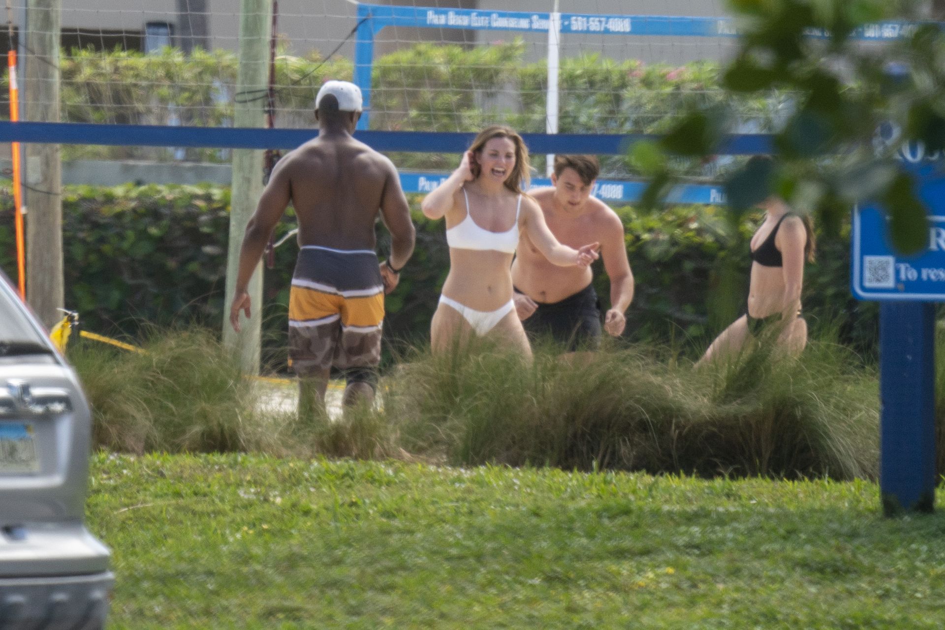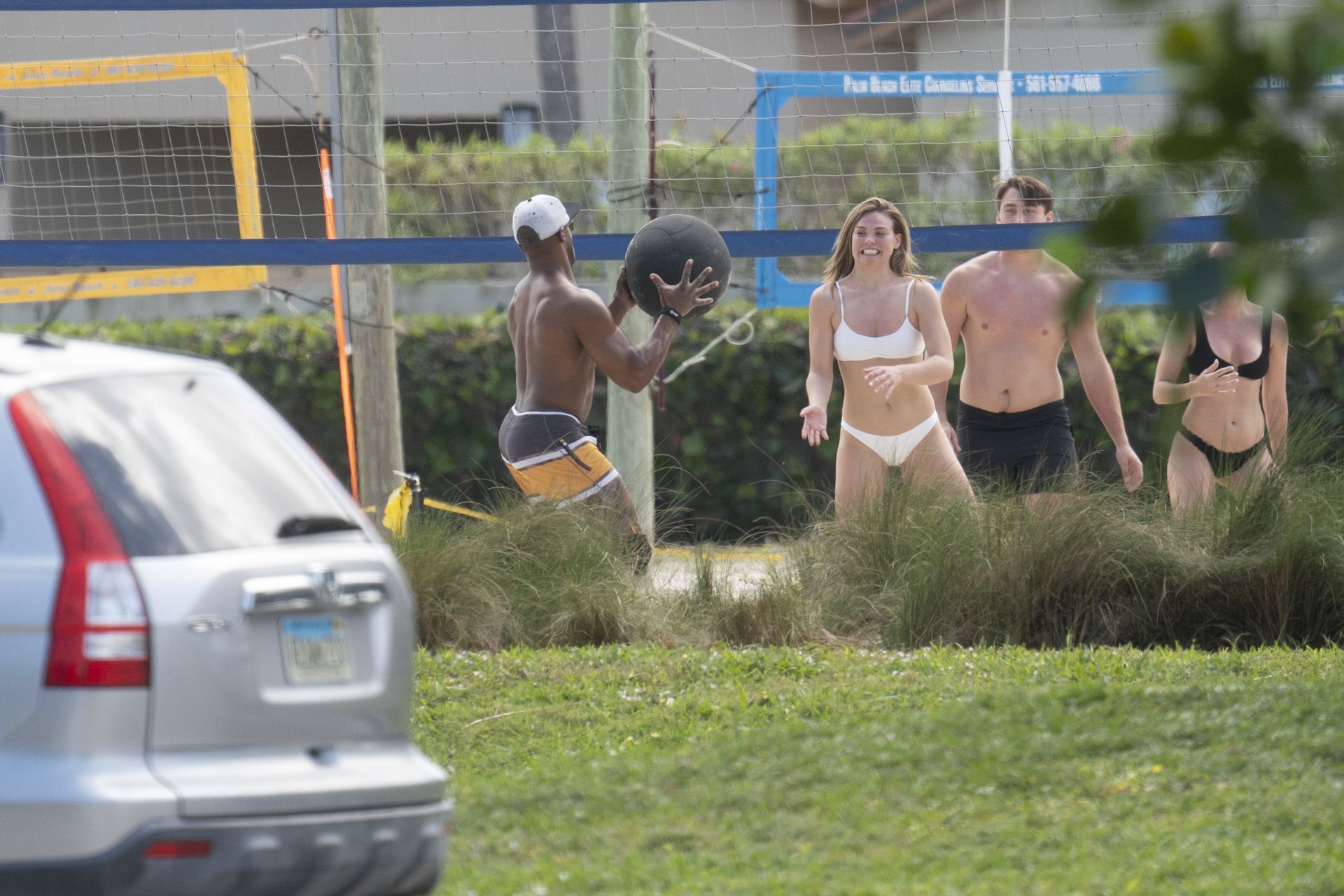 Former “Bachelorette” Hannah Brown and her hunky runner up contestant Tyler Cameron hit the beach for a fun volleyball session with pals.