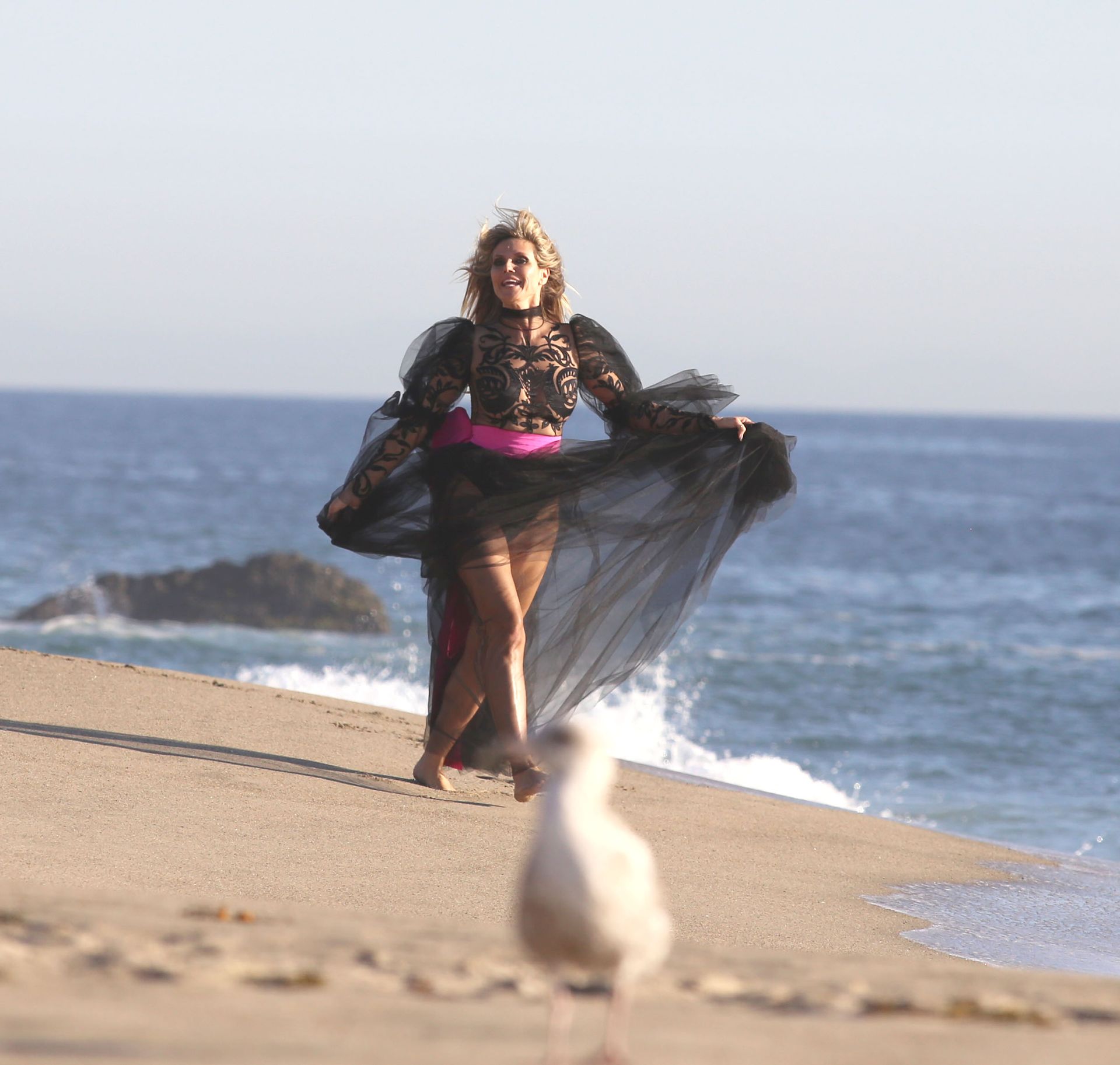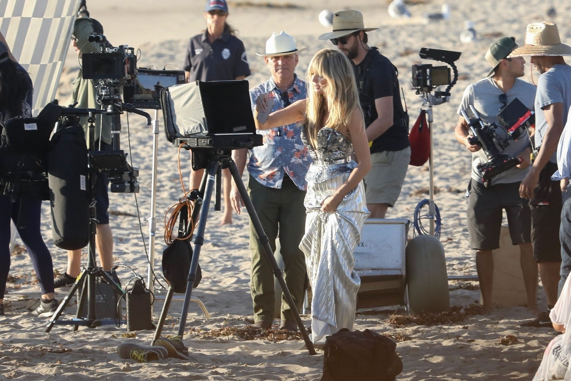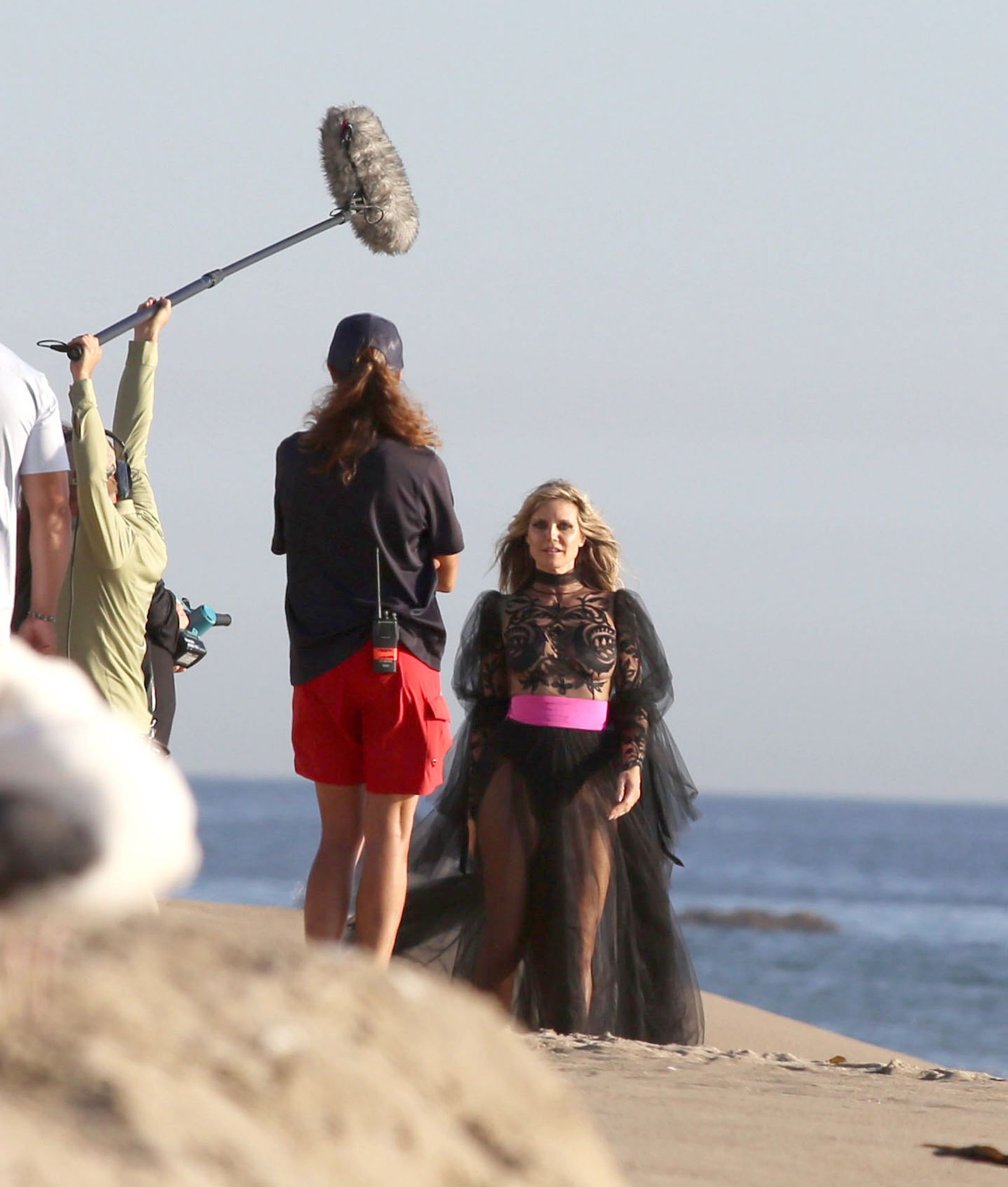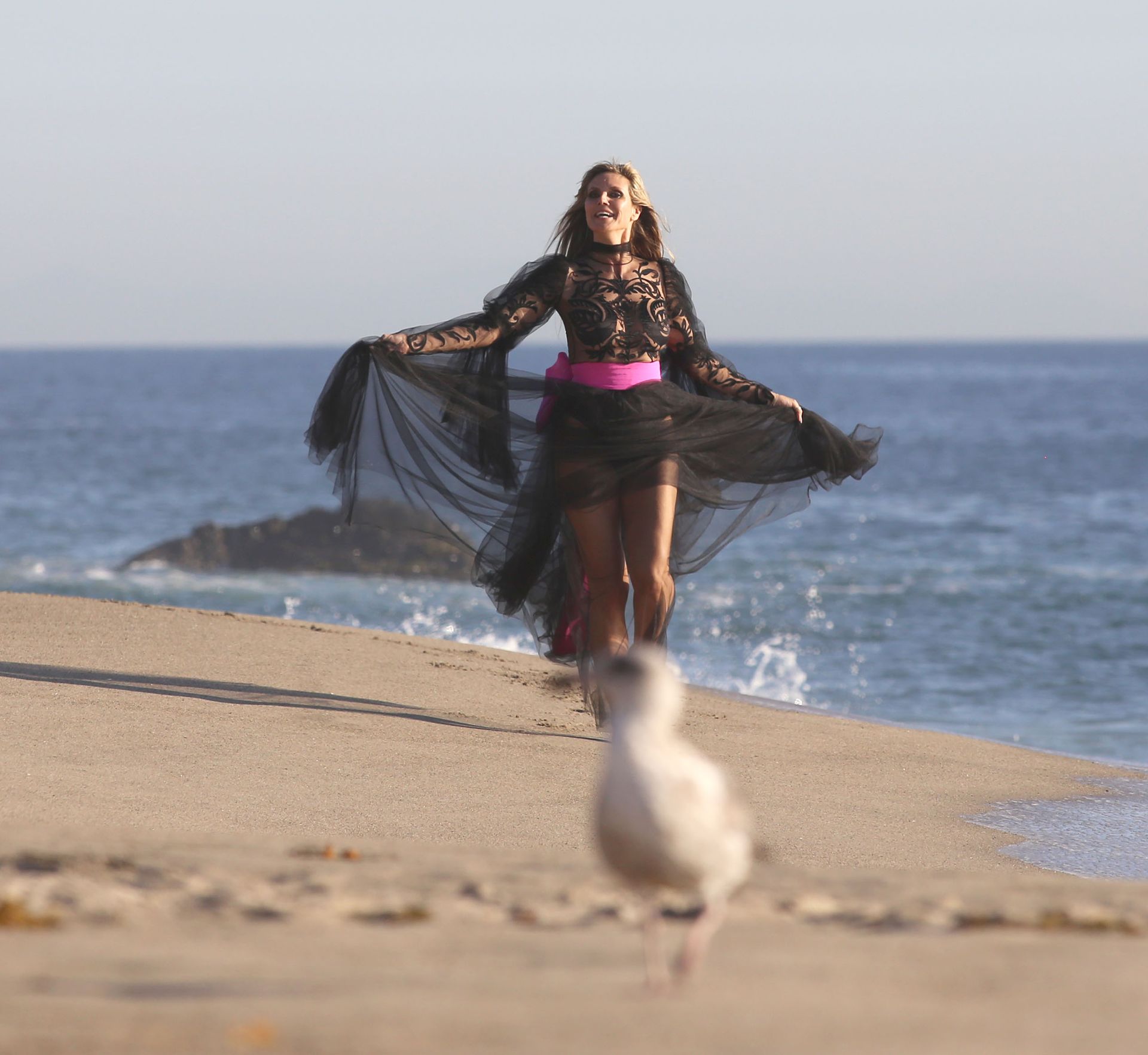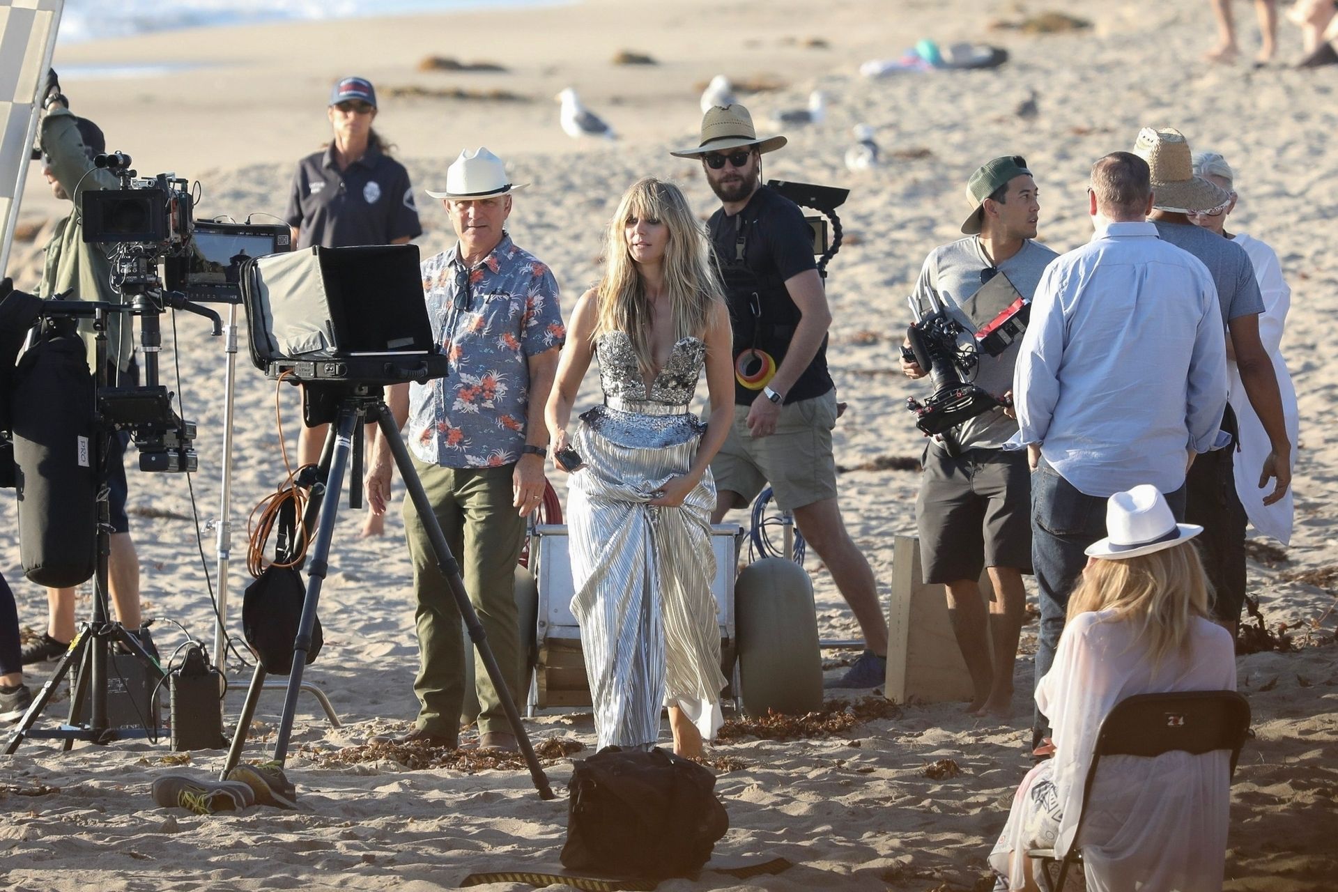 Model and TV host Heidi Klum wears a thong G-string bikini shows off her butt and cleavage while filming for her TV show Next top model on Malibu Beach, 10/24/2019.