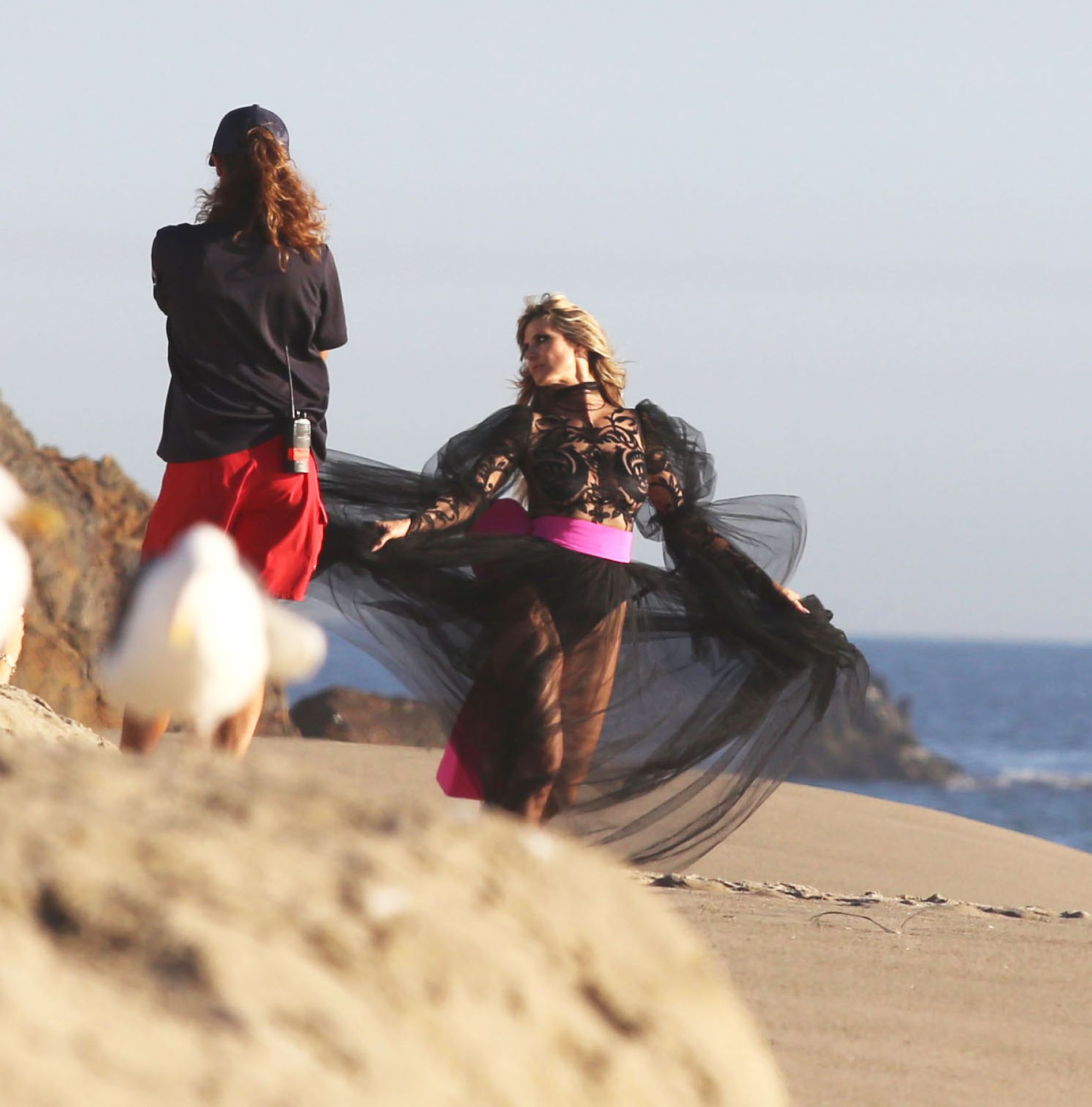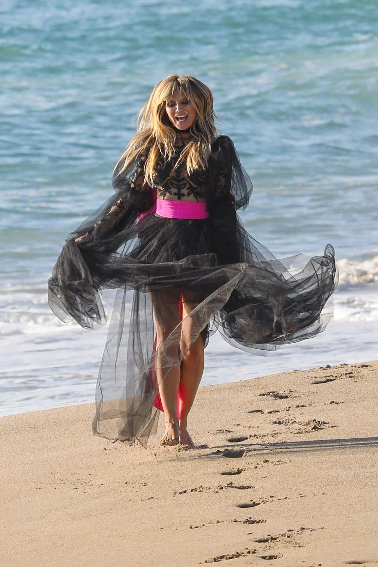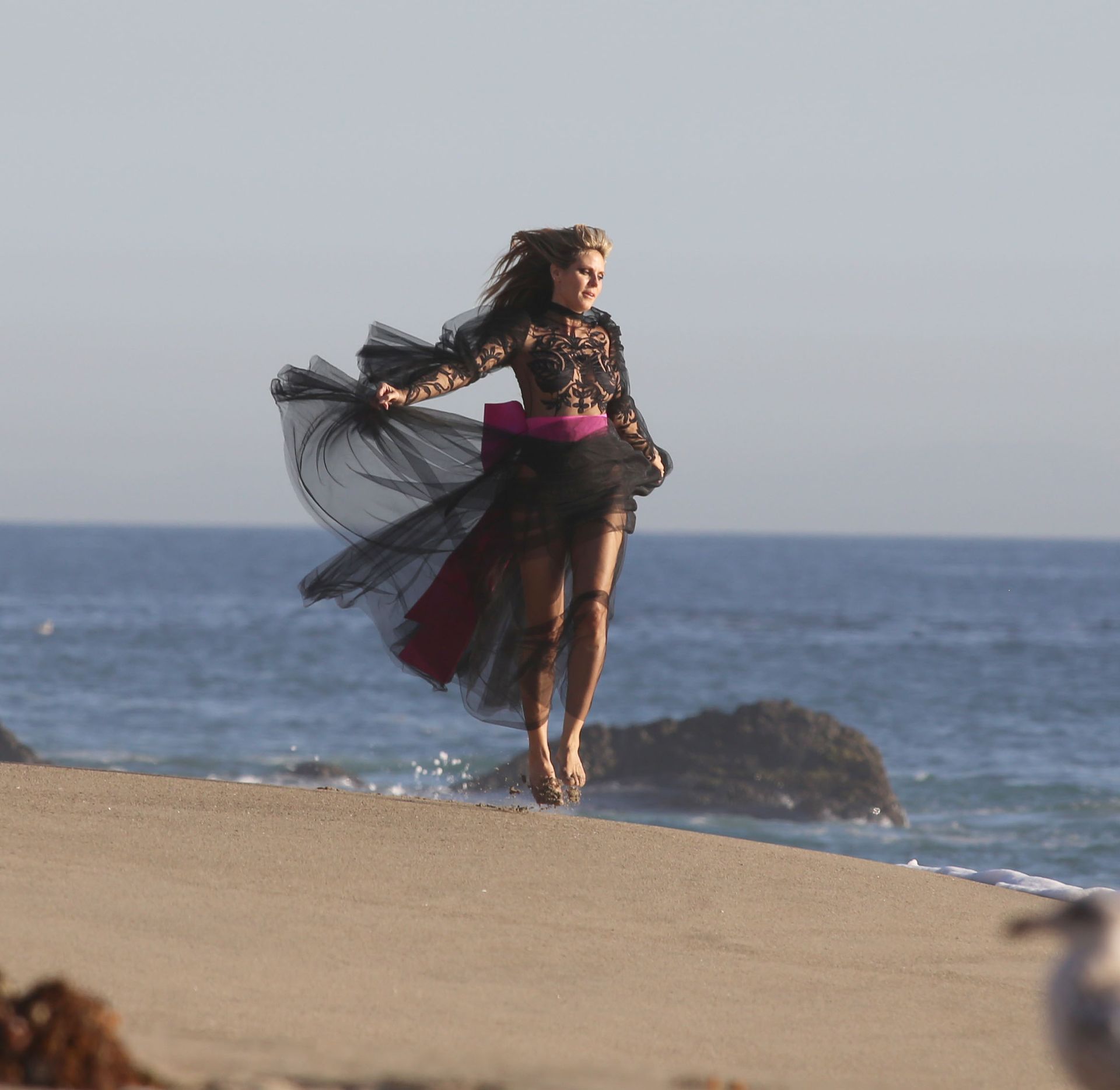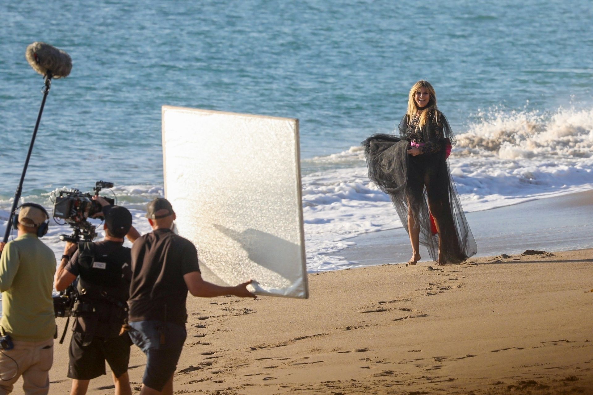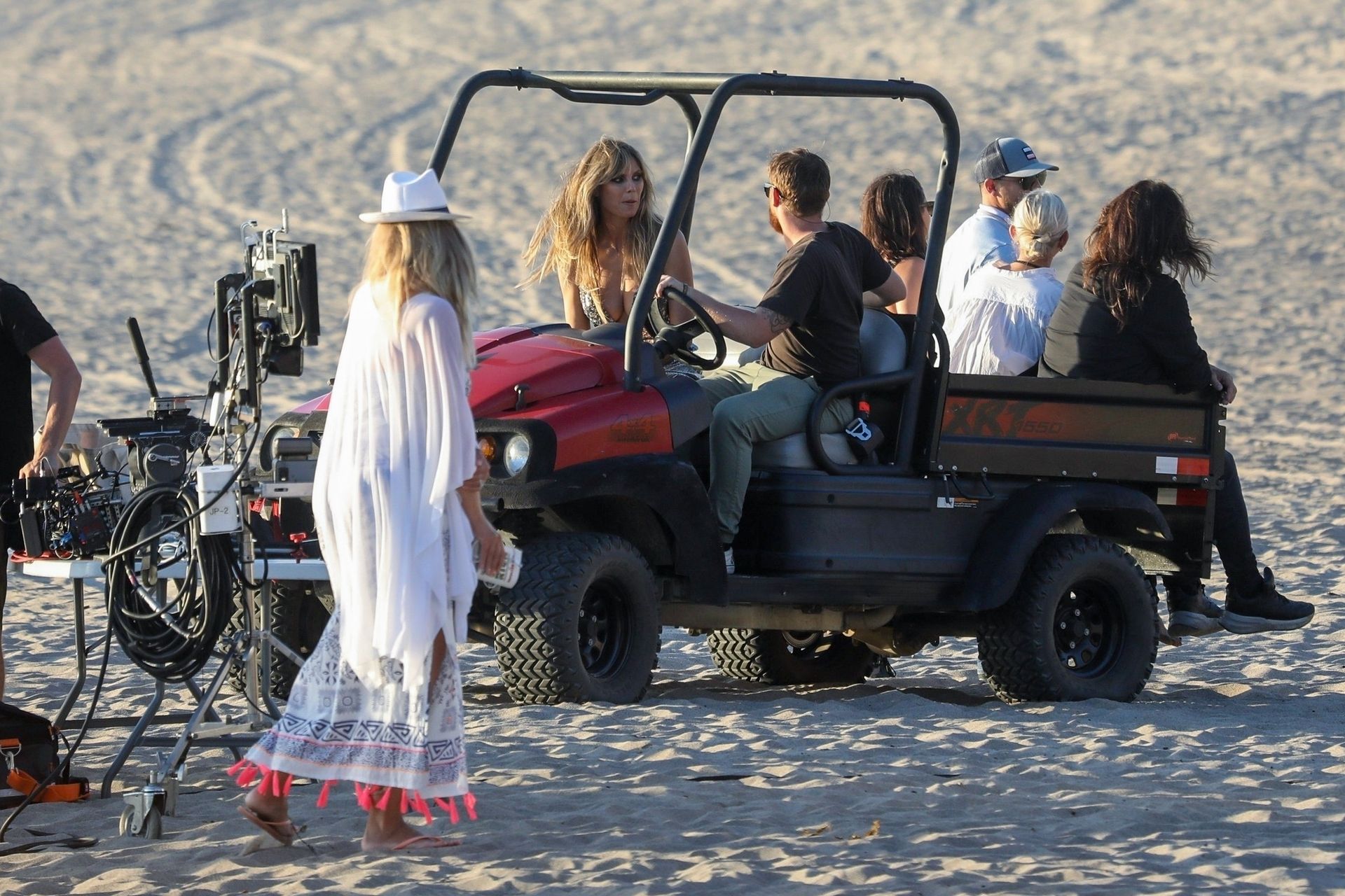 Model and TV host Heidi Klum wears a thong G-string bikini shows off her butt and cleavage while filming for her TV show Next top model on Malibu Beach, 10/24/2019.