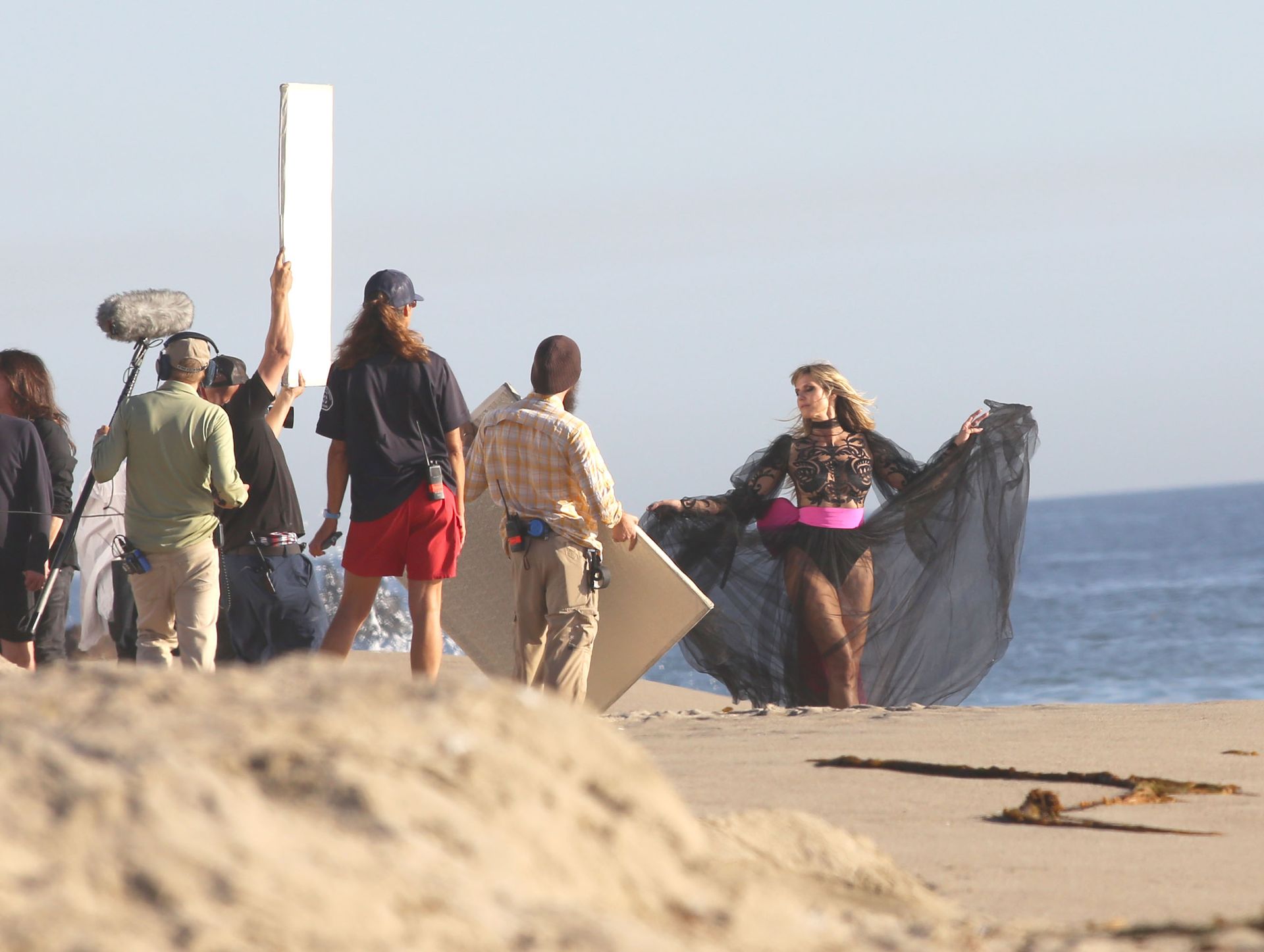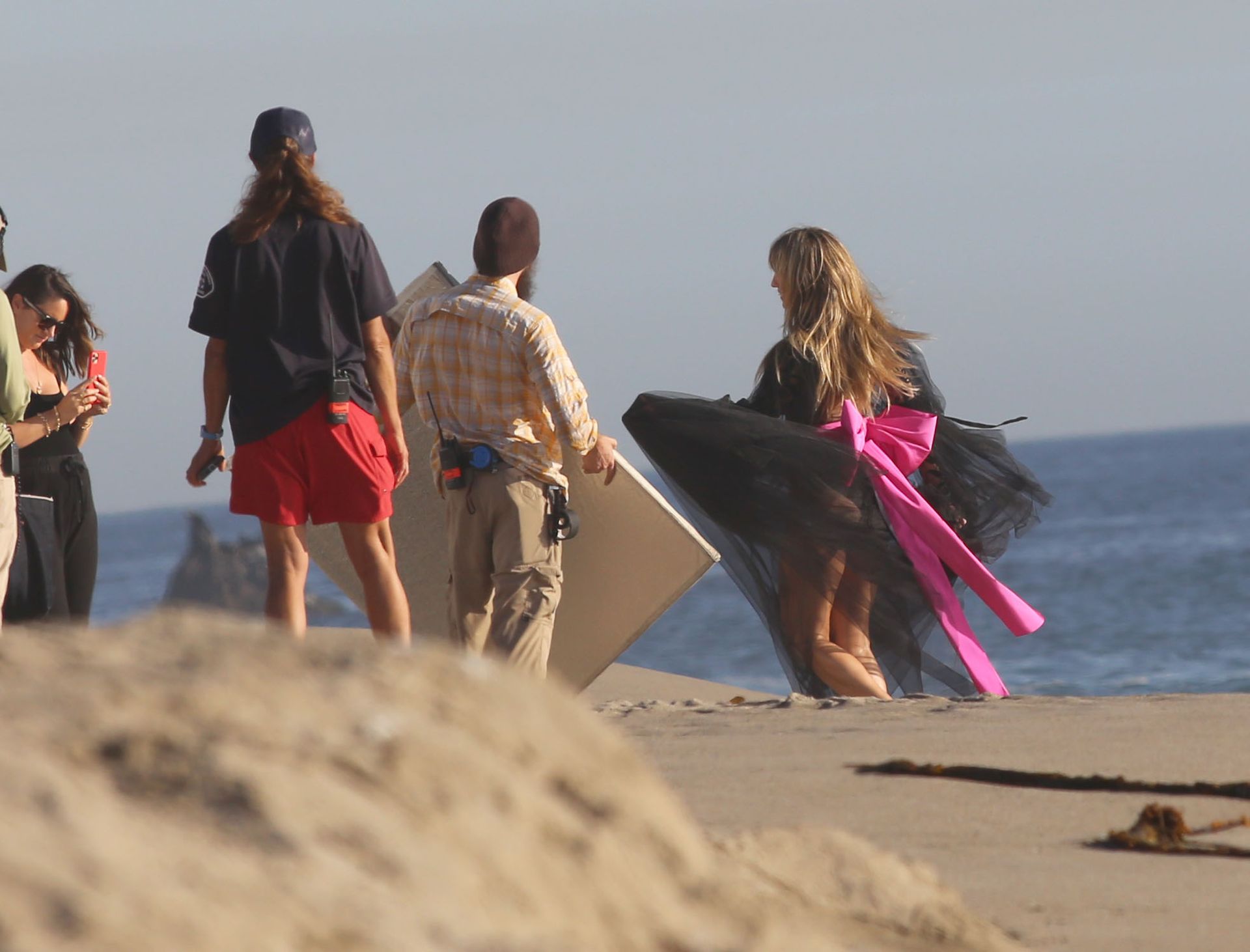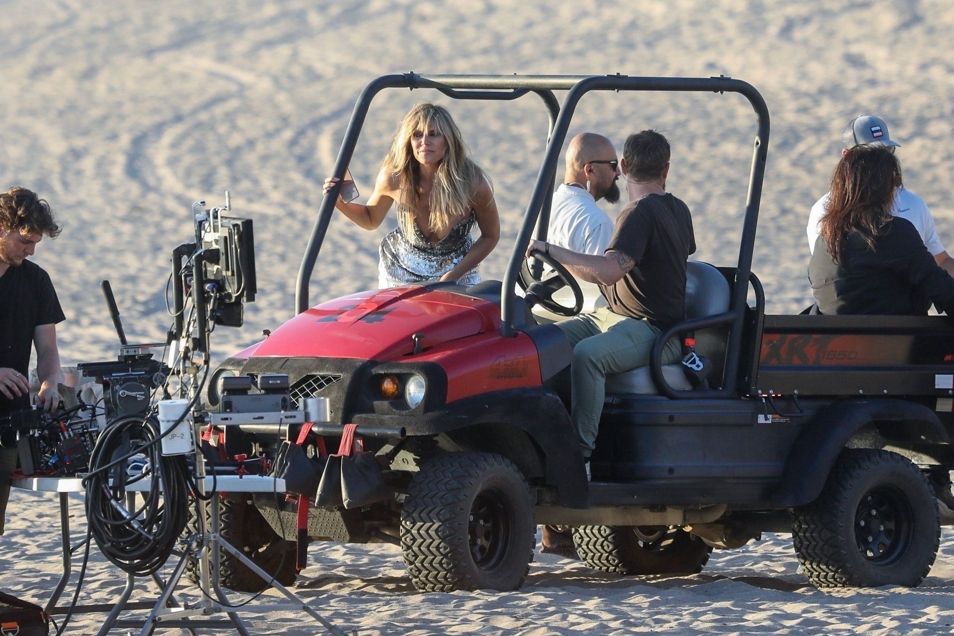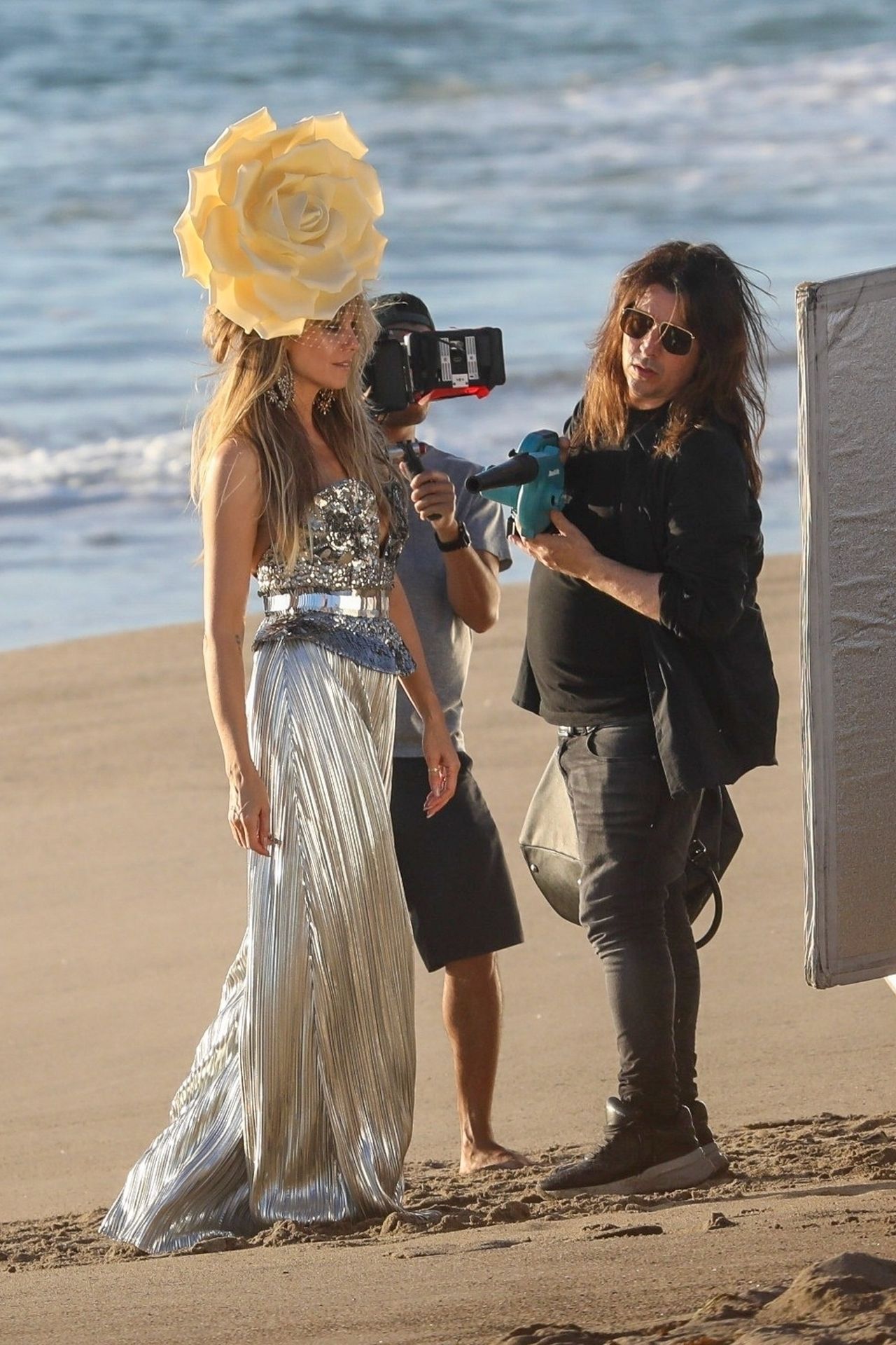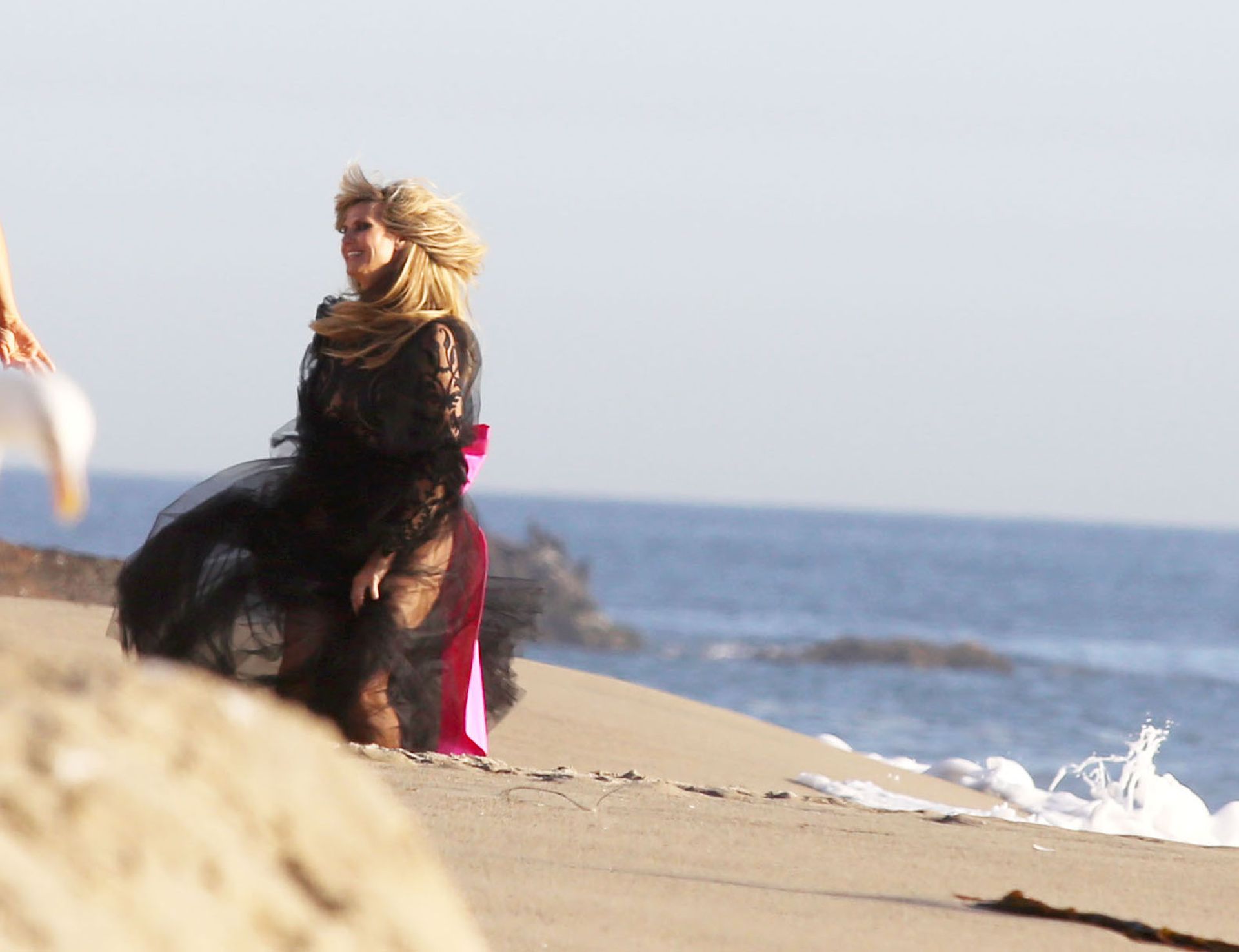 Model and TV host Heidi Klum wears a thong G-string bikini shows off her butt and cleavage while filming for her TV show Next top model on Malibu Beach, 10/24/2019.