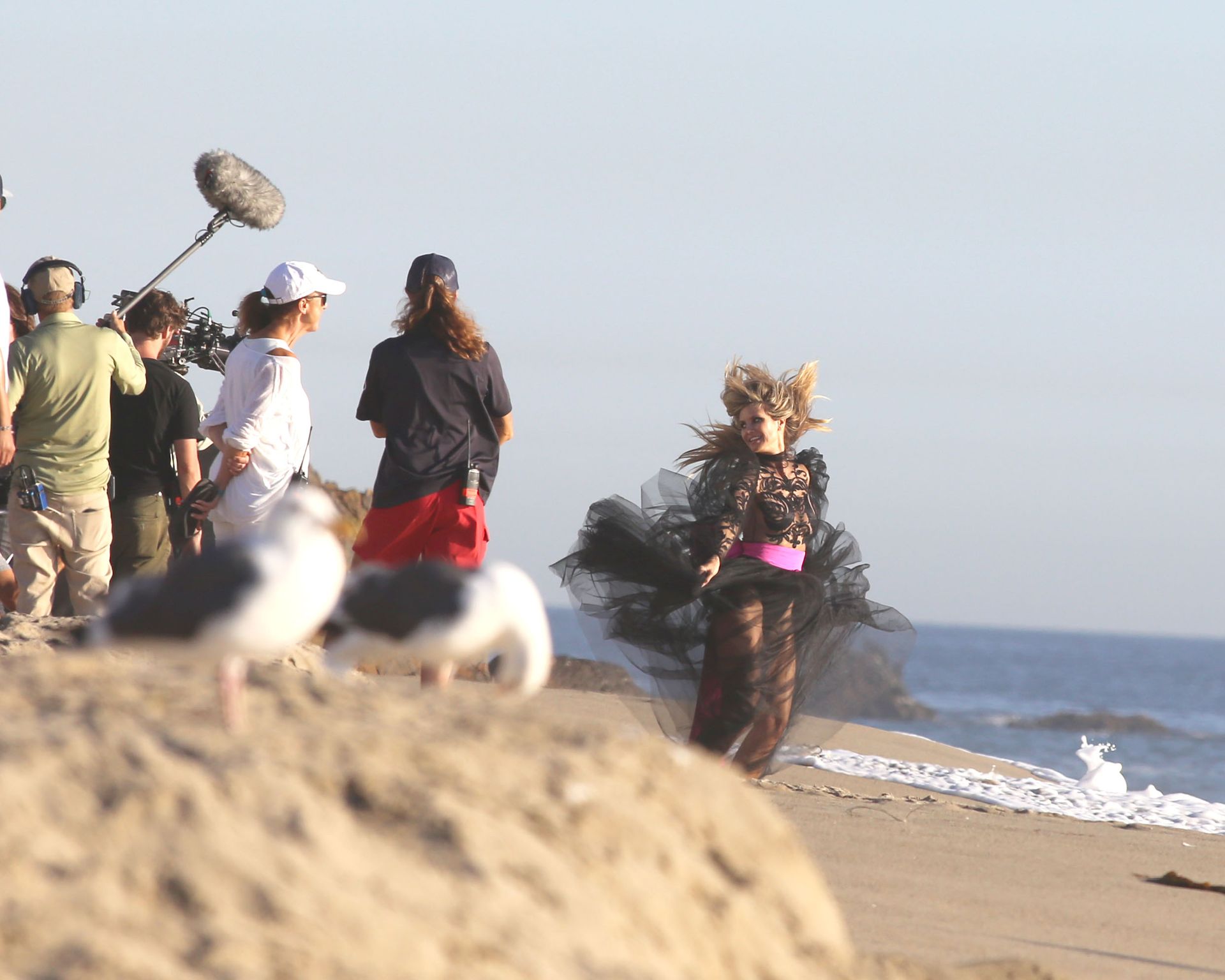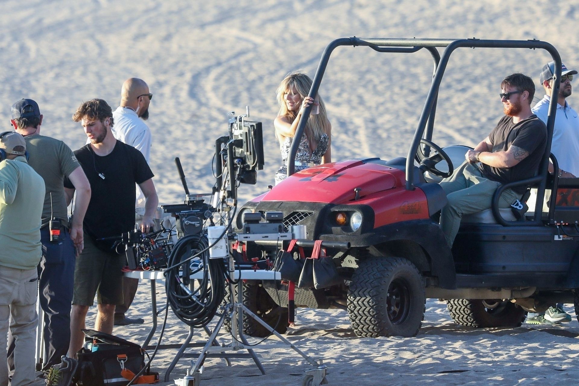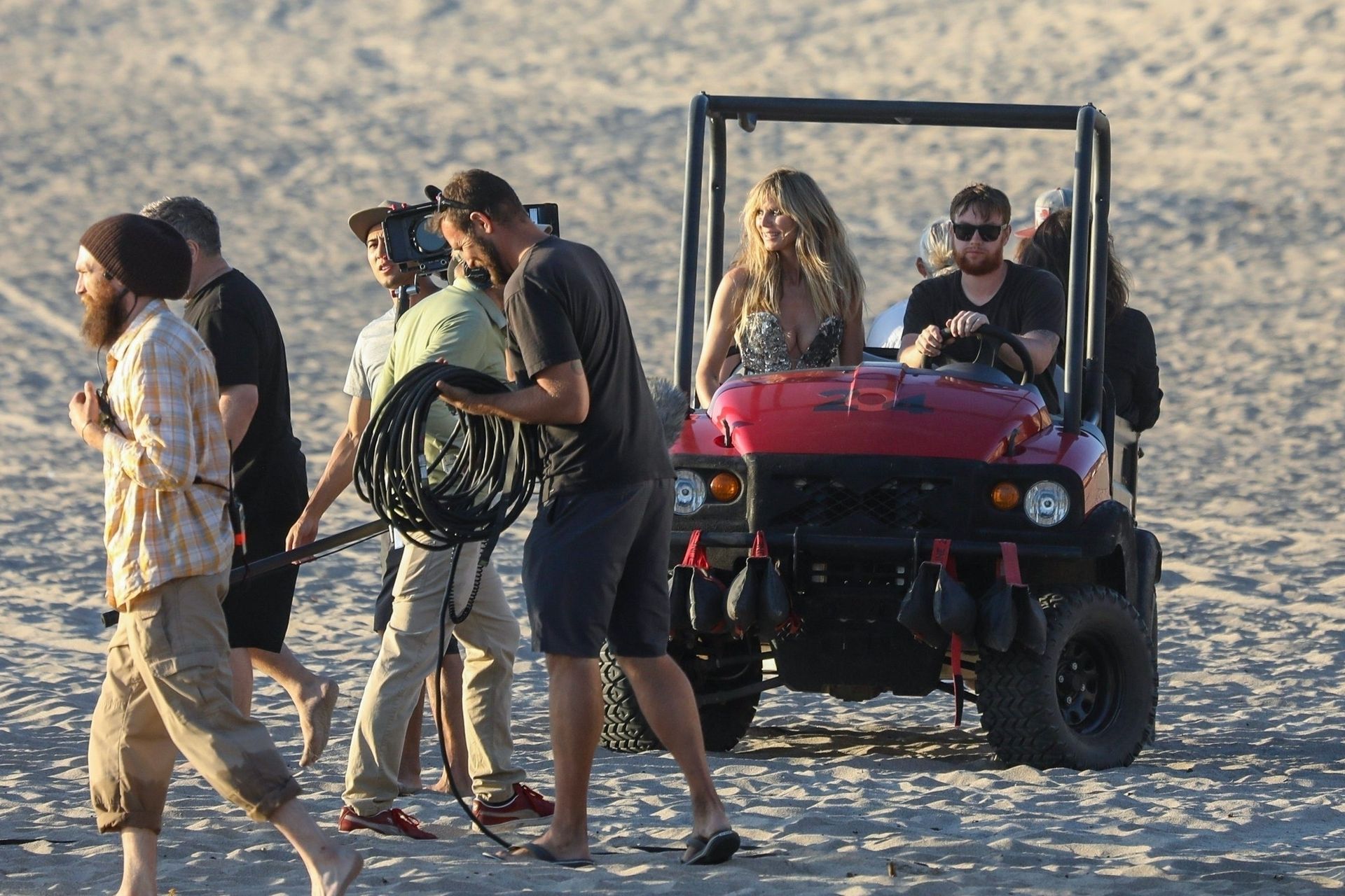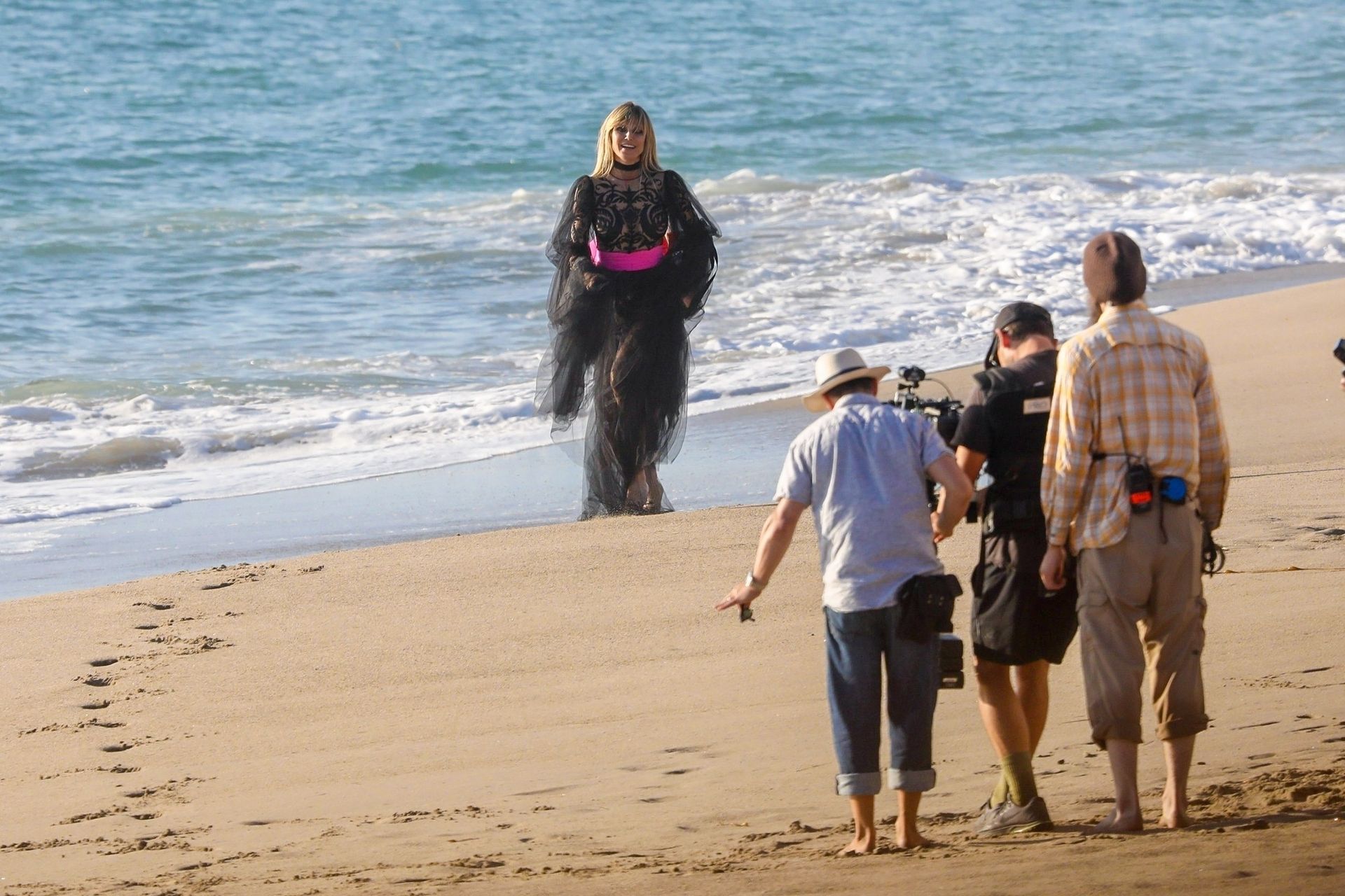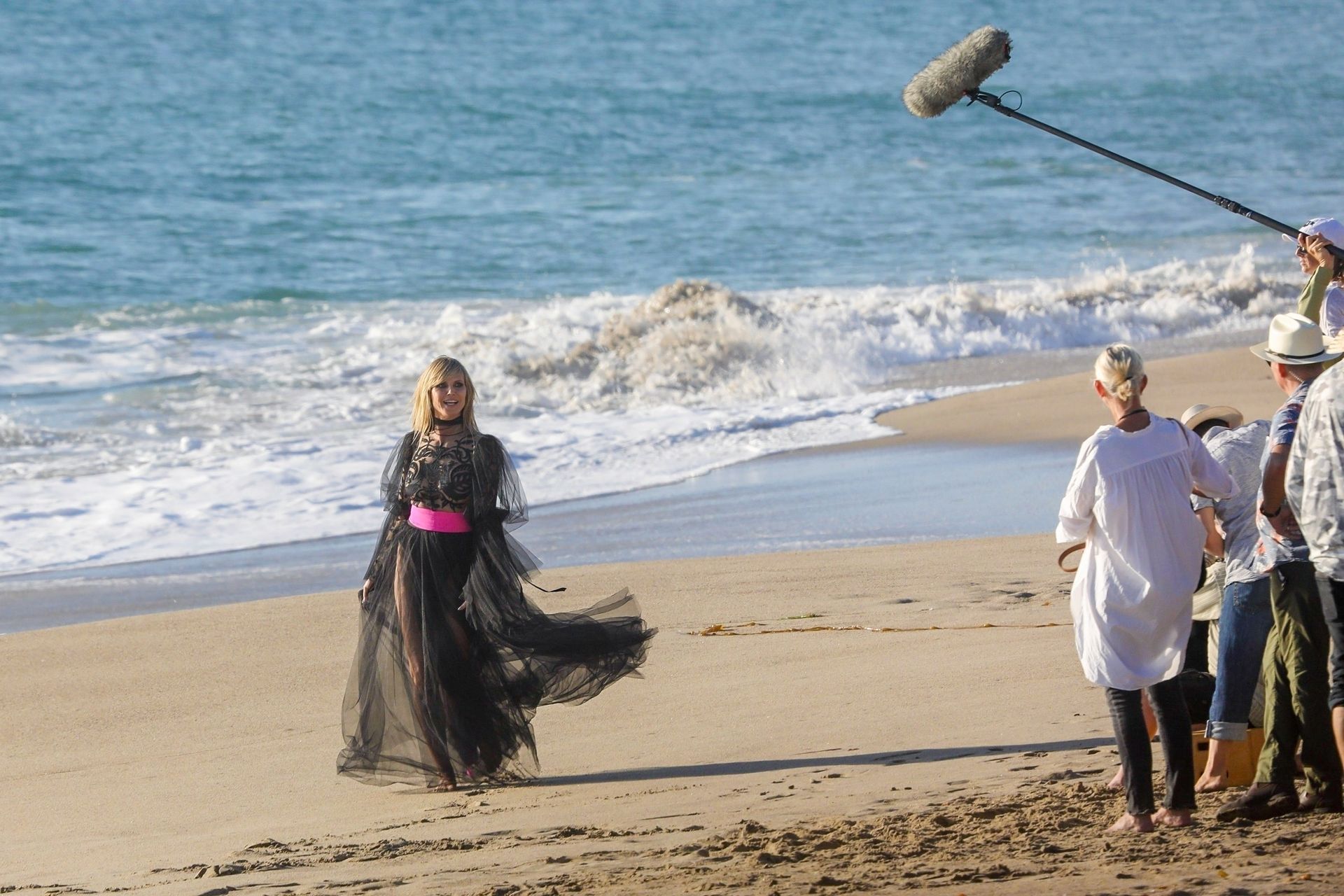 Model and TV host Heidi Klum wears a thong G-string bikini shows off her butt and cleavage while filming for her TV show Next top model on Malibu Beach, 10/24/2019.