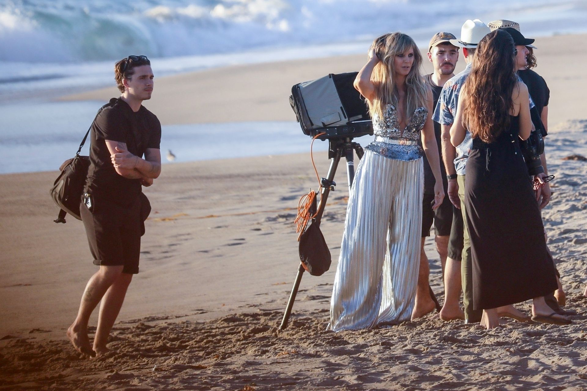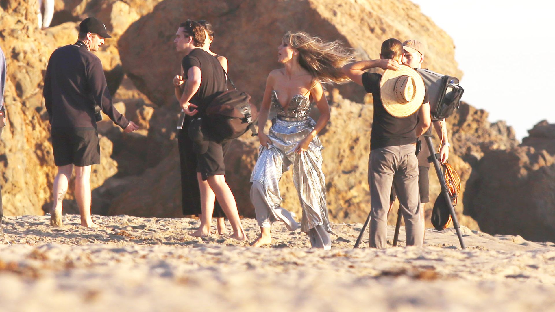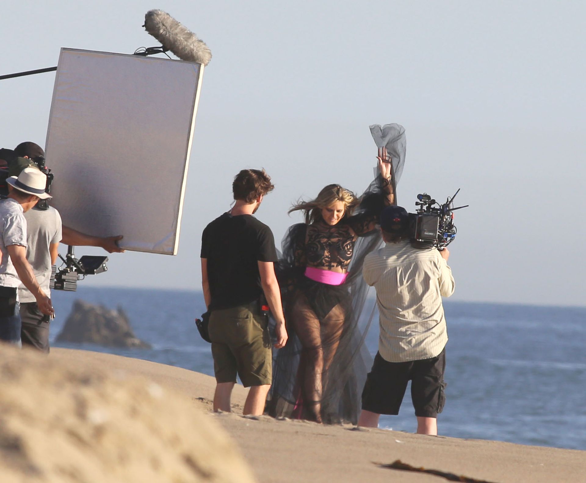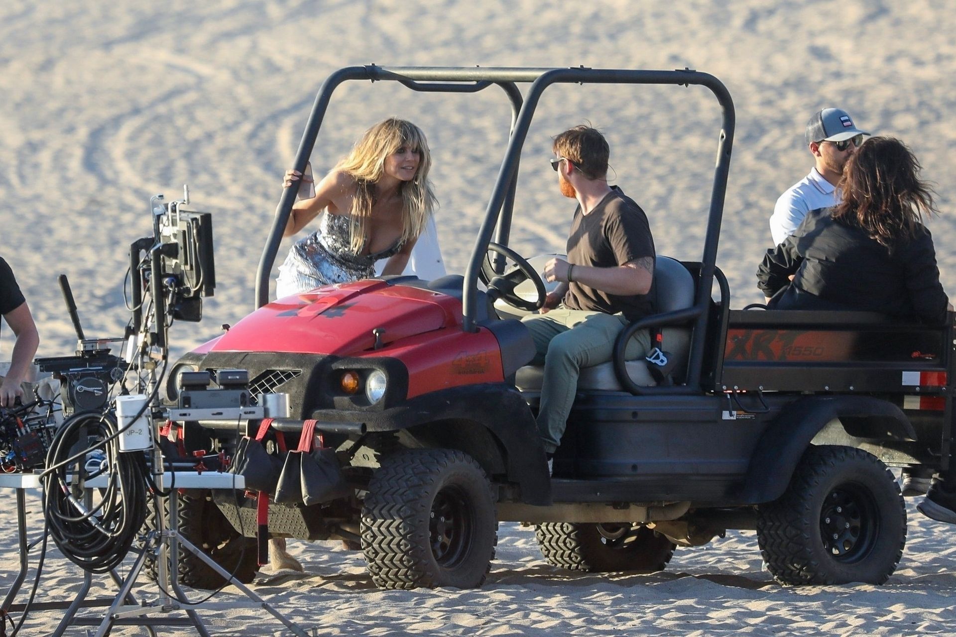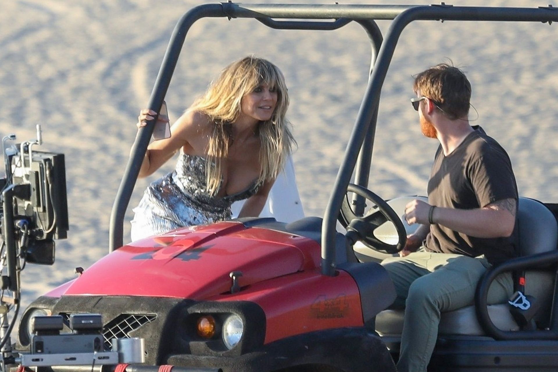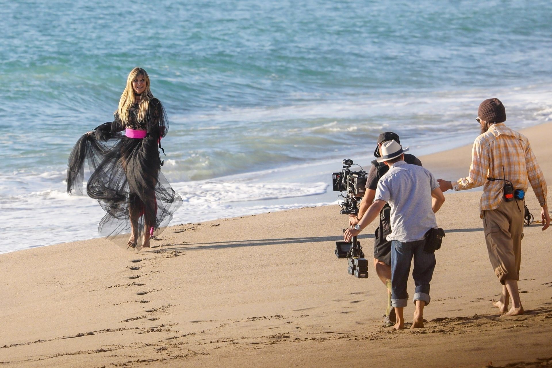 Model and TV host Heidi Klum wears a thong G-string bikini shows off her butt and cleavage while filming for her TV show Next top model on Malibu Beach, 10/24/2019.
