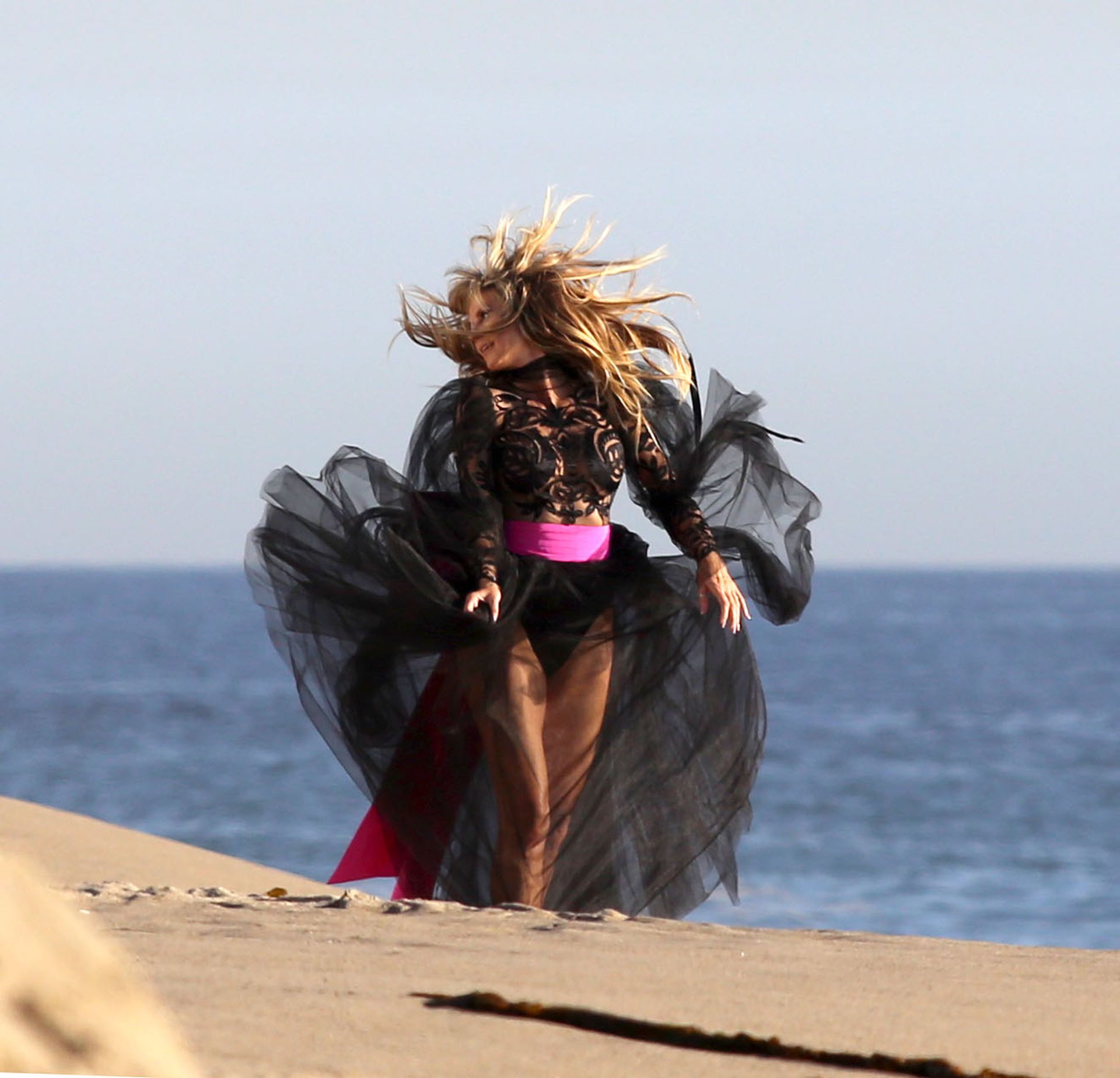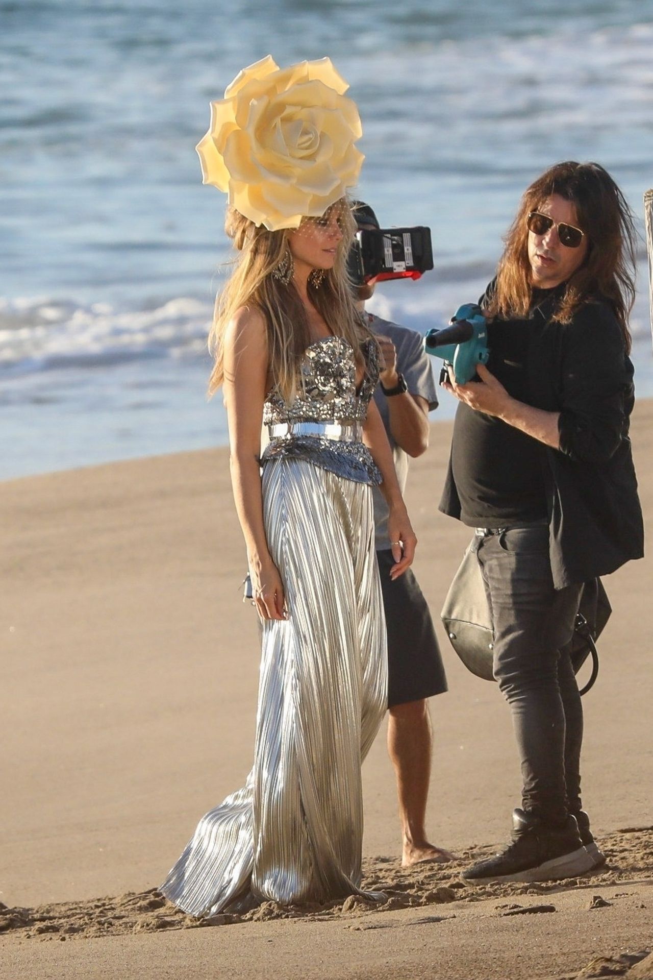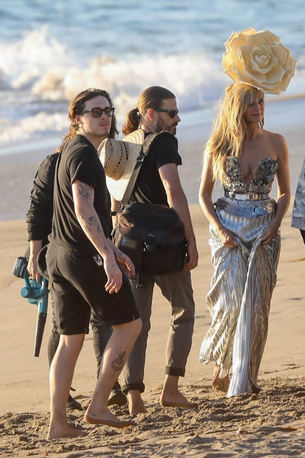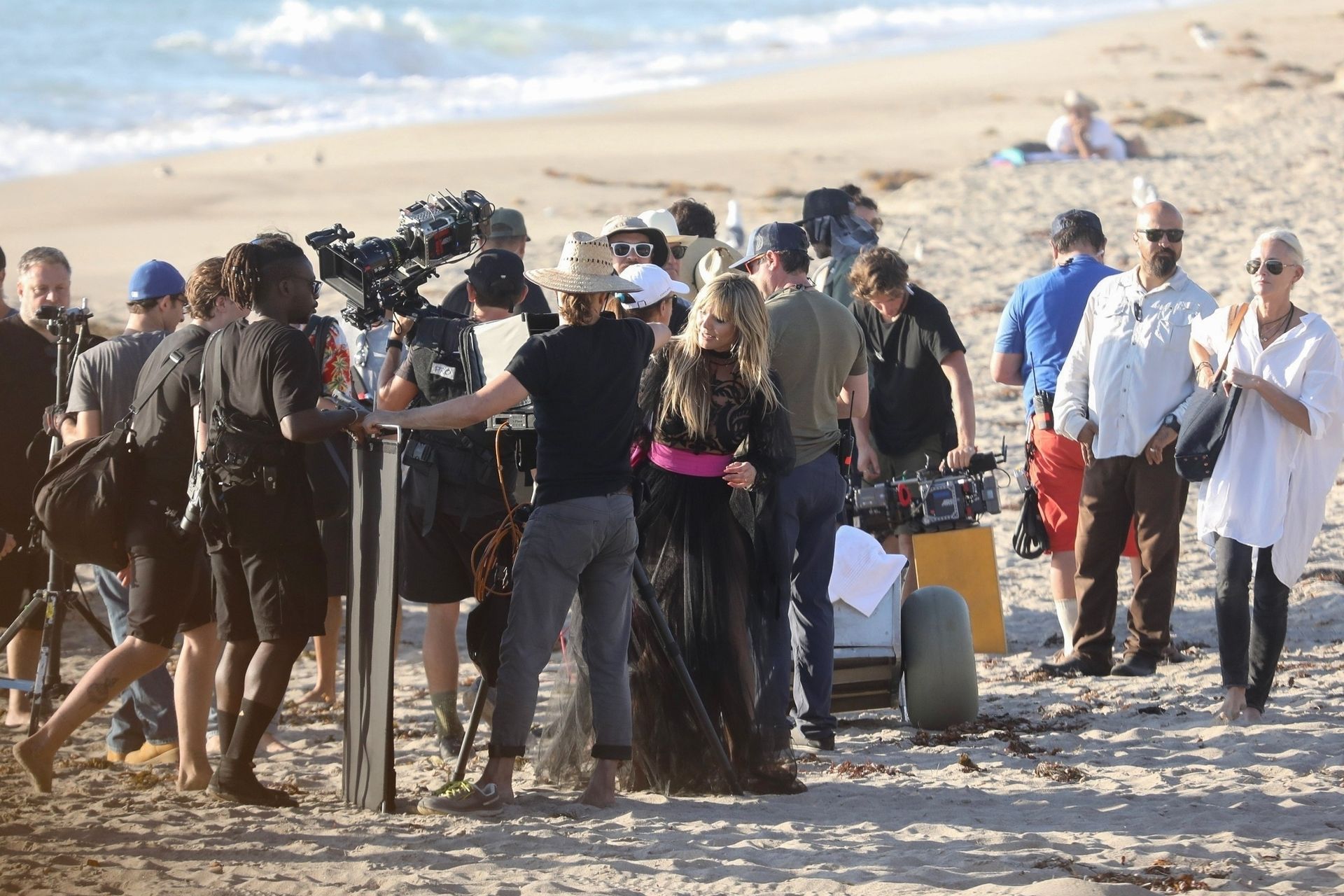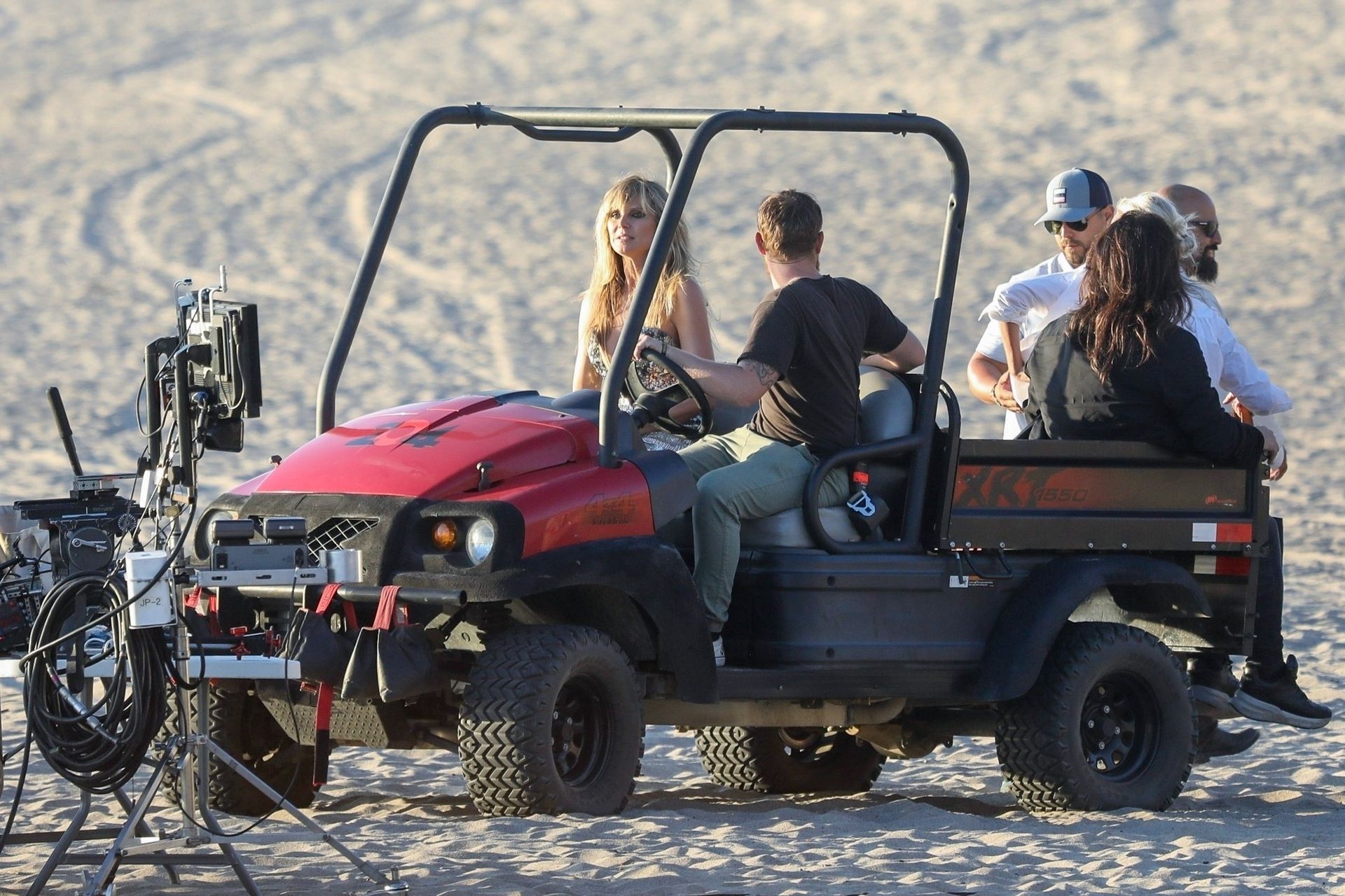Model and TV host Heidi Klum wears a thong G-string bikini shows off her butt and cleavage while filming for her TV show Next top model on Malibu Beach, 10/24/2019.