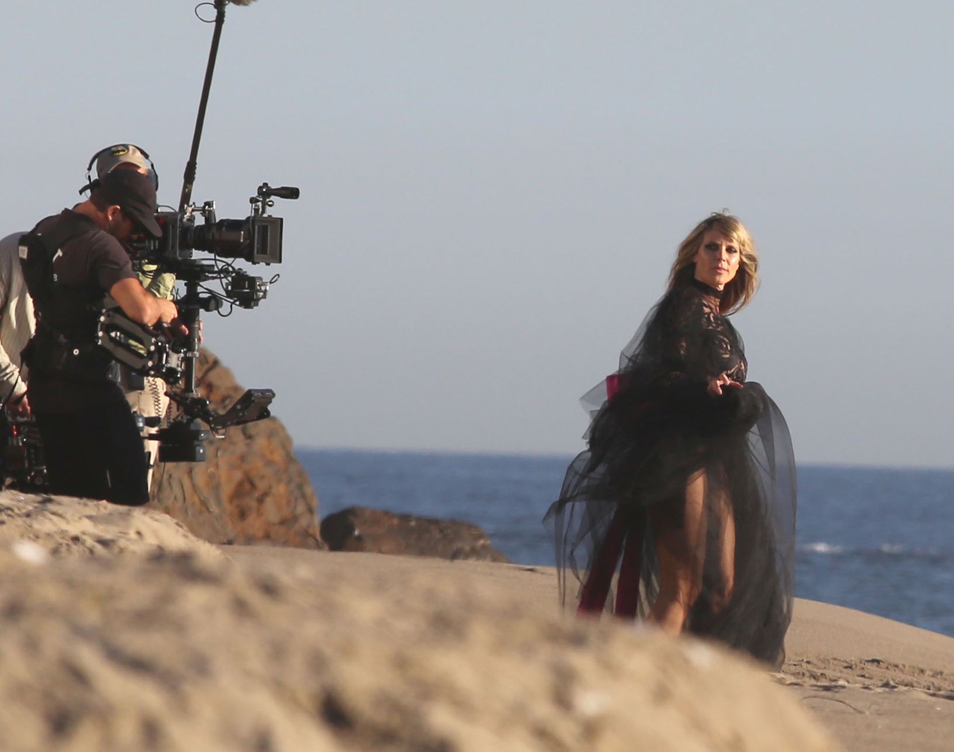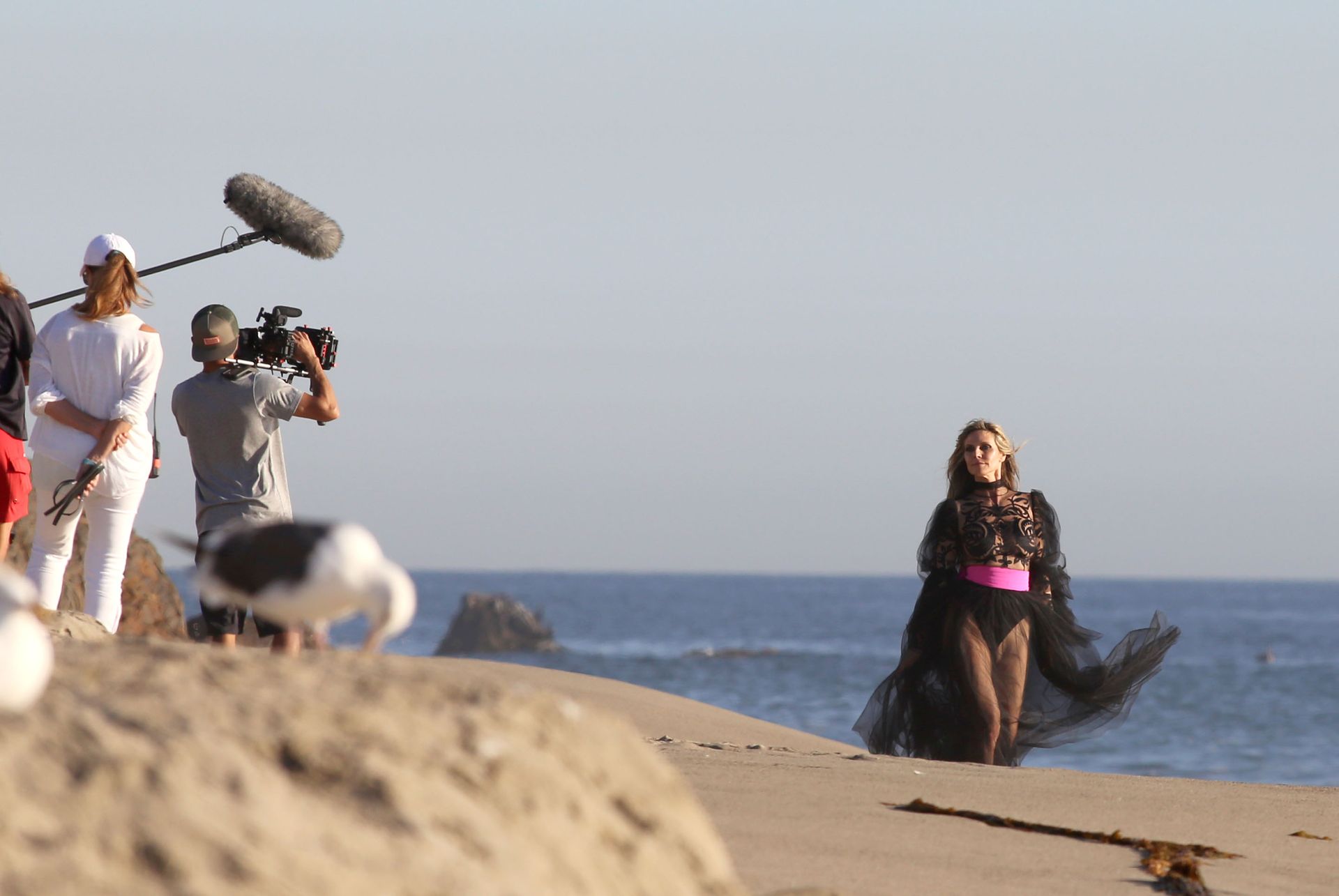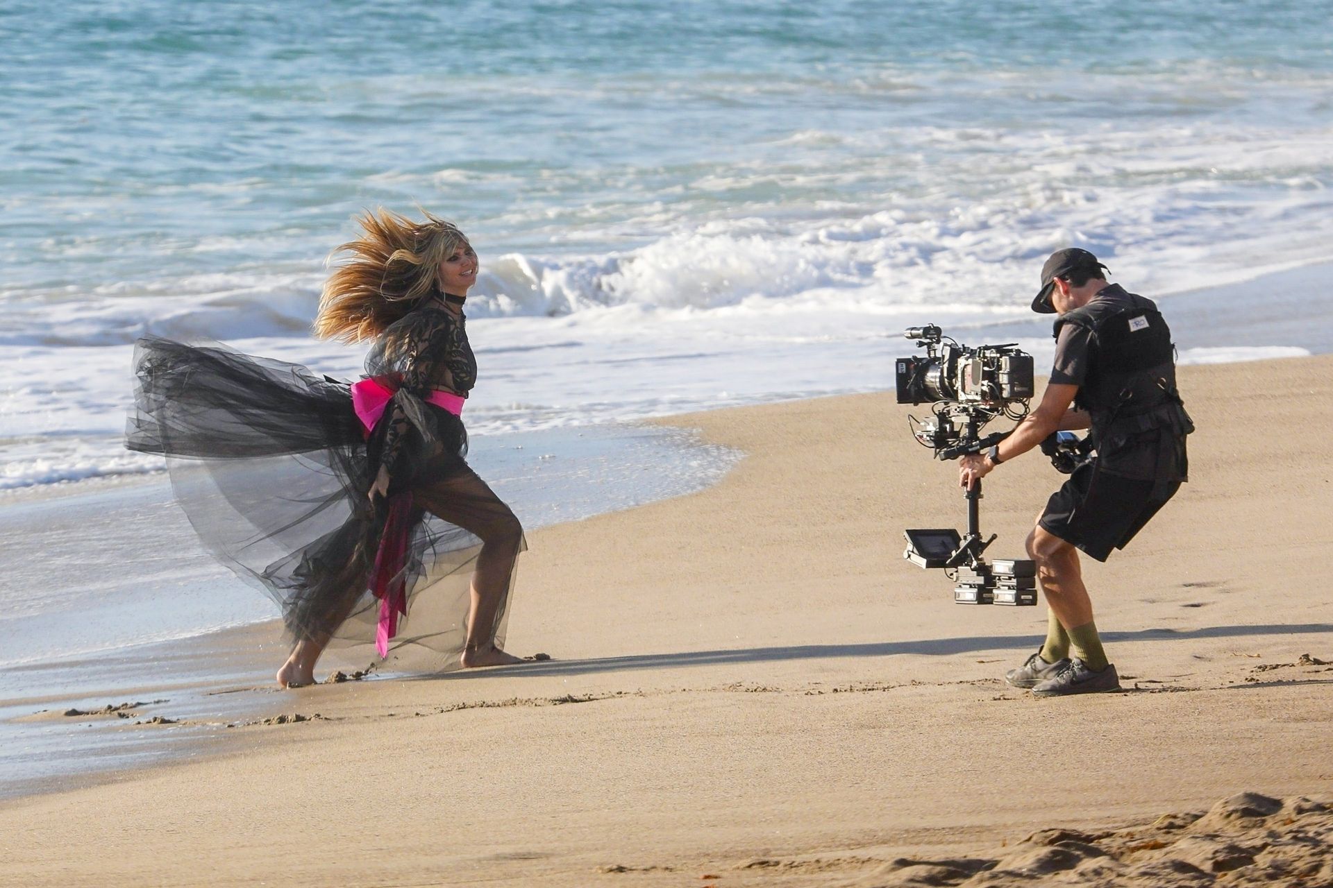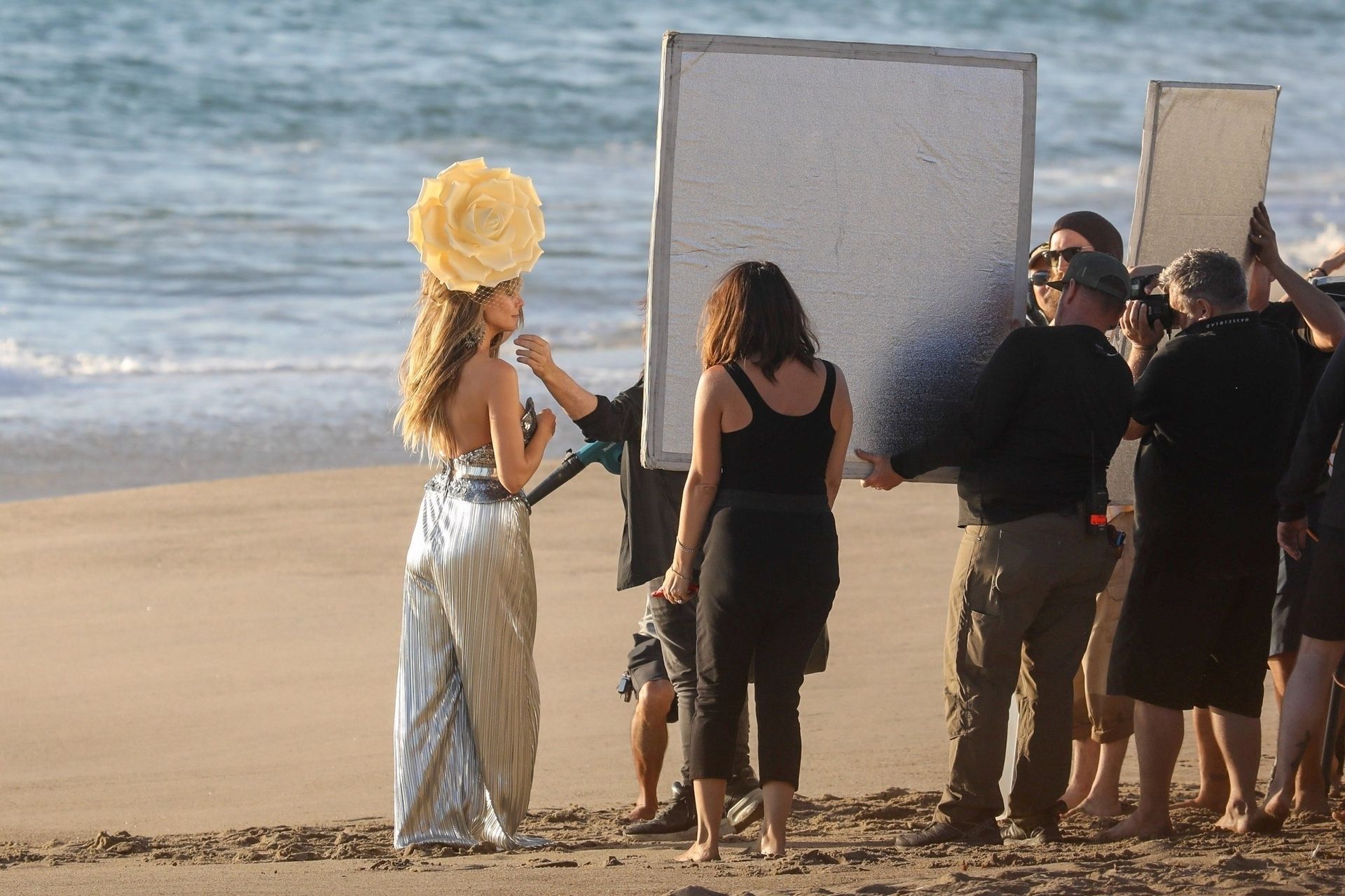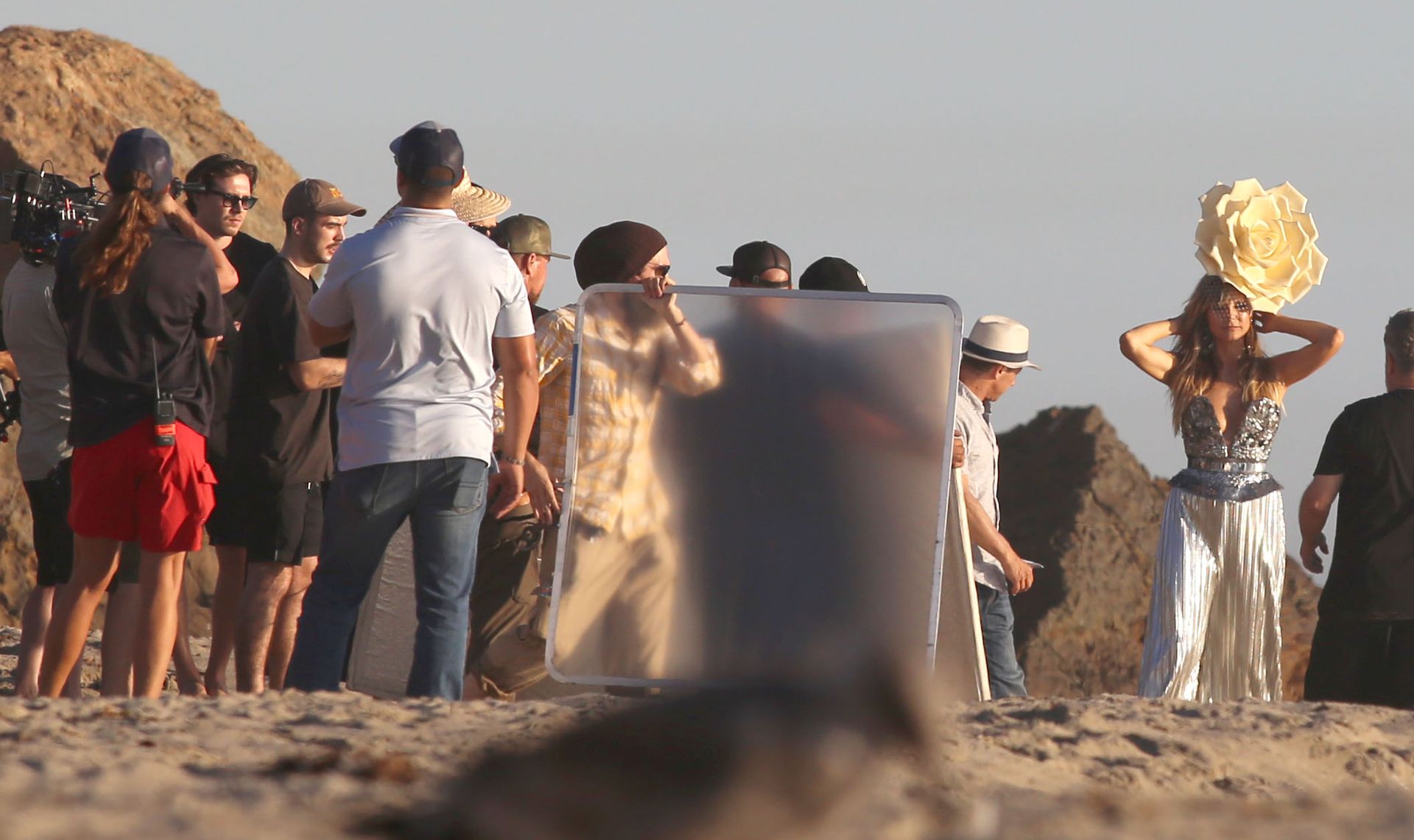Model and TV host Heidi Klum wears a thong G-string bikini shows off her butt and cleavage while filming for her TV show Next top model on Malibu Beach, 10/24/2019.