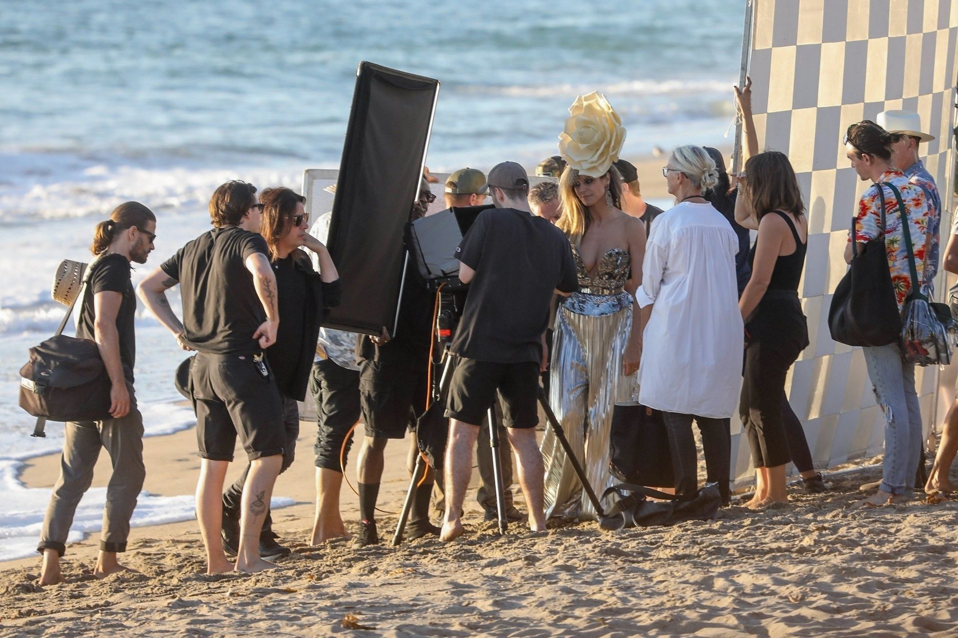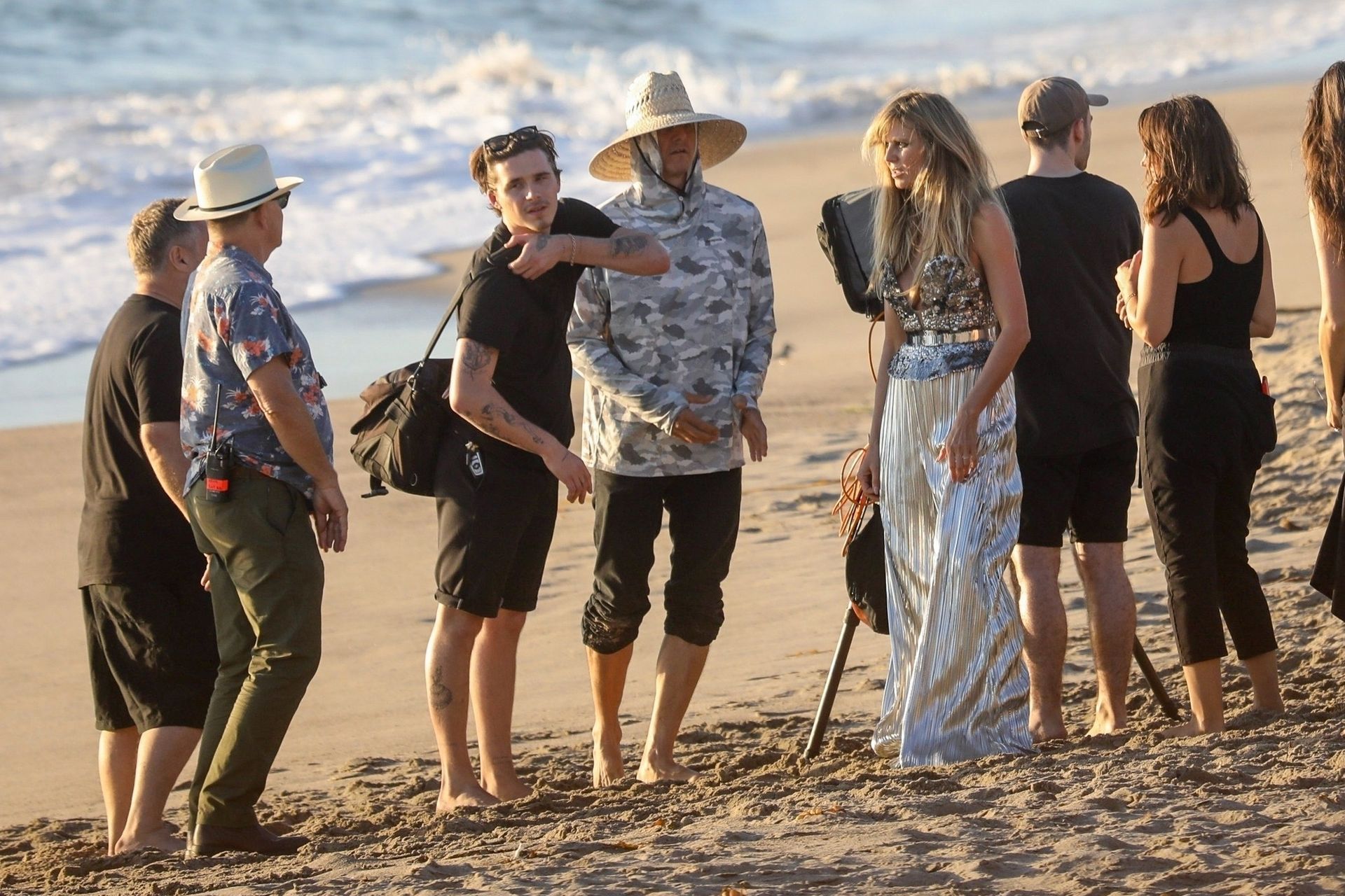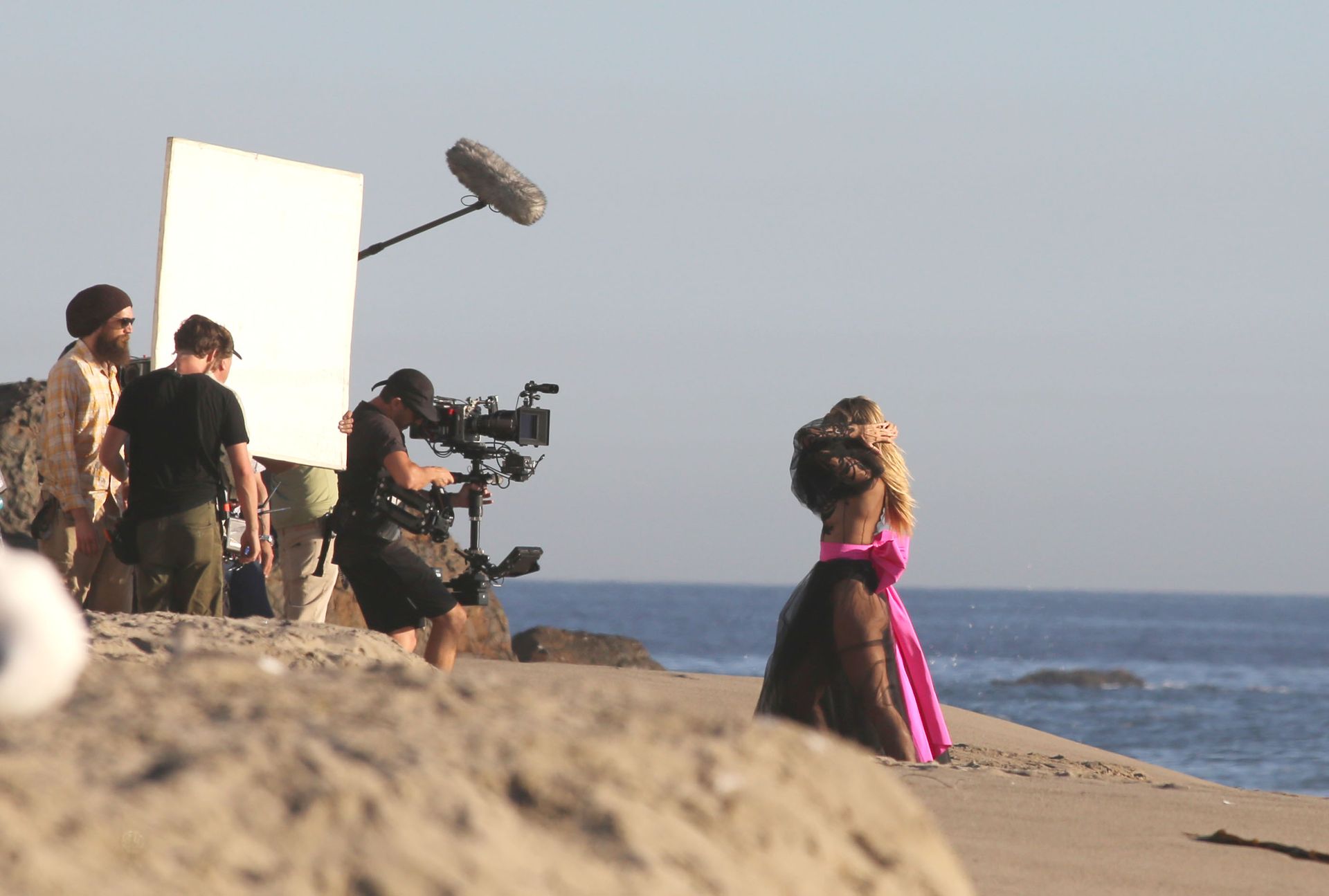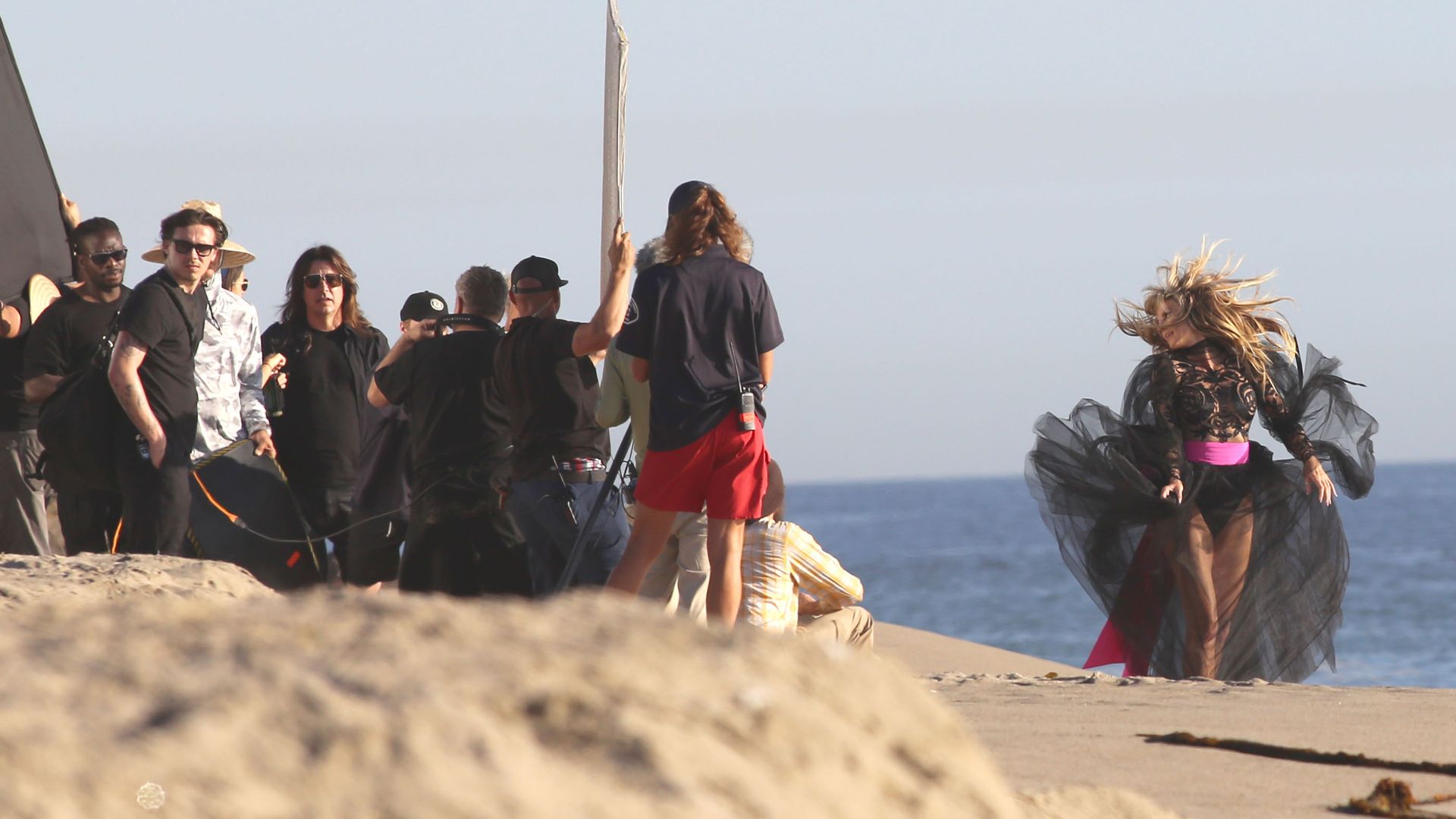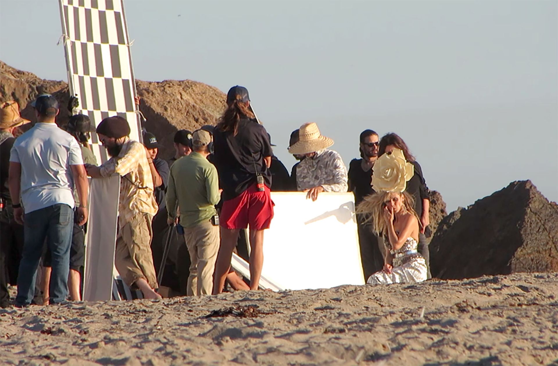 Model and TV host Heidi Klum wears a thong G-string bikini shows off her butt and cleavage while filming for her TV show Next top model on Malibu Beach, 10/24/2019.