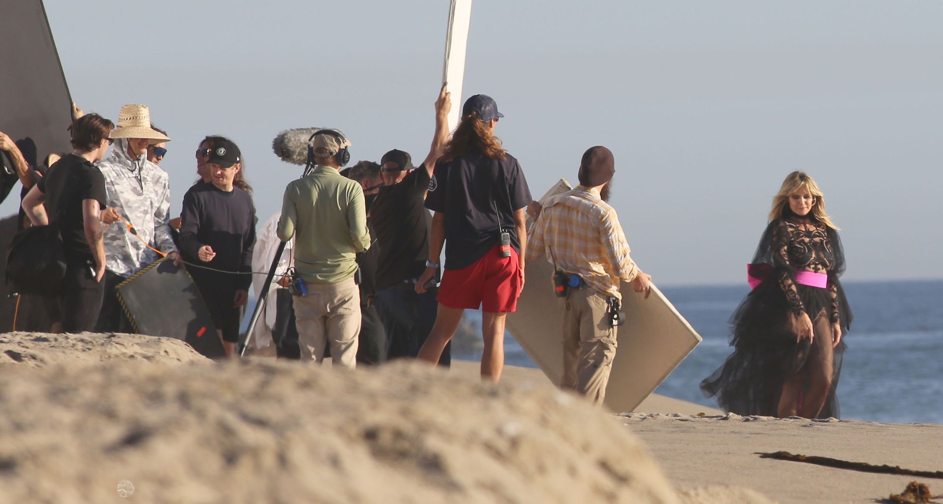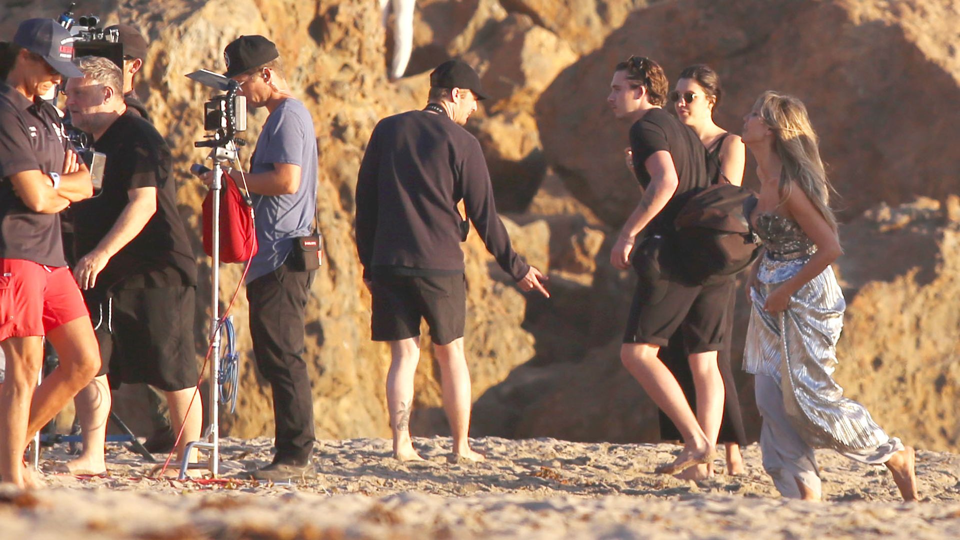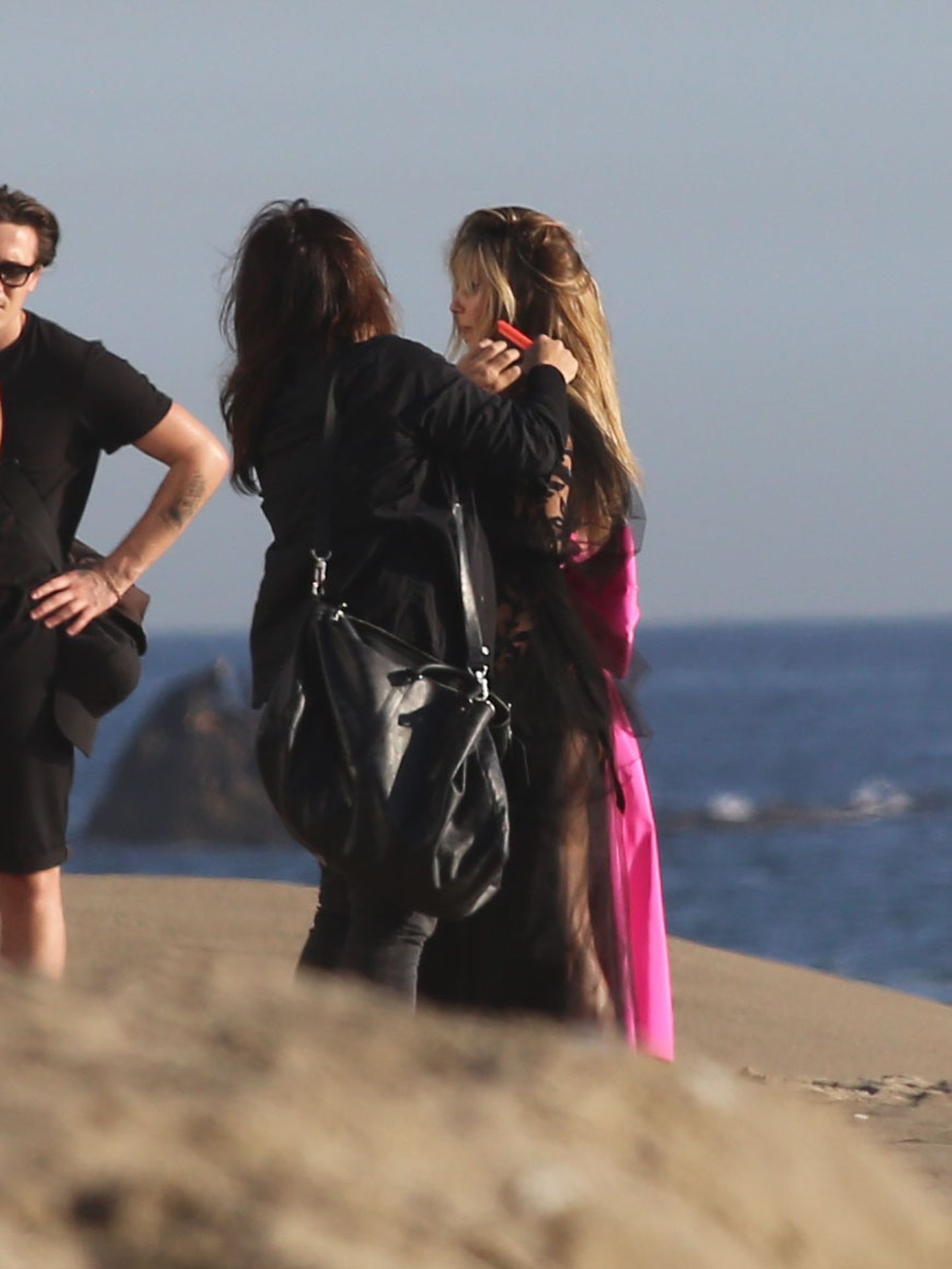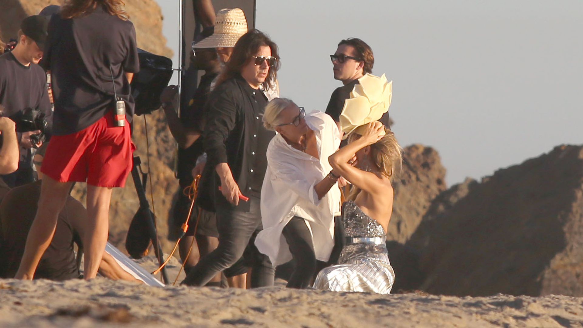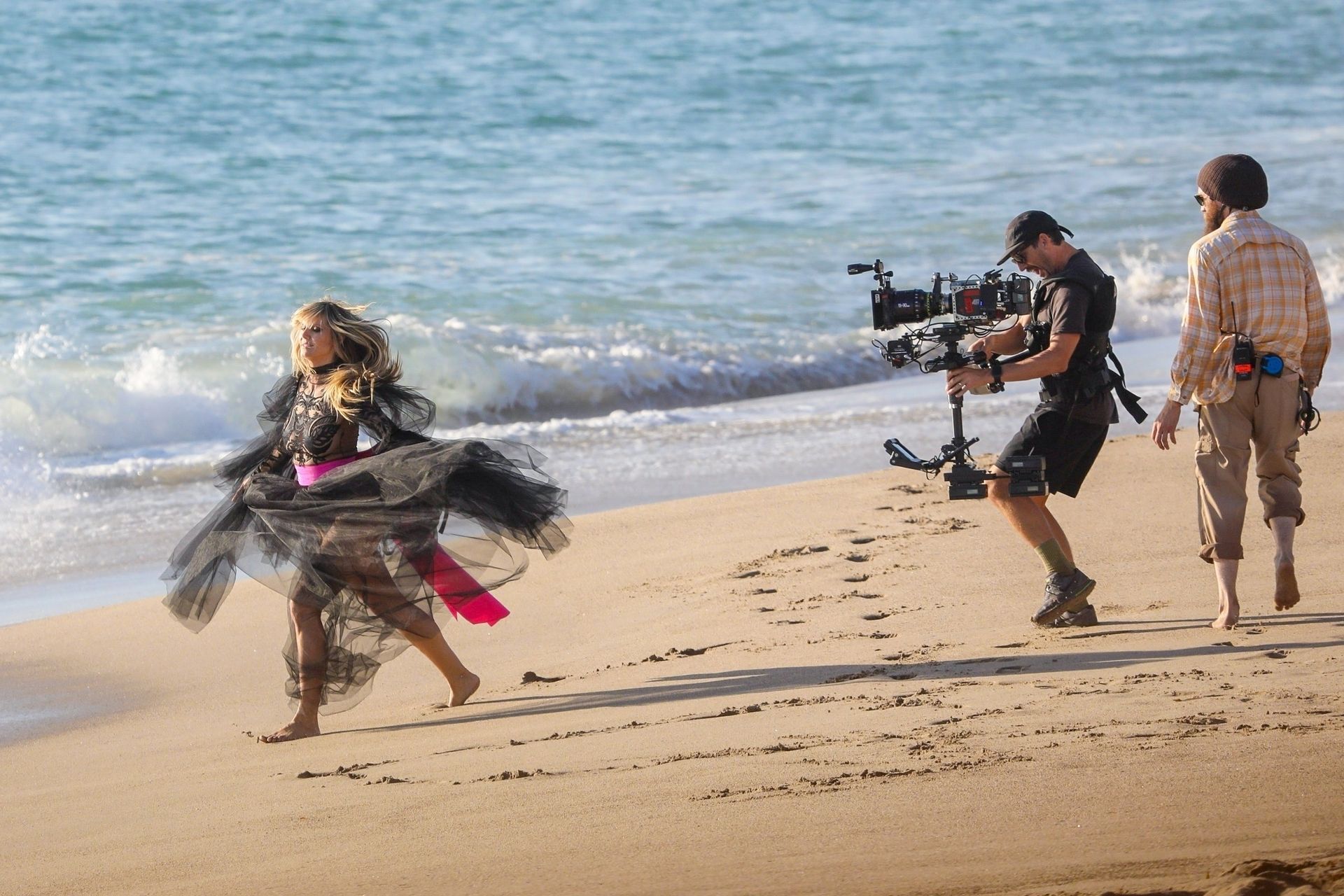Model and TV host Heidi Klum wears a thong G-string bikini shows off her butt and cleavage while filming for her TV show Next top model on Malibu Beach, 10/24/2019.