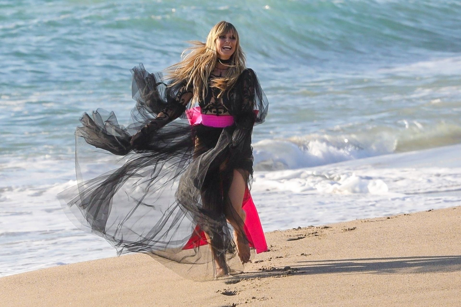 German supermodel Heidi Klum slips into red ruffled dress and twirls for the cameras during beachside shoot in Malibu, 10/23/2019. The supermodel suffers a wardrobe malfunction revealing her underwear as she twirls on set.